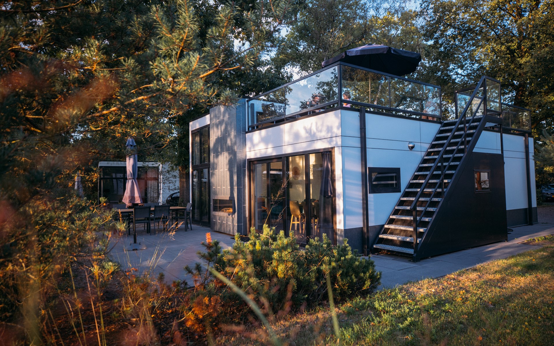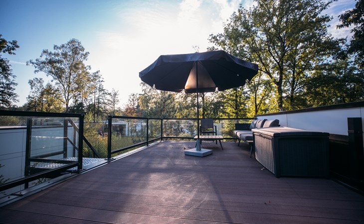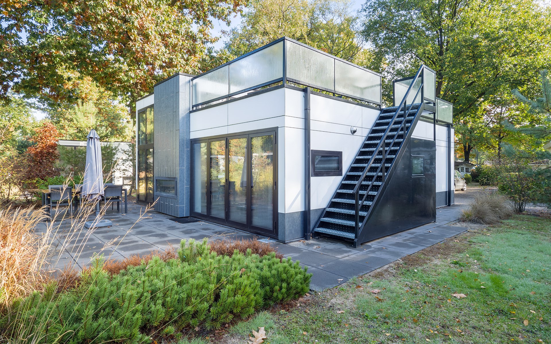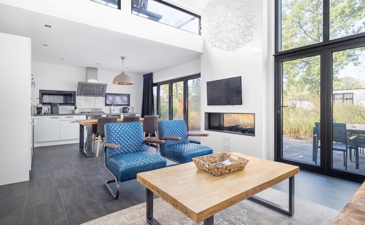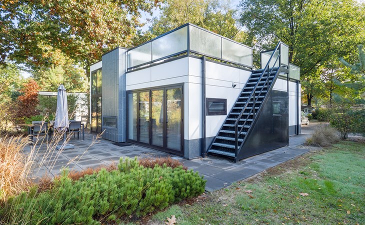 The Cube Elite Plus 6 is a chalet that exudes luxury. This detached chalet is suitable for 6 persons. The house was built under architecture. Thanks to the high windows, there is a lot of light coming in. Besides a cosy sitting area with television, the spacious living room is also equipped with a see-through gas fire. In the kitchen you will find a fridge-freezer, microwave oven, dishwasher, kettle and a Nespresso Professional Machine (capsules for this machine are sold exclusively at the reception/mini-market). There are 2 separate bedrooms, 1 with a double bed and 1 with a bunk bed. A staircase leads to the sleeping loft where there is another double bed. The house has 2 luxury bathrooms and a separate toilet. The spacious sun terrace has garden furniture (some houses have an outdoor fireplace). You can park 1 car at this house and there is free WiFi.