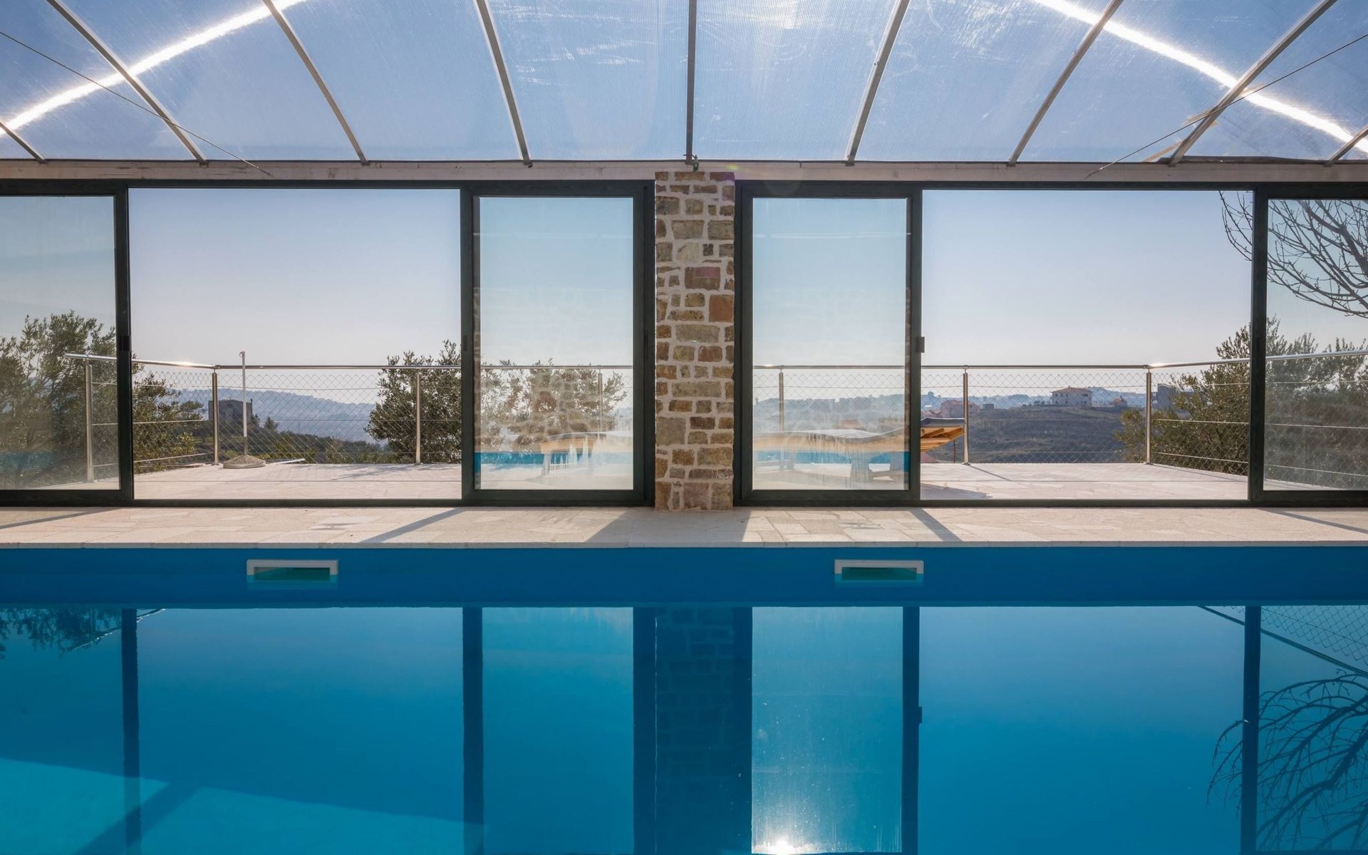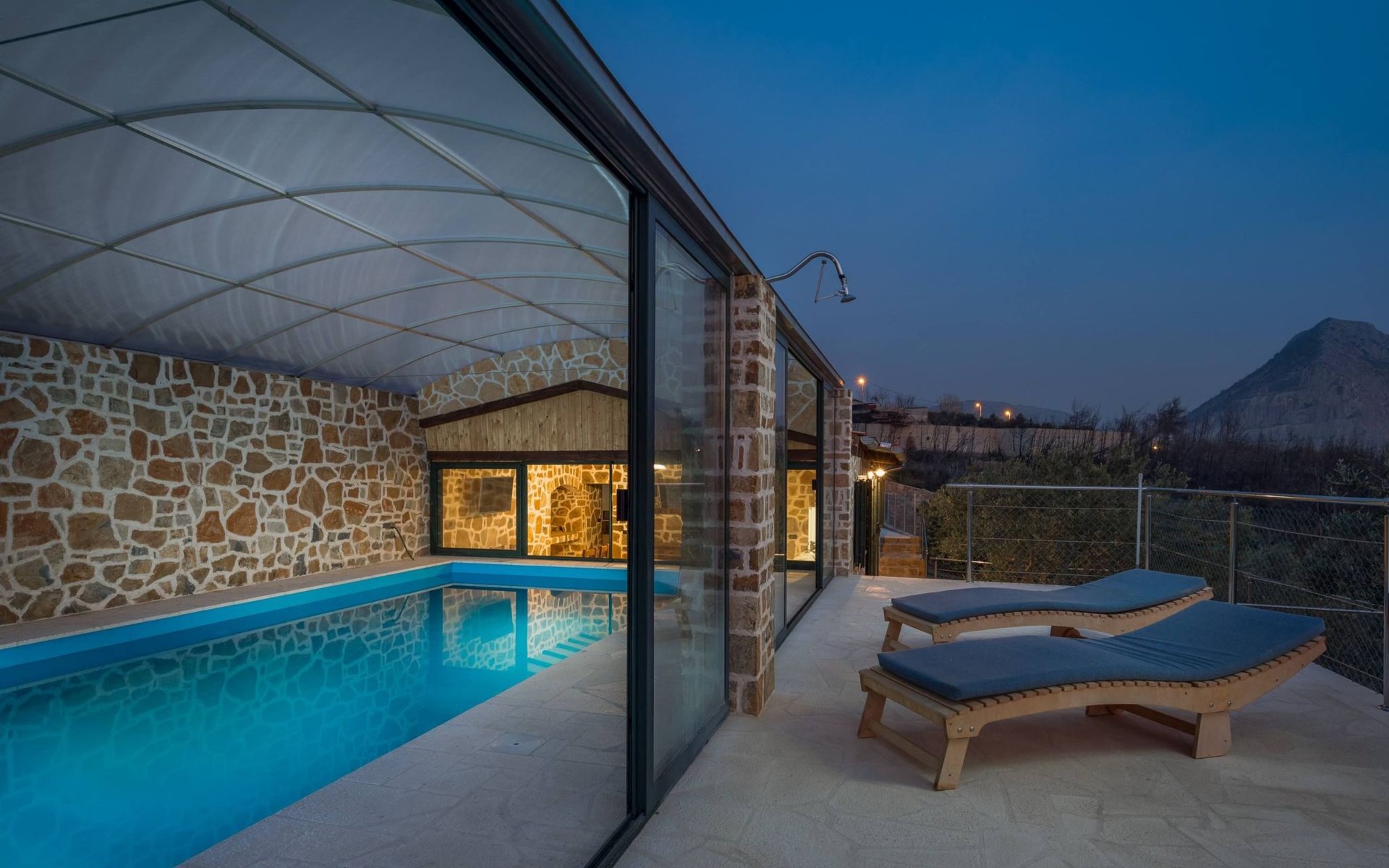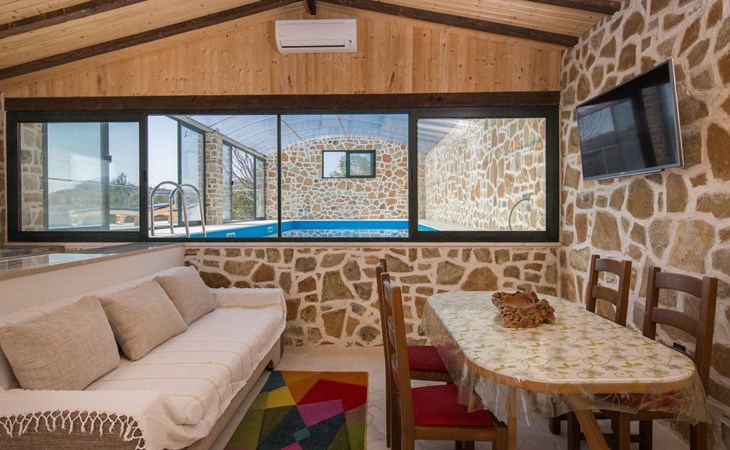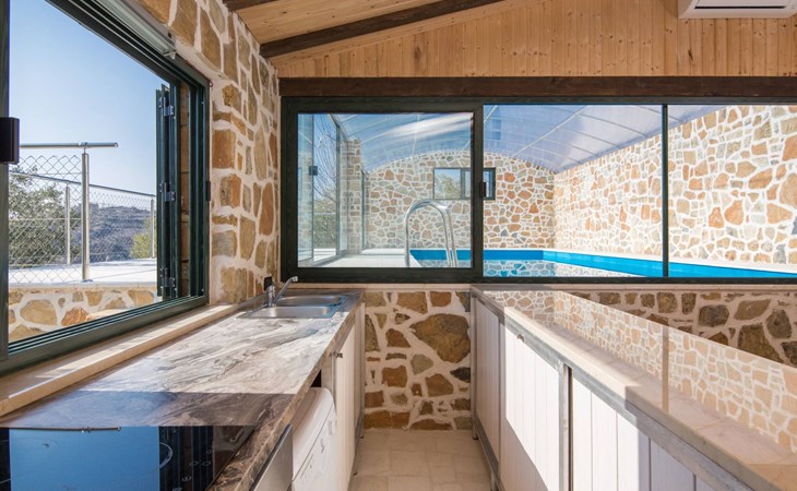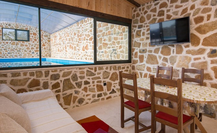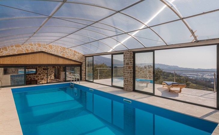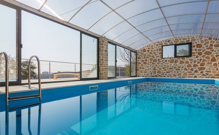 The living room provides access to your private indoor pool measuring 4 x 10 metres, with a metal ladder to facilitate entry. After a few rounds of swimming, you can relax on the sun loungers on the terrace (which is equipped with garden furniture with four chairs and a wooden table) and enjoy an extensive panoramic view over the mountainous landscape as far as the sea. If you arrive by car than you can use the secure parking spaces right in front of the house.