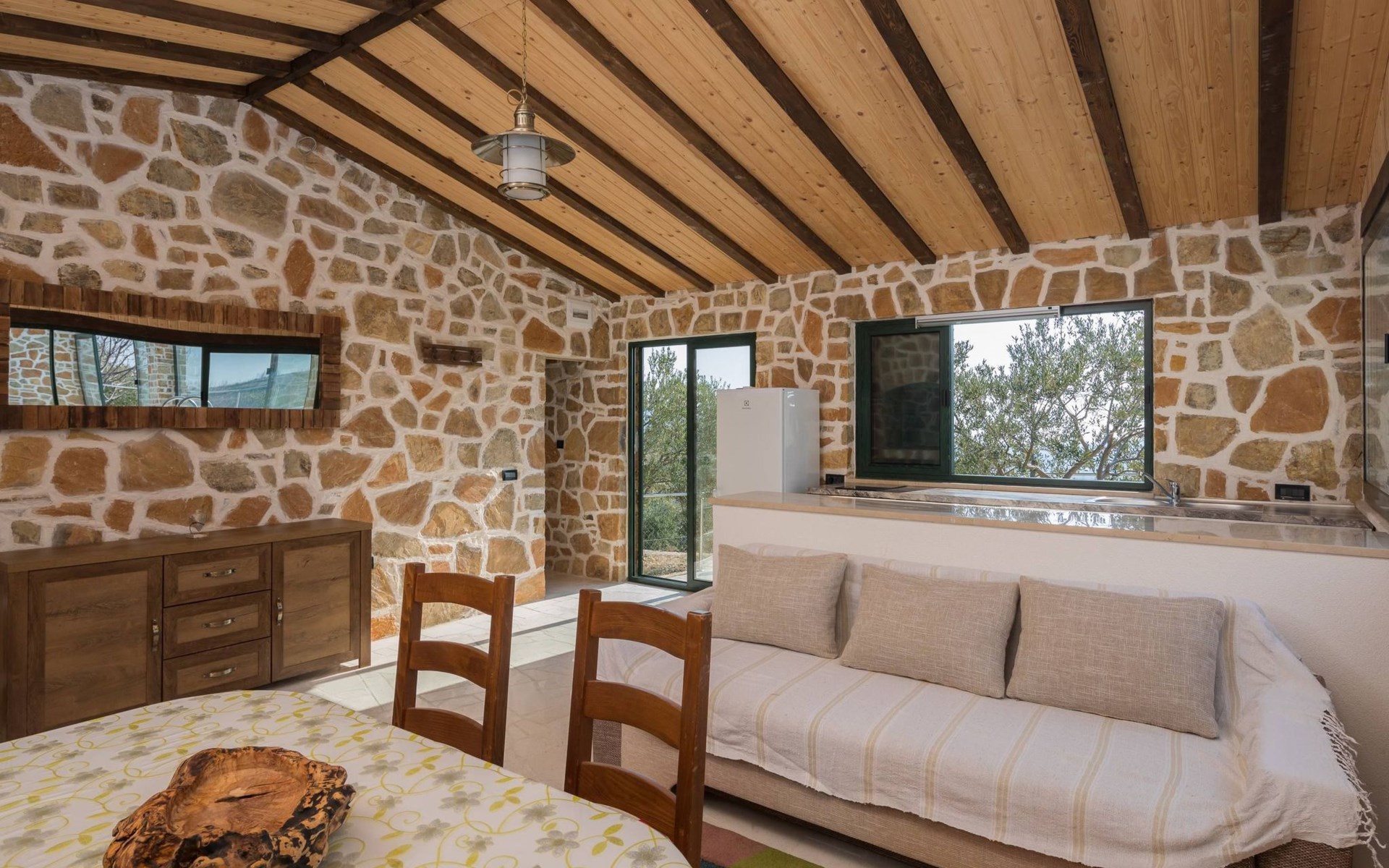 The ground-level holiday house was newly built in 2017 and provides all the necessary modern amenities for a comfortable stay. It consists of a living and dining room with an integrated, fully-equipped kitchen, a light bedroom and a spacious daylight bathroom. The living room provides a comfortable sofa, a flatscreen TV mounted to the wall with a USB port, and a dining table with four chairs. The big open fireplace built into the wall enhances the rustic atmosphere and exudes cosy warmth on cooler evenings. The kitchen is equipped with a dishwasher, a two-ring electric touch screen stove, an extra large fridge with a freezer compartment, and plenty of crockery and cutlery. The bedroom has a double bed (180 x 200cm), and a wall cupboard with plenty of storage space for your clothing and luggage. The sofa in the living room can be converted into an additional double bed (140 x 200cm). The bathroom has a shower cubicle, a washbasin with a wide wall mirror, a hairdryer, a toilet, urinal basin and even a washing machine. Plenty of bed linen and towels are provided and the reliable wireless Internet connection in the apartment can be used free of charge.