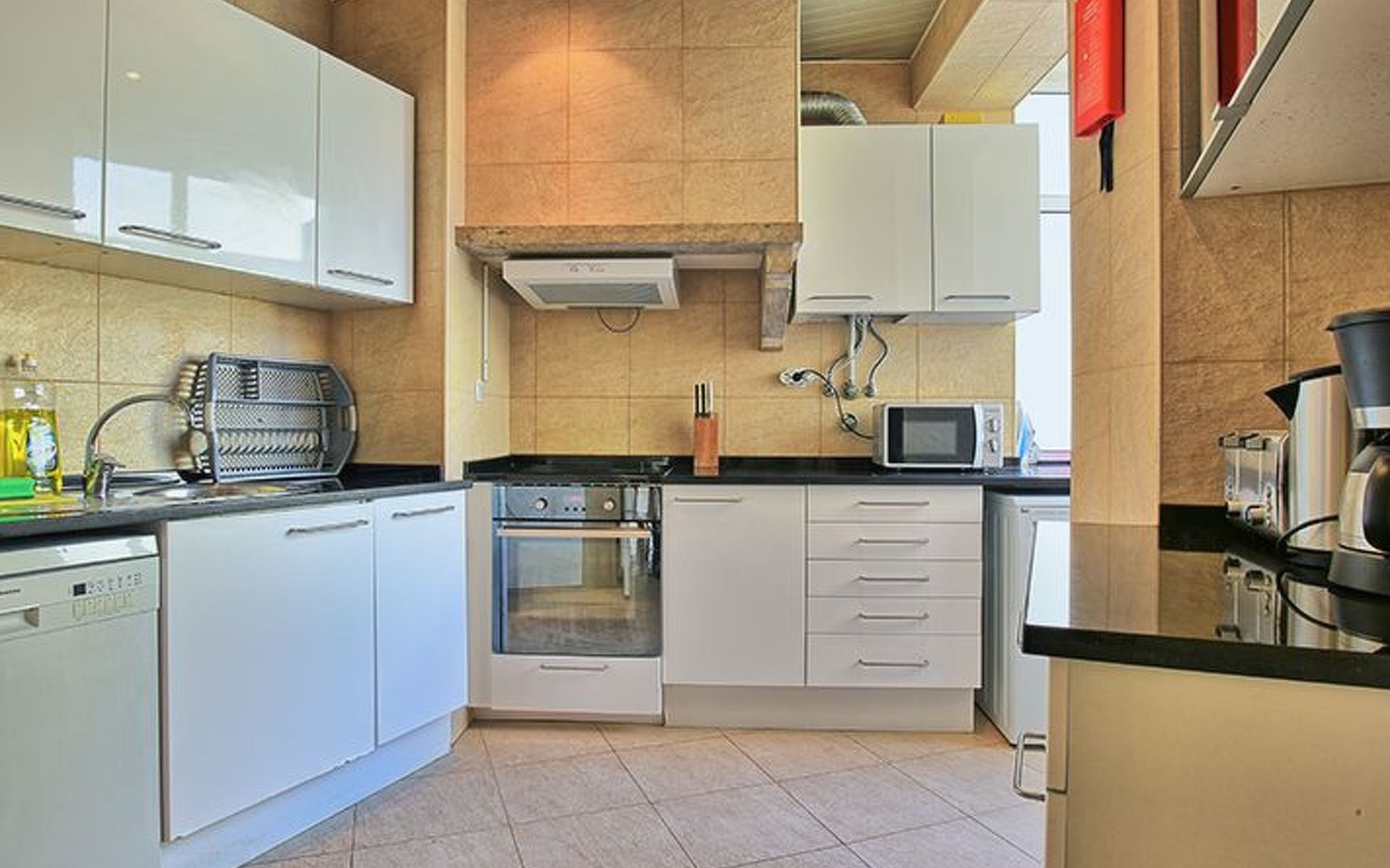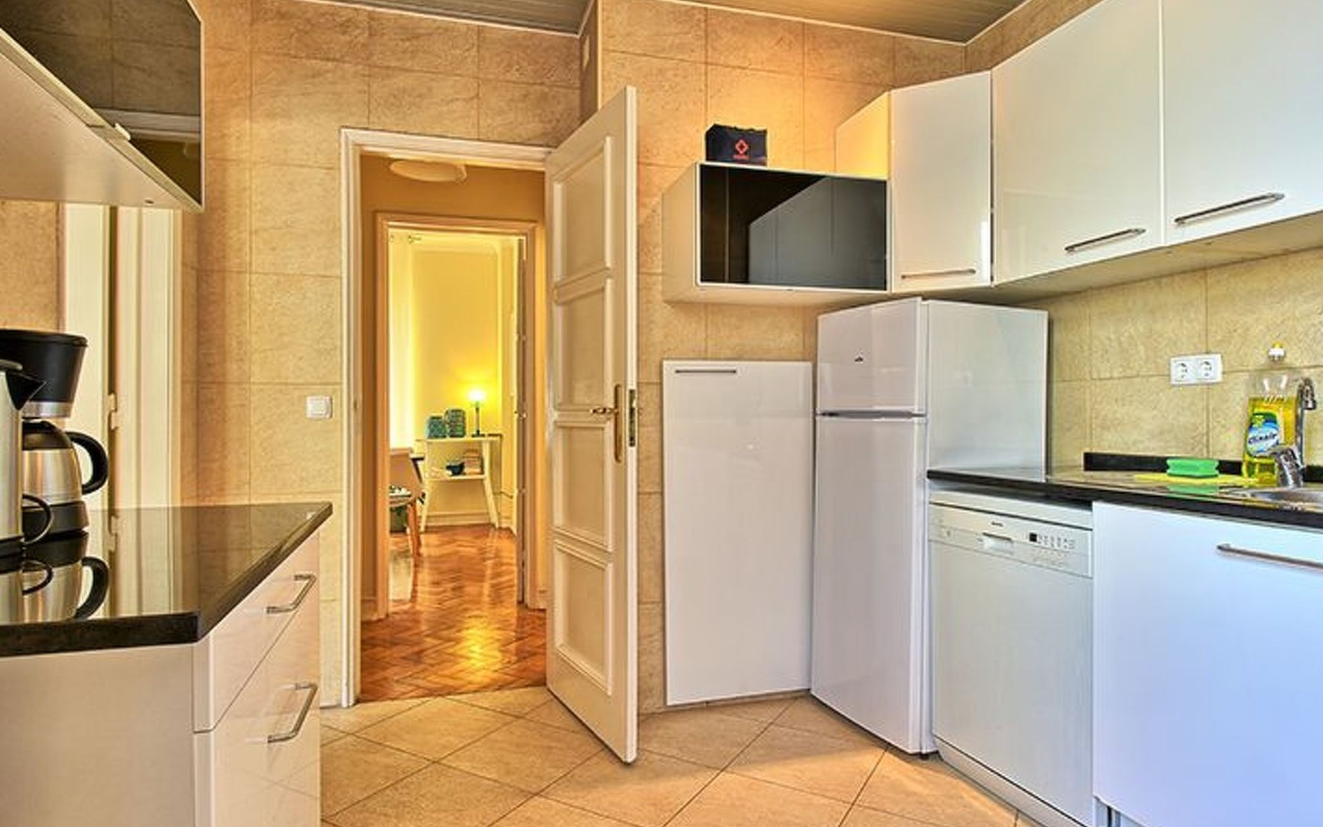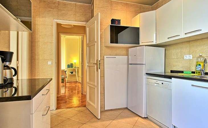 Inside, the apartment is prepared to ensure a hassle-free stay. Key features include a washing machine for private use, ensuring your wardrobe remains fresh throughout your stay. The kitchen is fully equipped with a dishwasher, an electric kettle, and a filter coffee machine, perfect for preparing meals or a quick coffee before heading out to explore the city. Cooling fans in each room provide relief during the warmer months, creating a comfortable and pleasant indoor environment for all guests.