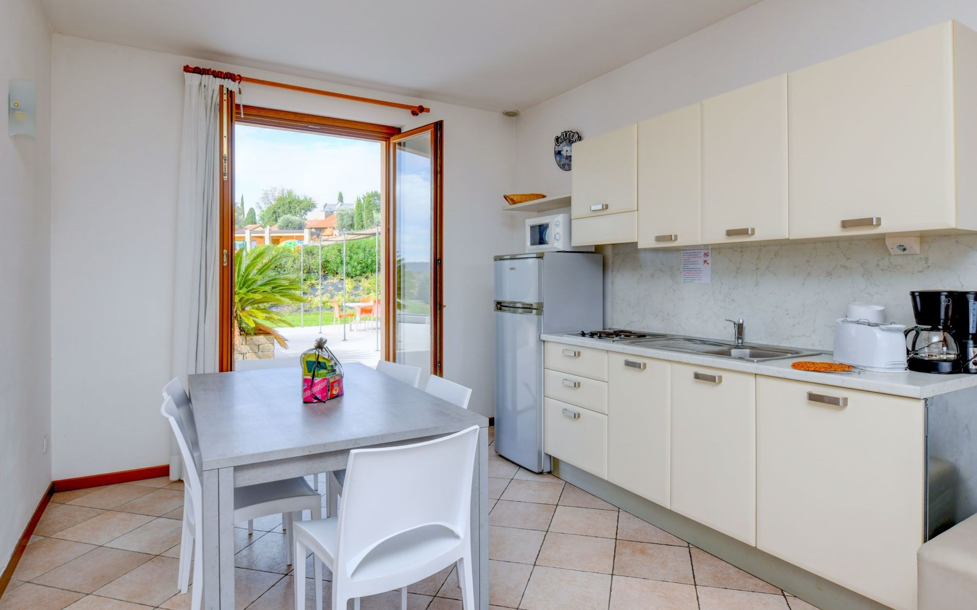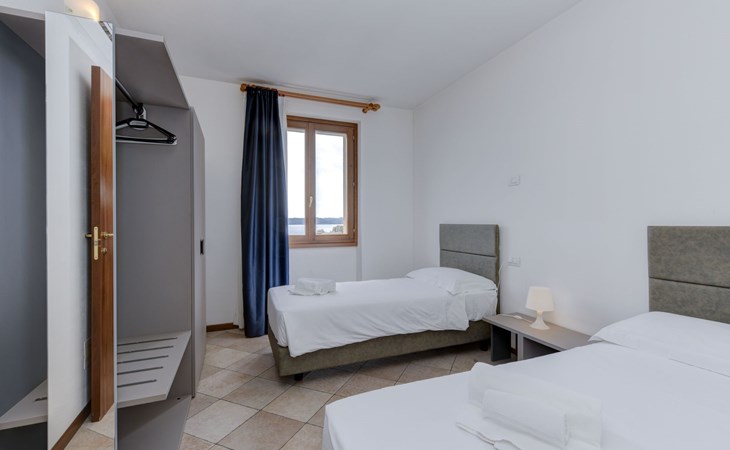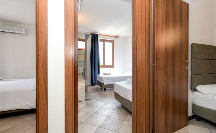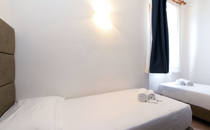 Inside, the flat boasts a cosy and functional layout, ideal for relaxation and entertainment. It comprises three bedrooms, each designed for your comfort: one with a double bed and the other two each with two single beds. The living area is an open space combining a living/dining room with a fully equipped kitchenette, where the comfortable furniture invites you to relax. Highlights include a modern satellite TV, perfect for entertaining evenings, while air conditioning ensures a cool and pleasant environment at all times. The modern and efficient kitchen is equipped with a microwave oven, while the bathroom has a practical shower.