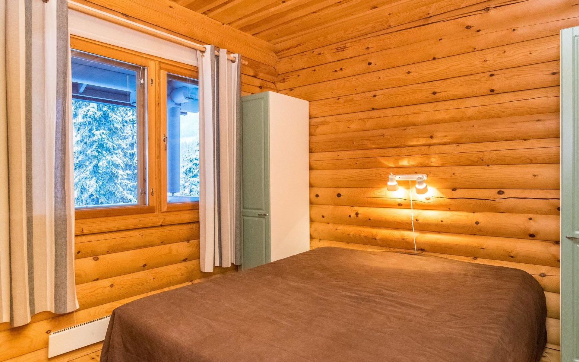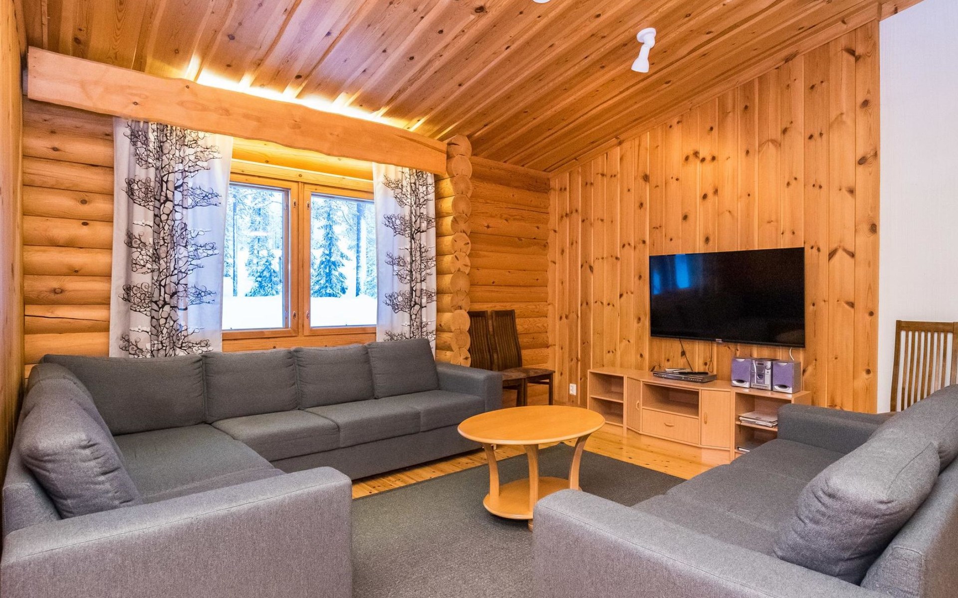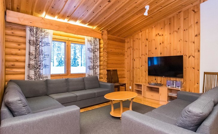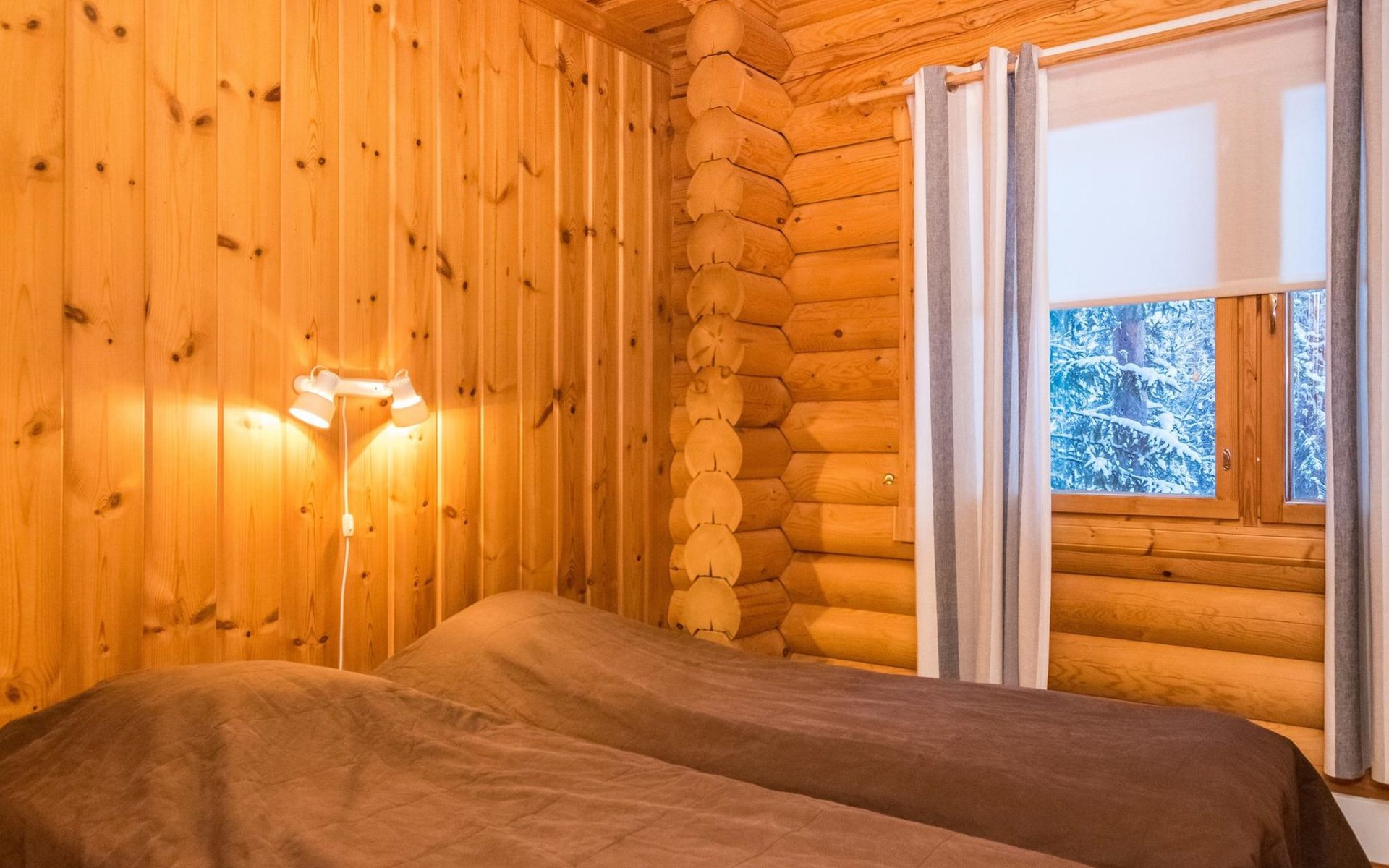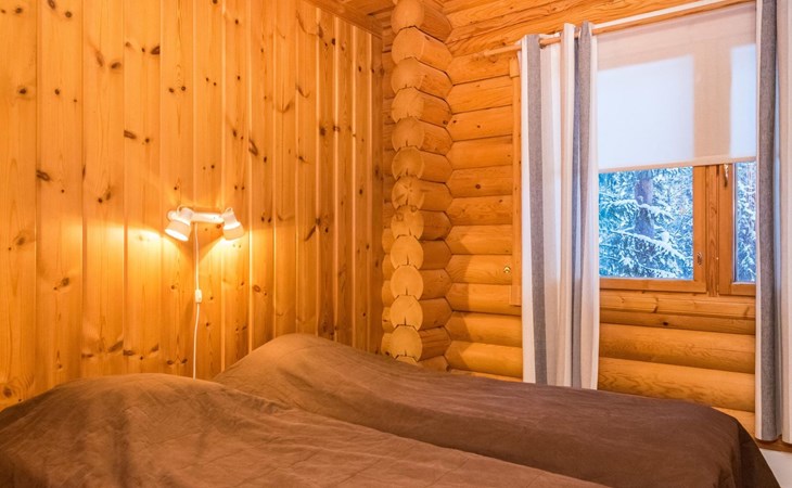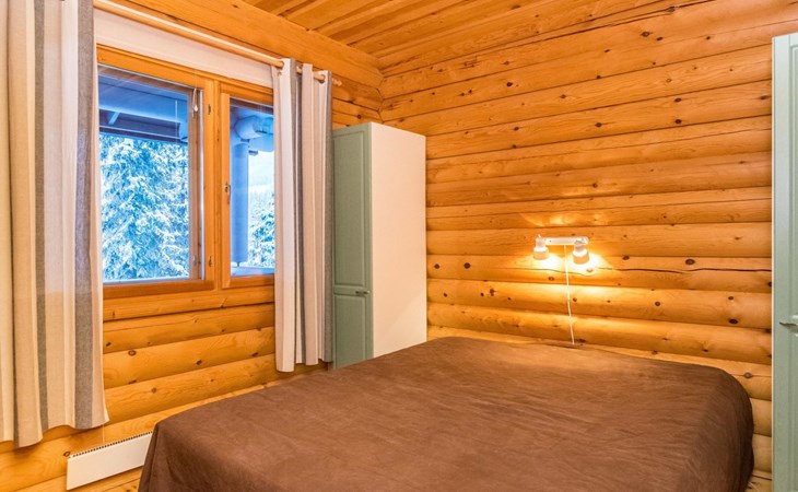 Cosy row house of massive logs, built in 2000. Roomy living room and kitchenette, with a sofa bed, fire place room with and a sofa bed, sauna, 2 WC’s, storage room, and terrace. 3 bedrooms with 2 beds in each. Firewood includes in price. Pets 30€/reservation