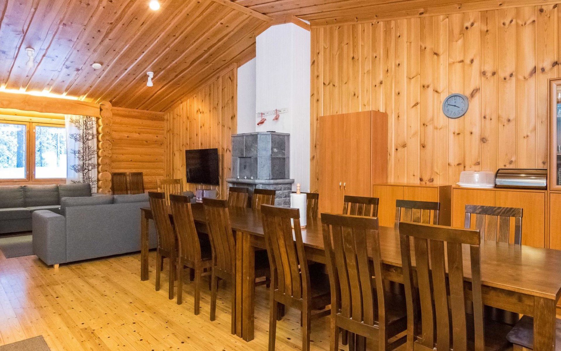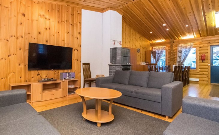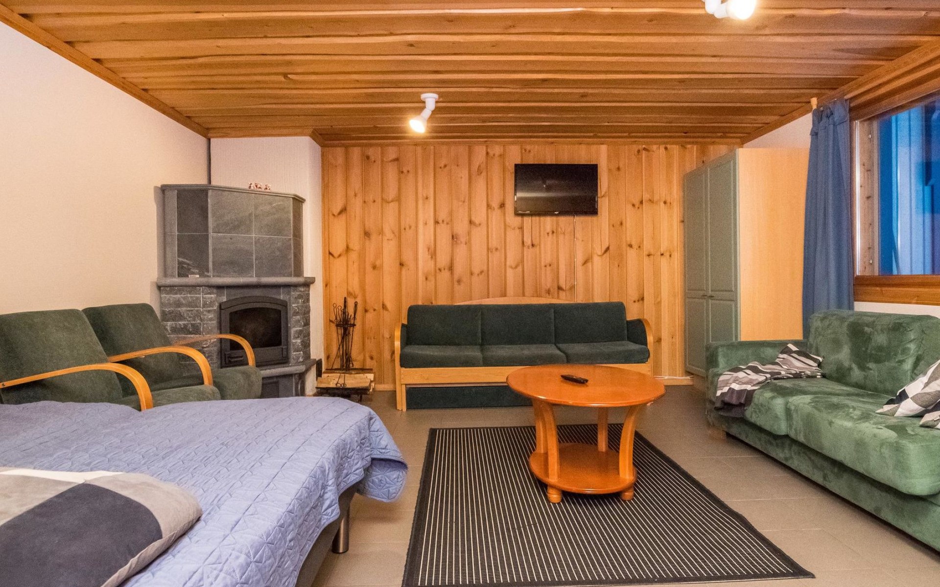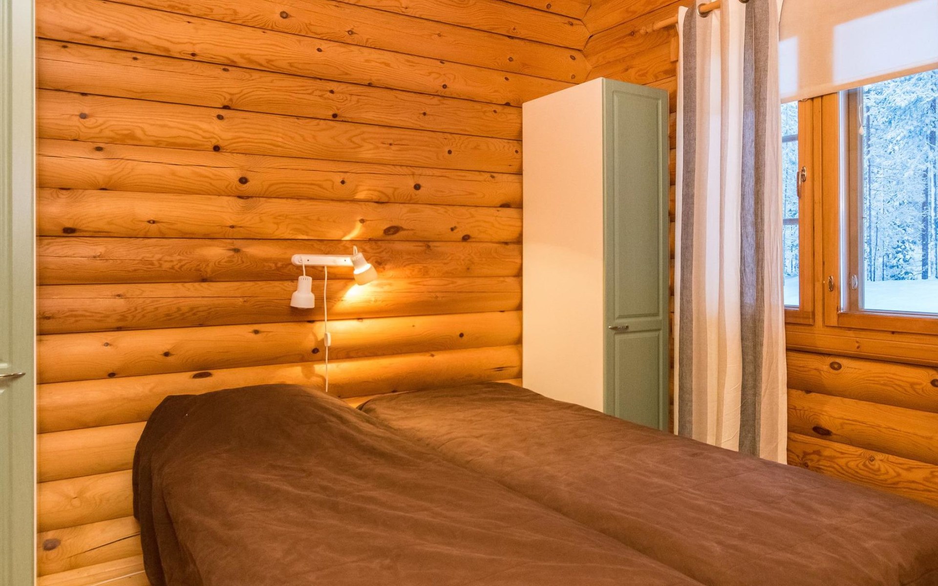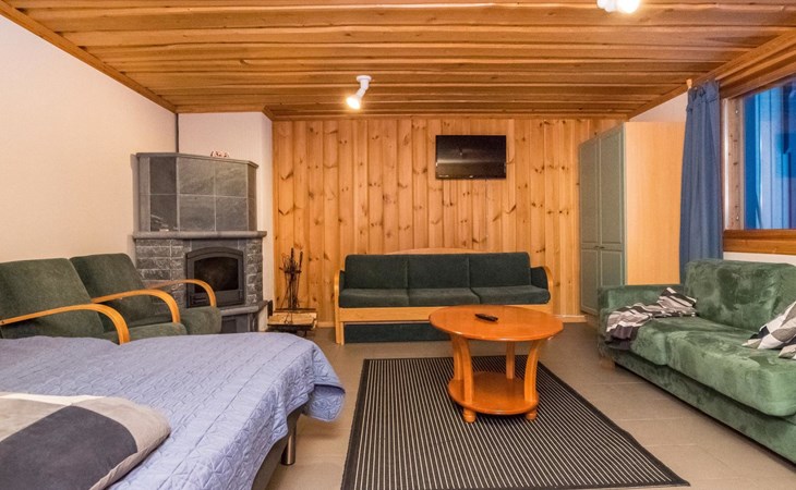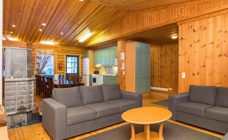 Cosy row house of massive logs, built in 2000. Roomy living room and kitchenette, with a sofa bed, fire place room with and a sofa bed, sauna, 2 WC’s, storage room, and terrace. 3 bedrooms with 2 beds in each. Firewood includes in price. Pets 30€/reservation