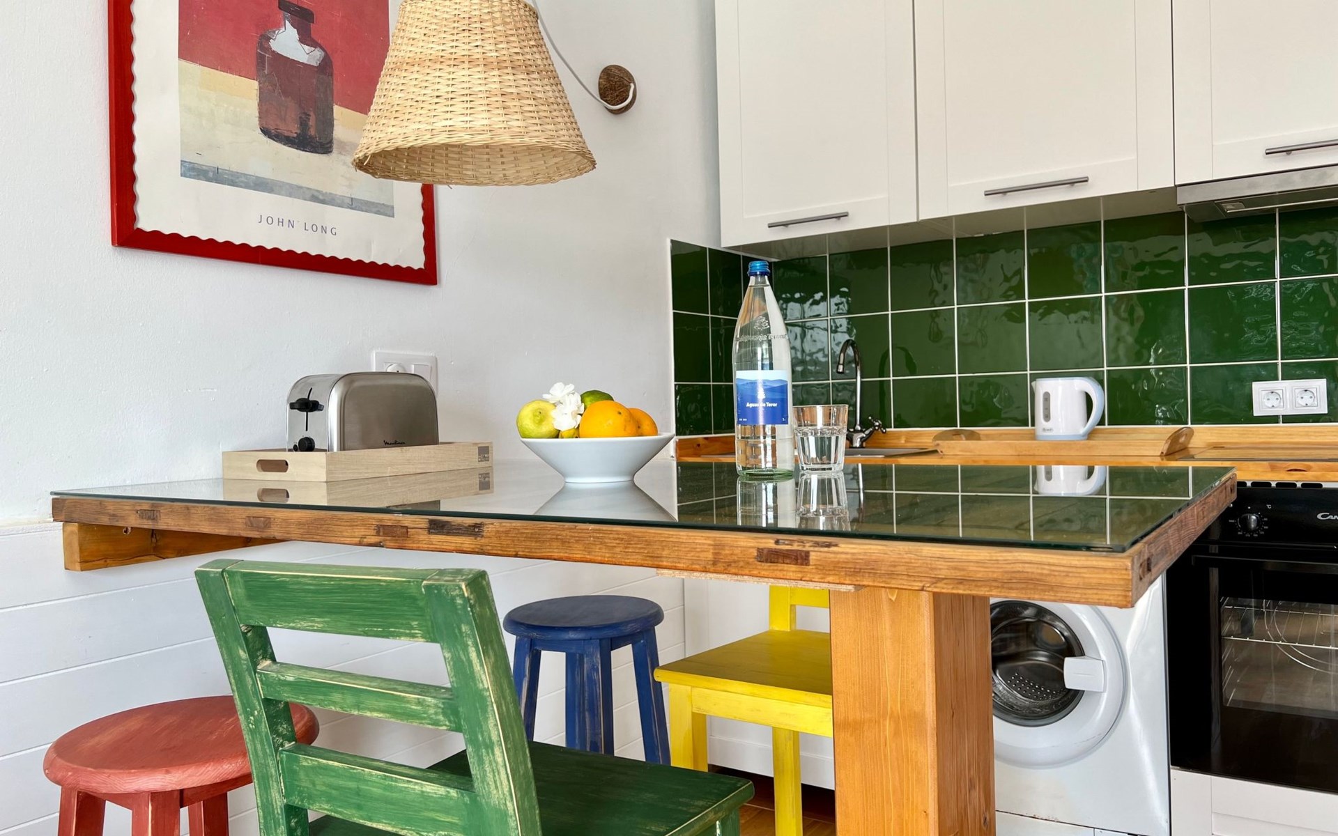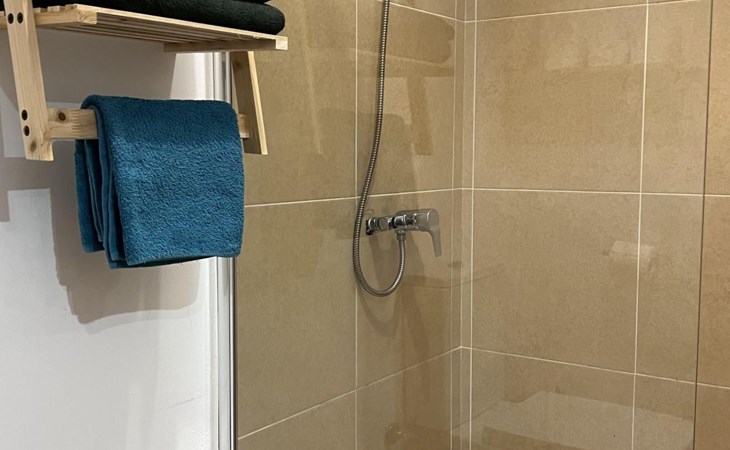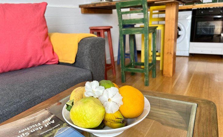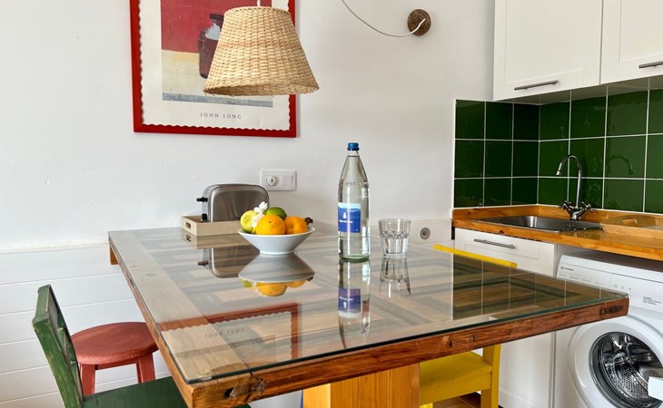 The flat impresses with an interior that leaves nothing to be desired. You will find an inviting bedroom with a double bed, a bathroom with shower, a fully equipped kitchen and a living and dining area with a cooking island (bar) with a comfortable sofa bed for two more guests. High-speed fibre optic WiFi also ensures unlimited connectivity. A washing machine is available for your self-catering needs, and the minibar promises refreshing drinks for a small extra charge.