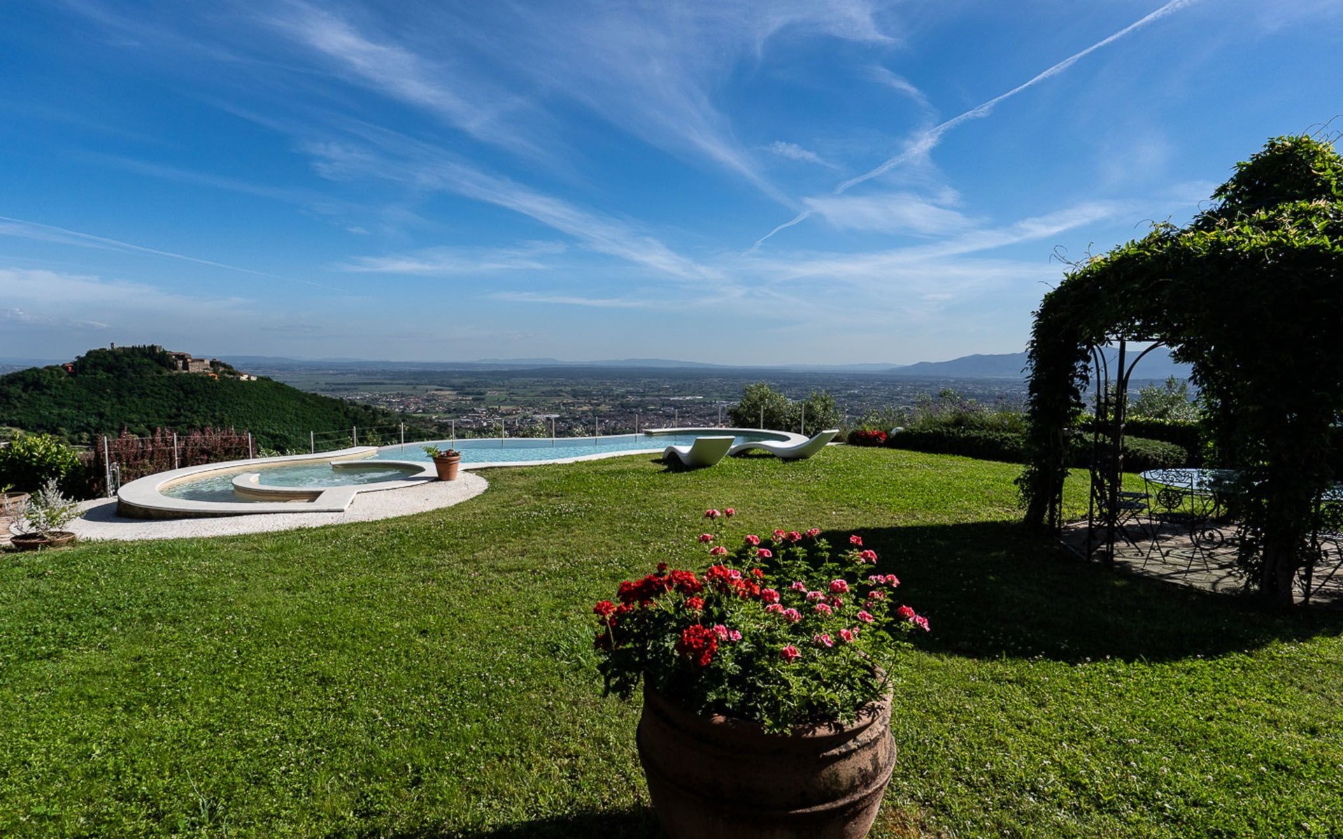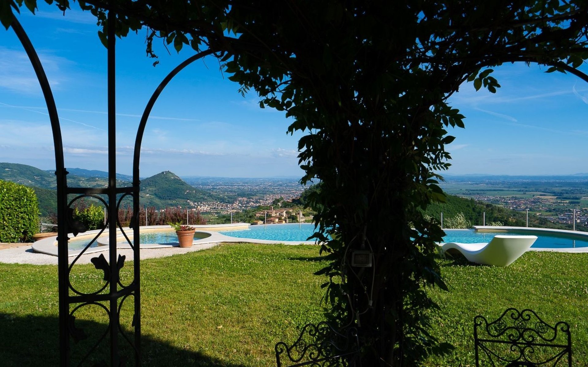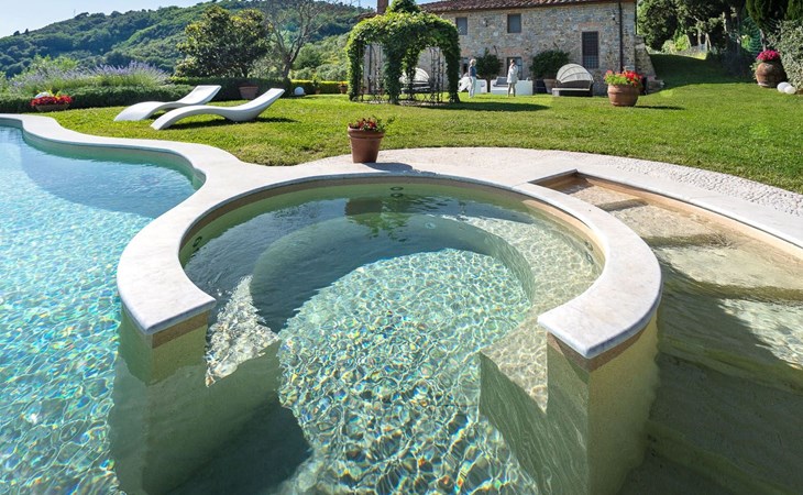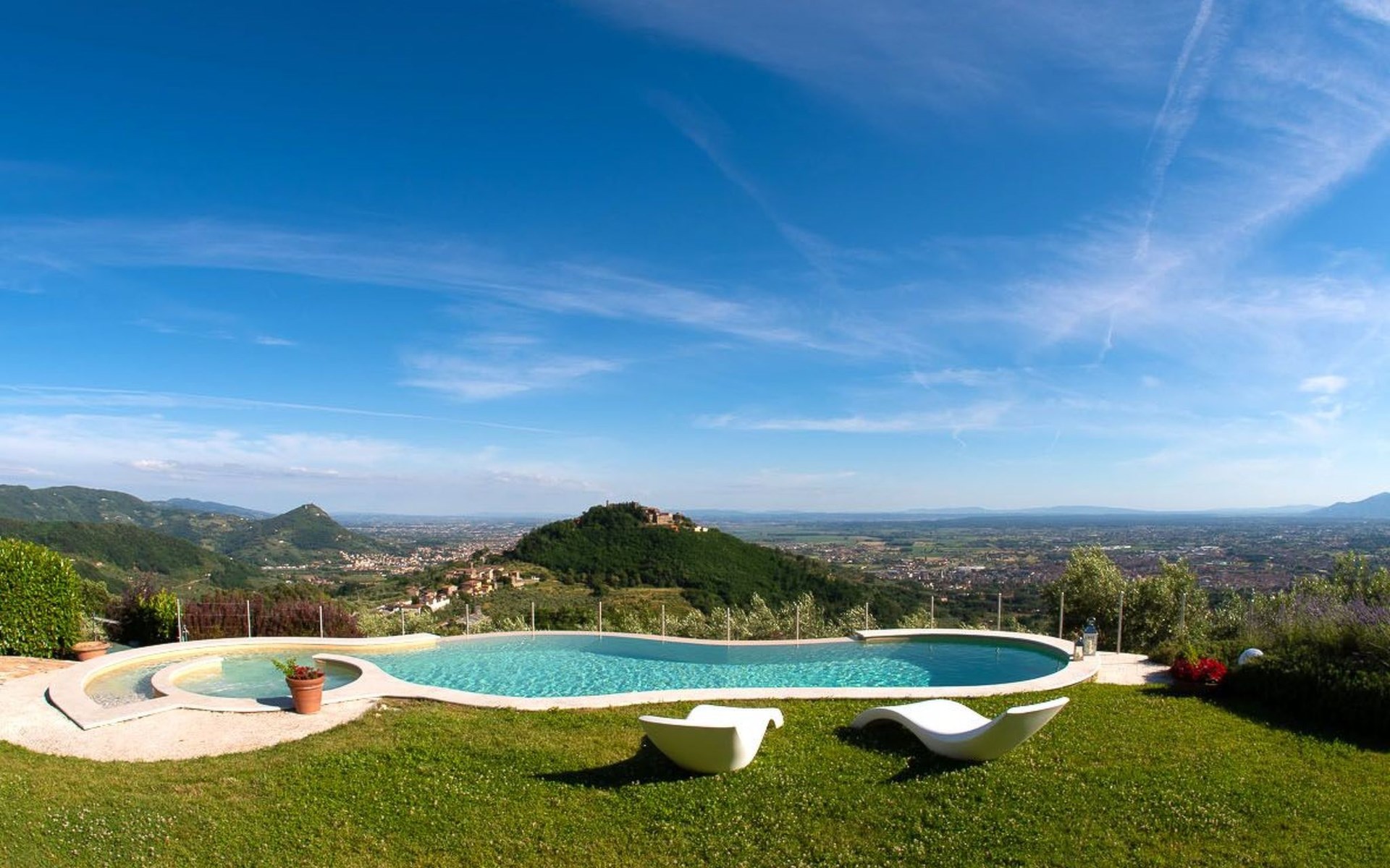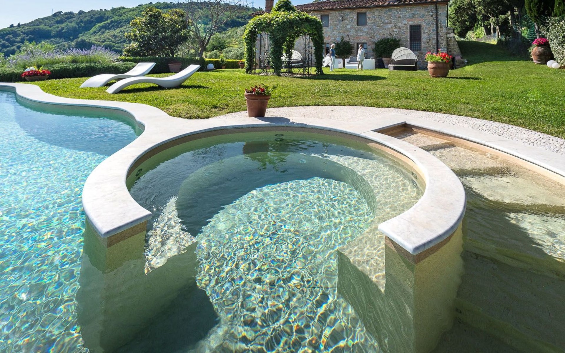 Big garden fenced with pool with jacuzzi seats and panoramic view