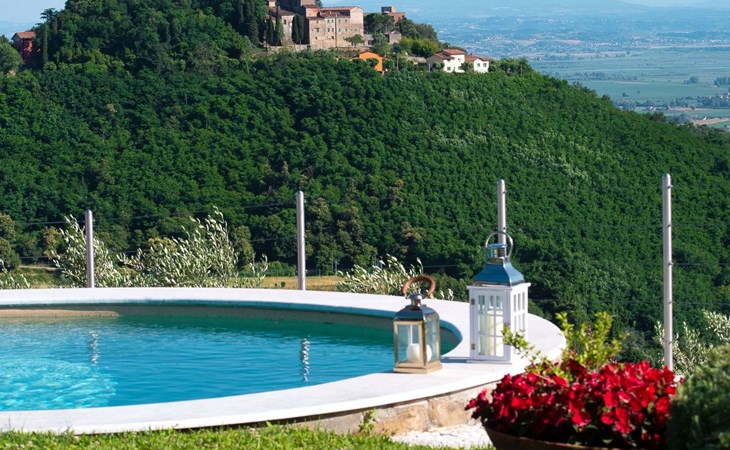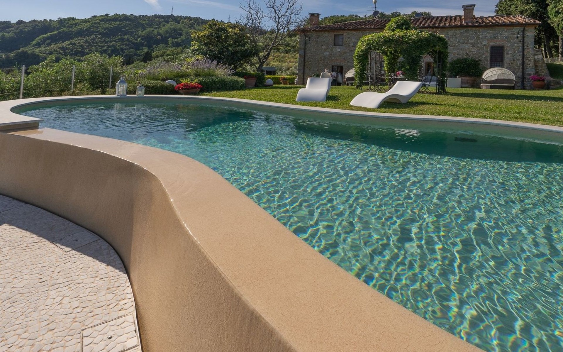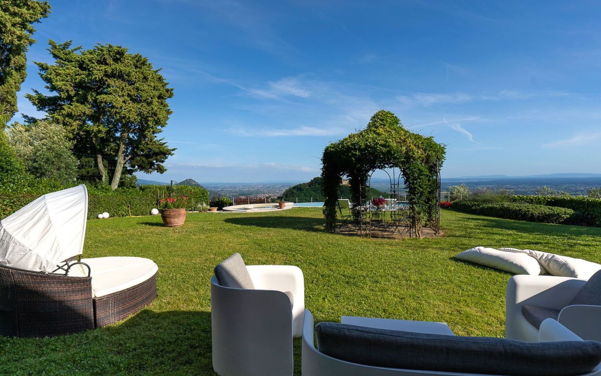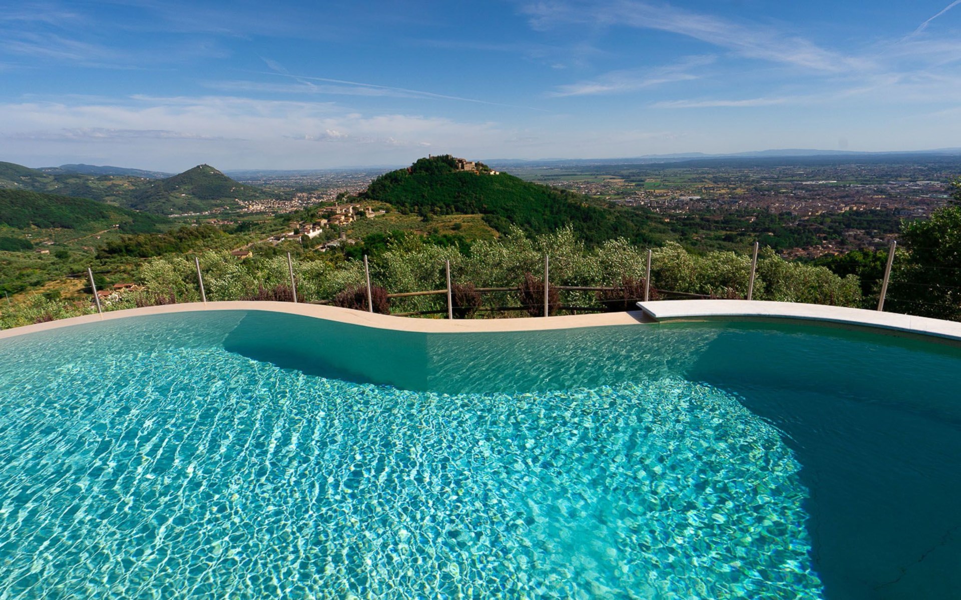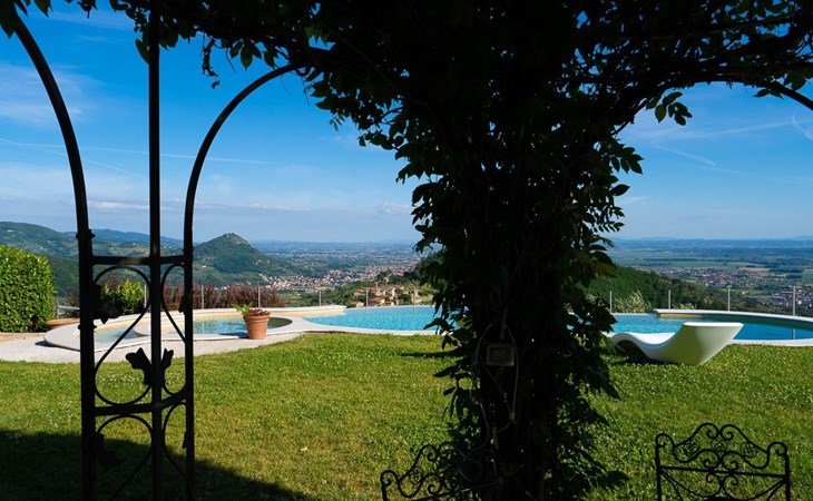 Big garden fenced with pool with jacuzzi seats and panoramic view
