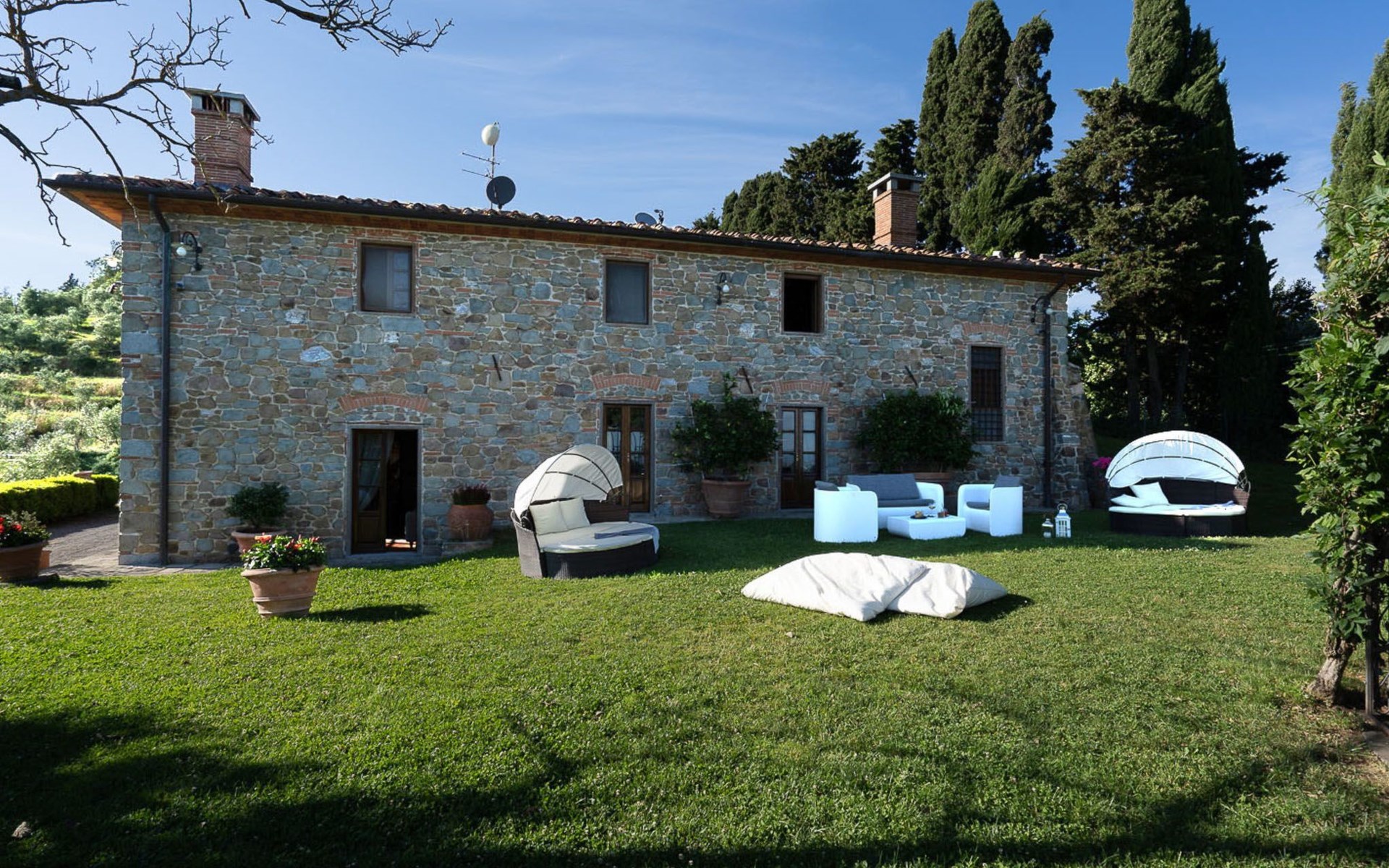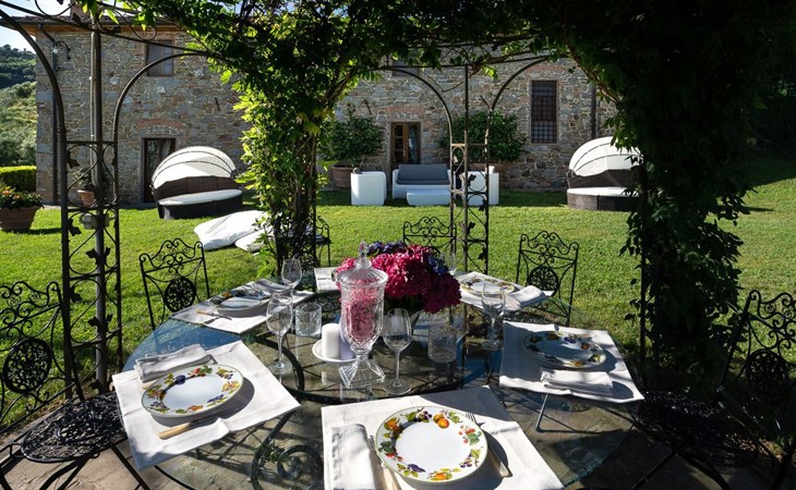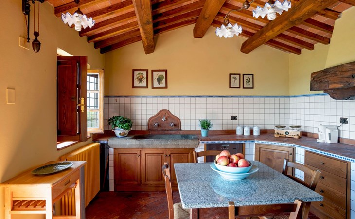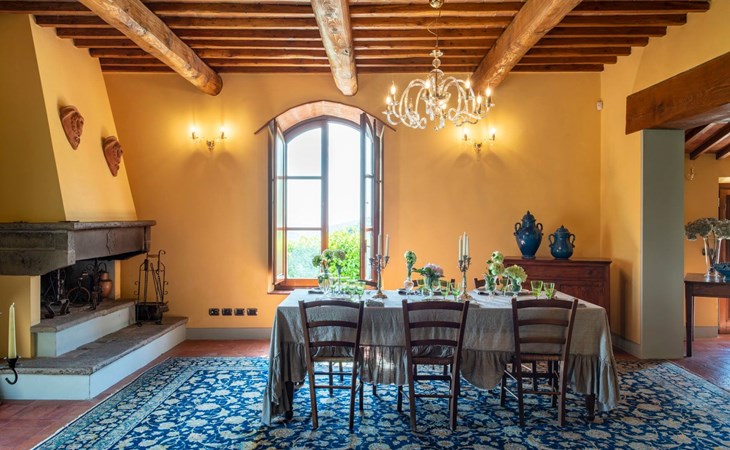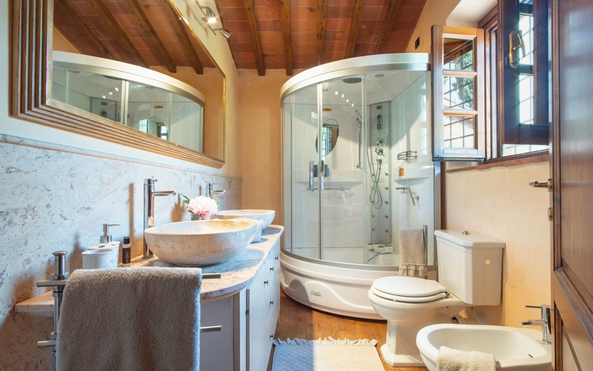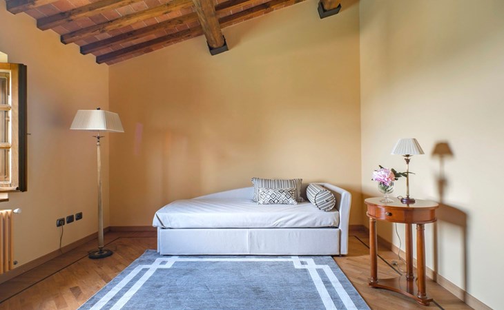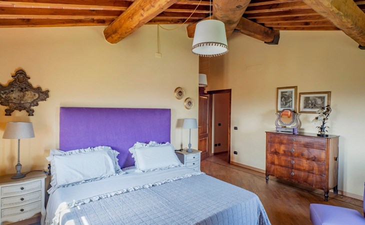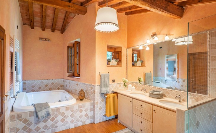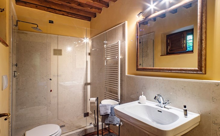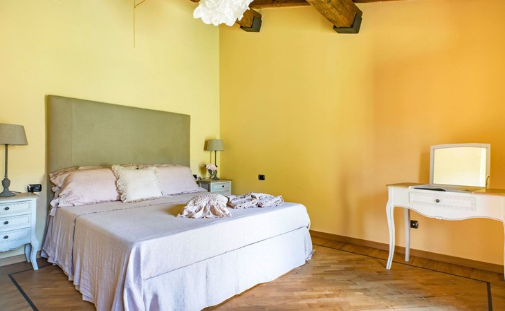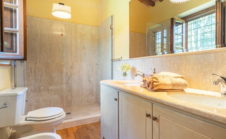 On the ground floor of the main building there’s a large open space with several rooms including a large living room with beamed ceiling, the dining area, an original stone fireplace, a room with a sofa bed for two people and a kitchen fully equipped. All rooms overlook the garden where a magnificent gazebo will welcome you to dine outdoors. On the ground floor there’s the first bathroom and the laundry room. Casa Loretta uses exclusive linen with the refined atmospheres of @opificodeisogni. On the first floor there are 4 bedrooms and 3 bathrooms: 1 bedroom with double bed and private bathroom with whirlpool tub, double sink and shower; 2 double bedrooms and 2 private bathrooms and 1 bedroom with two single beds that can be transformed into a sitting room. CASA LORETTA has windows with mosquitos nets and has a very reliable wifi connection.
