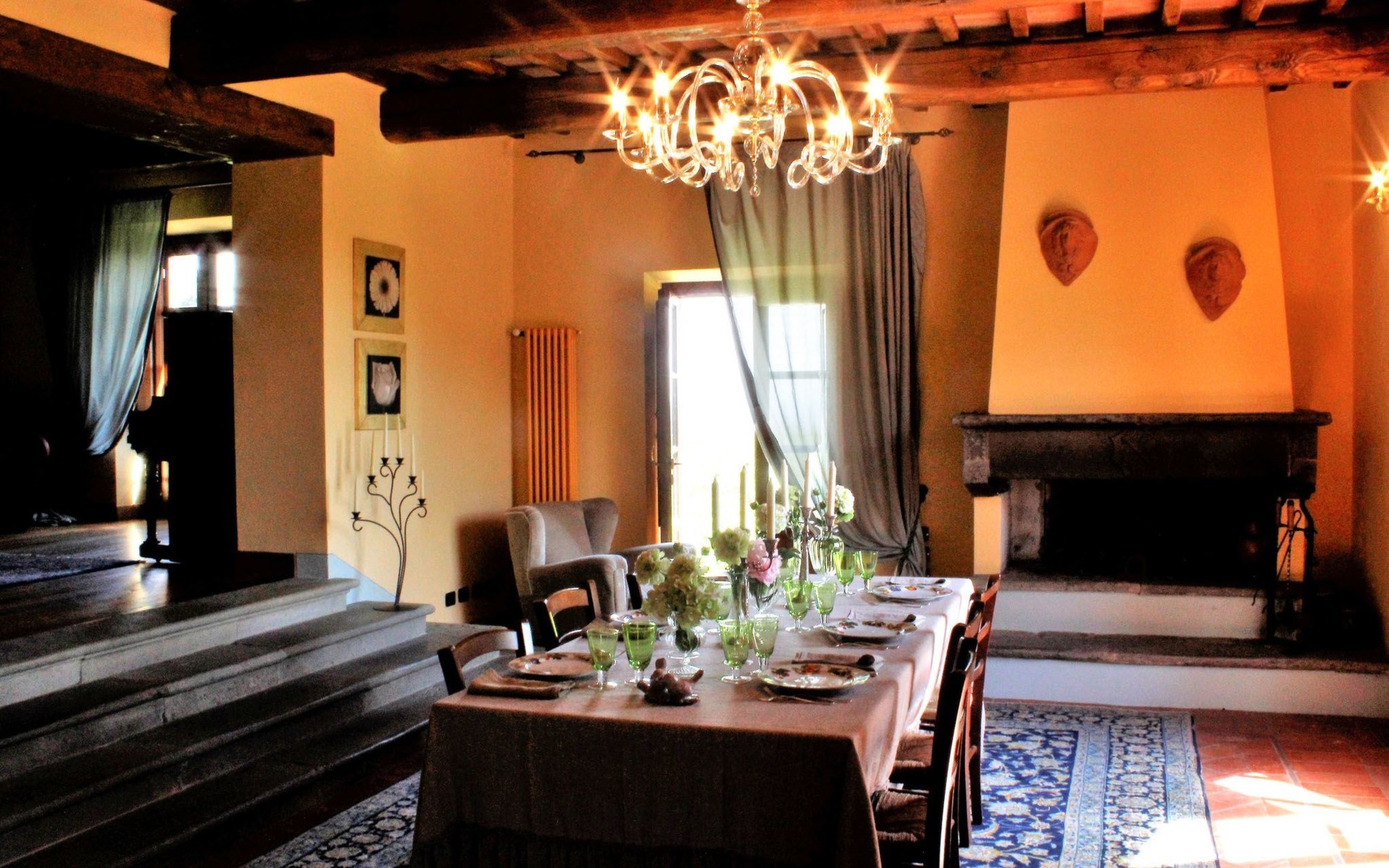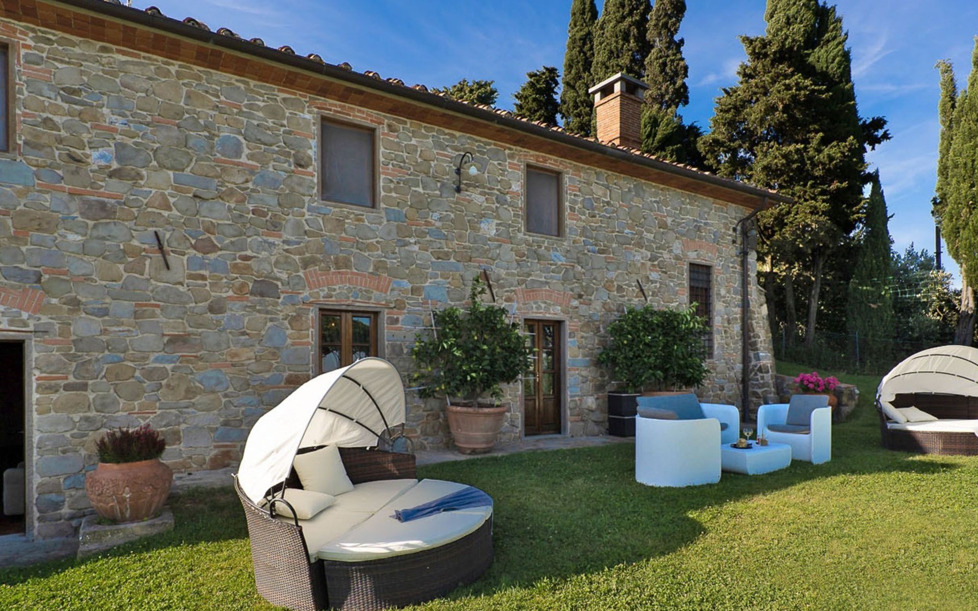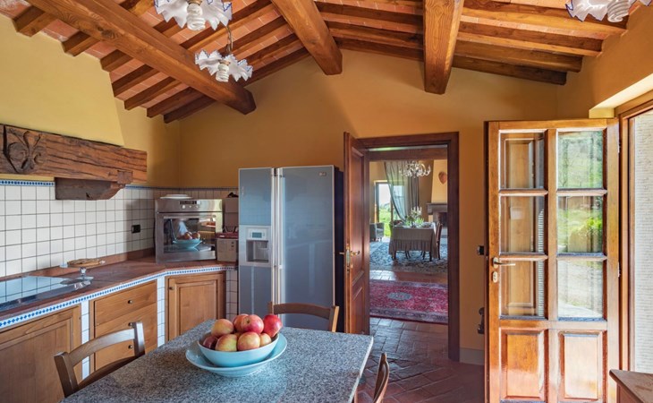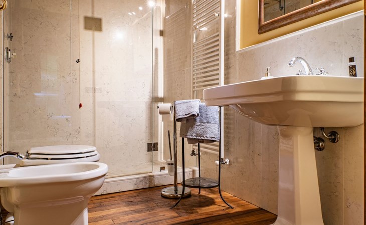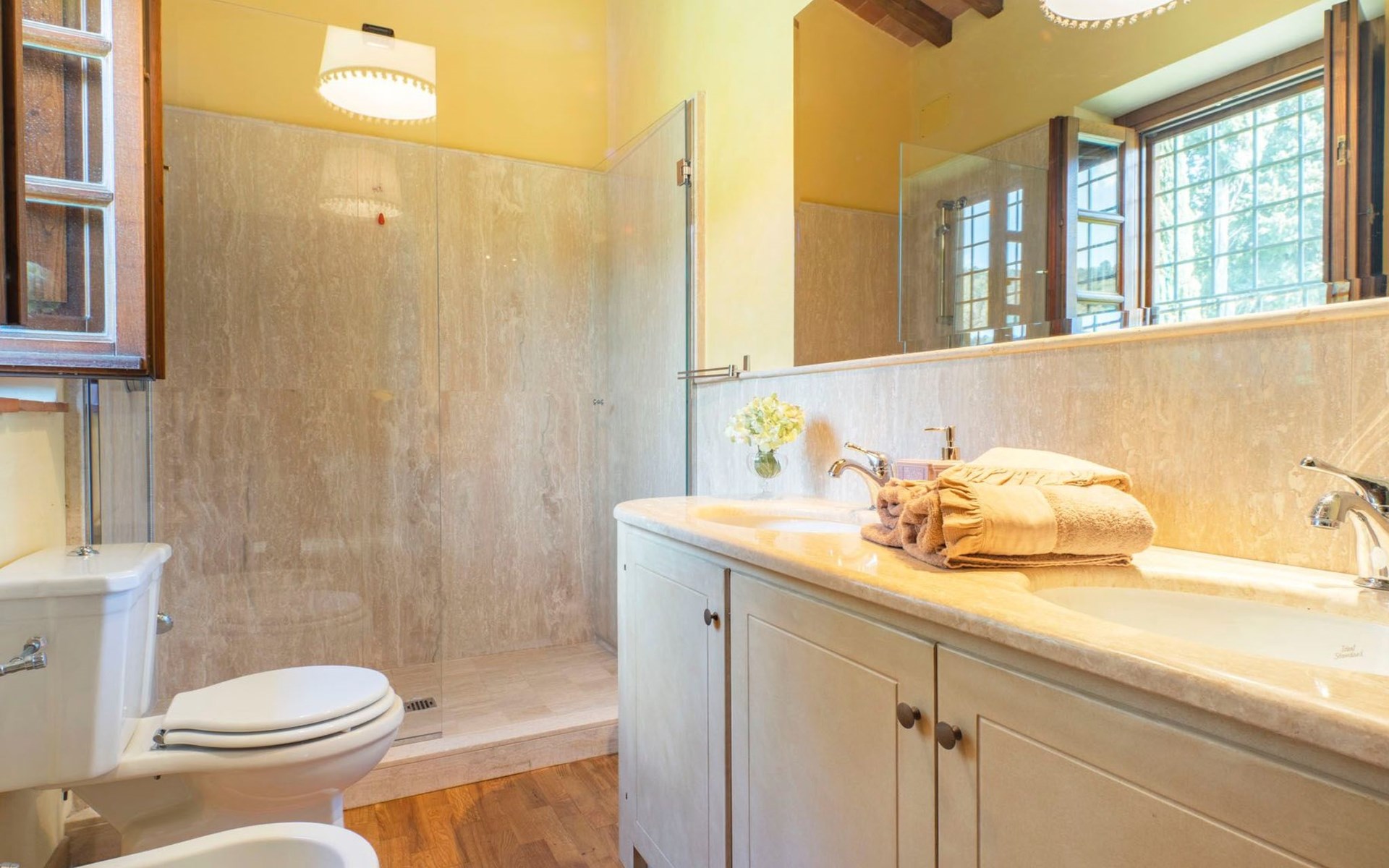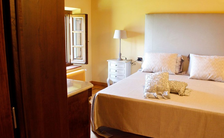 On the ground floor of the main building there’s a large open space with several rooms including a large living room with beamed ceiling, the dining area, an original stone fireplace, a room with a sofa bed for two people and a kitchen fully equipped. All rooms overlook the garden where a magnificent gazebo will welcome you to dine outdoors. On the ground floor there’s the first bathroom and the laundry room. Casa Loretta uses exclusive linen with the refined atmospheres of @opificodeisogni. On the first floor there are 4 bedrooms and 3 bathrooms: 1 bedroom with double bed and private bathroom with whirlpool tub, double sink and shower; 2 double bedrooms and 2 private bathrooms and 1 bedroom with two single beds that can be transformed into a sitting room. CASA LORETTA has windows with mosquitos nets and has a very reliable wifi connection.