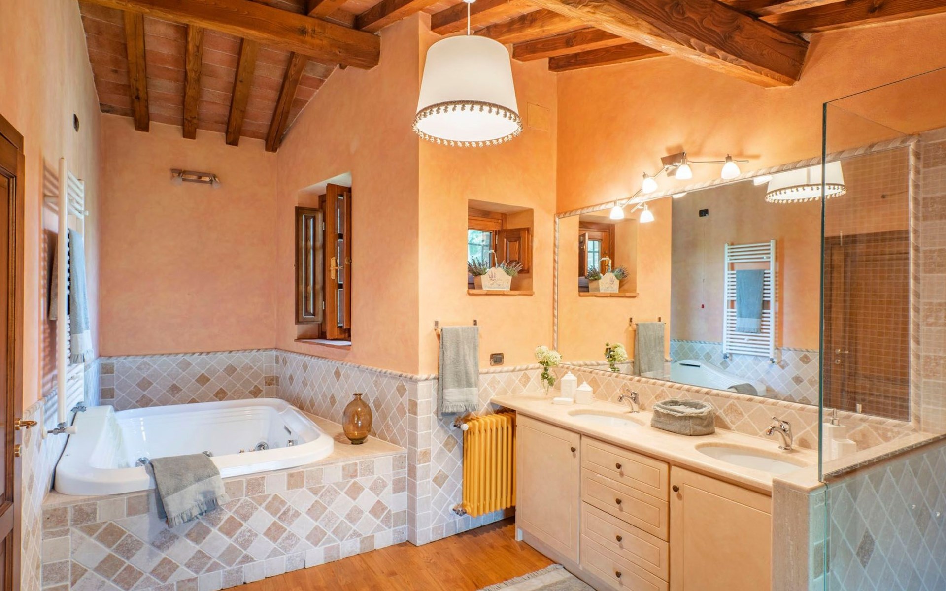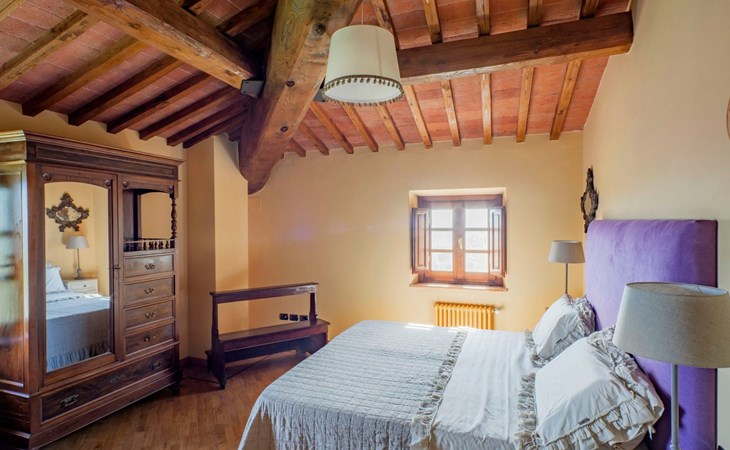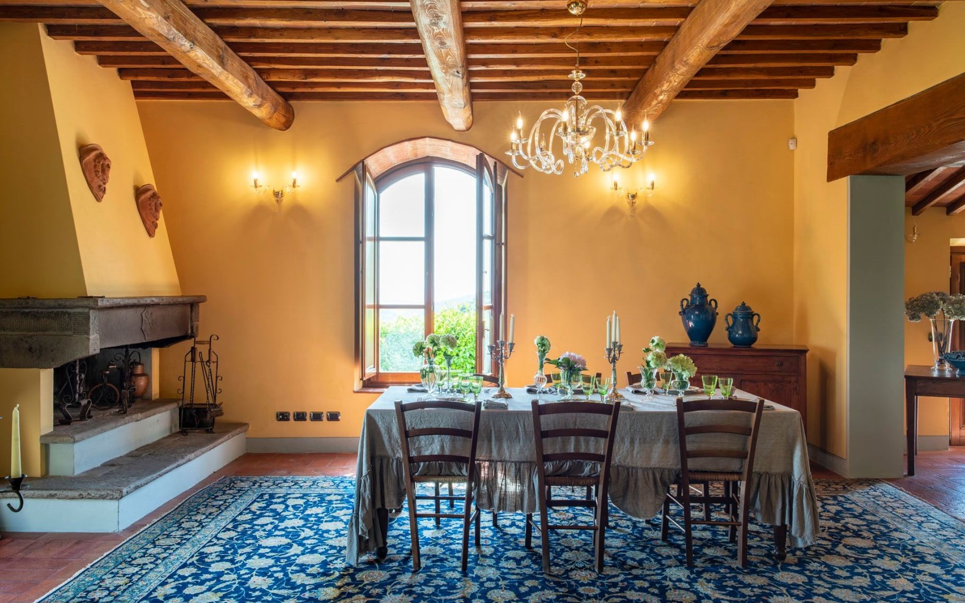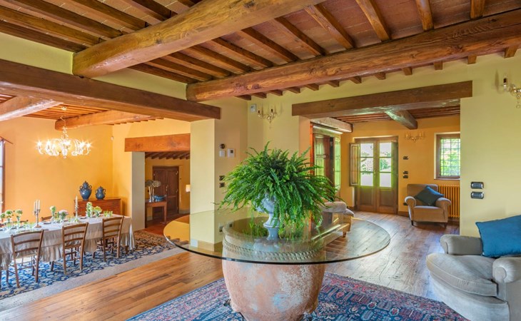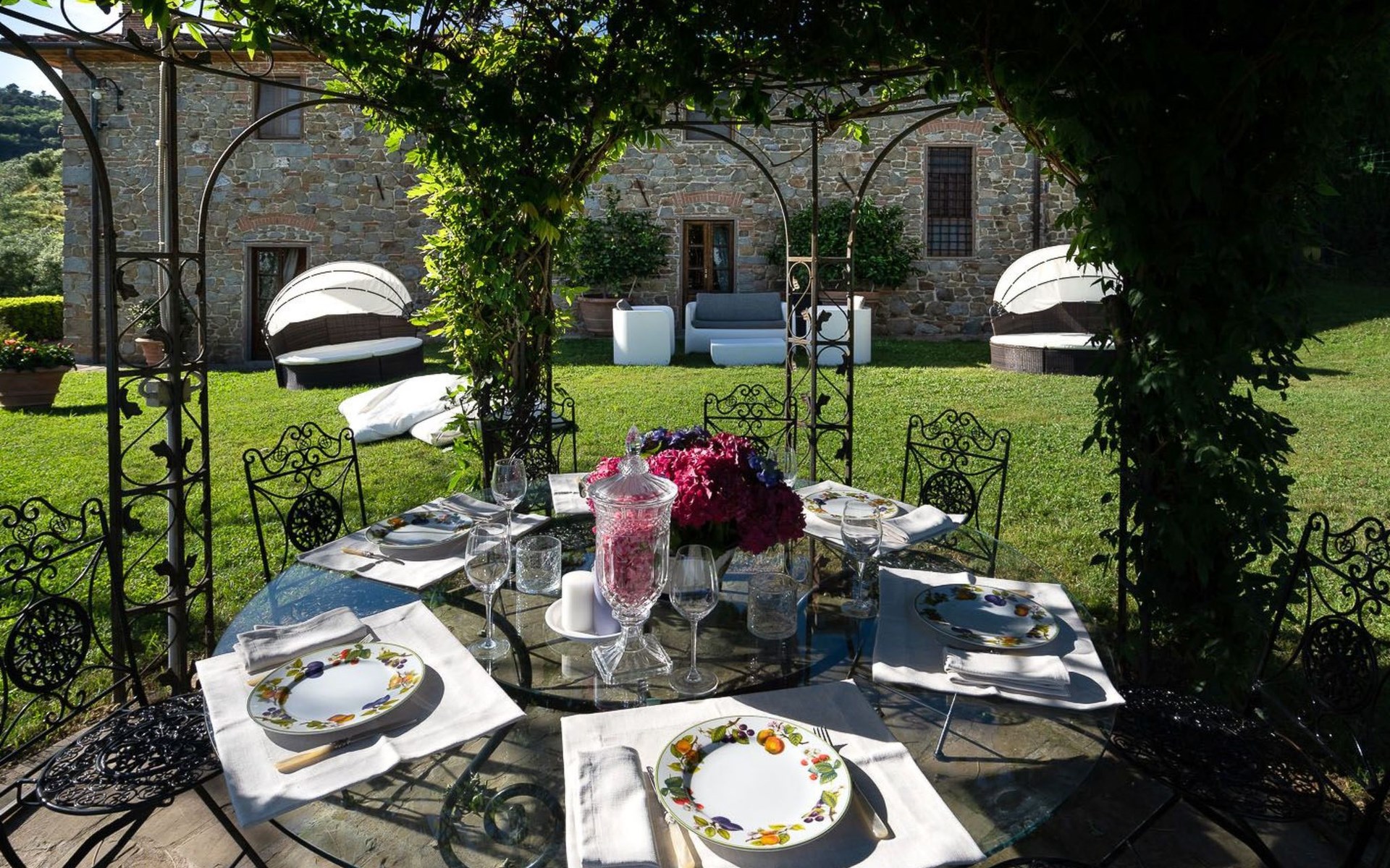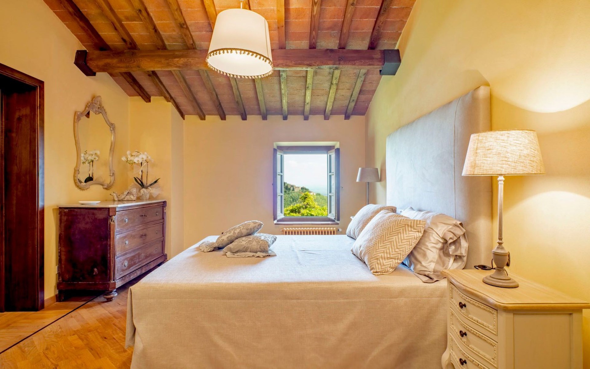 On the ground floor of the main building there’s a large open space with several rooms including a large living room with beamed ceiling, the dining area, an original stone fireplace, a room with a sofa bed for two people and a kitchen fully equipped. All rooms overlook the garden where a magnificent gazebo will welcome you to dine outdoors. On the ground floor there’s the first bathroom and the laundry room. Casa Loretta uses exclusive linen with the refined atmospheres of @opificodeisogni. On the first floor there are 4 bedrooms and 3 bathrooms: 1 bedroom with double bed and private bathroom with whirlpool tub, double sink and shower; 2 double bedrooms and 2 private bathrooms and 1 bedroom with two single beds that can be transformed into a sitting room. CASA LORETTA has windows with mosquitos nets and has a very reliable wifi connection.