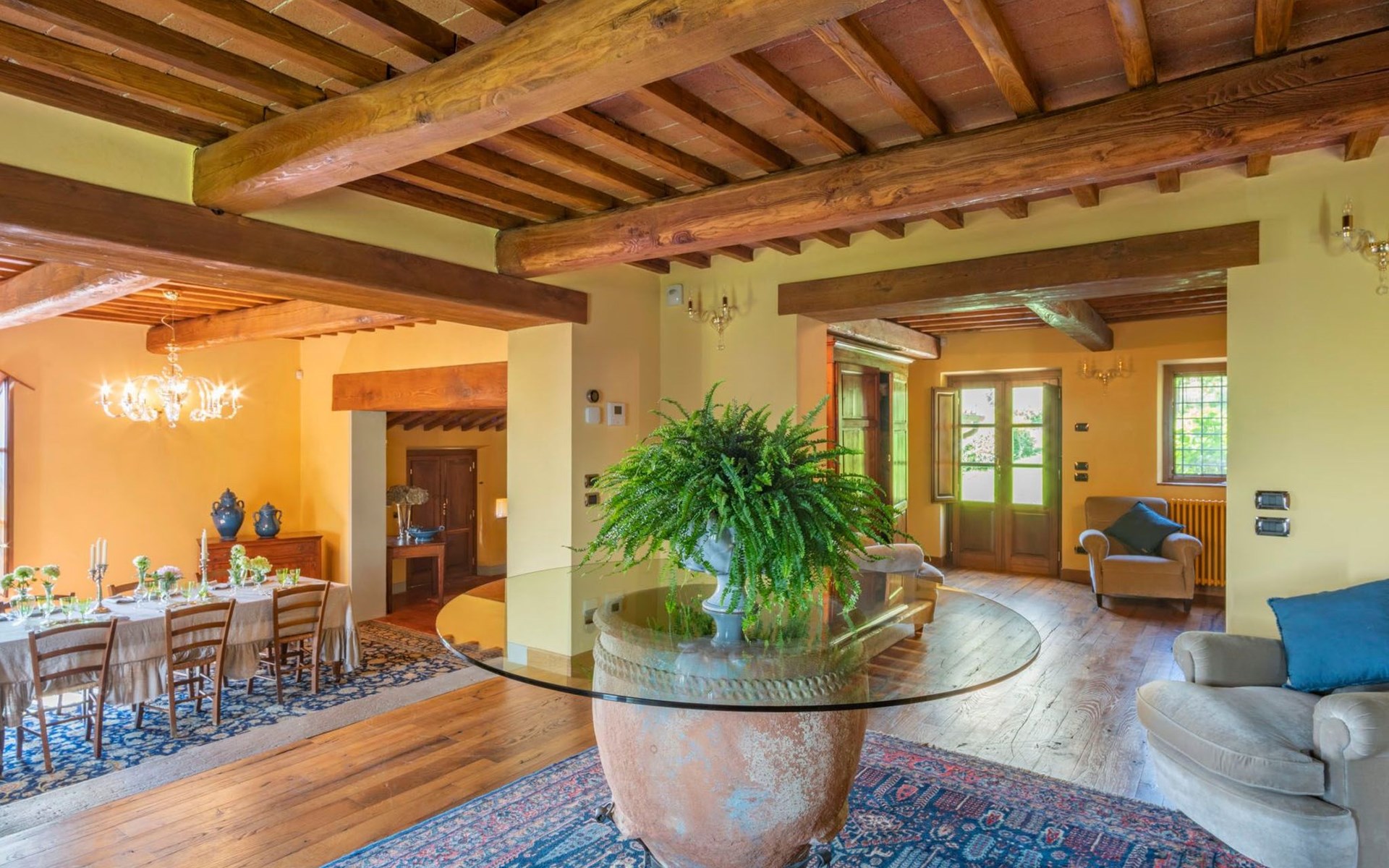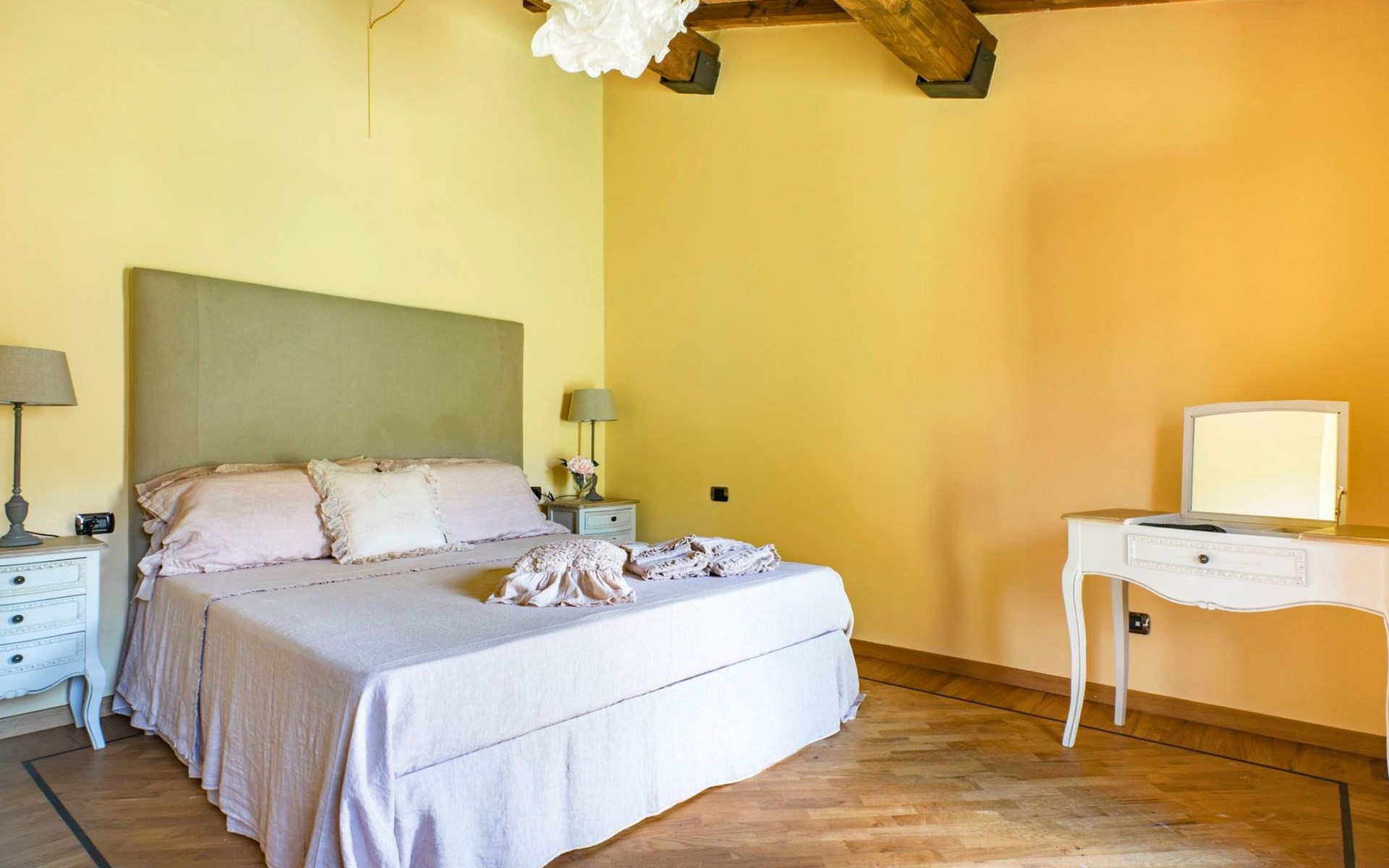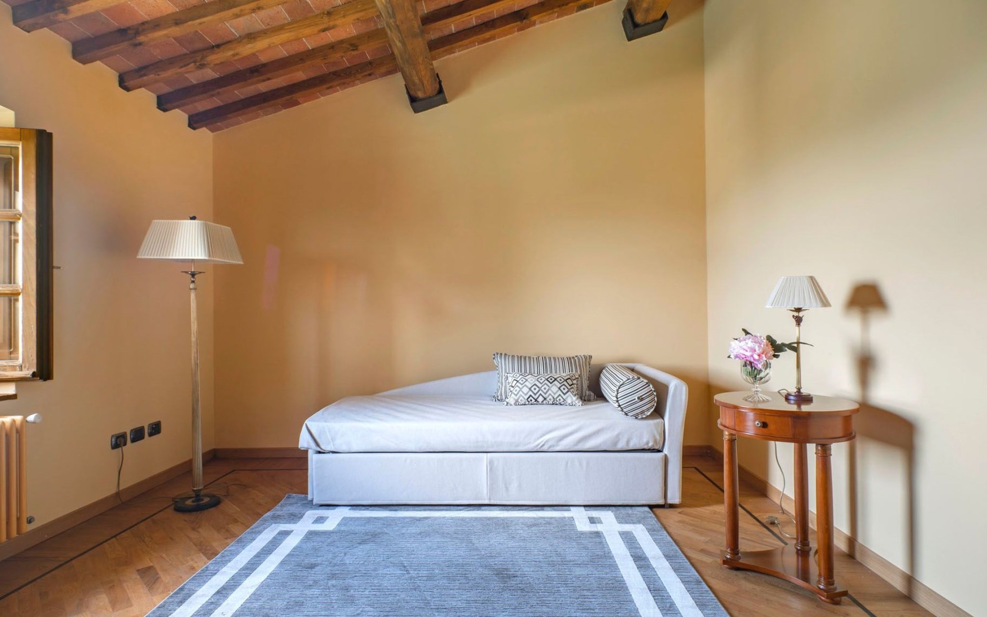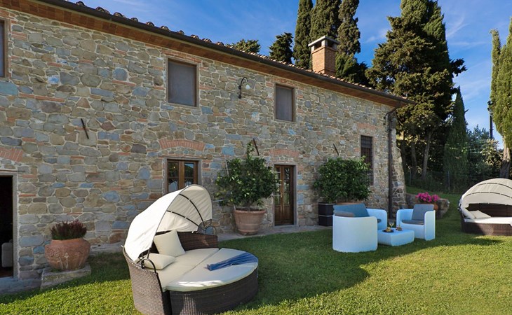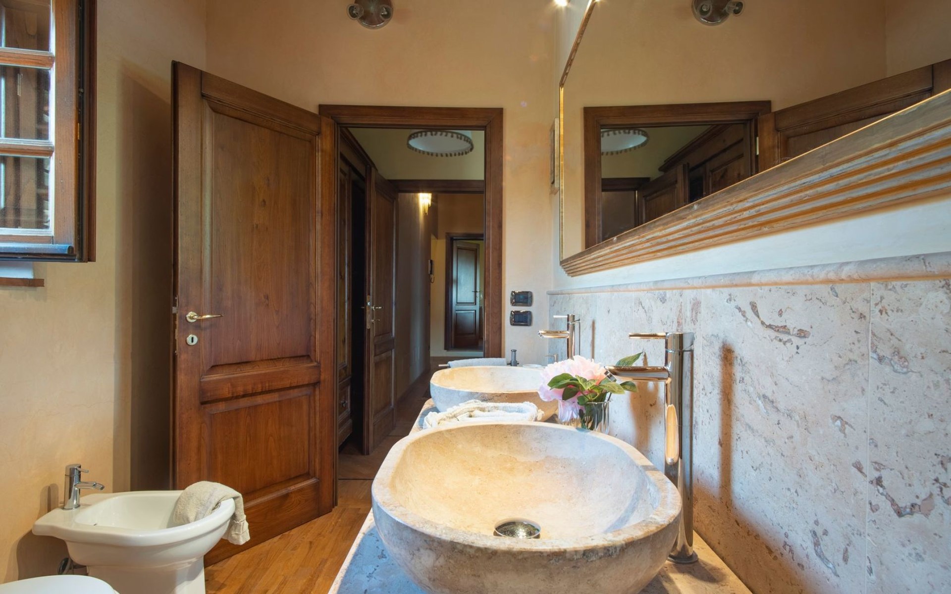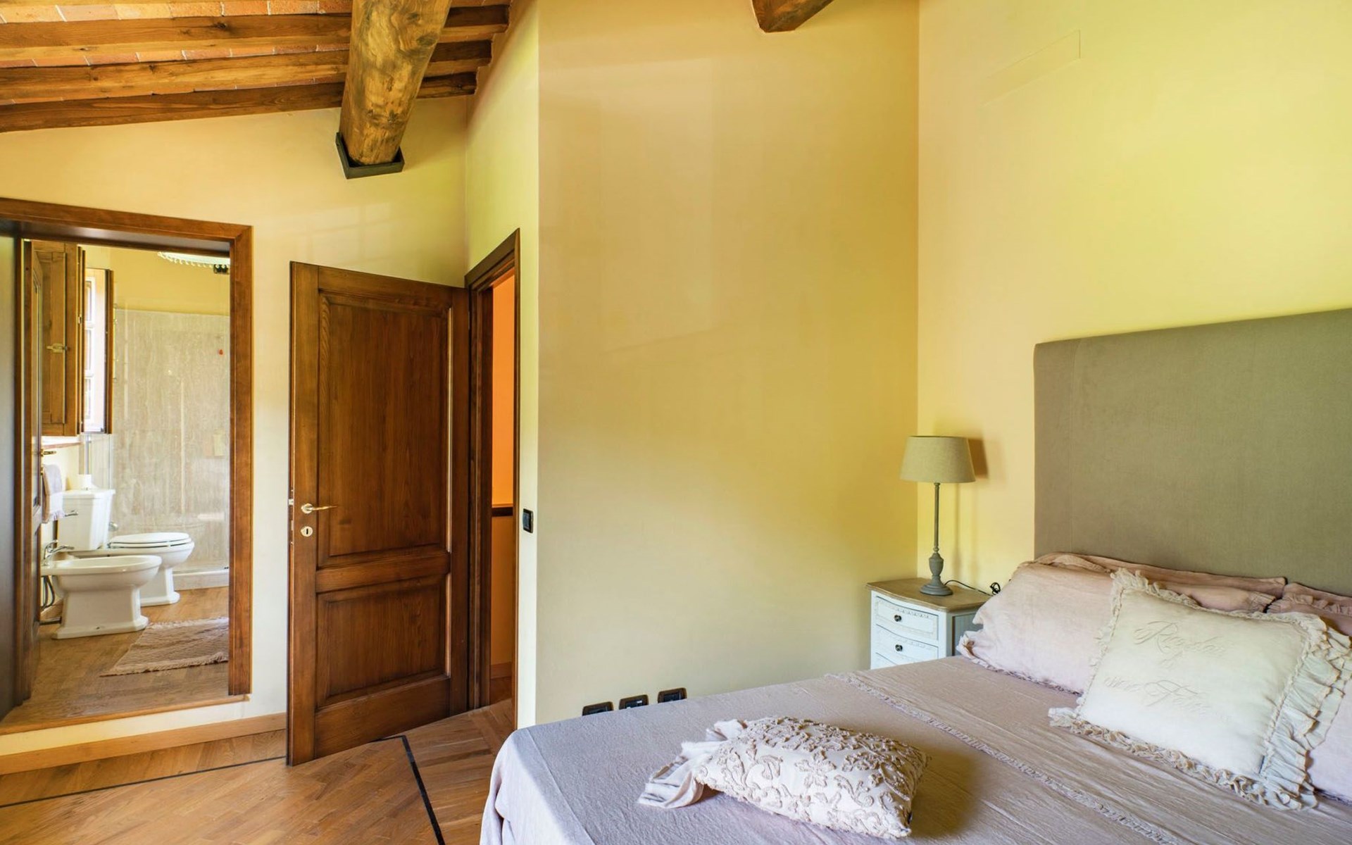 On the ground floor of the main building there’s a large open space with several rooms including a large living room with beamed ceiling, the dining area, an original stone fireplace, a room with a sofa bed for two people and a kitchen fully equipped. All rooms overlook the garden where a magnificent gazebo will welcome you to dine outdoors. On the ground floor there’s the first bathroom and the laundry room. Casa Loretta uses exclusive linen with the refined atmospheres of @opificodeisogni. On the first floor there are 4 bedrooms and 3 bathrooms: 1 bedroom with double bed and private bathroom with whirlpool tub, double sink and shower; 2 double bedrooms and 2 private bathrooms and 1 bedroom with two single beds that can be transformed into a sitting room. CASA LORETTA has windows with mosquitos nets and has a very reliable wifi connection.