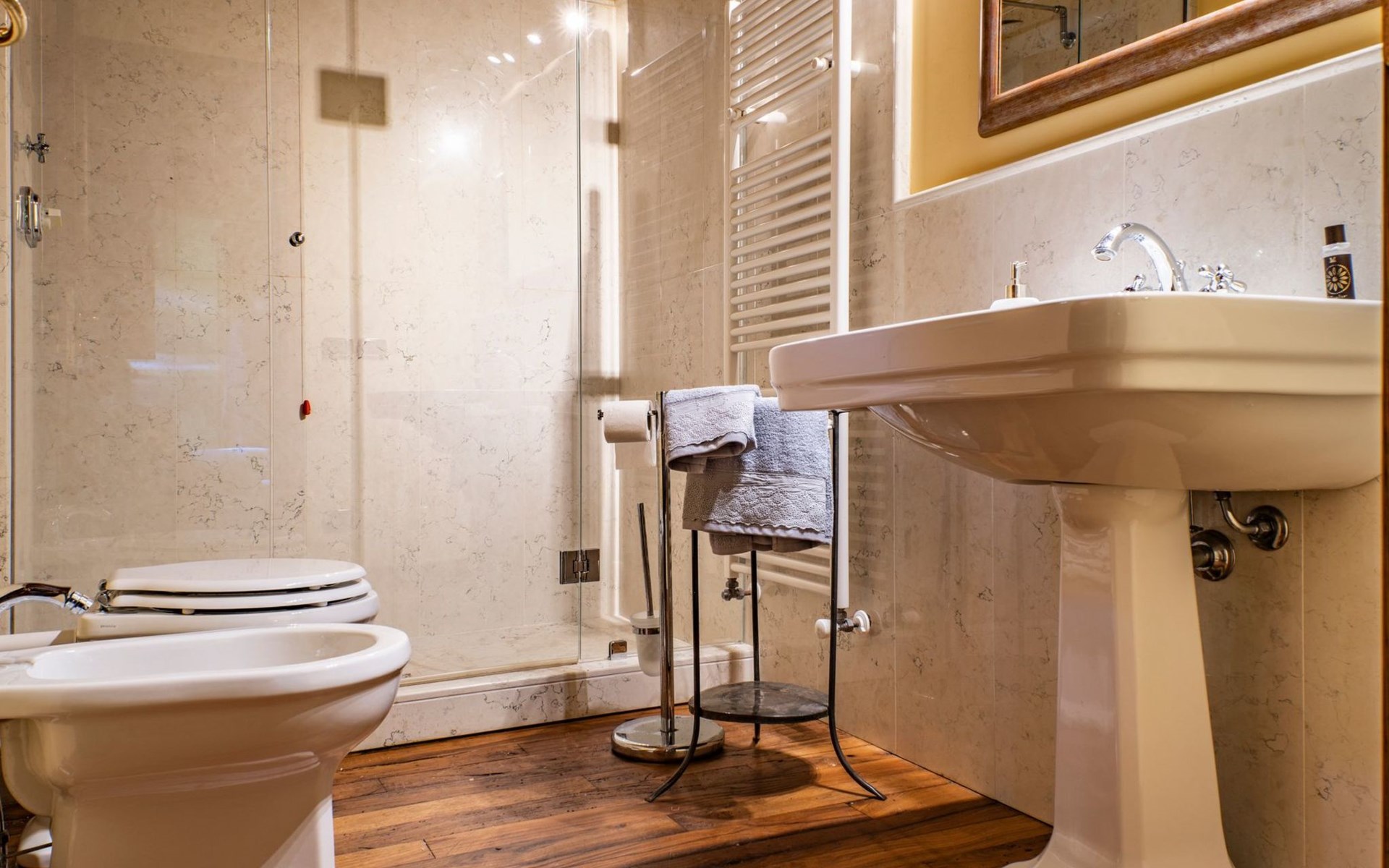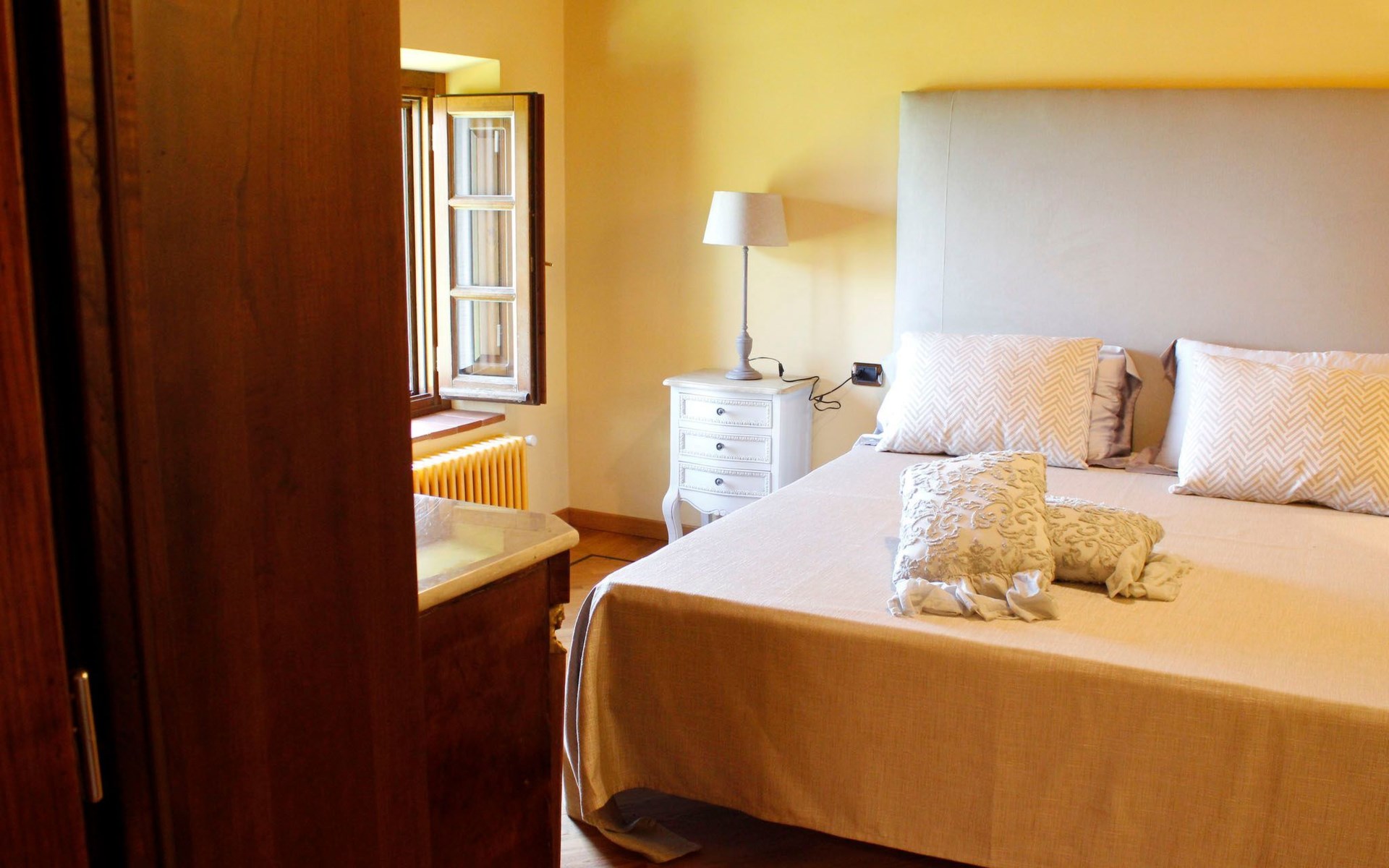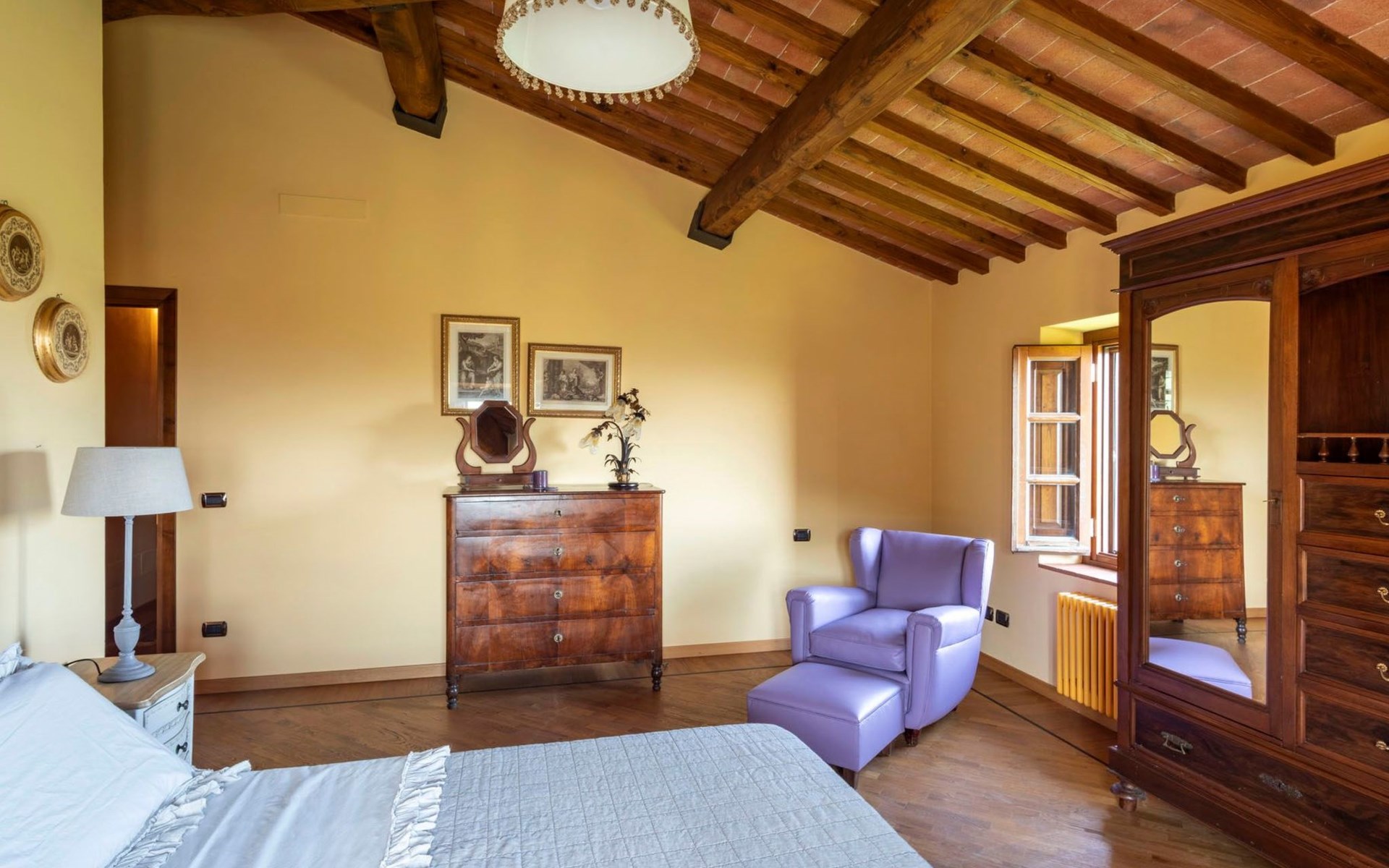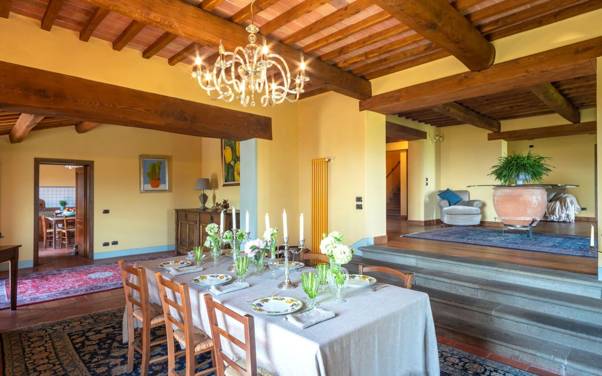 On the ground floor of the main building there’s a large open space with several rooms including a large living room with beamed ceiling, the dining area, an original stone fireplace, a room with a sofa bed for two people and a kitchen fully equipped. All rooms overlook the garden where a magnificent gazebo will welcome you to dine outdoors. On the ground floor there’s the first bathroom and the laundry room. Casa Loretta uses exclusive linen with the refined atmospheres of @opificodeisogni. On the first floor there are 4 bedrooms and 3 bathrooms: 1 bedroom with double bed and private bathroom with whirlpool tub, double sink and shower; 2 double bedrooms and 2 private bathrooms and 1 bedroom with two single beds that can be transformed into a sitting room. CASA LORETTA has windows with mosquitos nets and has a very reliable wifi connection.
