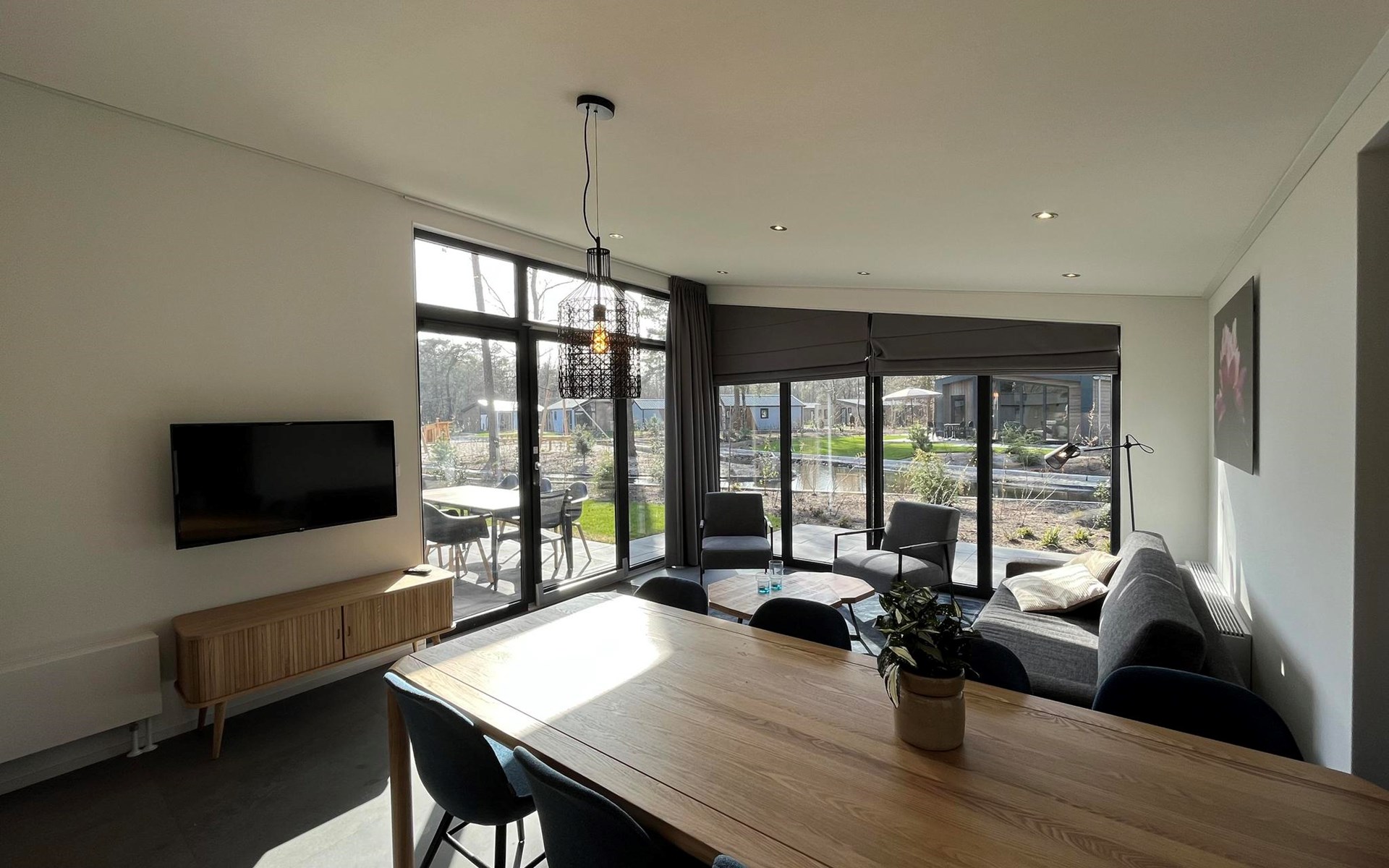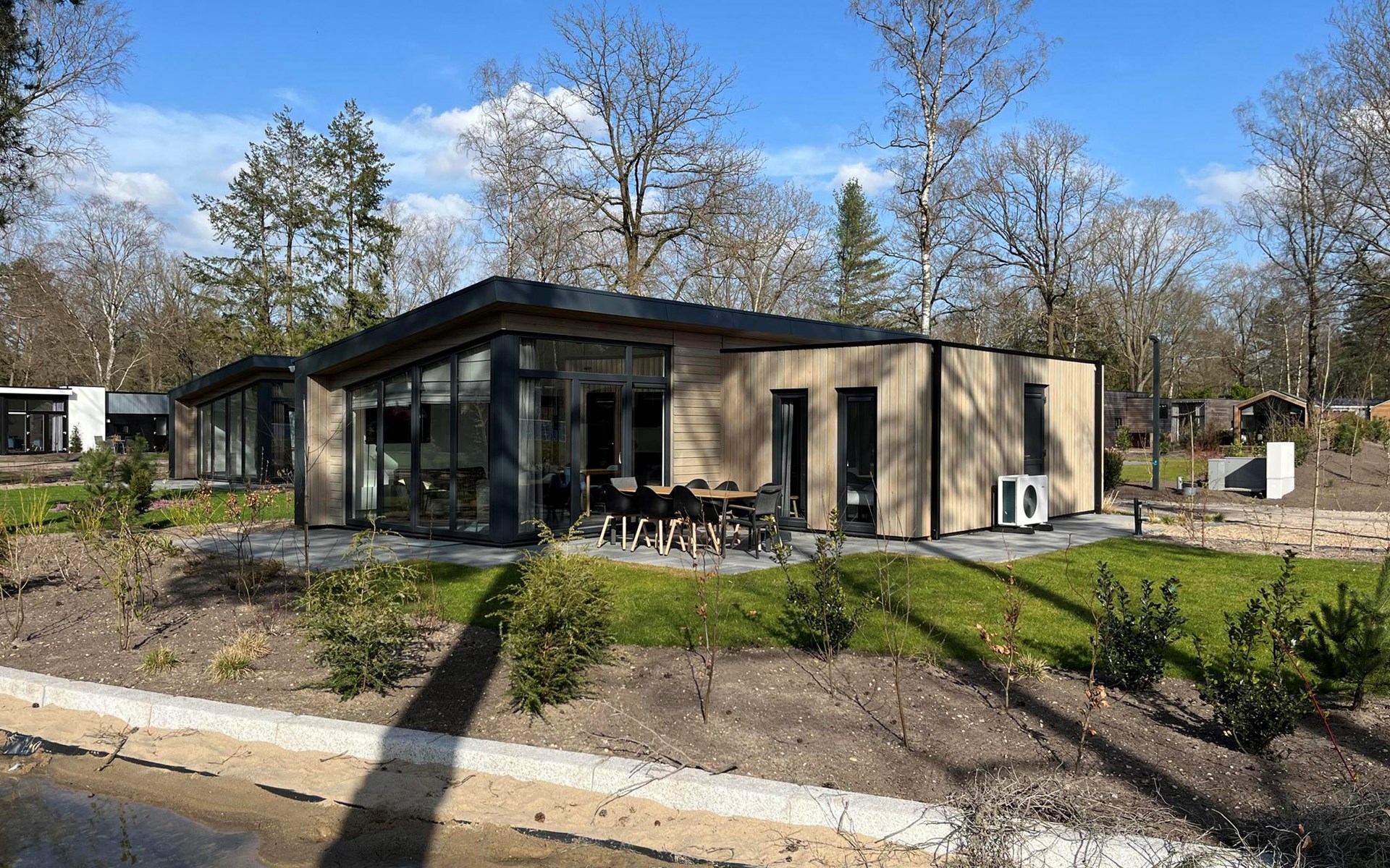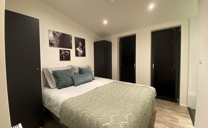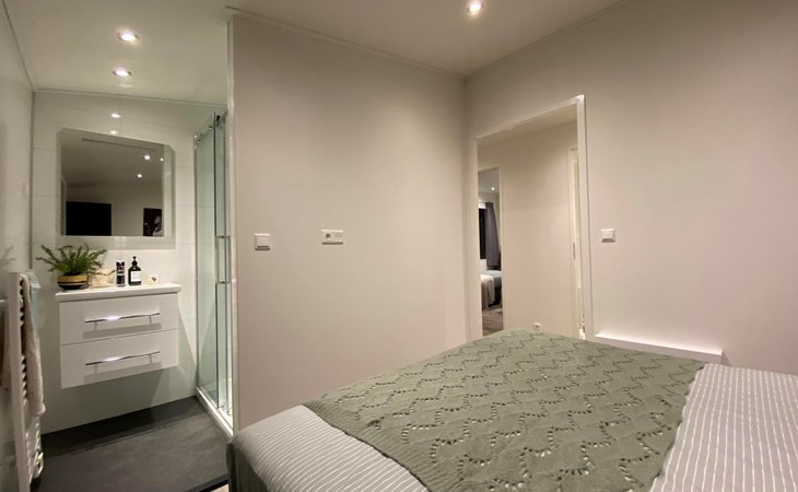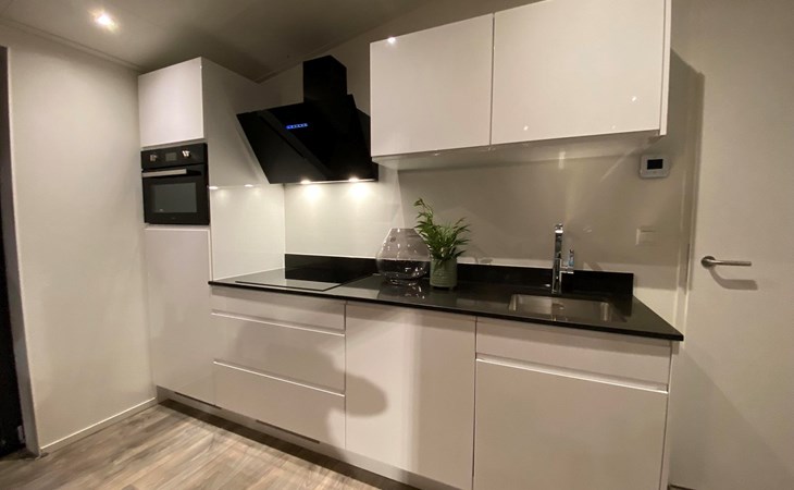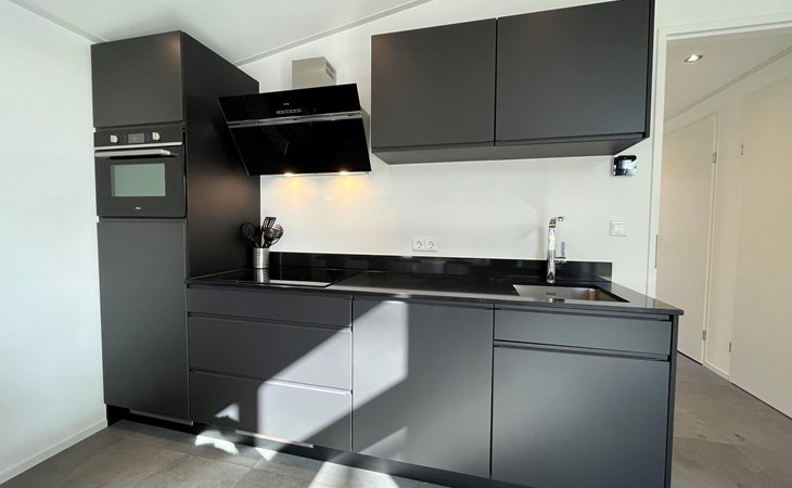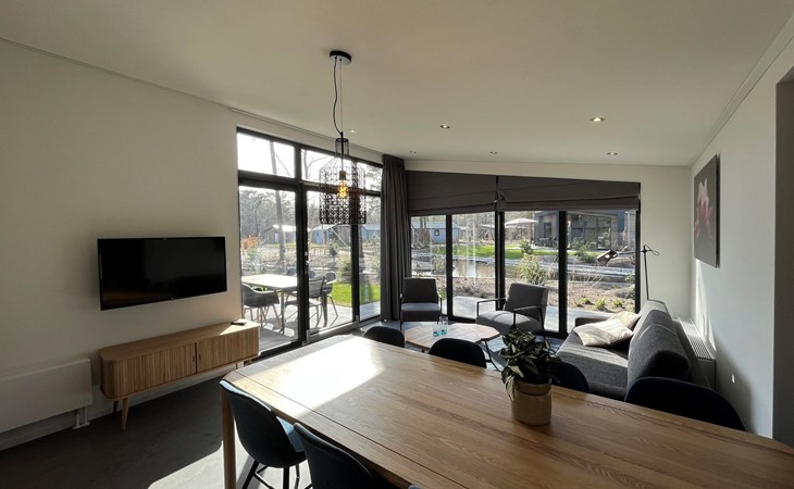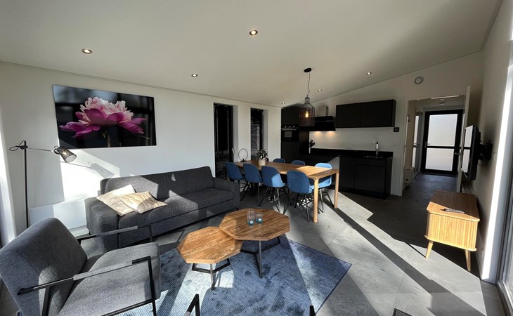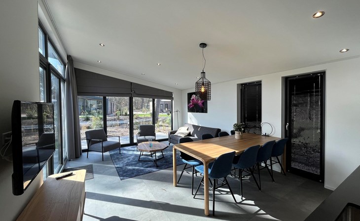 The L-Cube Plus 6 has a modern and robust appearance with a warm interior. The detached, single-storey chalet is built in an L-shape and can accommodate 6 people. Thanks to the high ceiling and large windows, there is a lot of light. In the spacious living area you will find a sitting area, television and an atmospheric fireplace. The open-plan kitchen is equipped with a dishwasher, electric kettle, combination microwave and a Nespresso Professional Machine (capsules only available at the reception/mini market). In total there are 3 bedrooms, 2 of which have 2 single beds and 1 bedroom has a bunk bed. There are 2 luxury bathrooms with a walk-in shower and washbasin. There is also a separate toilet. From the living room you can reach the terrace with garden furniture through the sliding doors. You can park 1 car at the house and there is free Wi-Fi available.
