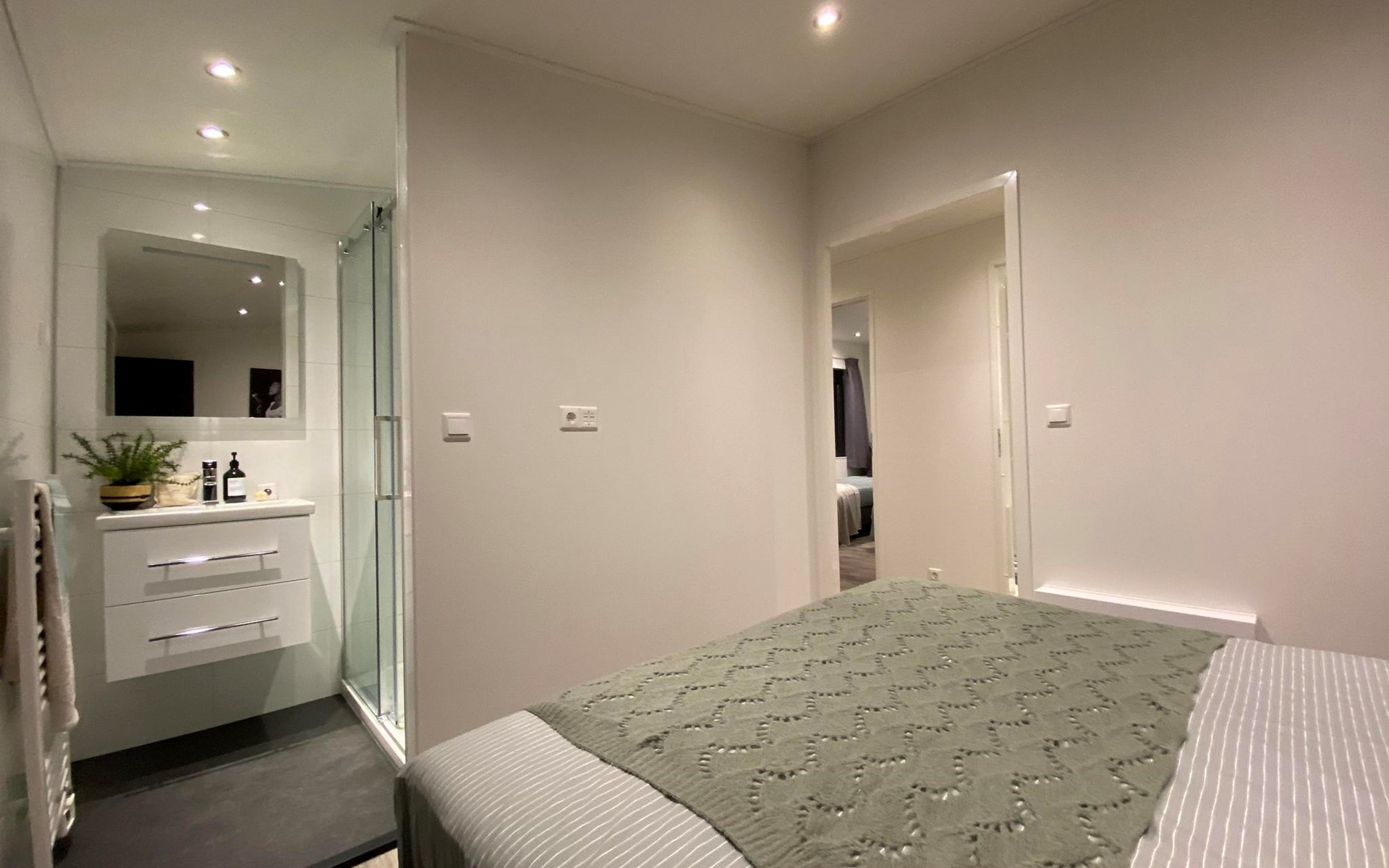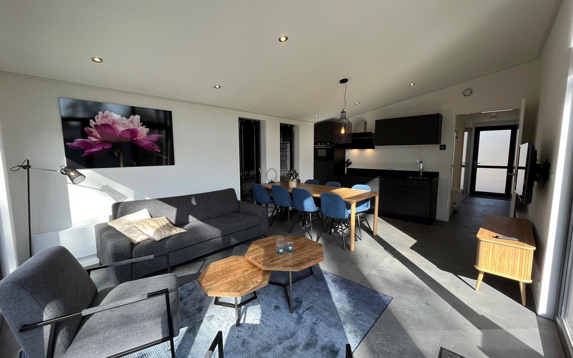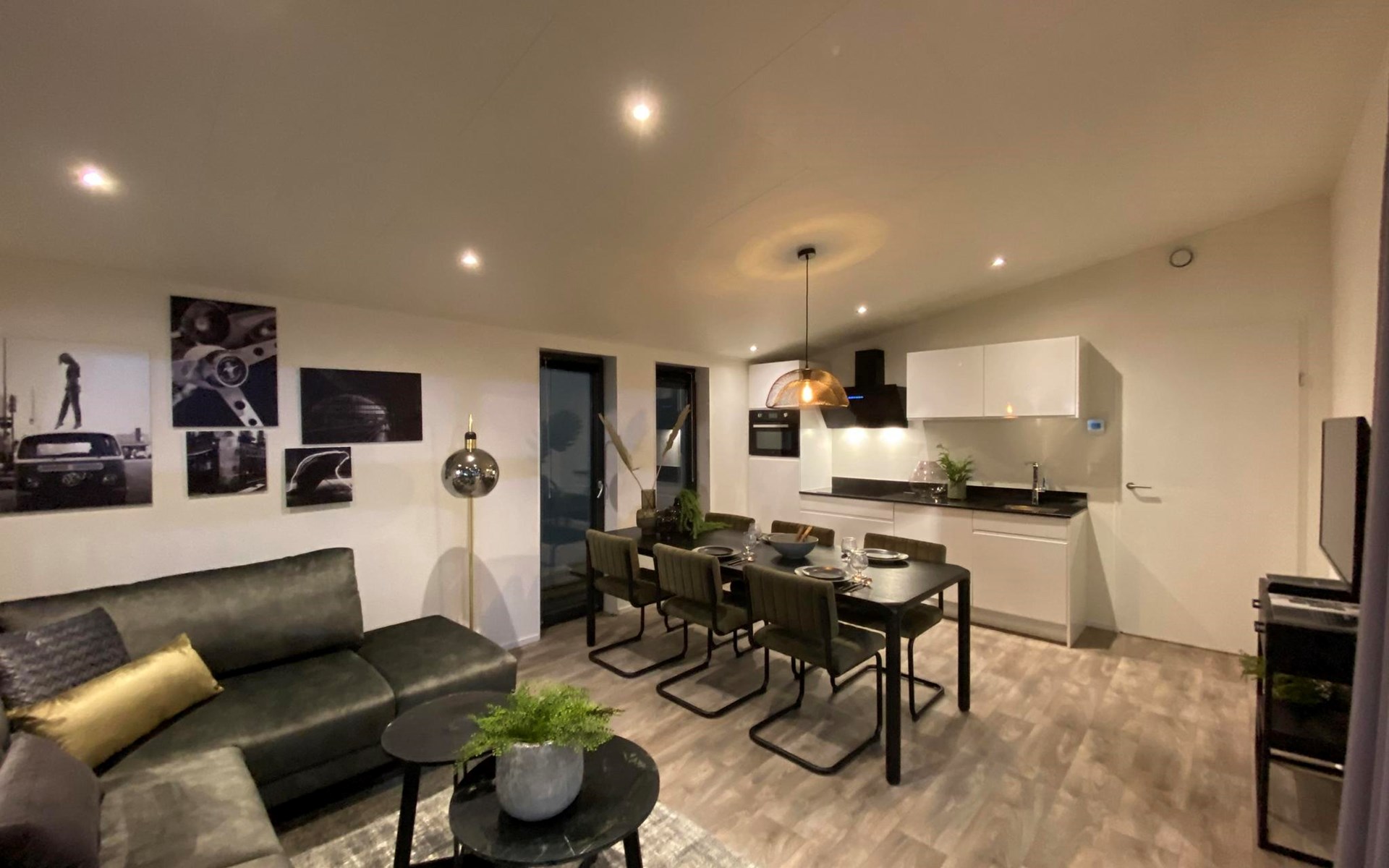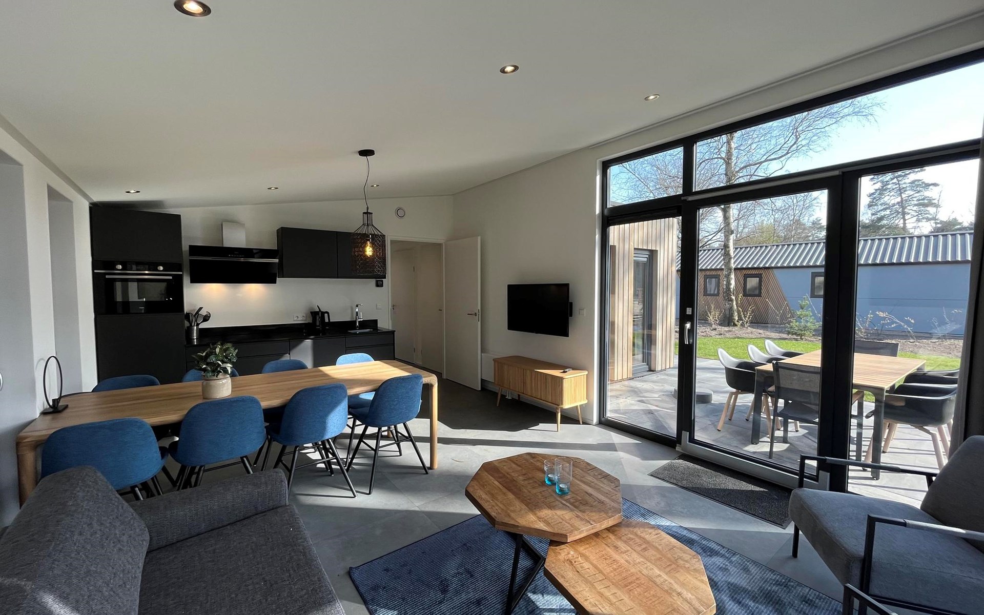 The L-Cube Plus 6 has a modern and robust appearance with a warm interior. The detached, single-storey chalet is built in an L-shape and can accommodate 6 people. Thanks to the high ceiling and large windows, there is a lot of light. In the spacious living area you will find a sitting area, television and an atmospheric fireplace. The open-plan kitchen is equipped with a dishwasher, electric kettle, combination microwave and a Nespresso Professional Machine (capsules only available at the reception/mini market). In total there are 3 bedrooms, 2 of which have 2 single beds and 1 bedroom has a bunk bed. There are 2 luxury bathrooms with a walk-in shower and washbasin. There is also a separate toilet. From the living room you can reach the terrace with garden furniture through the sliding doors. You can park 1 car at the house and there is free Wi-Fi available.