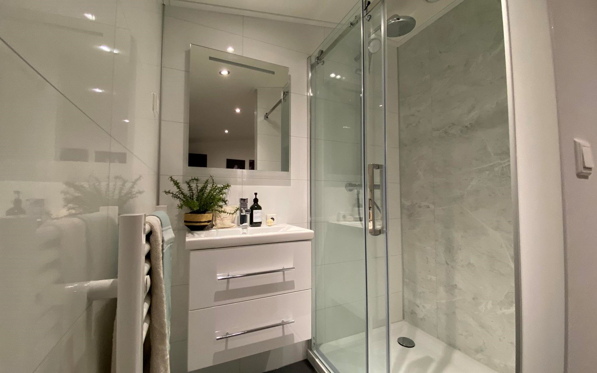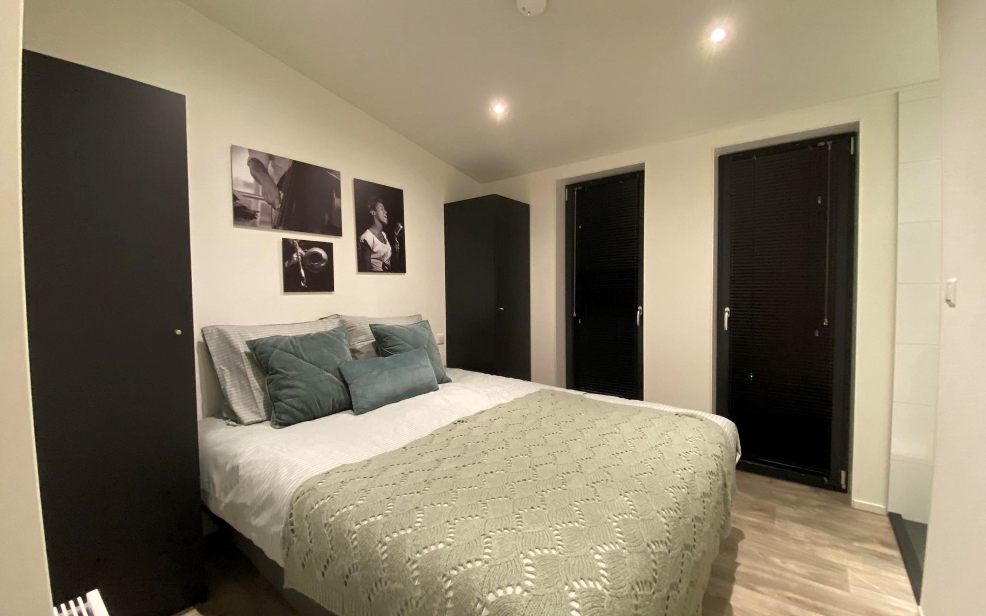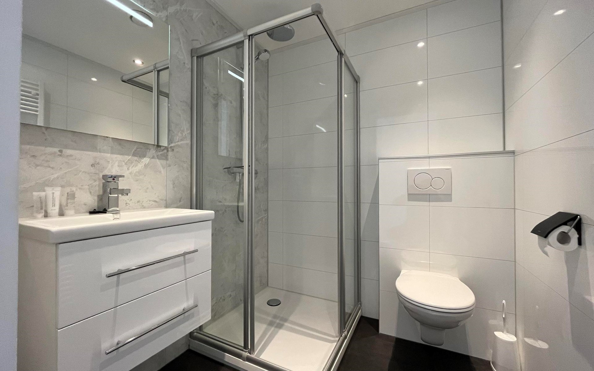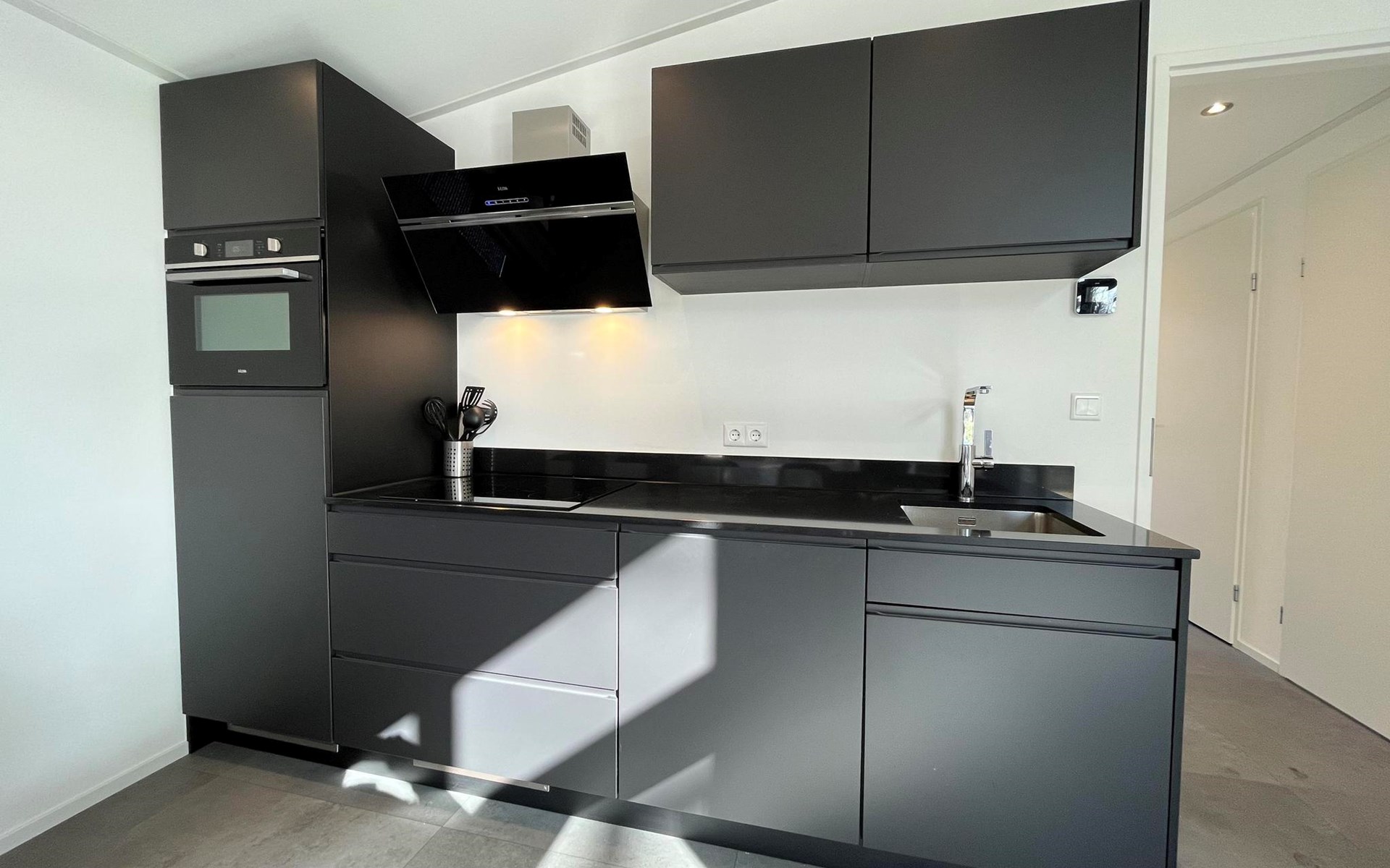 The L-Cube Plus 6 has a modern and robust appearance with a warm interior. The detached, single-storey chalet is built in an L-shape and can accommodate 6 people. Thanks to the high ceiling and large windows, there is a lot of light. In the spacious living area you will find a sitting area, television and an atmospheric fireplace. The open-plan kitchen is equipped with a dishwasher, electric kettle, combination microwave and a Nespresso Professional Machine (capsules only available at the reception/mini market). In total there are 3 bedrooms, 2 of which have 2 single beds and 1 bedroom has a bunk bed. There are 2 luxury bathrooms with a walk-in shower and washbasin. There is also a separate toilet. From the living room you can reach the terrace with garden furniture through the sliding doors. You can park 1 car at the house and there is free Wi-Fi available.