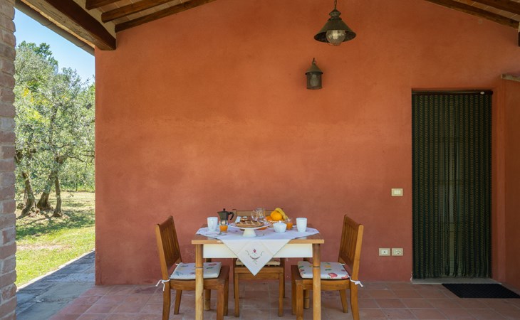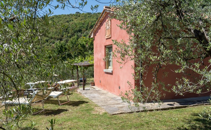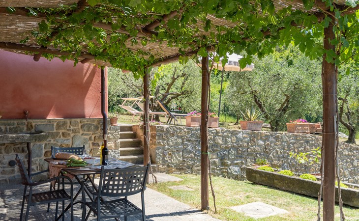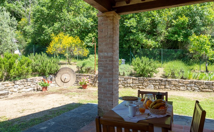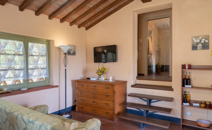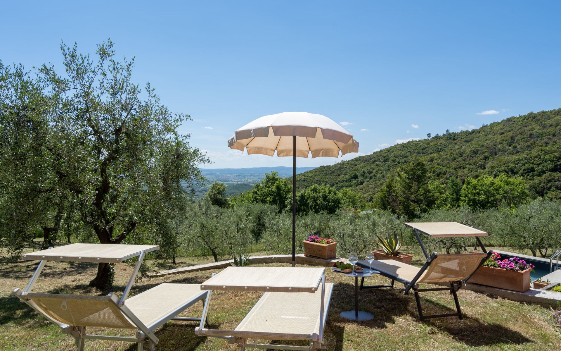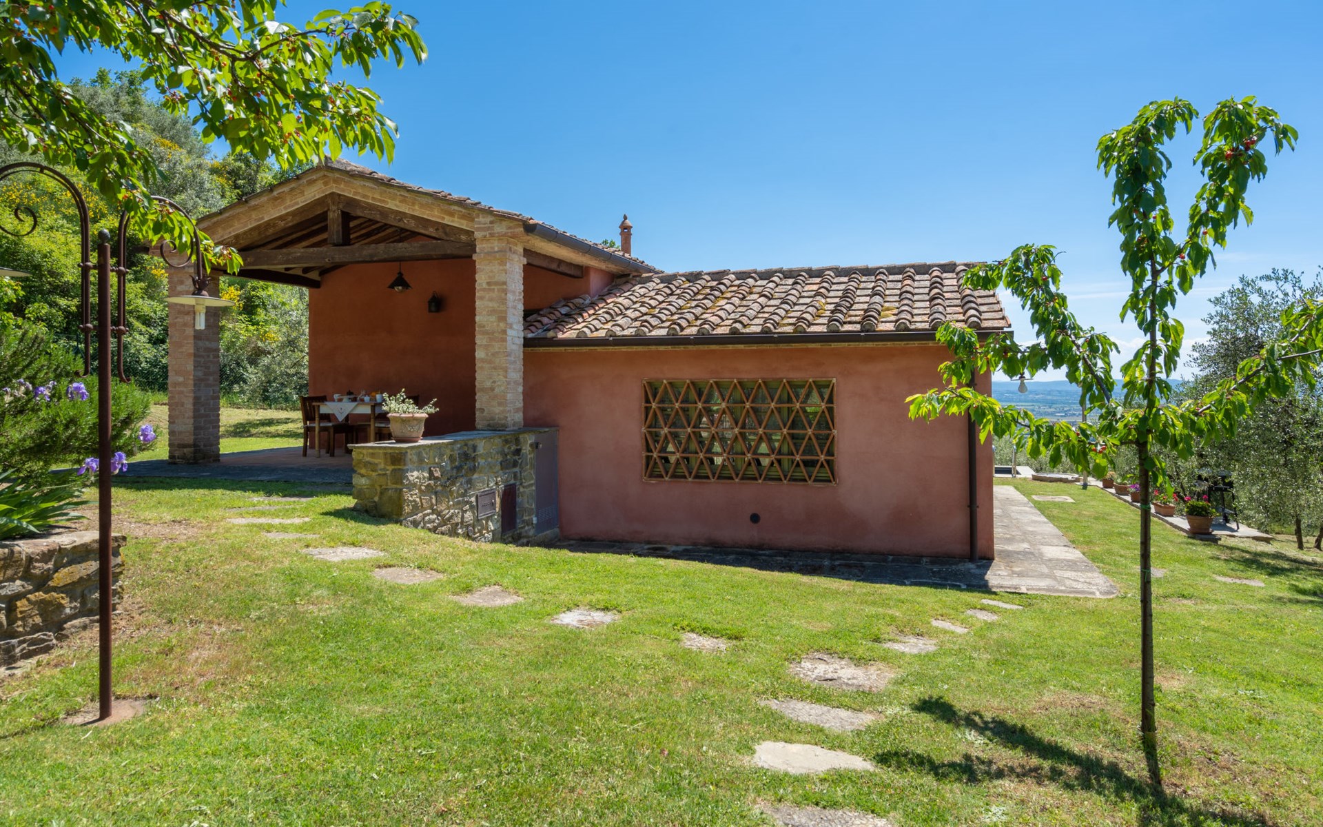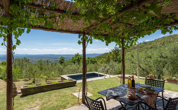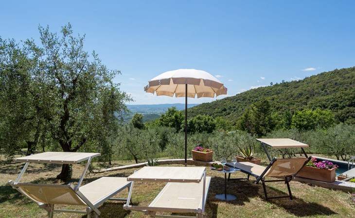 "rustico" cottage "Nido del Sorbino", 460 m a.s.l.. 4 km from the centre of Castiglion Fiorentino, 15 km from the centre of Arezzo, in an elevated position on a slope, 35 km from the lake. Private: property 2'000 m2 (fenced), terraced garden, natural garden, swimming pool (3 x 2 m, depth 140 cm, seasonal availability: 01.May. - 30.Sep.). In the house: WiFi. Narrow motor access (200 m via unmade road). Parking on the premises. Shop 1.5 km, supermarket 2 km, bus stop 1 km, railway station "Castiglion Fiorention" 4 km, sandy beach "Castiglione della Pescaia" 160 km, bathing lake "Trasimeno" 35 km. Golf course (18 hole) 15 km. Nearby attractions: Cortona 15 km, Firenze 100 km, Valdichiana Outlet Village 25 km. Please note: car recommended.