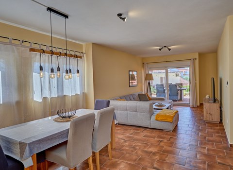 It has a bathroom with bath, large living room and entrance in the ground floor. At the app is a large terrace with grill. Extra bed is in living room on couch.