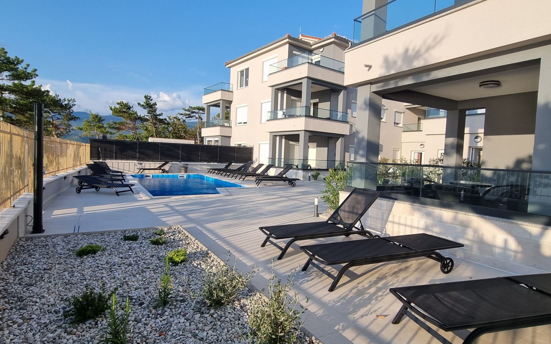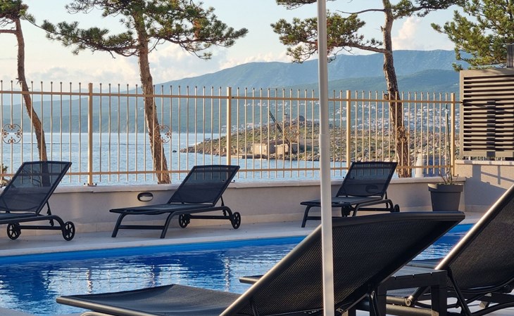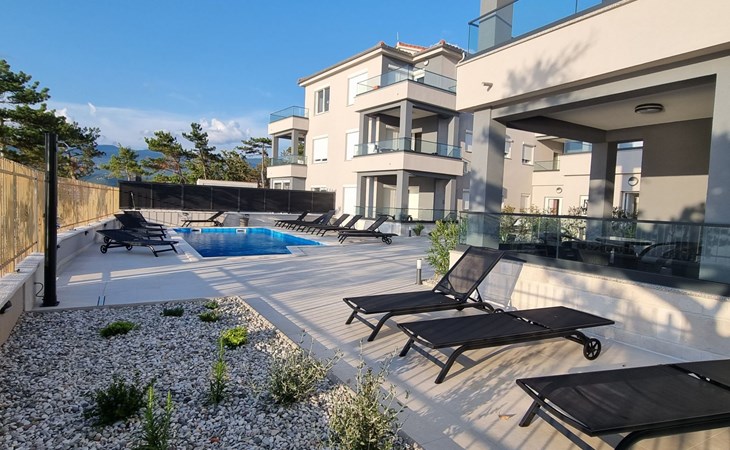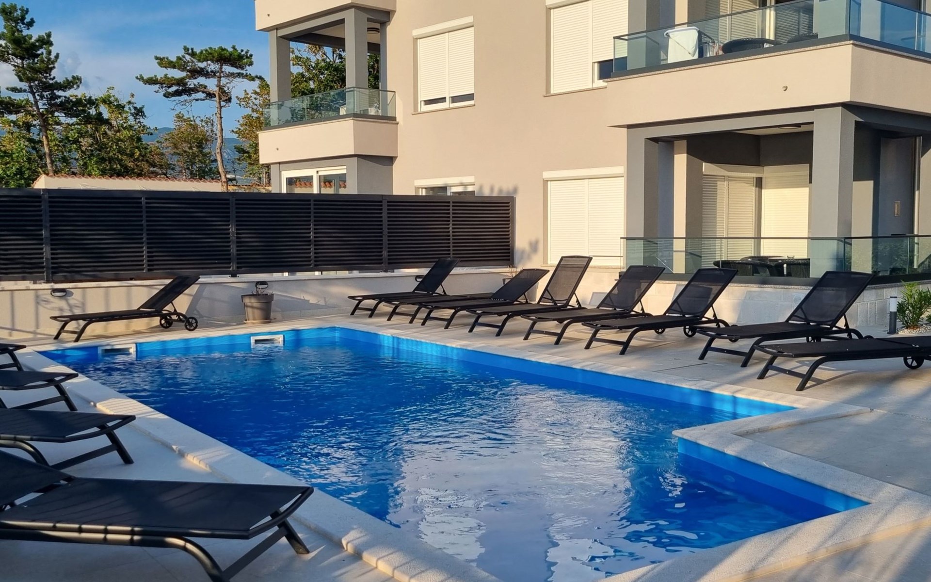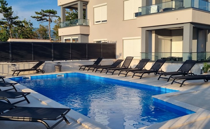 The covered balcony (10 m2) offers a beautiful view of the pool and the sea. The pool area on the ground floor is equipped with sun loungers, parasols and an outdoor shower and offers direct access to the sea for comfortable swimming. A communal laundry room on the ground floor includes a washing machine, washing capsules/detergent and an iron for guest use.