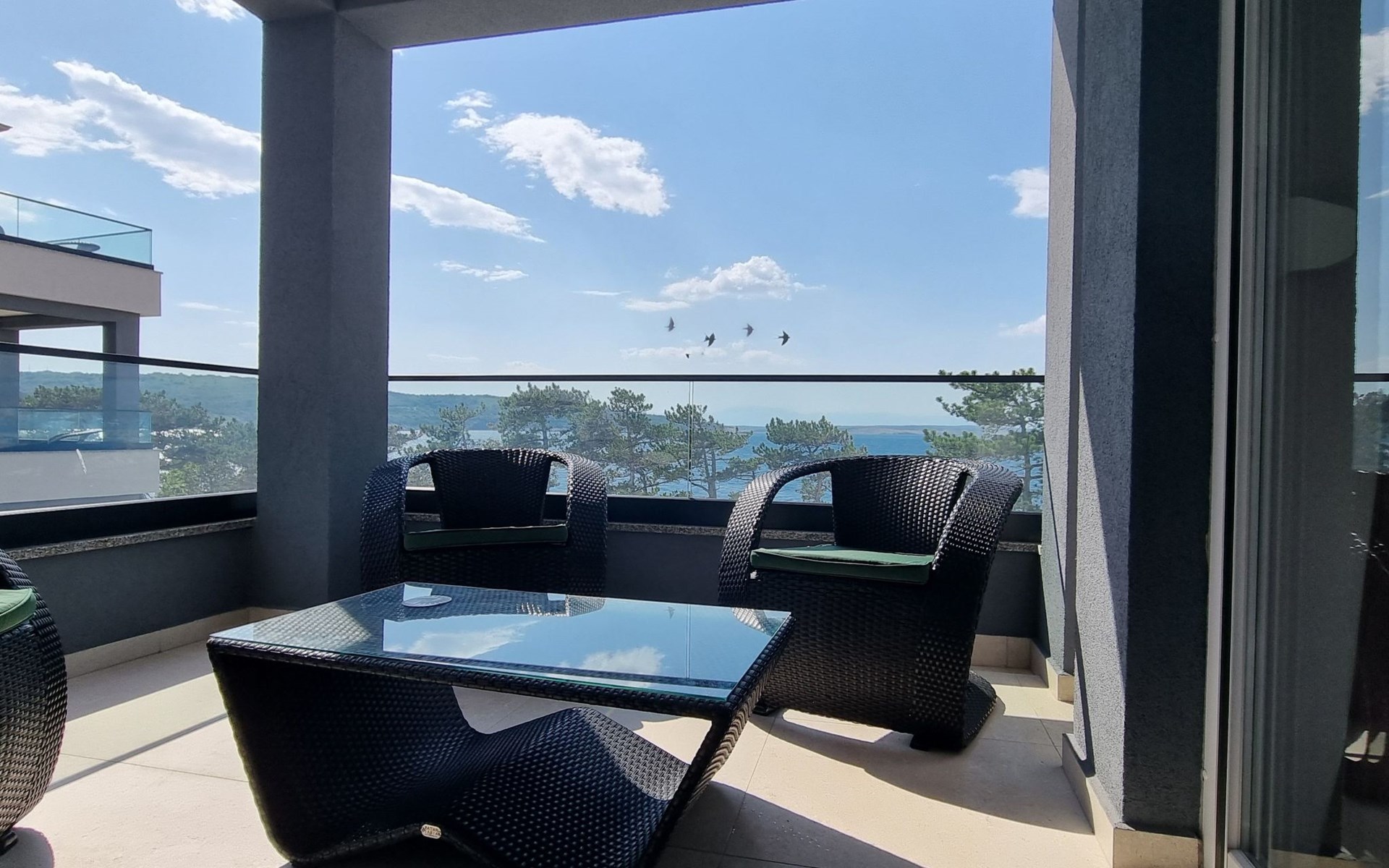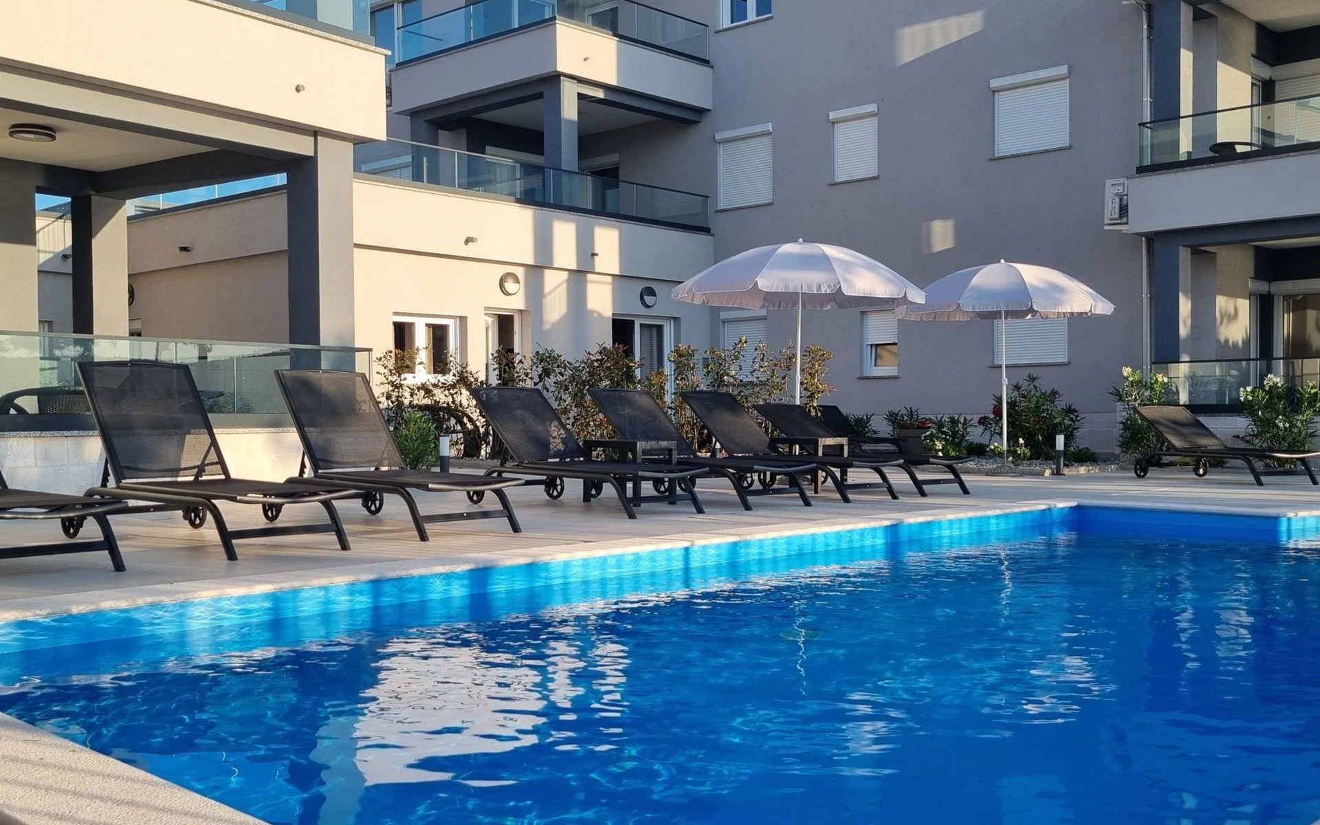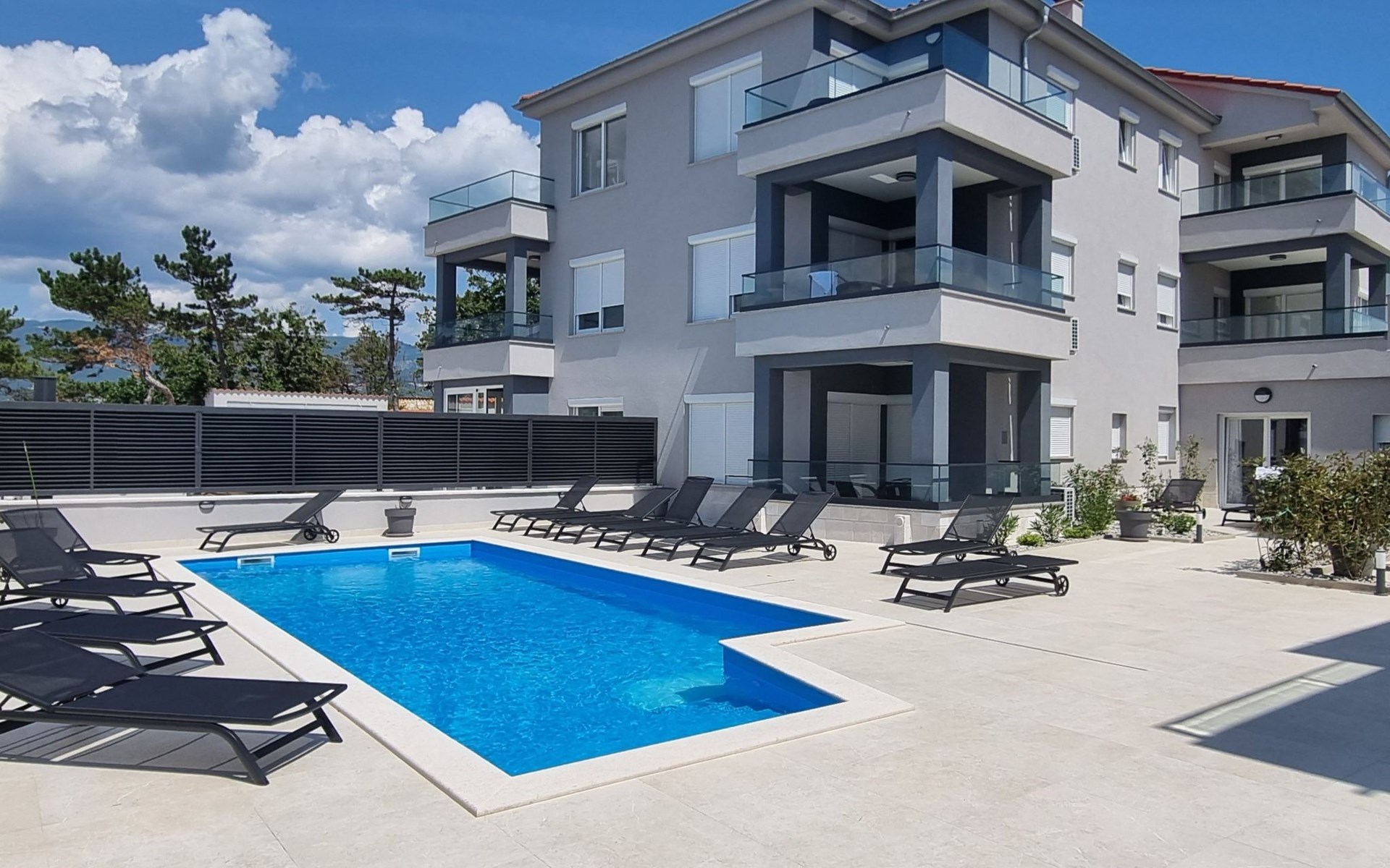 The covered balcony (10 m2) offers a beautiful view of the pool and the sea. The pool area on the ground floor is equipped with sun loungers, parasols and an outdoor shower and offers direct access to the sea for comfortable swimming. A communal laundry room on the ground floor includes a washing machine, washing capsules/detergent and an iron for guest use.