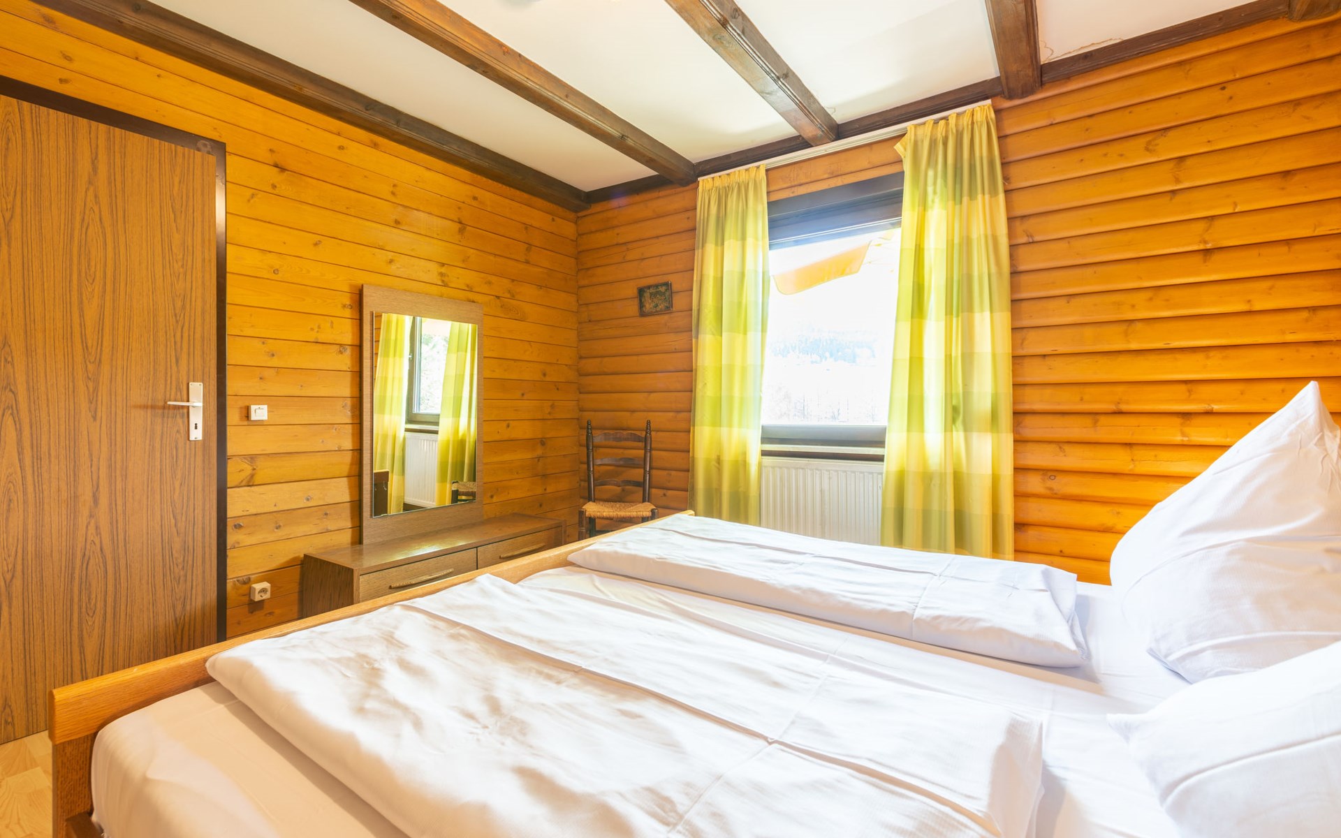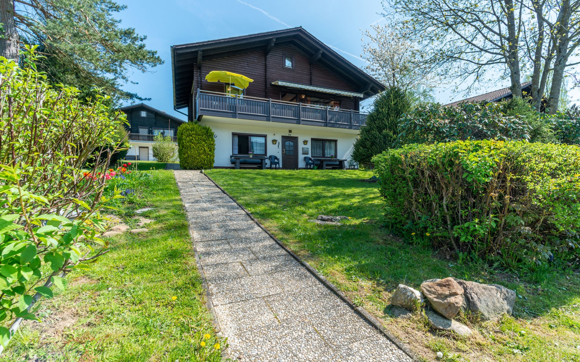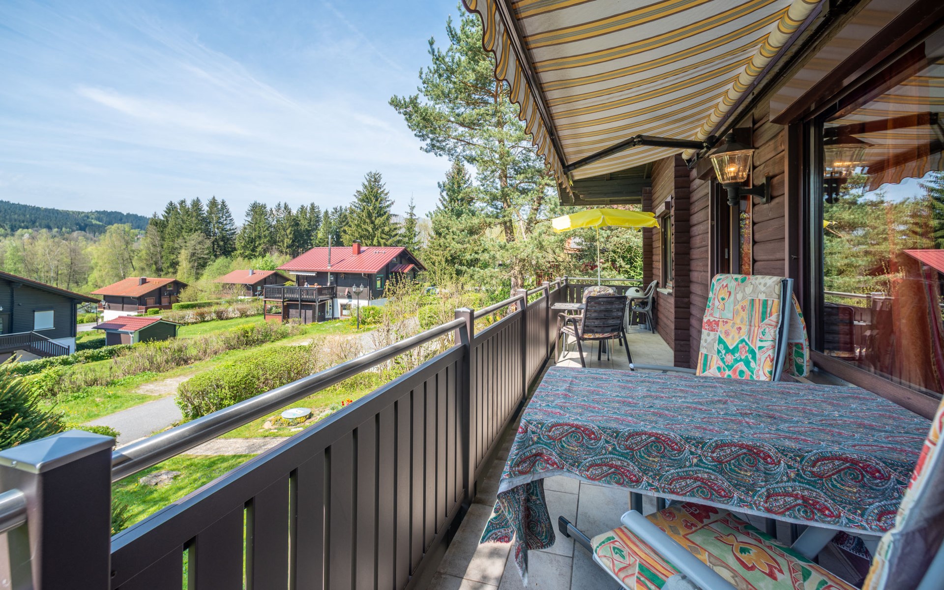 Child friendly holiday village "Am Hohen Bogen". In the district of Kummersdorf, outside the resort, 3 km from the centre of Arrach, on a slope, traffic calmed area, 300 m from the edge of the forest, 100 m from the lake, 9 km from the skiing area. For shared use: volleyball, children's playground (slide, swing, sandbox). In the complex: table tennis (extra). Central heating system. Parking at the house. Shop 3 km, grocery 3 km, supermarket 3 km, restaurant 3 km, bakery 3 km, railway station "Hohenwarth" 1.5 km, grass beach "Seepark Arrach" 5 km, outdoor swimming pool 10 km, thermal baths 10 km, bathing lake "Seepark Arrach" 5 km. Golf course (9 hole) 6 km, tennis 6 km, riding stable 800 m, chair lift 9 km, skisport facilities 9 km, slopes 9 km, ski rental 11 km, ski school 9 km, cross country ski track 11 km. Nearby attractions: Bayerwald-Tierpark Lohberg 15 km, Spielbank Bad Kötzting, Fun-Park Neukirchen, Tiergarten Straubing, Pullman-City. Well-known ski regions can easily be reached: Eck 6 km, Am Hohen Bogen 9 km, Arber 29 km. Hiking paths: Arberregion. Please note: car recommended. Groups of teenagers on request only. Boating, fishing 500 m. The holiday village consists of an apartment house and two-storey holiday houses with shared lawns and play areas. The distance from the individual houses to the natural swimming lake is 50 – 400 m.