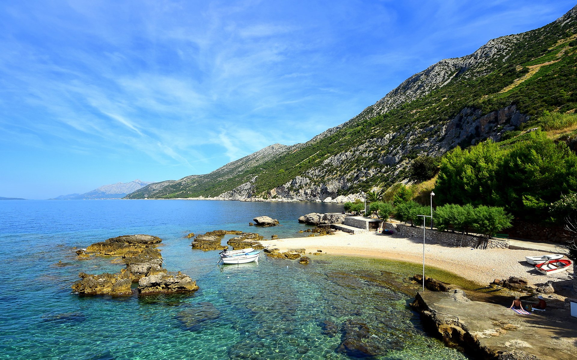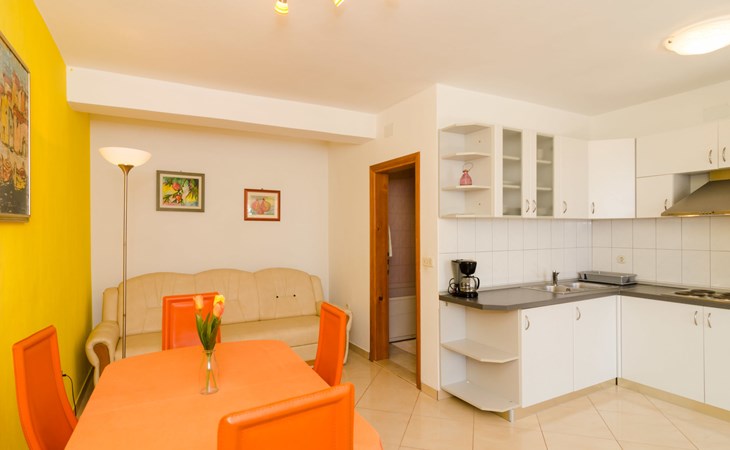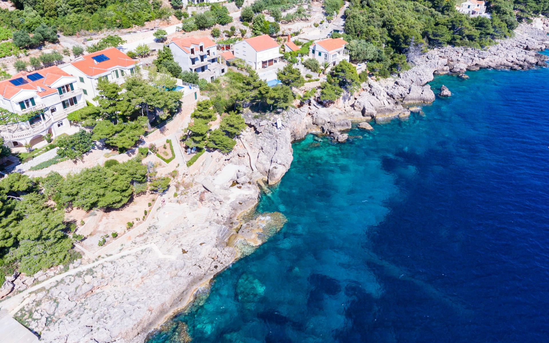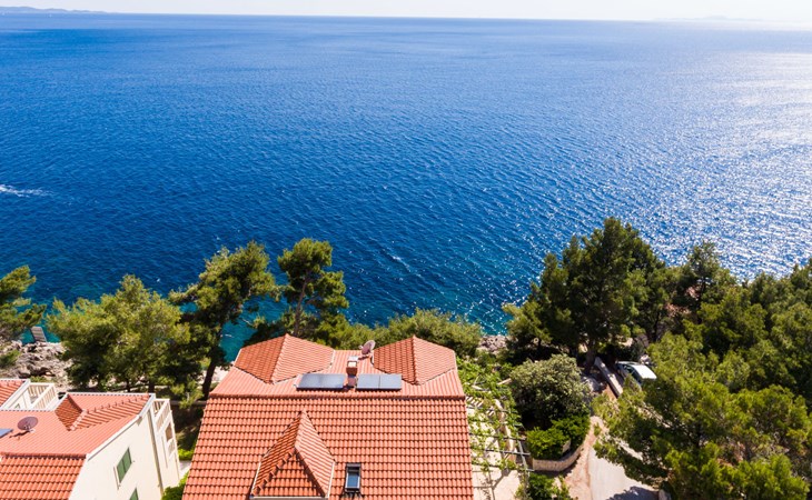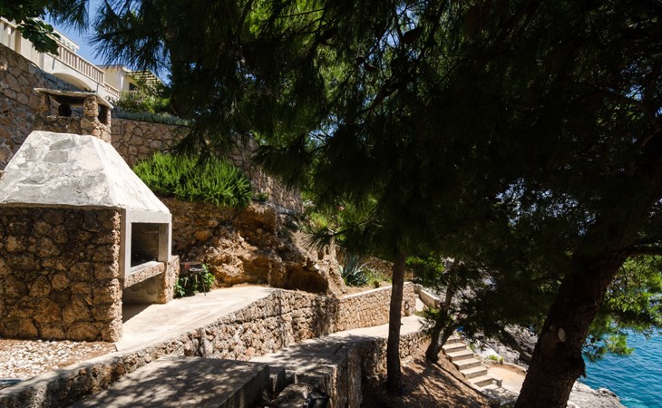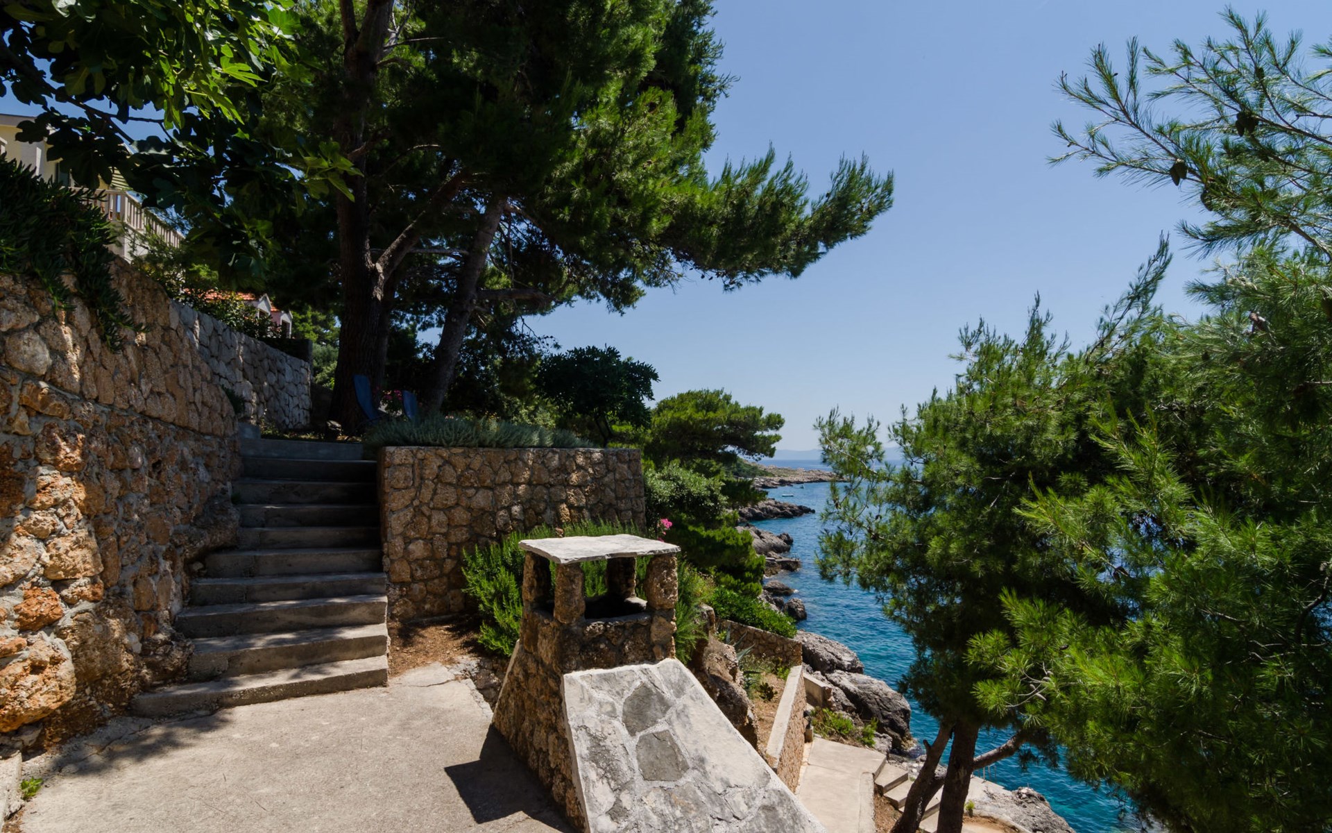 Dingač - Borak 5 km from Trstenik: Beautiful apartment house "Plavac Mali". Outside the resort, 4 km from the centre of Potomje, in a quiet, sunny position on a slope, 30 m from the sea, 30 m from the beach, in a cul-de-sac, in the countryside, south facing position. For shared use: outdoor shower, barbecue. In the house: internet access. Parking at the house on the premises. Shop 4 km, restaurant 30 m, bus stop 4.2 km, pebble beach 130 m, rocky beach 30 m. The restaurant 30m from the house opened from 20.06. - 01.09. Further restaurant in Trstenik, 5km from the house. In Borak renting of diving equipement and boat diving excursions. In Žuljana diving school, 24 km from Borak.