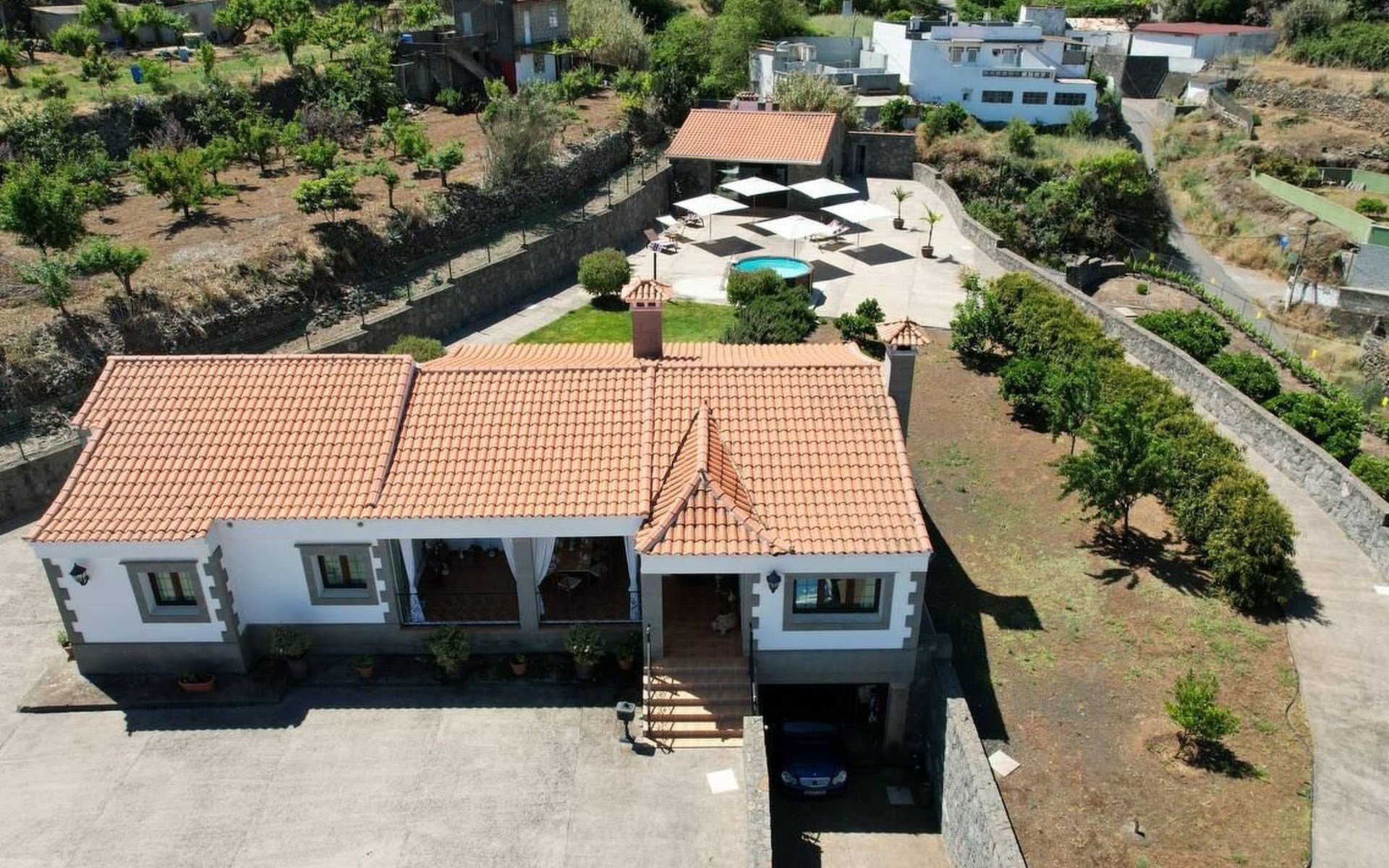 Porch-dining room, with exceptional views of San Mateo. Recreation area, which consists of a swimming pool, with another house completely fitted out for barbecues, with an interior bathroom. Laundry area. The house has air conditioning and heating. It has a large parking area.