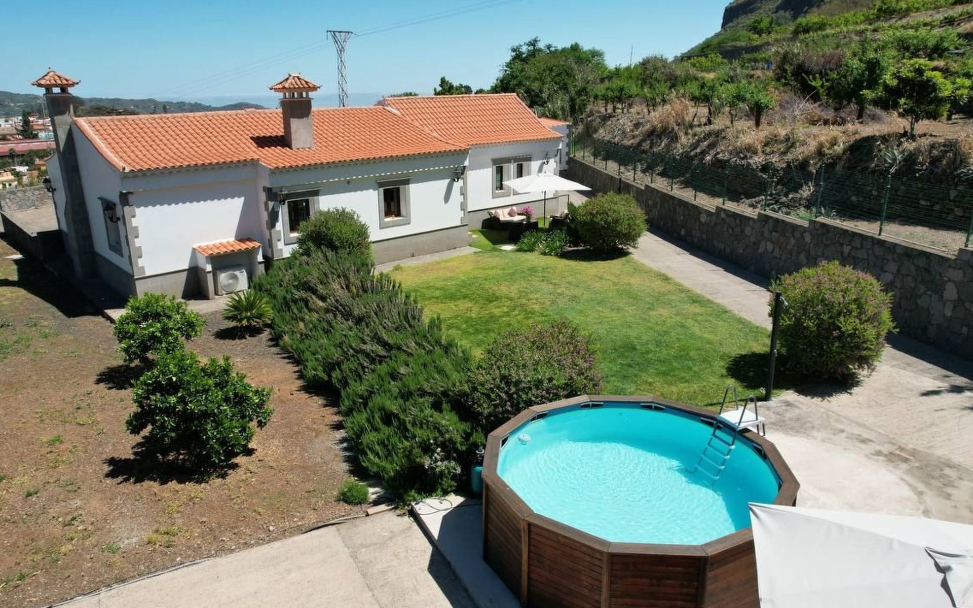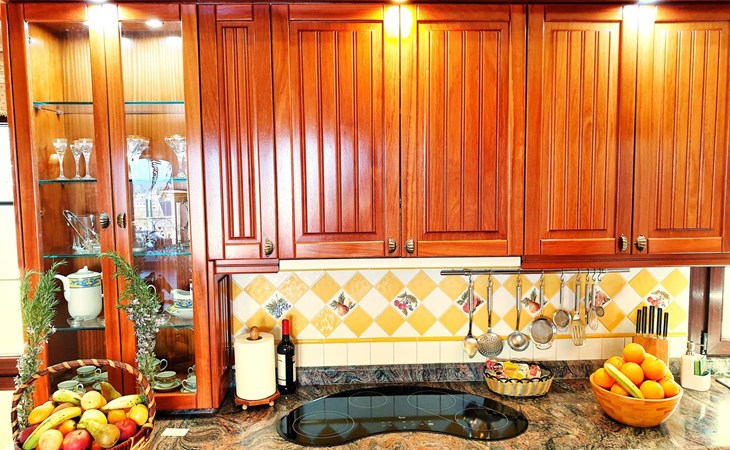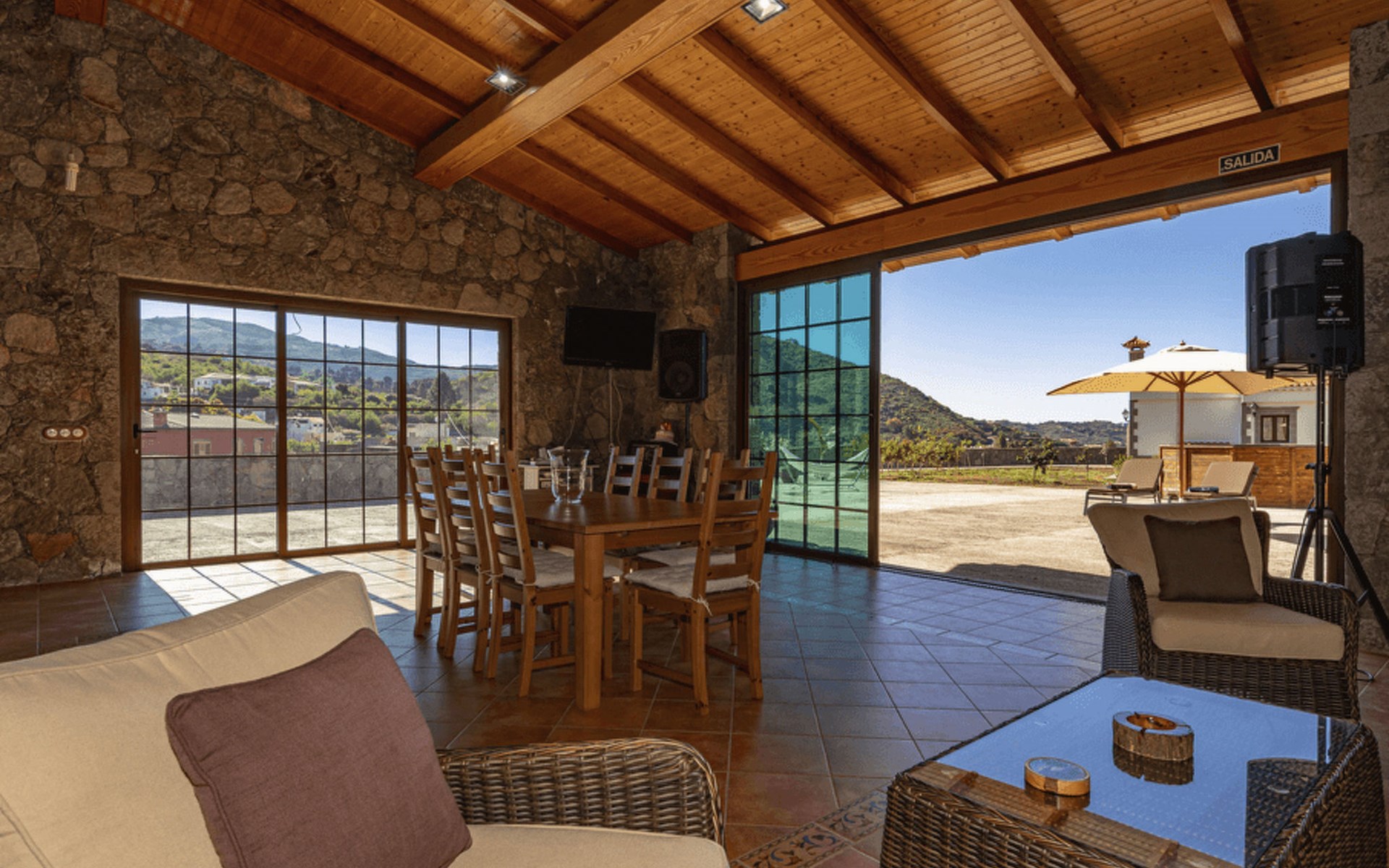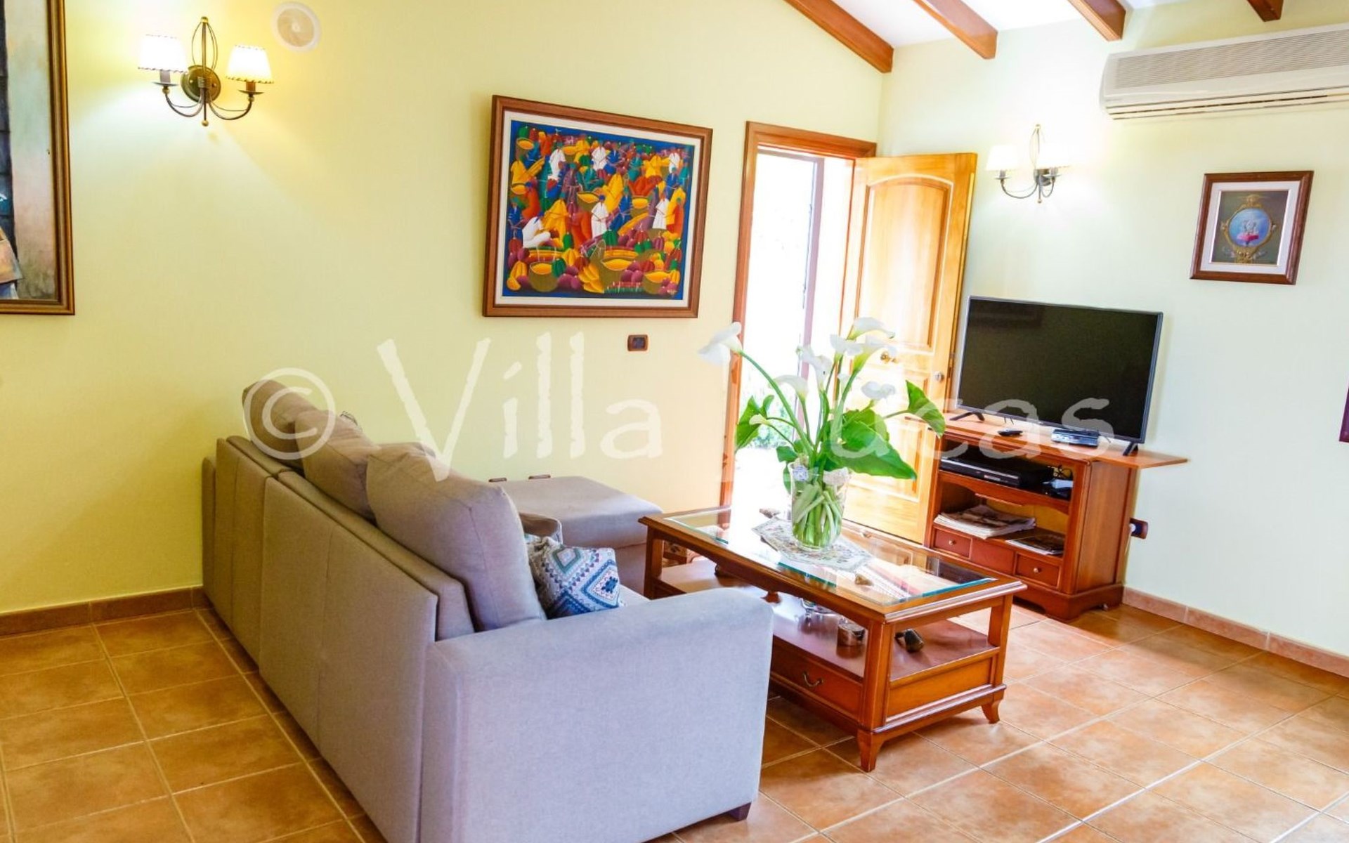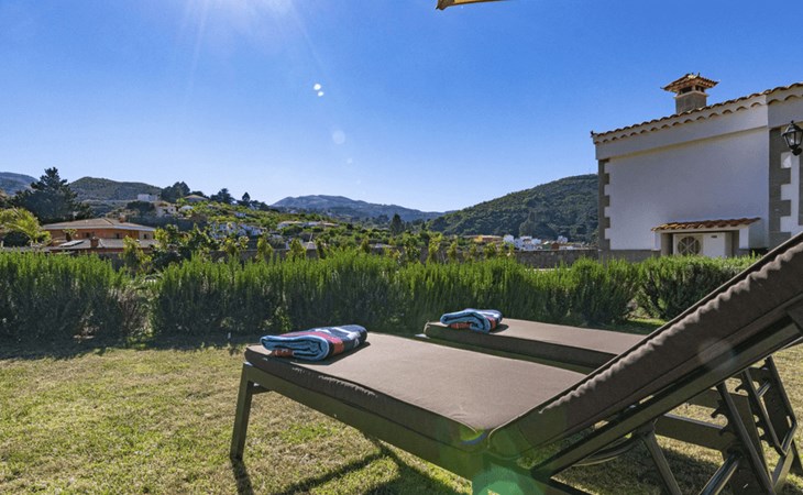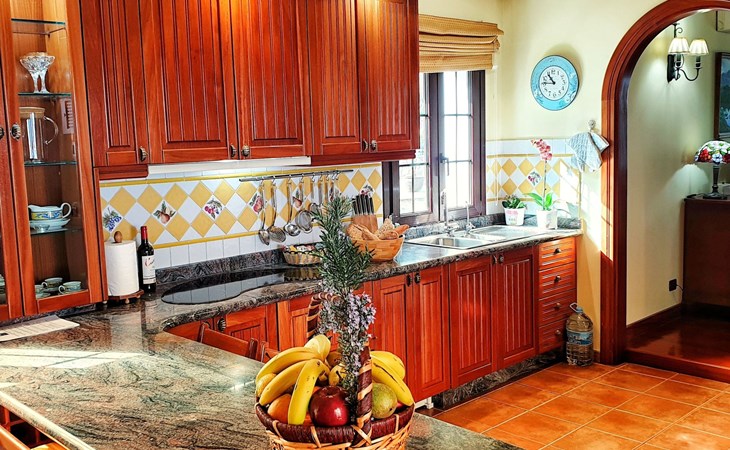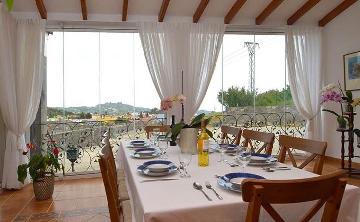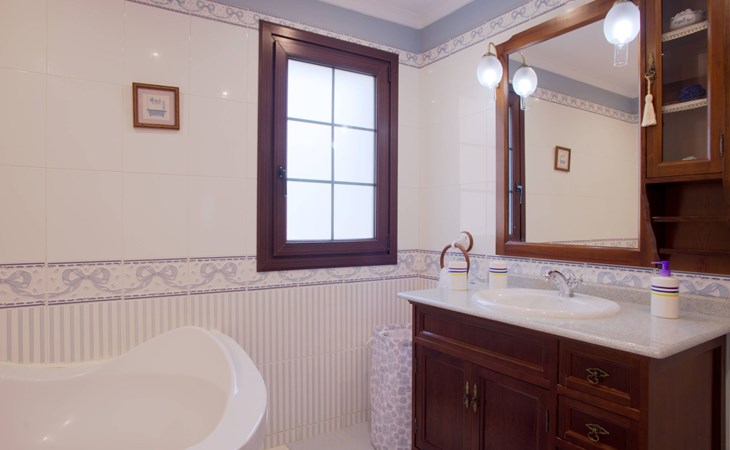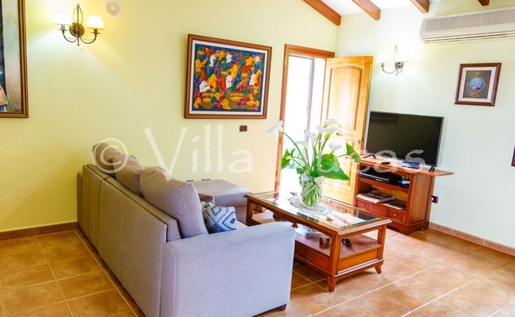 It has a comfortable, open-plan layout: Kitchen-dining room with everything necessary (fridge, freezer, dishwasher, microwave, vitro-ceramic cooker and all the small electrical appliances for daily use). Two bathrooms inside the main house, one of the bathrooms with Jacuzzi bath and the second bathroom with Jacuzzi shower. Three bedrooms with double beds. Small living room with sofa-bed and television. Spacious living-dining room.