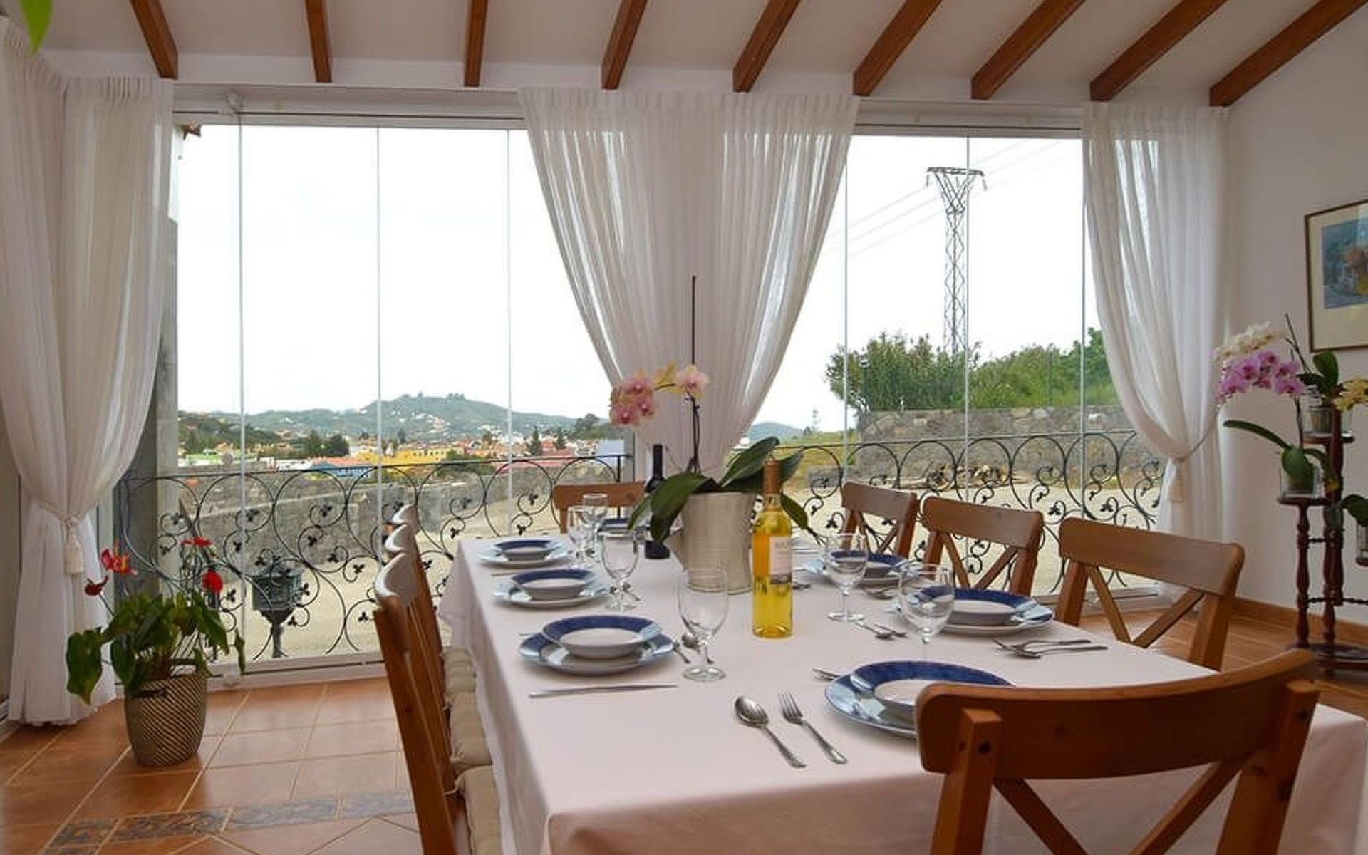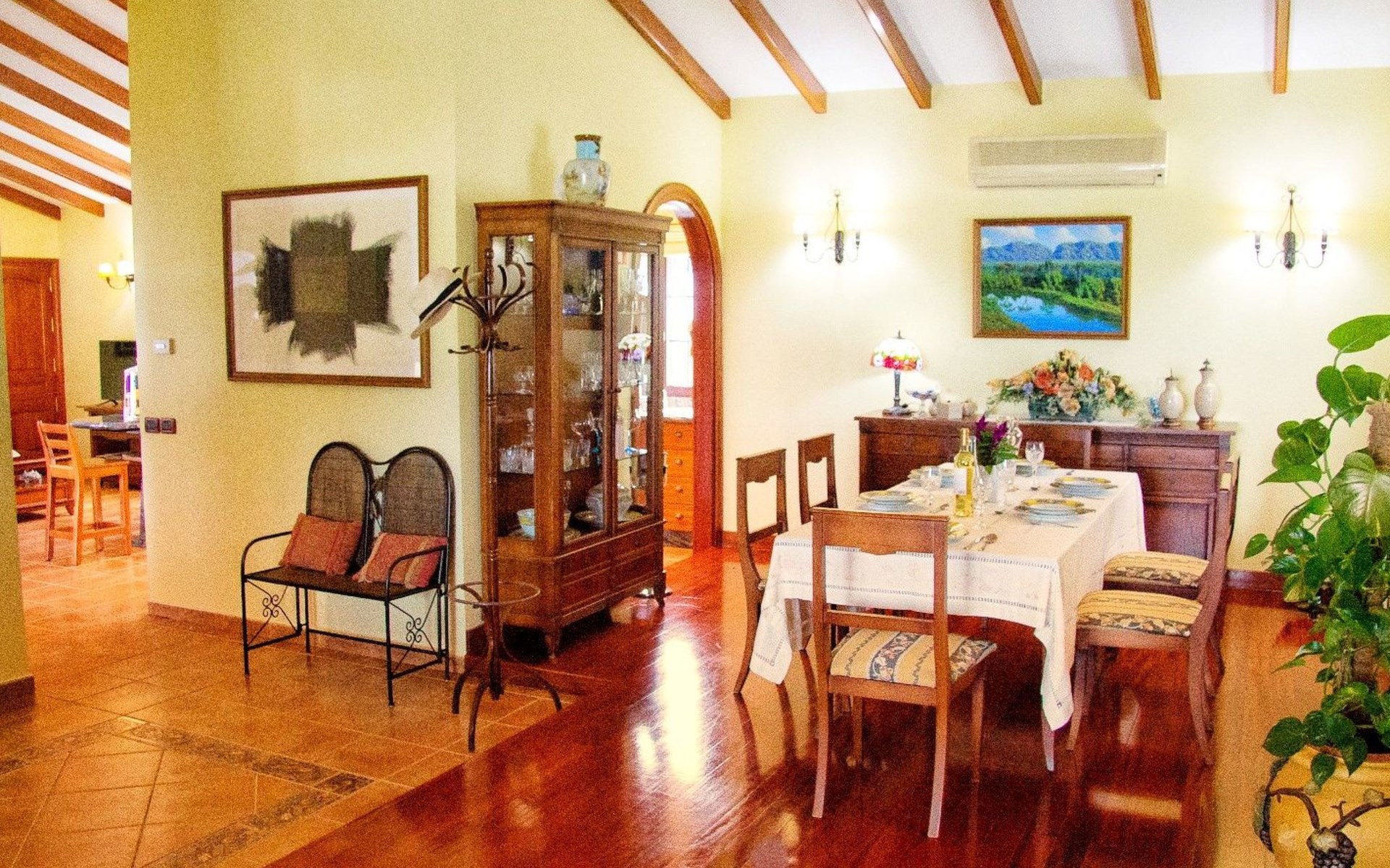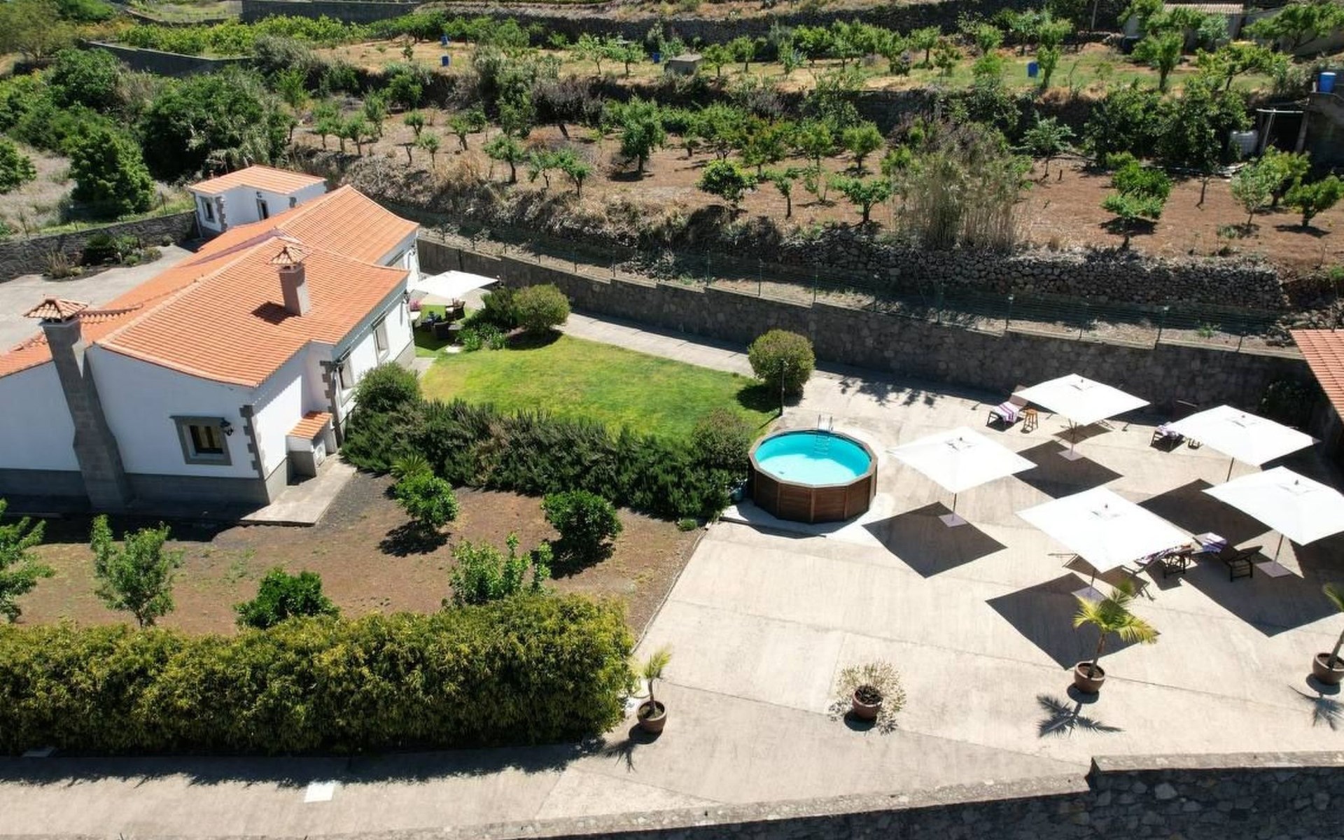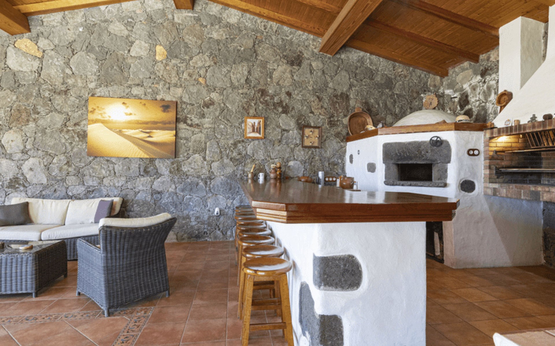 It has a comfortable, open-plan layout: Kitchen-dining room with everything necessary (fridge, freezer, dishwasher, microwave, vitro-ceramic cooker and all the small electrical appliances for daily use). Two bathrooms inside the main house, one of the bathrooms with Jacuzzi bath and the second bathroom with Jacuzzi shower. Three bedrooms with double beds. Small living room with sofa-bed and television. Spacious living-dining room.