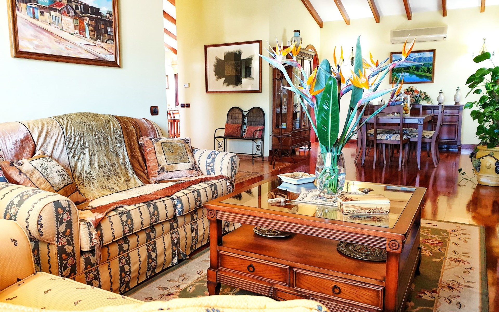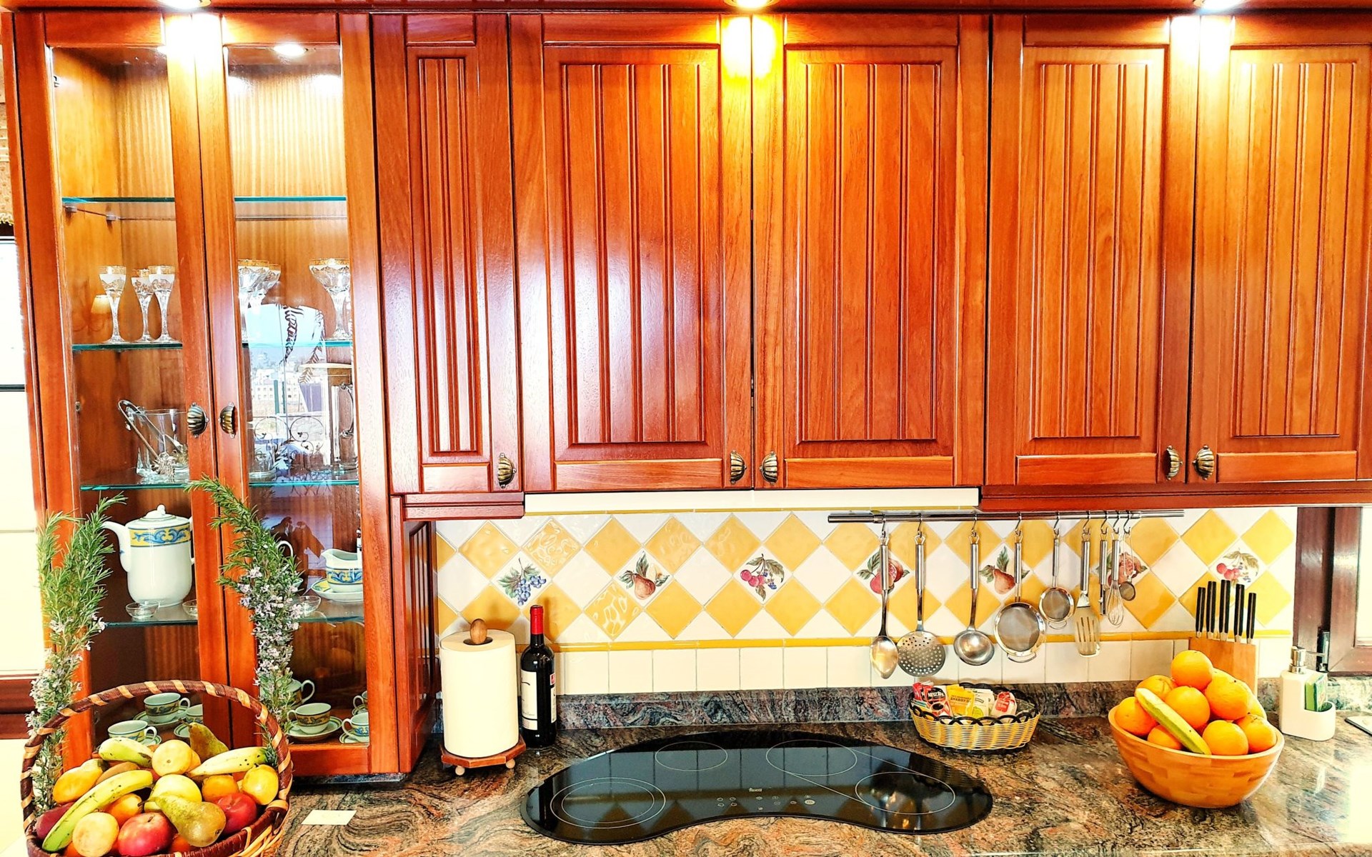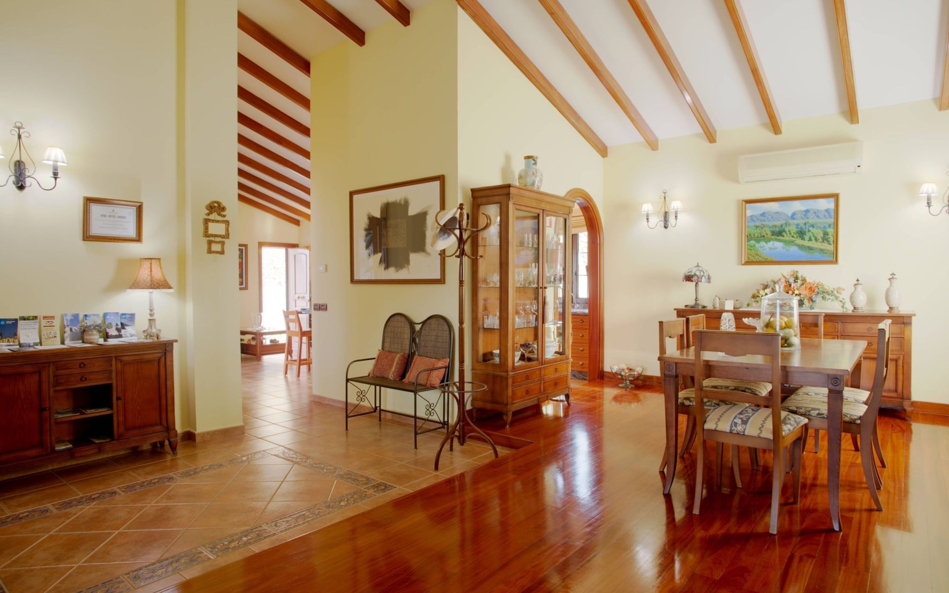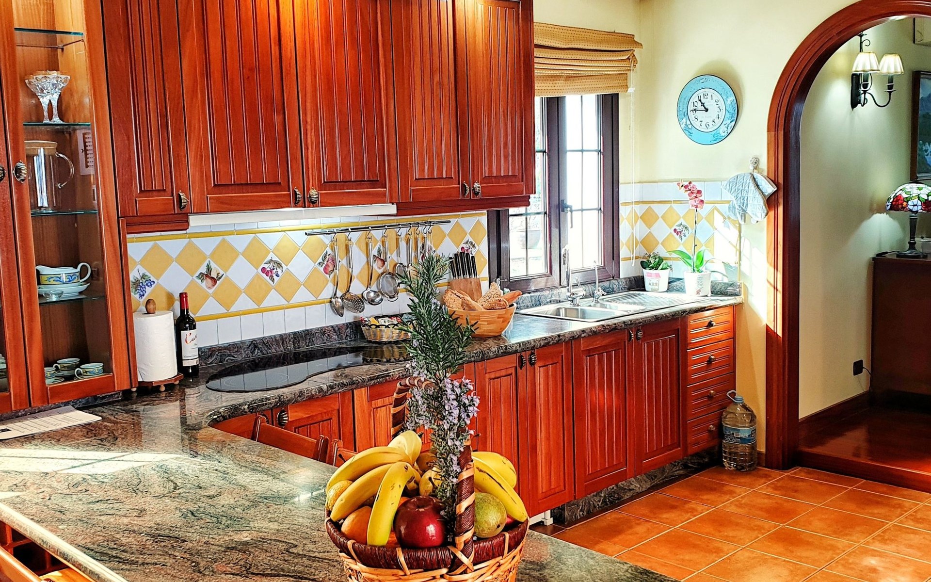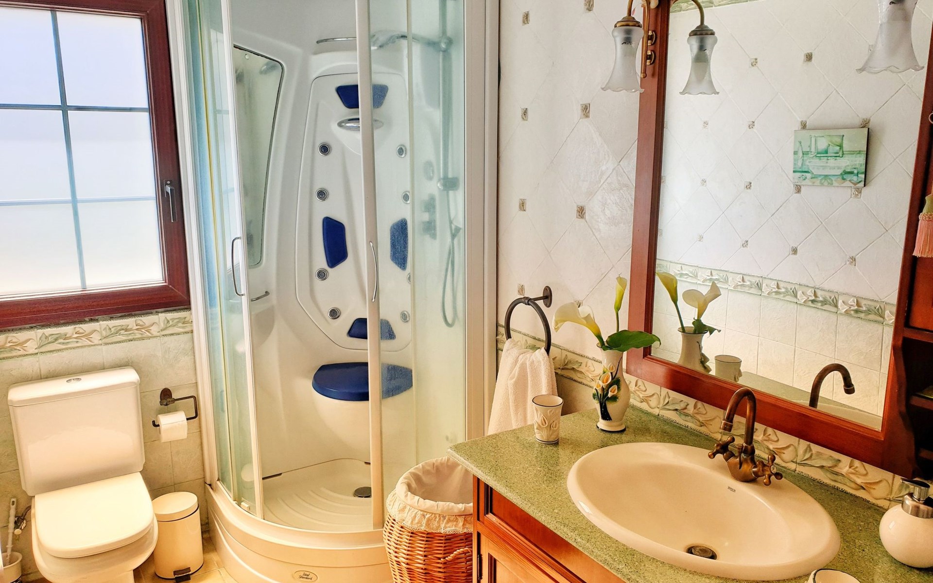 It has a comfortable, open-plan layout: Kitchen-dining room with everything necessary (fridge, freezer, dishwasher, microwave, vitro-ceramic cooker and all the small electrical appliances for daily use). Two bathrooms inside the main house, one of the bathrooms with Jacuzzi bath and the second bathroom with Jacuzzi shower. Three bedrooms with double beds. Small living room with sofa-bed and television. Spacious living-dining room.