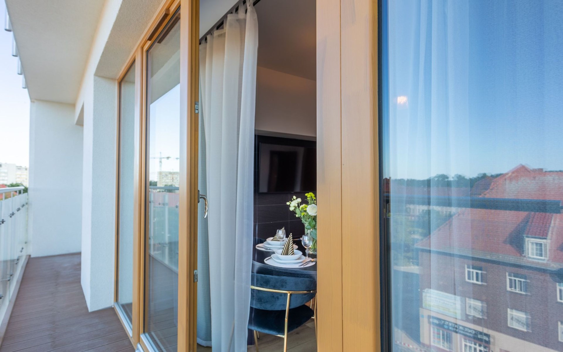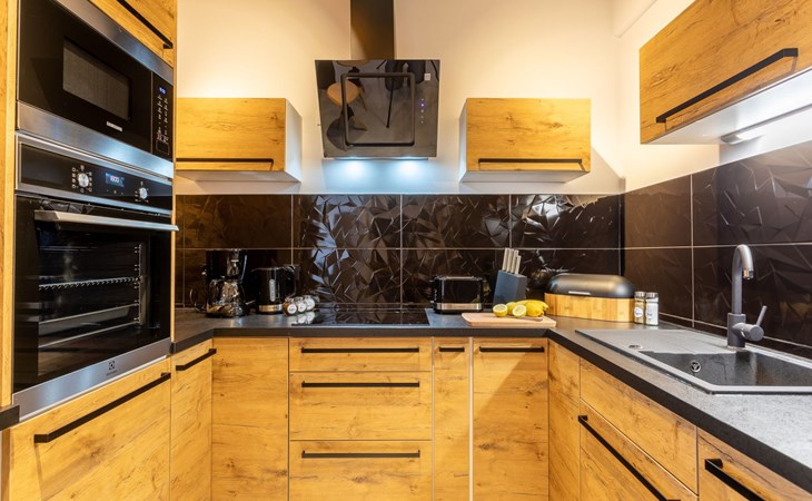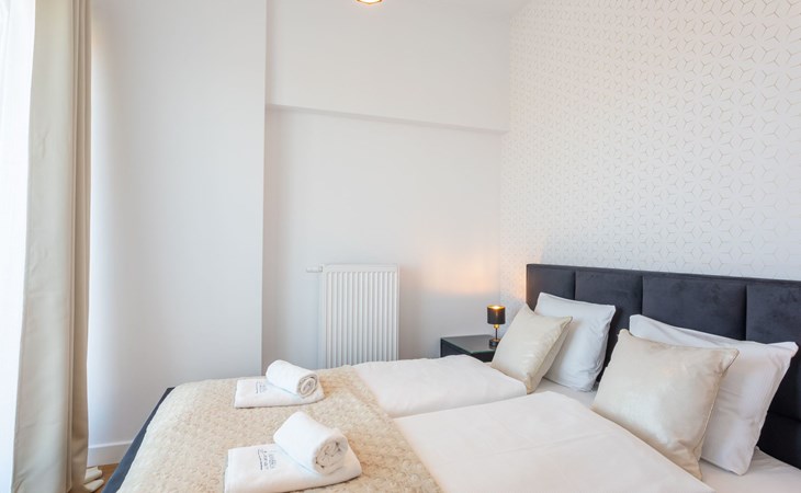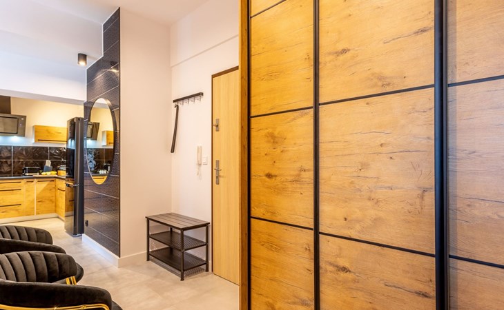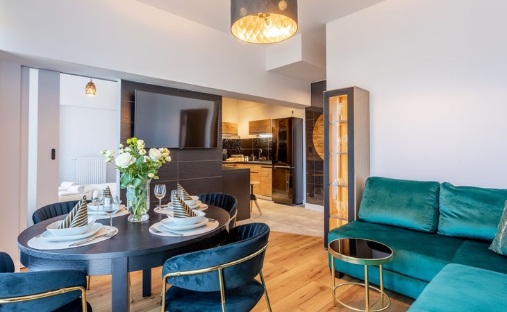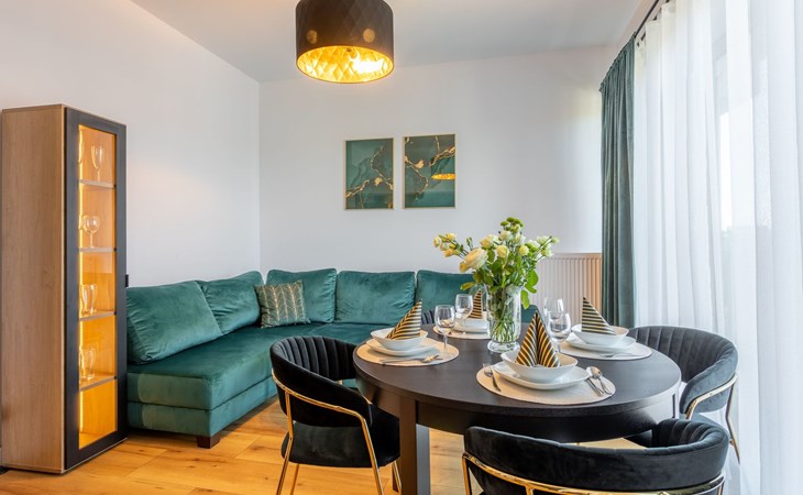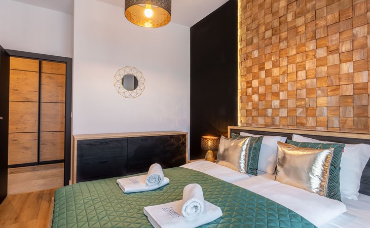 It is a very spacious flat on the fifth floor with two large bedrooms, a living room with a well-equipped kitchenette and a bathroom with a total area of 54 m2 and a balcony where you can spend pleasant moments enjoying a cup of freshly brewed coffee or a glass of your favourite wine. The interior is very originally designed, with white, green and black colours dominated by light wood with visible grains and knots, which undoubtedly makes the space more atmospheric and cosy. Large glazing gives the room a very luxurious, modern character and lets in plenty of natural light. Due to the functional layout, the flat can accommodate up to six people. It is finished to a high standard and is a mosaic of different furniture, details and textures - it combines several different styles that complement each other and allow you to create a versatile space full of interesting and original combinations that you will surely remember for a long time and encourage you to come back quickly. Guests also have at their disposal - for a fee - a car park in the neighbouring building, which significantly increases the comfort of travel and can be especially desirable for families with children.