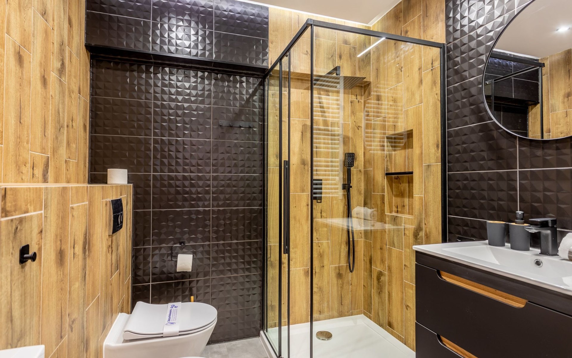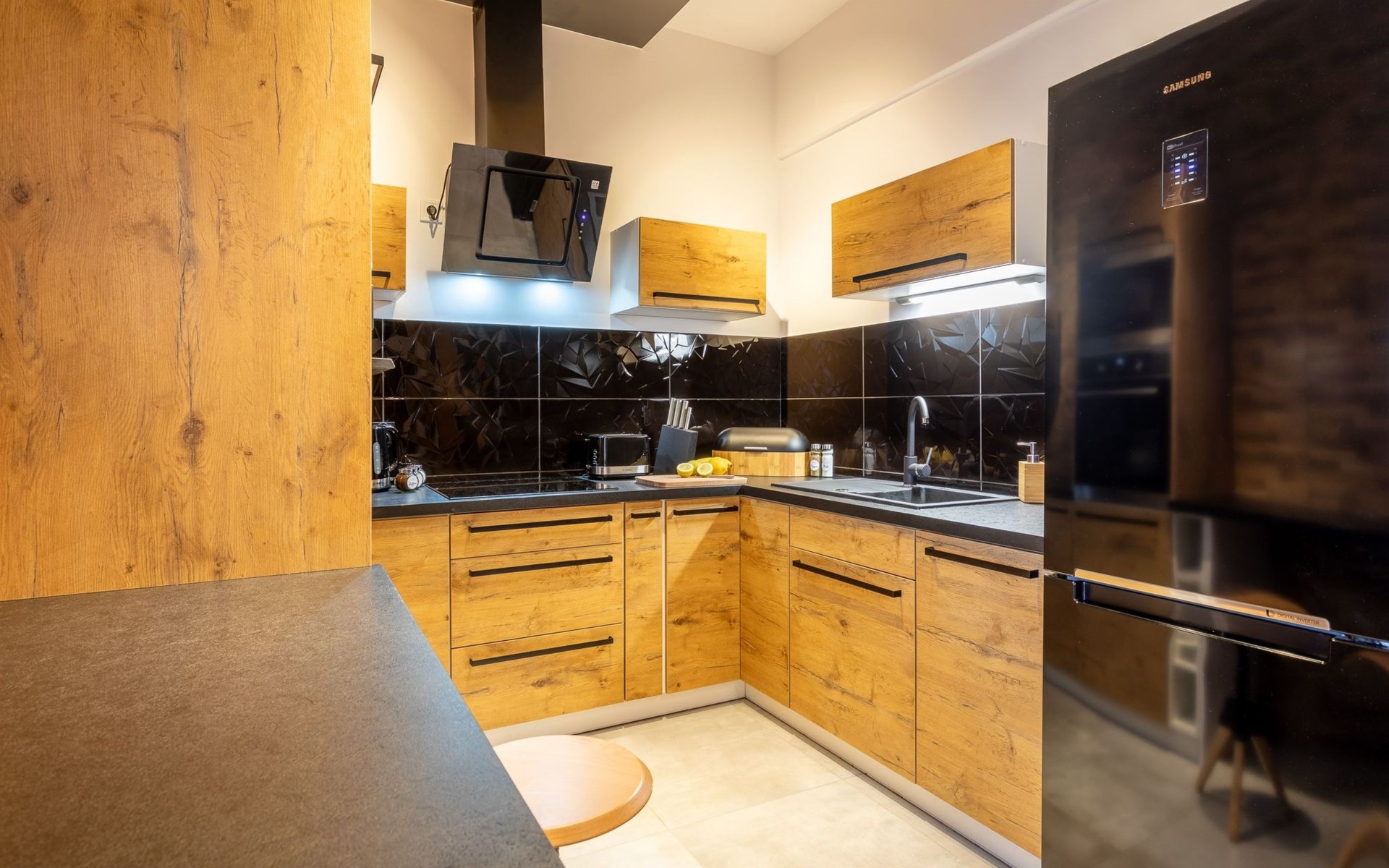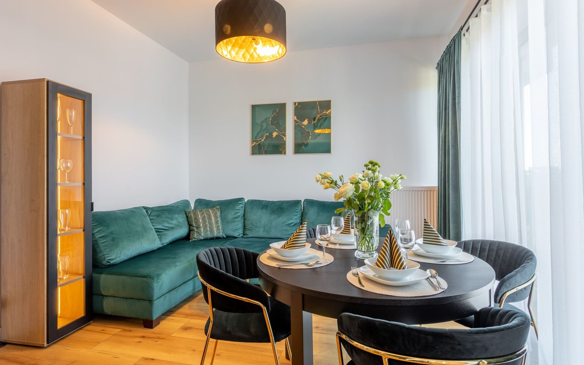 It is a very spacious flat on the fifth floor with two large bedrooms, a living room with a well-equipped kitchenette and a bathroom with a total area of 54 m2 and a balcony where you can spend pleasant moments enjoying a cup of freshly brewed coffee or a glass of your favourite wine. The interior is very originally designed, with white, green and black colours dominated by light wood with visible grains and knots, which undoubtedly makes the space more atmospheric and cosy. Large glazing gives the room a very luxurious, modern character and lets in plenty of natural light. Due to the functional layout, the flat can accommodate up to six people. It is finished to a high standard and is a mosaic of different furniture, details and textures - it combines several different styles that complement each other and allow you to create a versatile space full of interesting and original combinations that you will surely remember for a long time and encourage you to come back quickly. Guests also have at their disposal - for a fee - a car park in the neighbouring building, which significantly increases the comfort of travel and can be especially desirable for families with children.