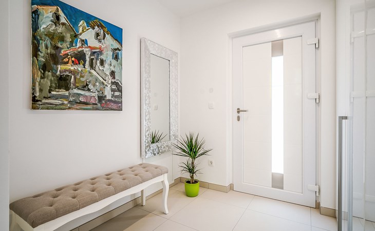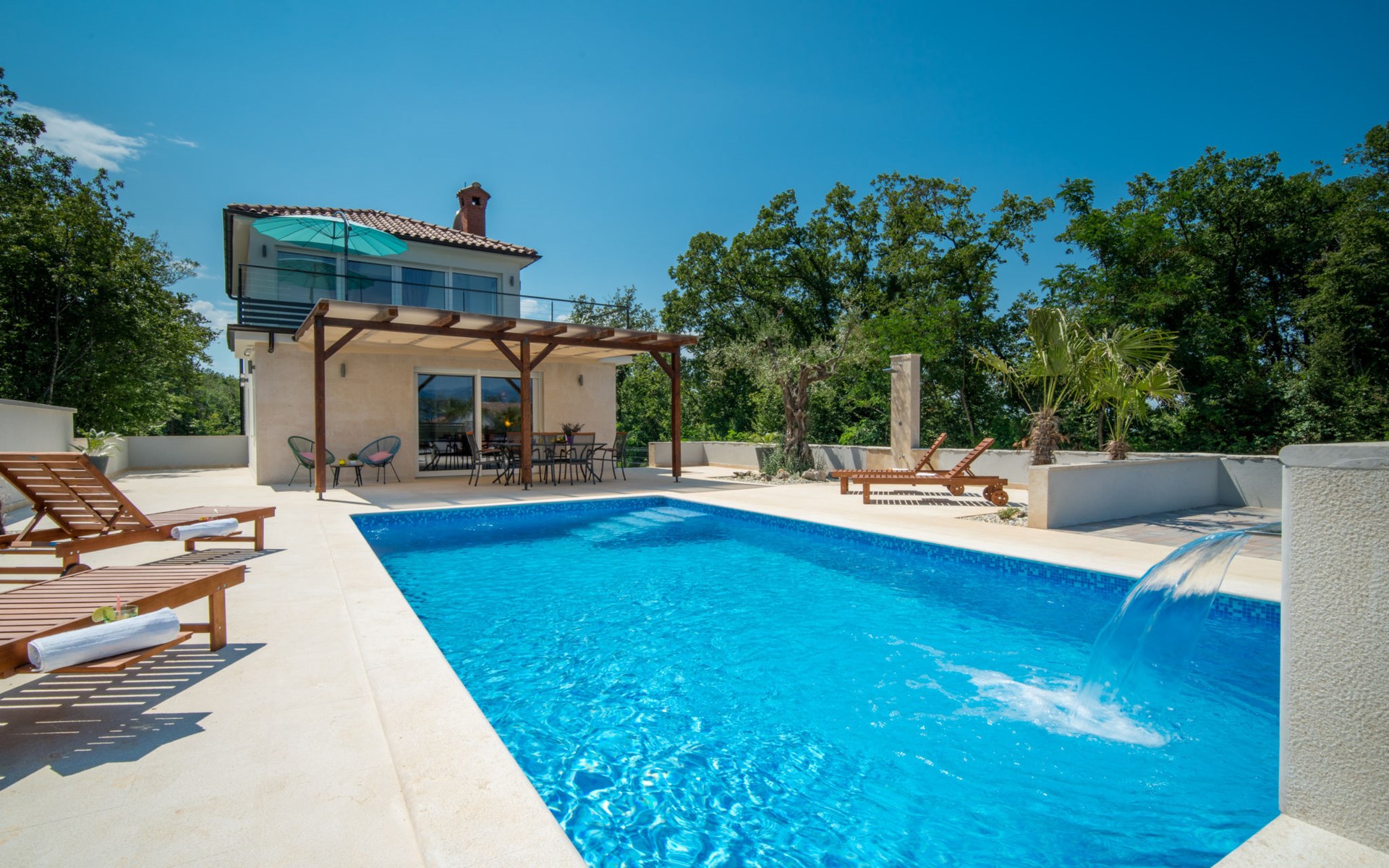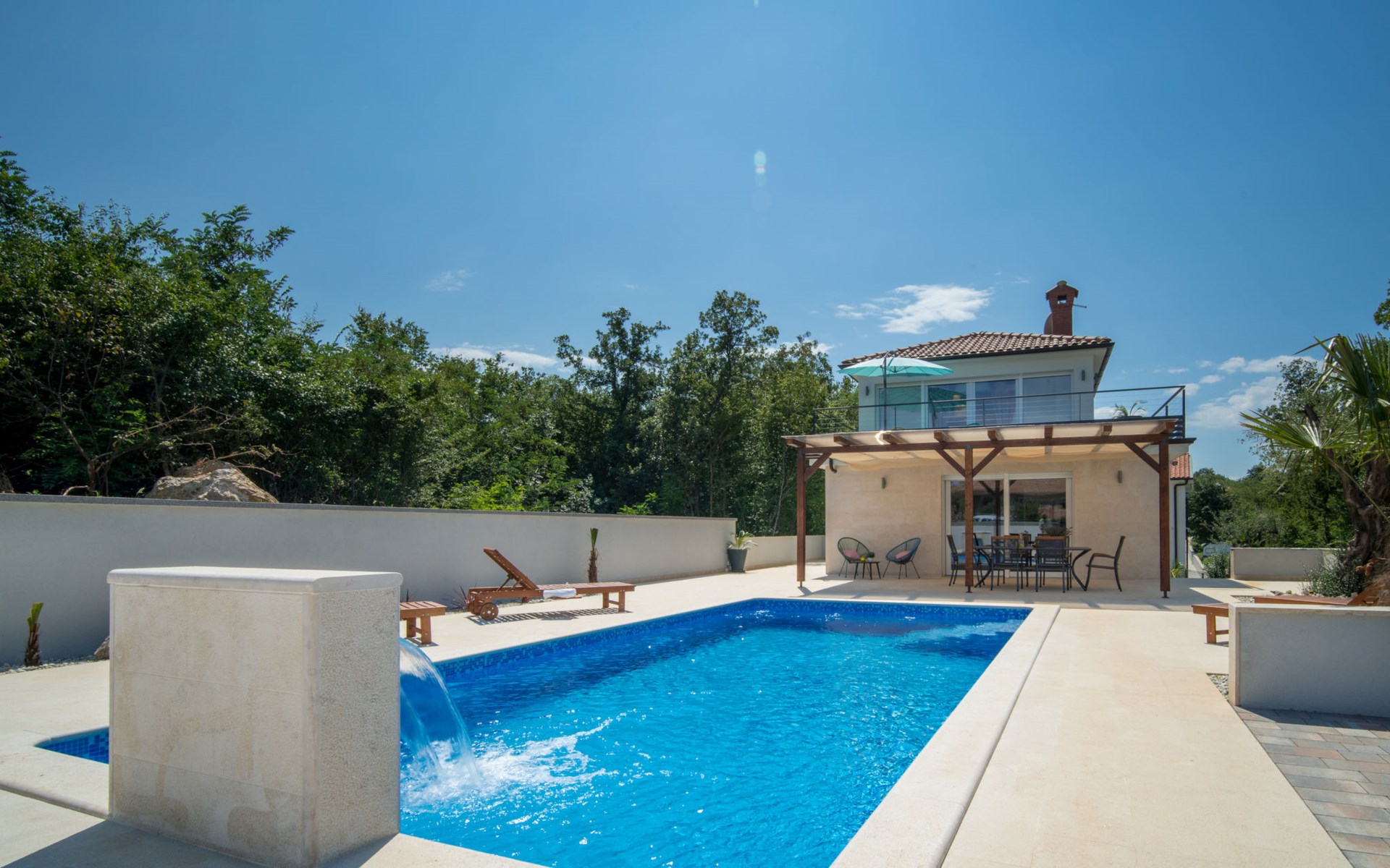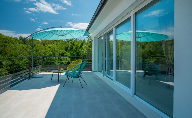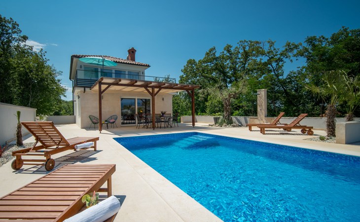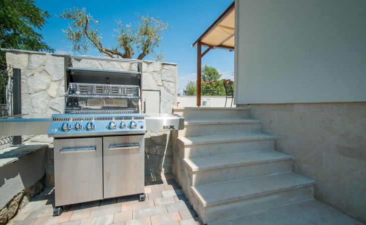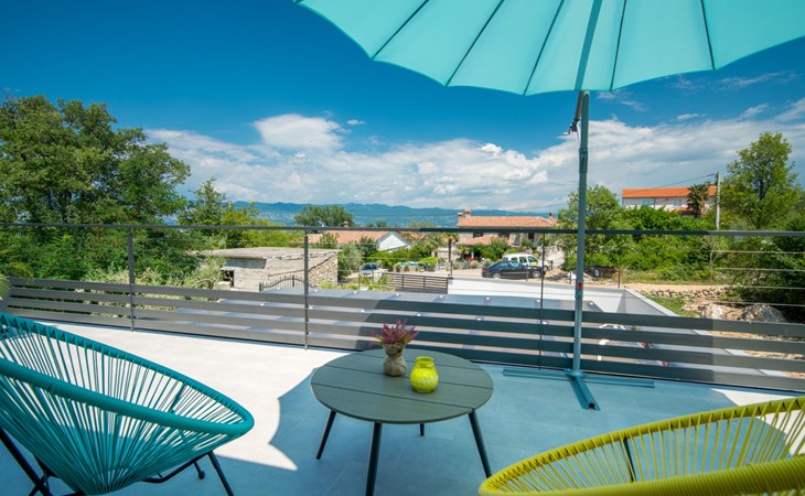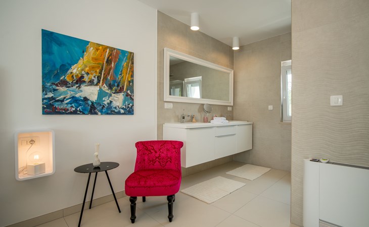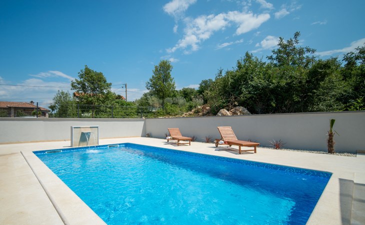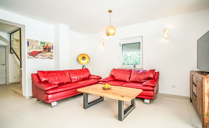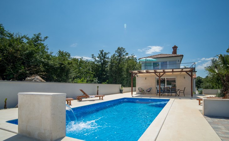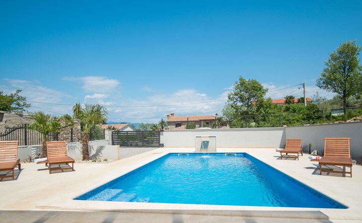 Gornja Hlapa 2 km from Dobrinj: Single-family house "Ivana", 3 storeys, built in 2018. 3 km from the centre of Solin, 5 km from the centre of Klimno, 12.5 km from the centre of Malinska, in a quiet, sunny position, 2.5 km from the sea, 2.5 km from the beach, in a cul-de-sac. Private: property 580 m2 (fenced) with wildlife garden, swimming pool angular, heated (8 x 4 m, depth 140 cm, seasonal availability: 01.May. - 15.Oct.) with internal staircase. Outdoor shower. In the house: internet access, sauna, burglar alarm system, washing machine. Parking (for 3 cars) at the house on the premises. Shop 950 m, supermarket 11 km, restaurant 950 m, bus stop 5.2 km, pebble beach 2.5 km, concrete beach 2.5 km. Groups of teenagers on request only. By groups of young people double deposit is requested on arrival. Swimming pool heated (extra).
