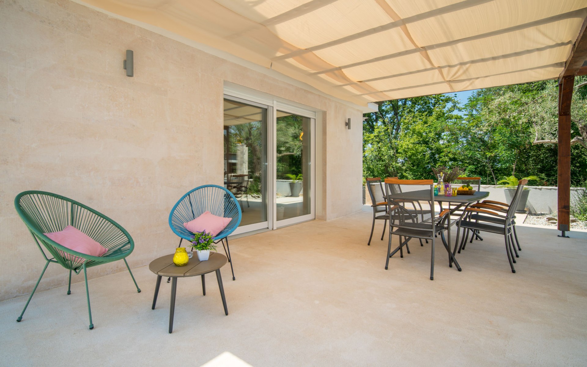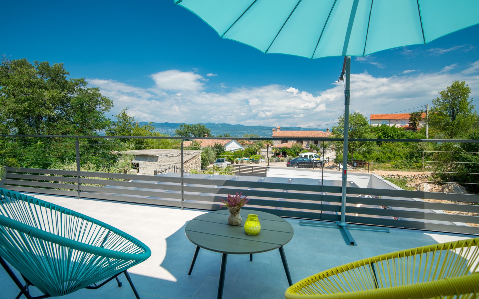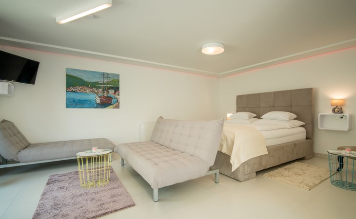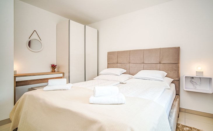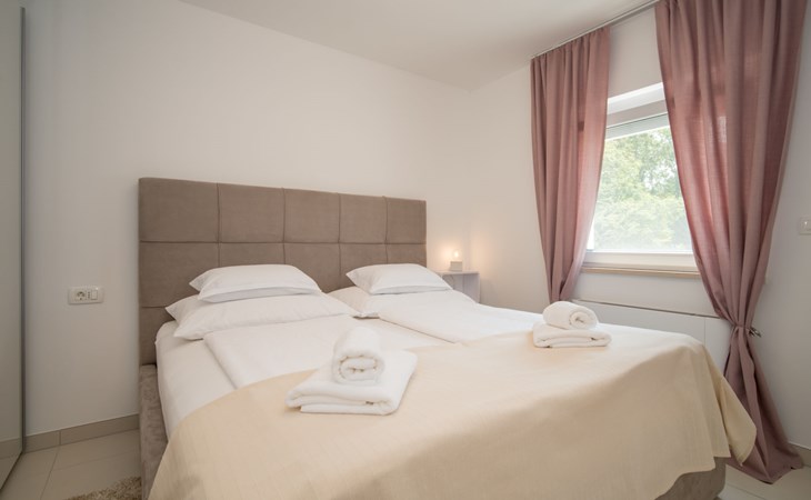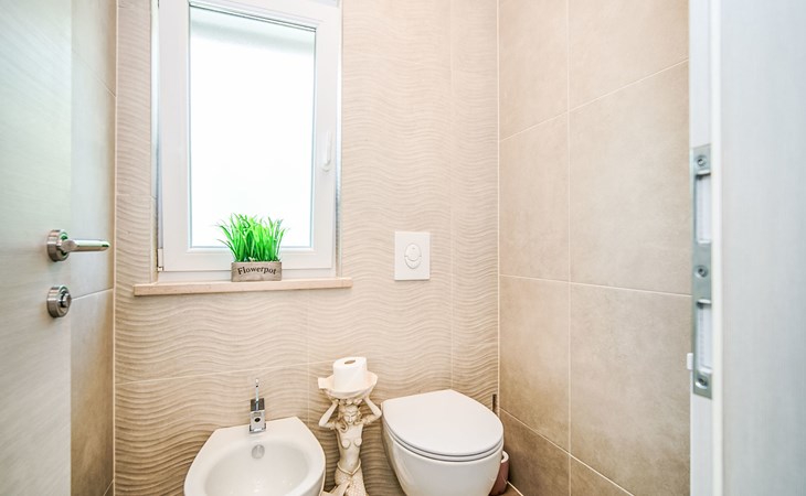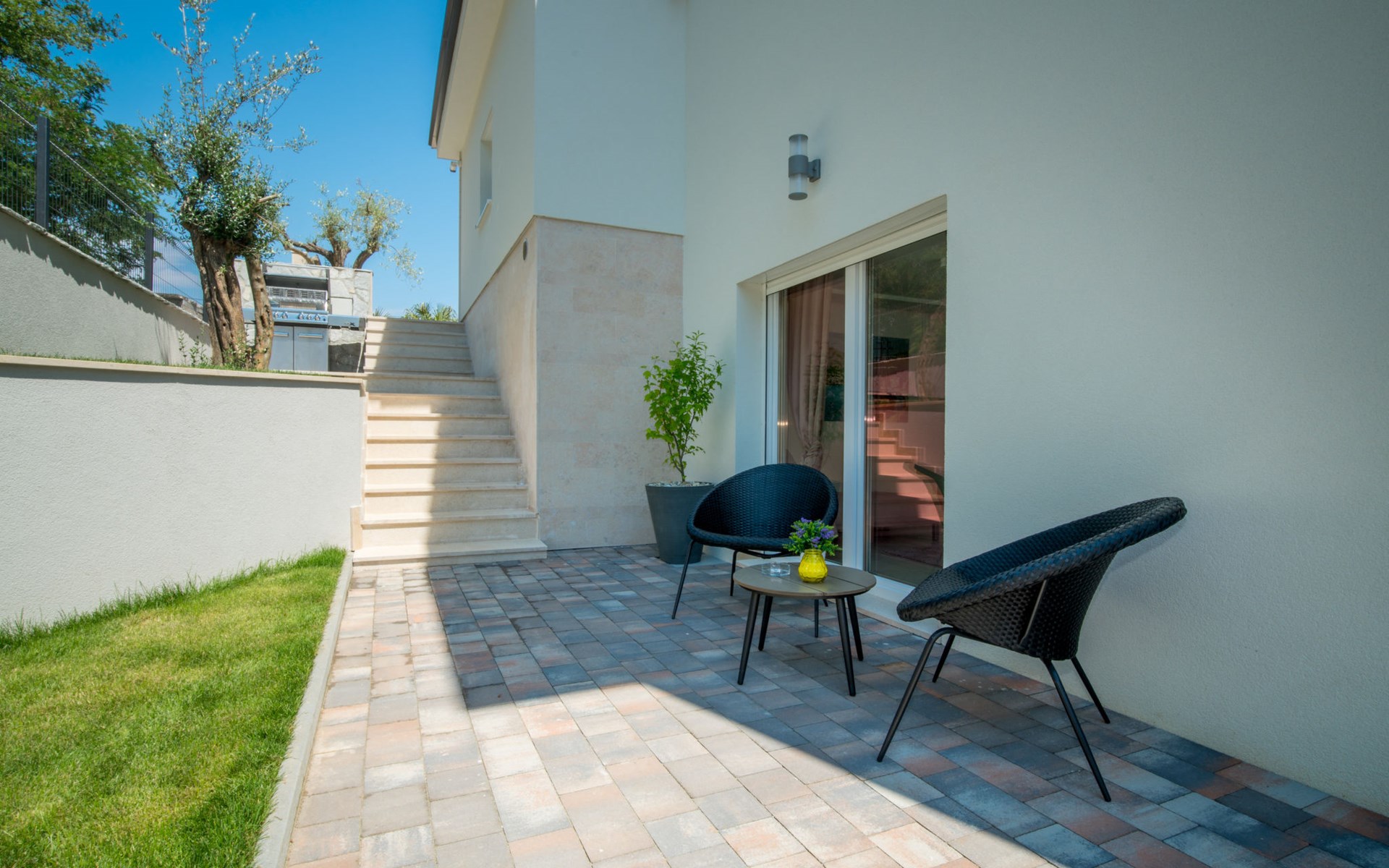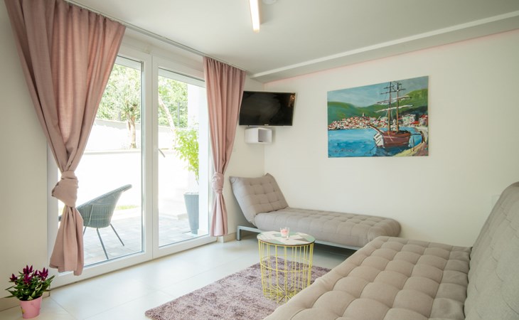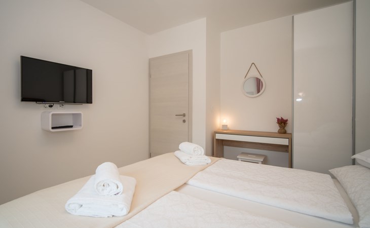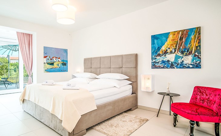 Gornja Hlapa 2 km from Dobrinj: Single-family house "Ivana", 3 storeys, built in 2018. 3 km from the centre of Solin, 5 km from the centre of Klimno, 12.5 km from the centre of Malinska, in a quiet, sunny position, 2.5 km from the sea, 2.5 km from the beach, in a cul-de-sac. Private: property 580 m2 (fenced) with wildlife garden, swimming pool angular, heated (8 x 4 m, depth 140 cm, seasonal availability: 01.May. - 15.Oct.) with internal staircase. Outdoor shower. In the house: internet access, sauna, burglar alarm system, washing machine. Parking (for 3 cars) at the house on the premises. Shop 950 m, supermarket 11 km, restaurant 950 m, bus stop 5.2 km, pebble beach 2.5 km, concrete beach 2.5 km. Groups of teenagers on request only. By groups of young people double deposit is requested on arrival. Swimming pool heated (extra).
