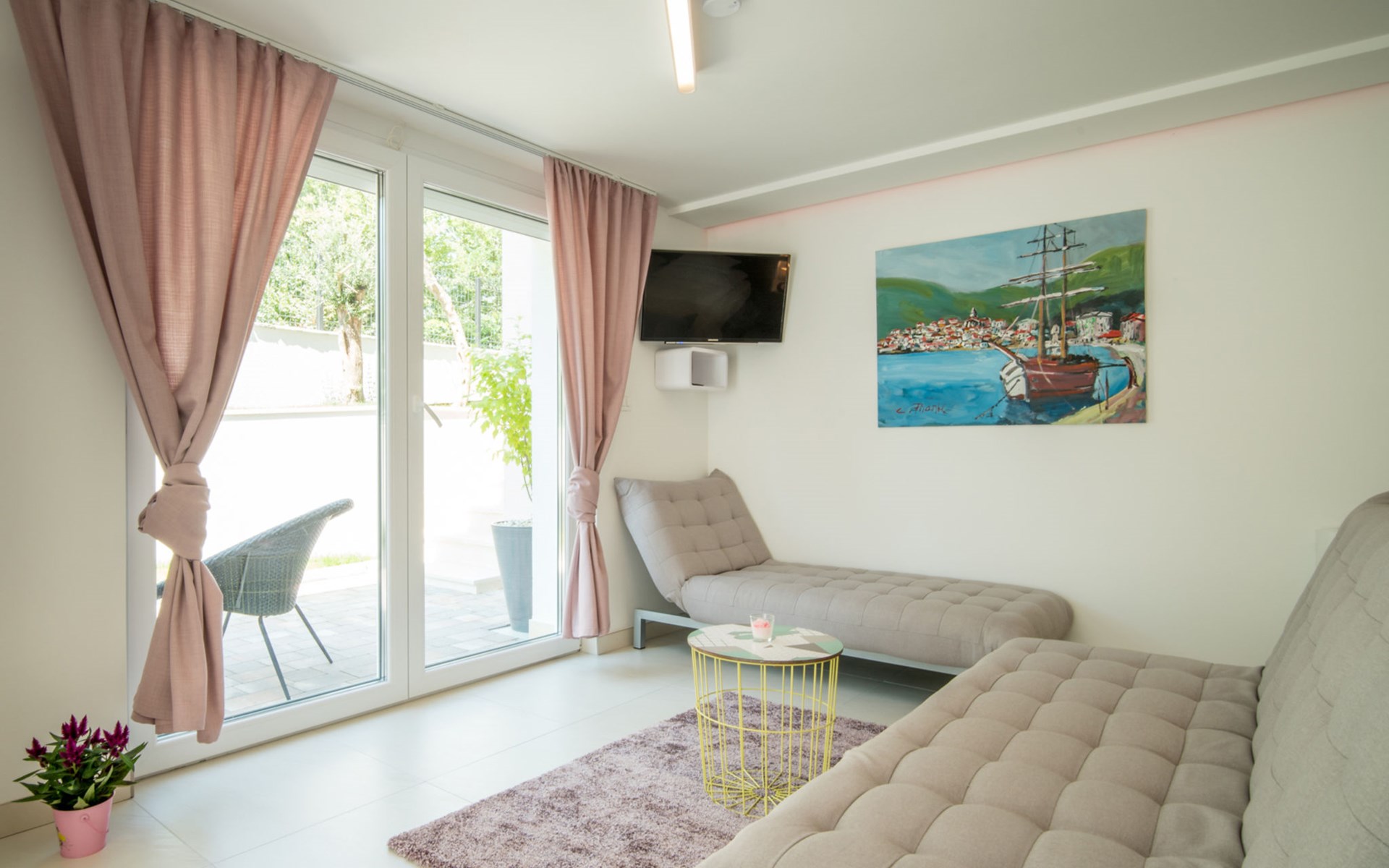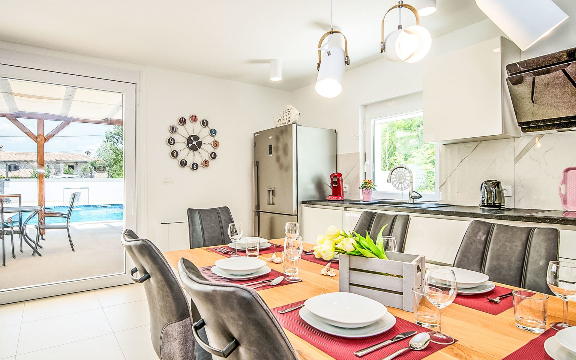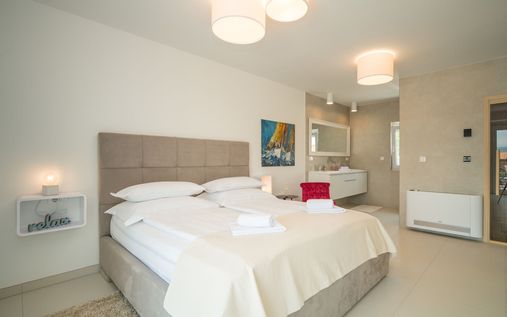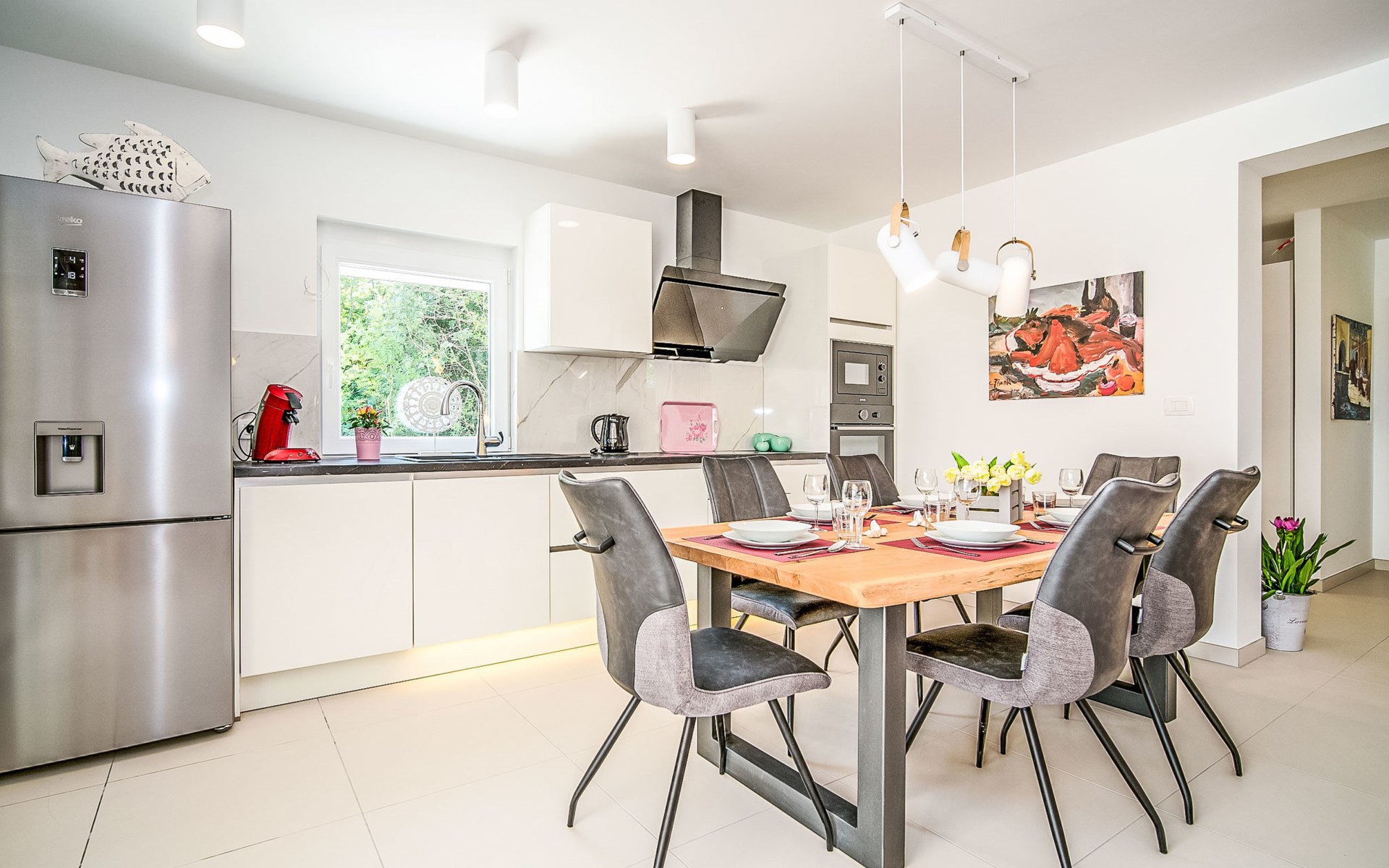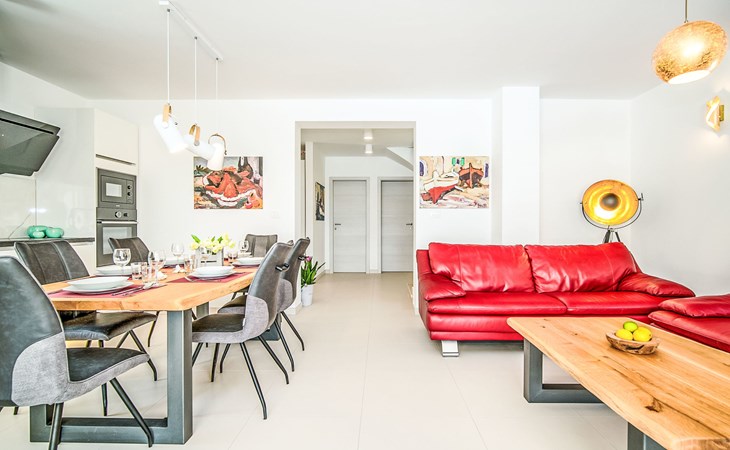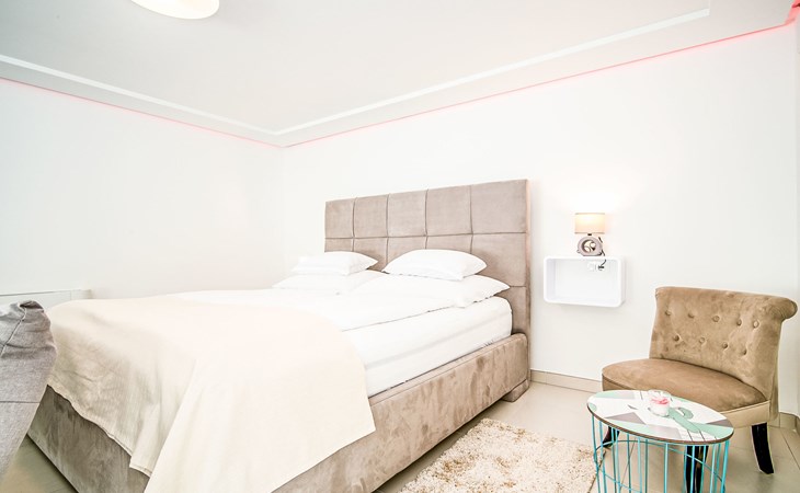 Gornja Hlapa 2 km from Dobrinj: Single-family house "Ivana", 3 storeys, built in 2018. 3 km from the centre of Solin, 5 km from the centre of Klimno, 12.5 km from the centre of Malinska, in a quiet, sunny position, 2.5 km from the sea, 2.5 km from the beach, in a cul-de-sac. Private: property 580 m2 (fenced) with wildlife garden, swimming pool angular, heated (8 x 4 m, depth 140 cm, seasonal availability: 01.May. - 15.Oct.) with internal staircase. Outdoor shower. In the house: internet access, sauna, burglar alarm system, washing machine. Parking (for 3 cars) at the house on the premises. Shop 950 m, supermarket 11 km, restaurant 950 m, bus stop 5.2 km, pebble beach 2.5 km, concrete beach 2.5 km. Groups of teenagers on request only. By groups of young people double deposit is requested on arrival. Swimming pool heated (extra).