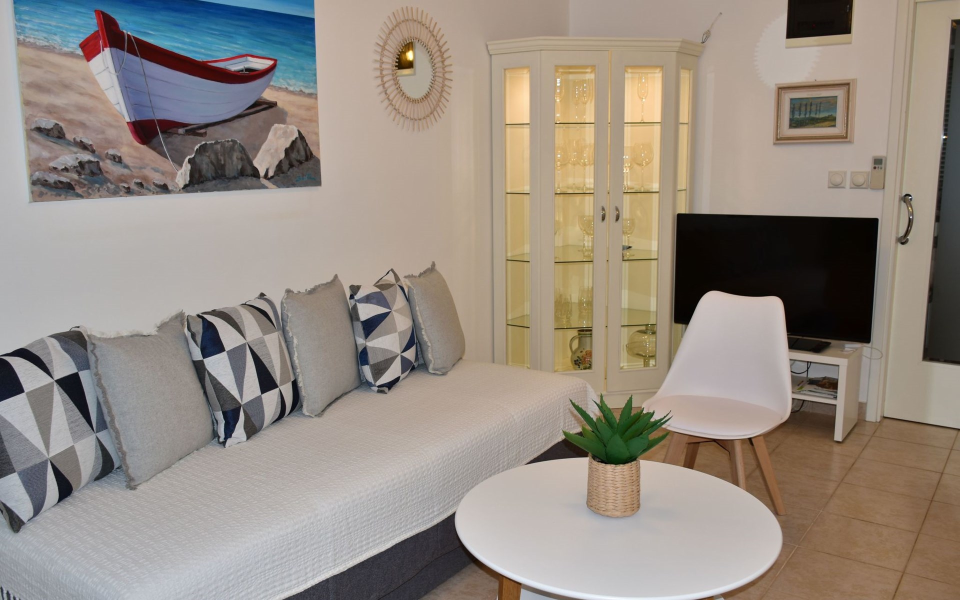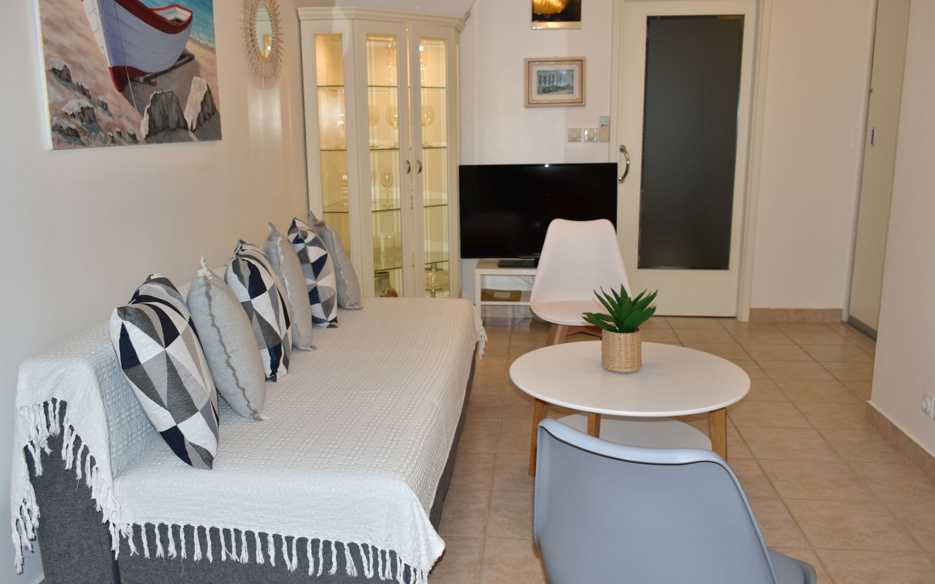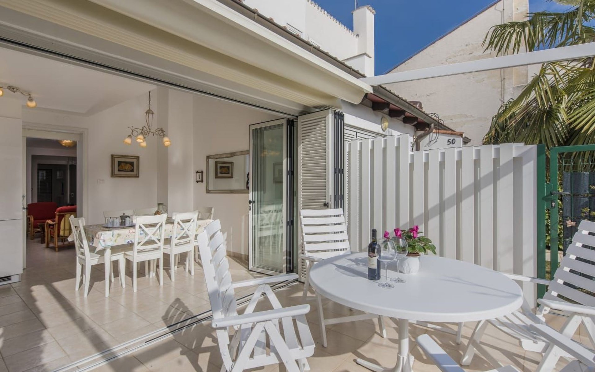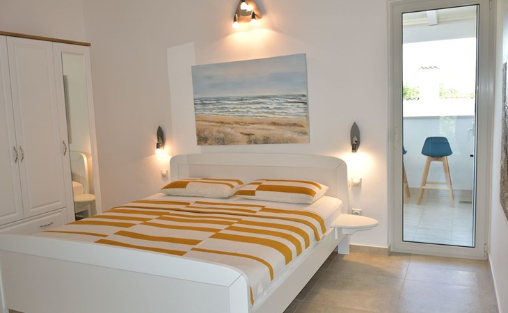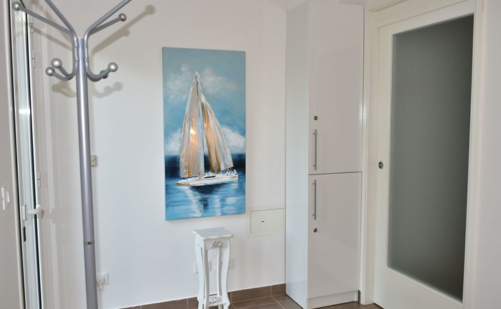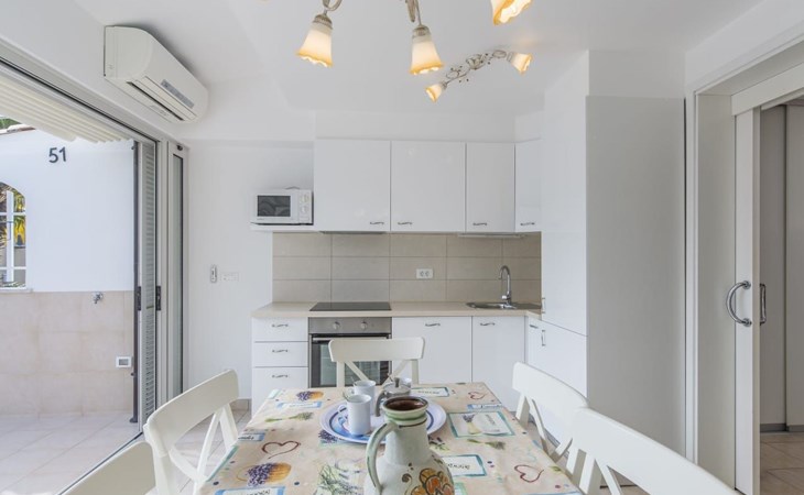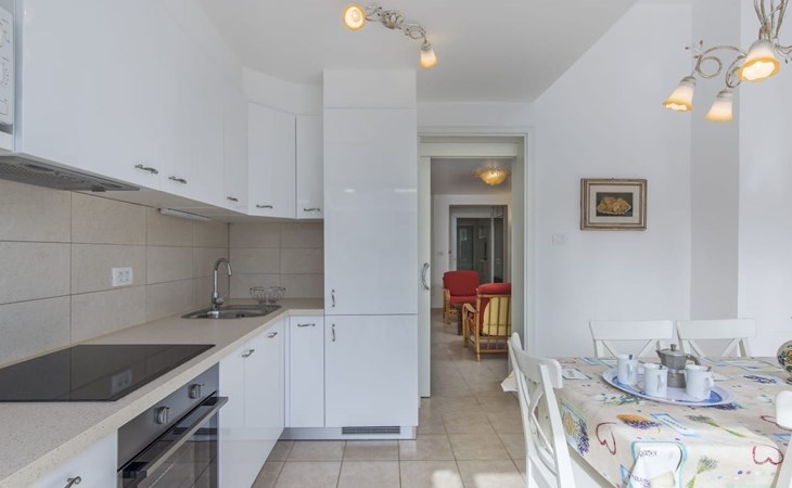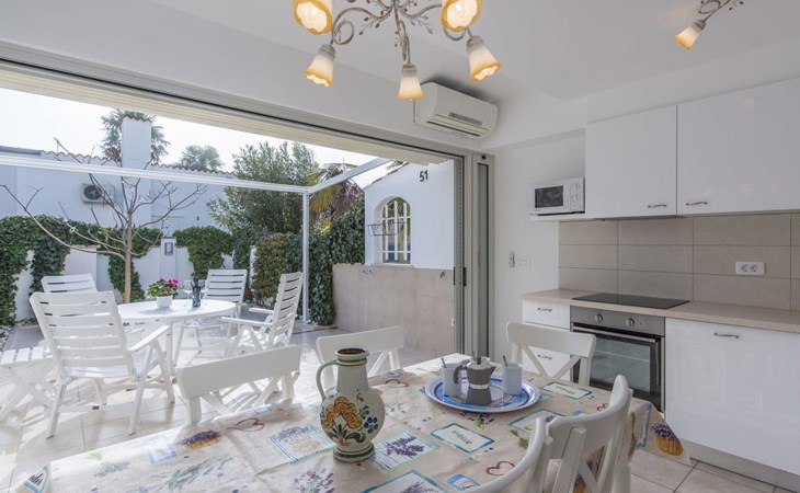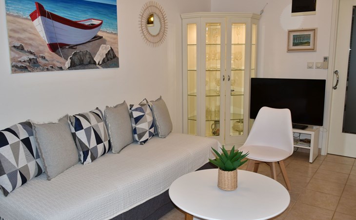 The house is modern and beautifully furnished, with a fully equipped kitchen with an oven, dishwasher, ceramic hob, toaster, and microwave. A coffee maker is also included. One bedroom is located on the ground floor with a separate shower, toilet, and sink, and a separate TV. The second bedroom is on the floor with access to the terrace, where there is also a pull-out sofa. The bathroom on the ground floor includes a shower, toilet, sink, bidet, and a washing machine. The living area has a TV and comfortable furniture. The entrance to the house is private and separate.