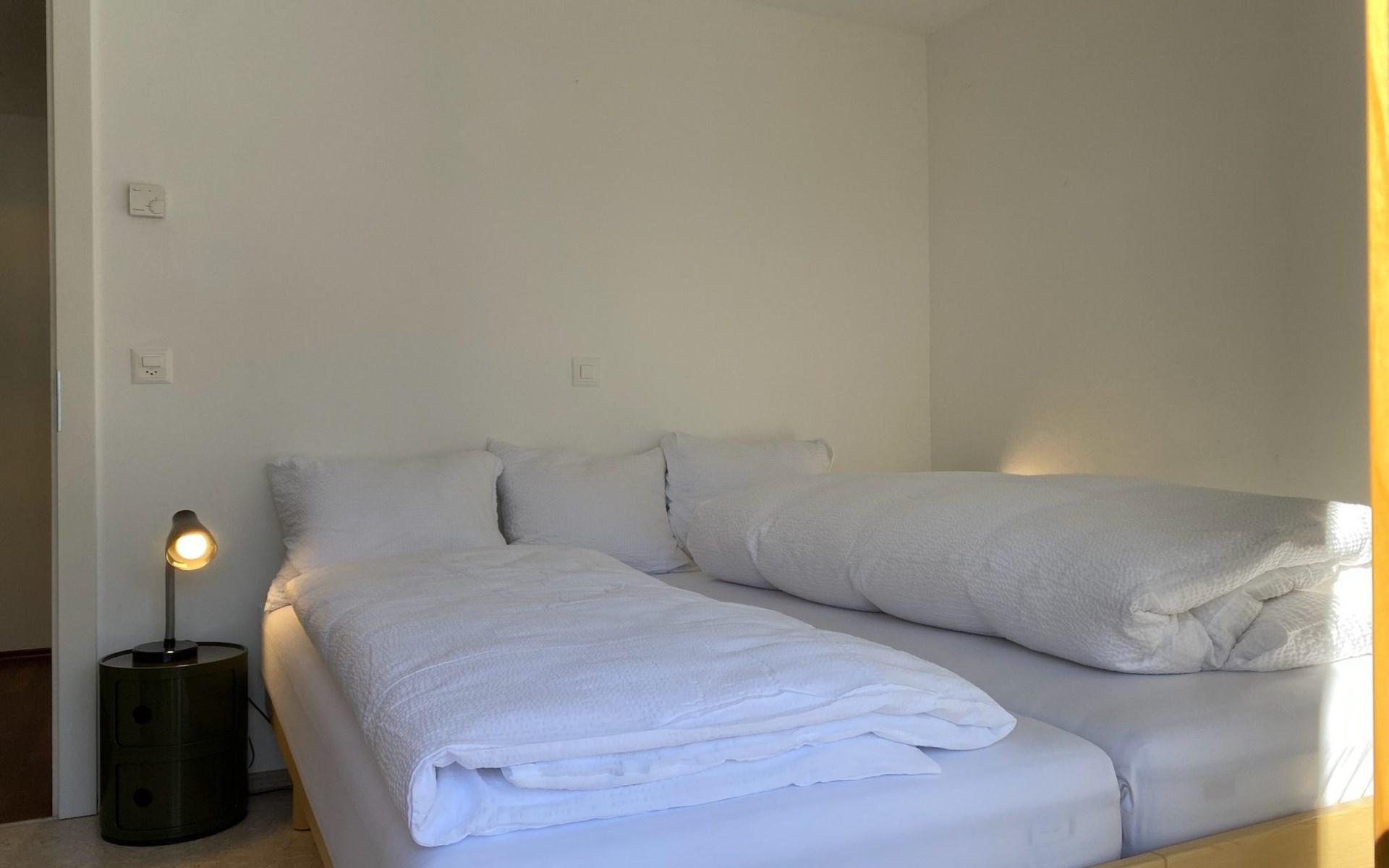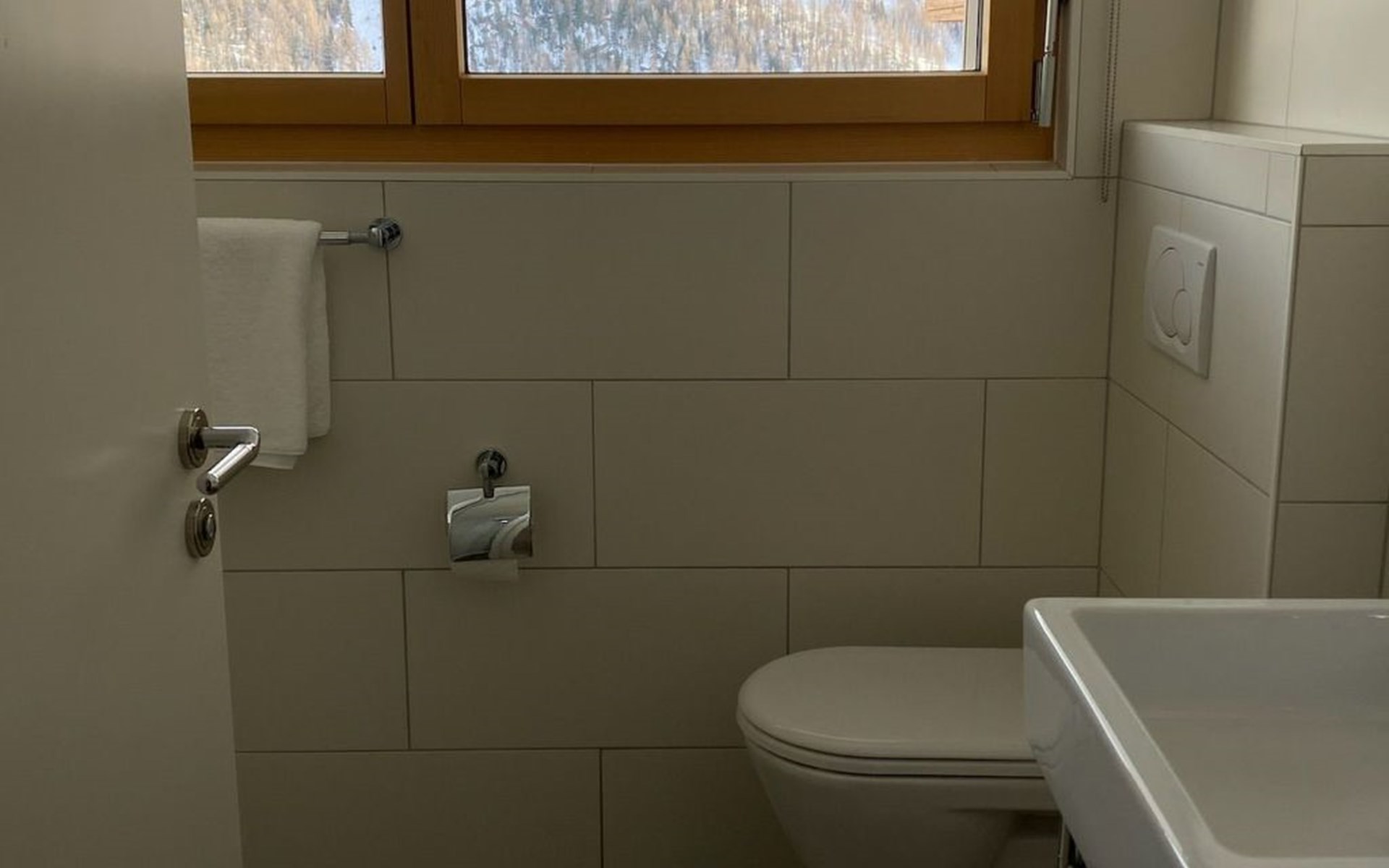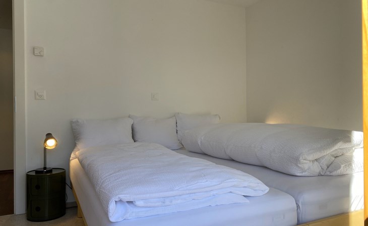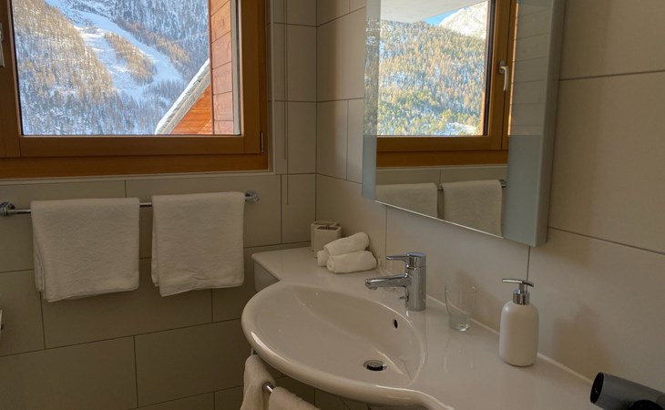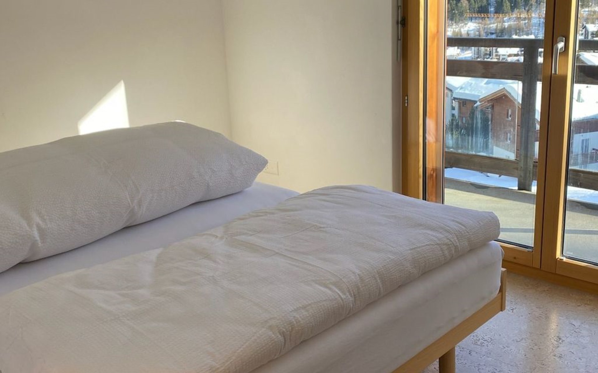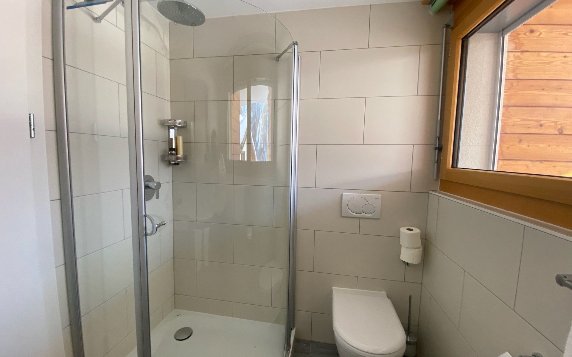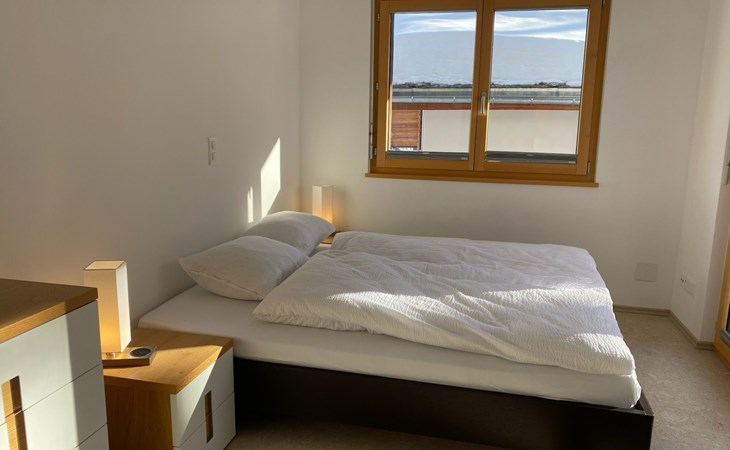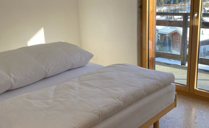 One floor down there is a bedroom with a double bed, wardrobe, chest of drawers, access to the balcony and a bathroom with a wellness shower. There is also another bedroom with a double bed, access to the balcony and a wardrobe. There is also a bathroom on the first floor and a ski room.