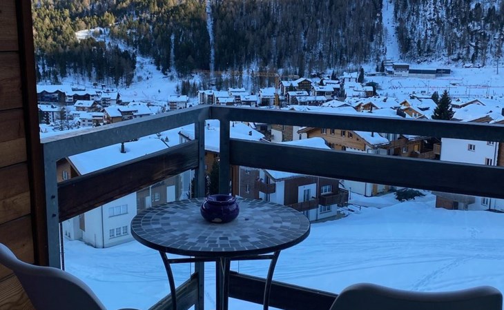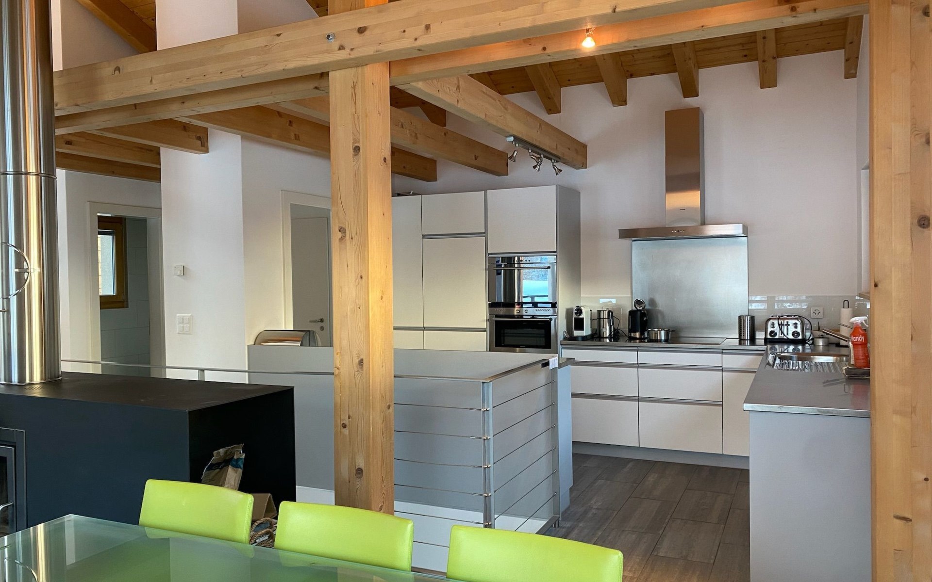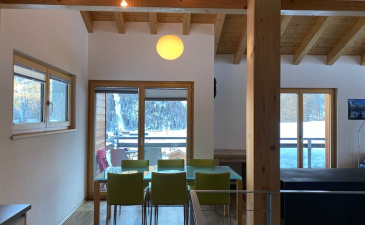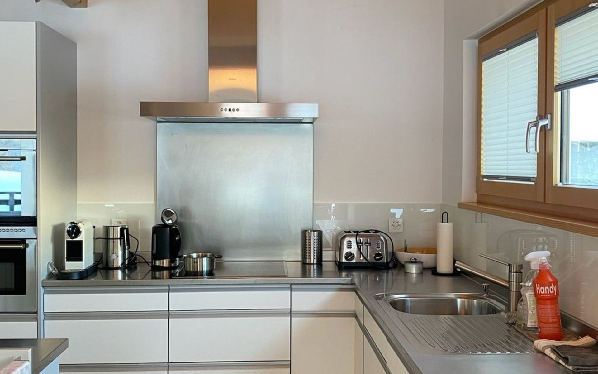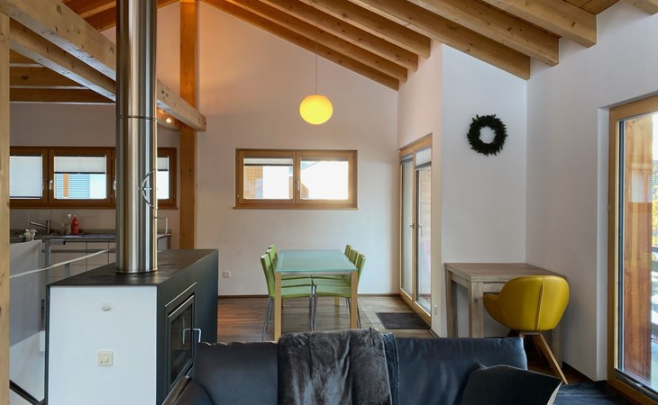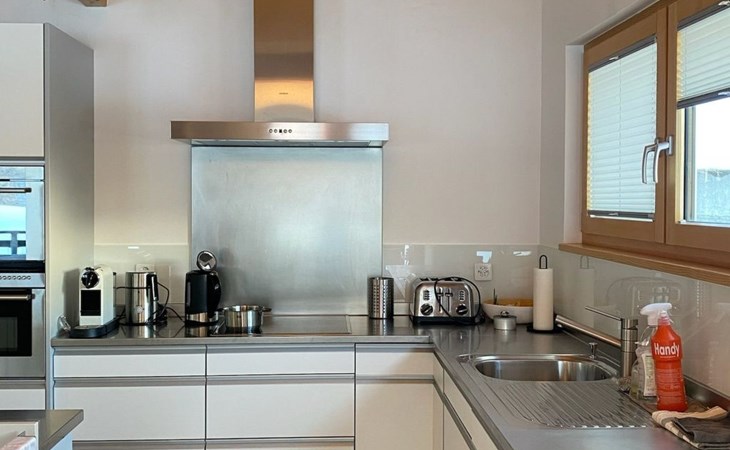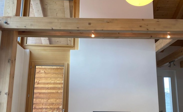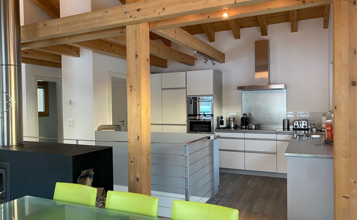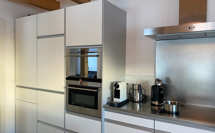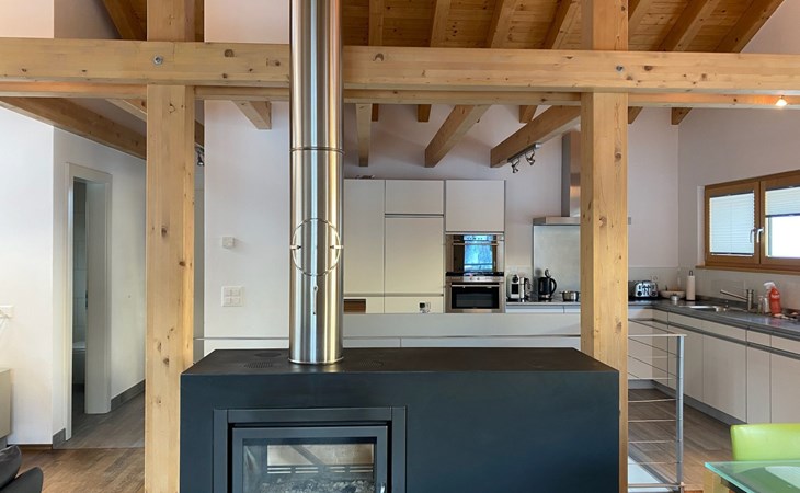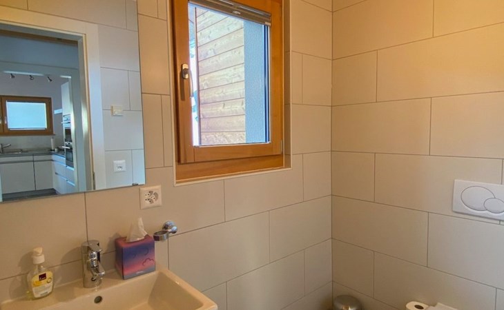You enter the chalet on the top floor, the living area. Here you will find a toilet, a large sofa & TV, the fireplace, a small table and chair, the dining table with six chairs, the spacious kitchen and a balcony. On the balcony there is a small table, two chairs and two folding chairs. The kitchen has a cooker, a steamer, a microwave oven, a kettle, a coffee machine, a toaster, a dishwasher, a fridge and various utensils for cooking.