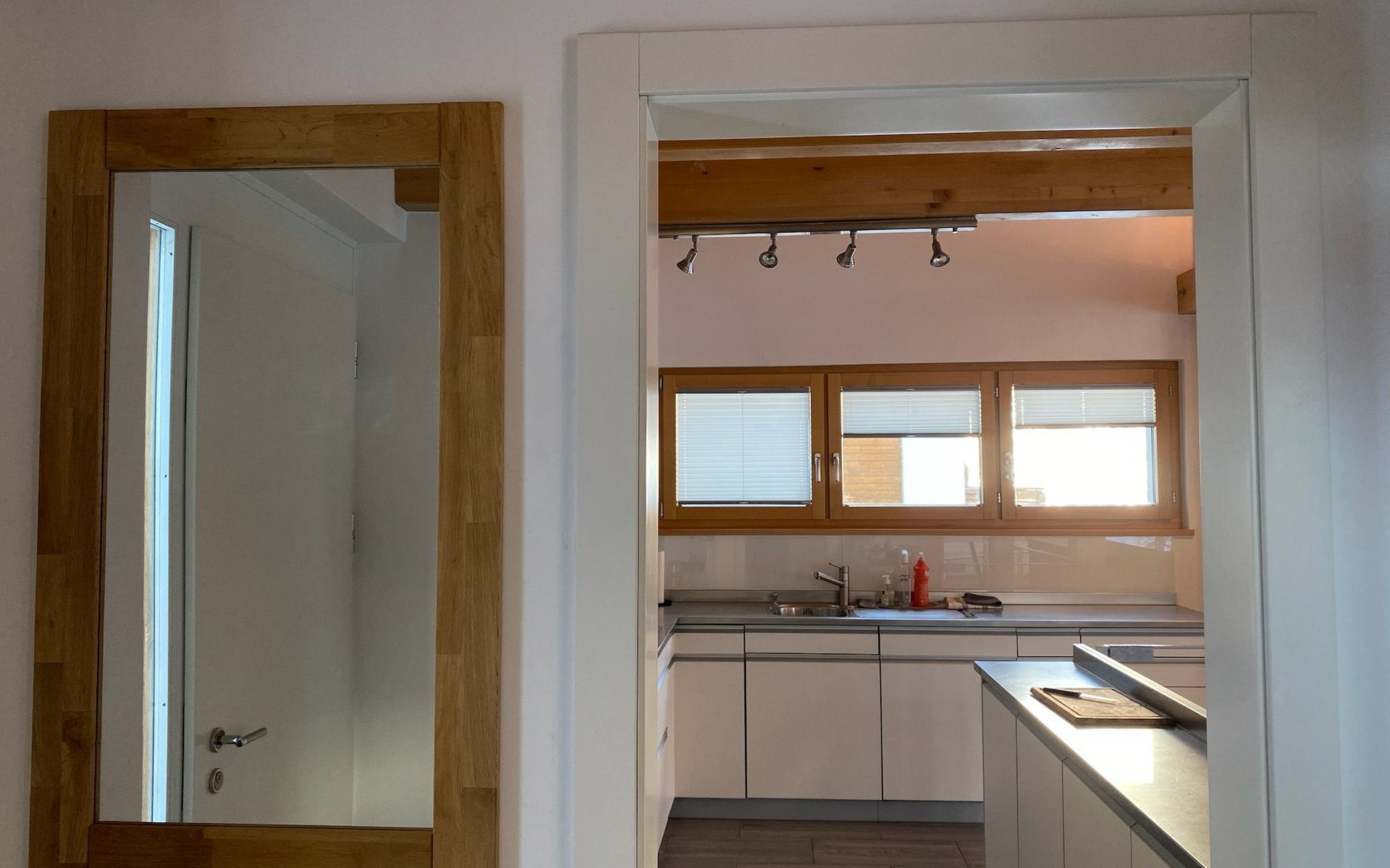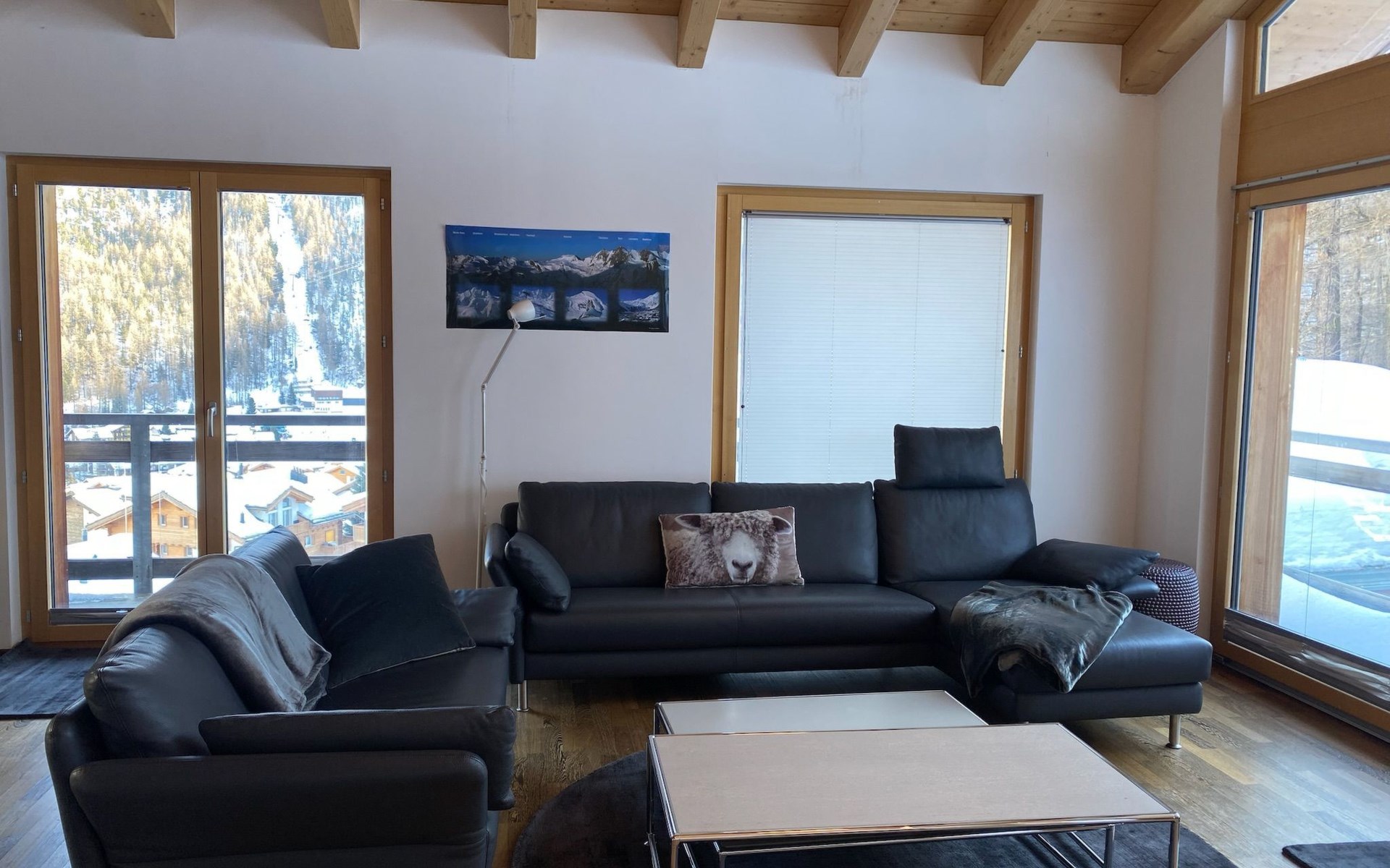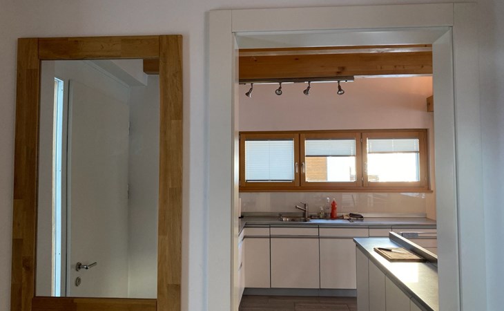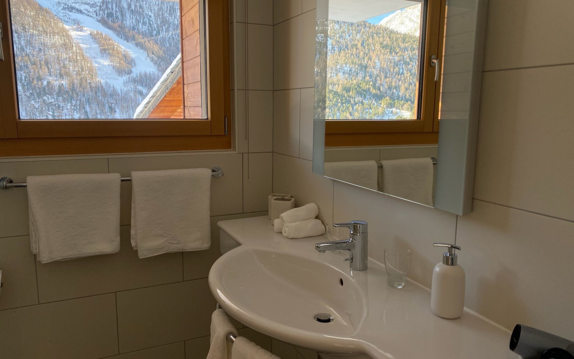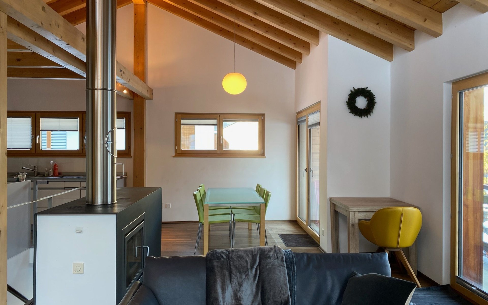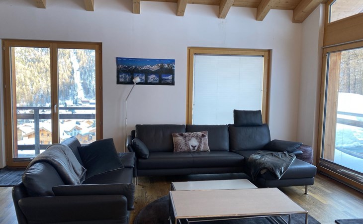 You enter the chalet on the top floor, the living area. Here you will find a toilet, a large sofa & TV, the fireplace, a small table and chair, the dining table with six chairs, the spacious kitchen and a balcony. On the balcony there is a small table, two chairs and two folding chairs. The kitchen has a cooker, a steamer, a microwave oven, a kettle, a coffee machine, a toaster, a dishwasher, a fridge and various utensils for cooking.