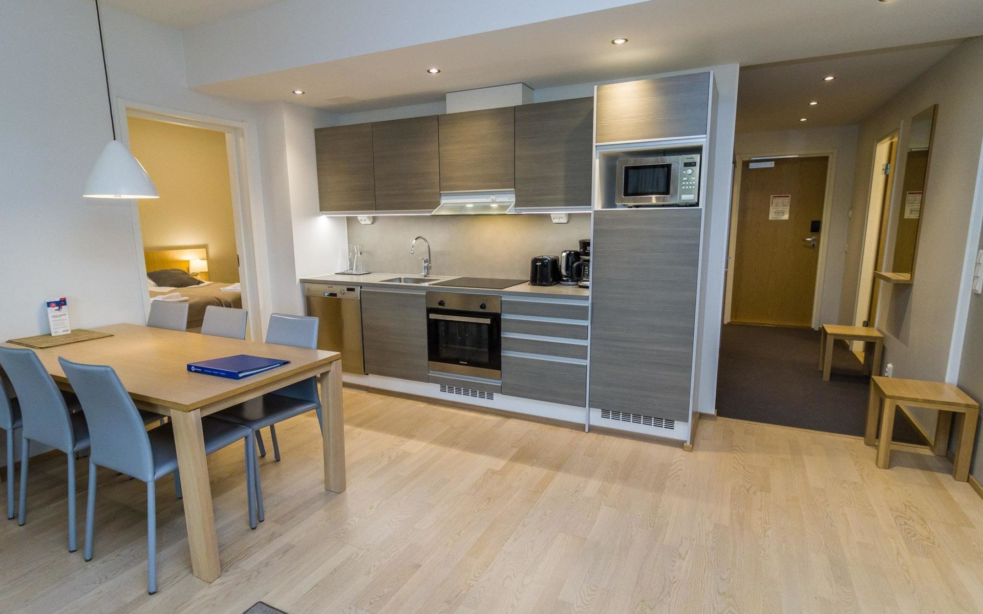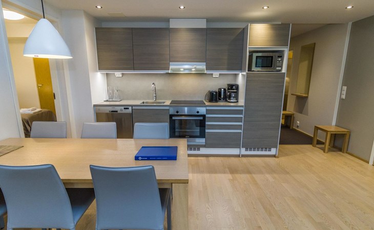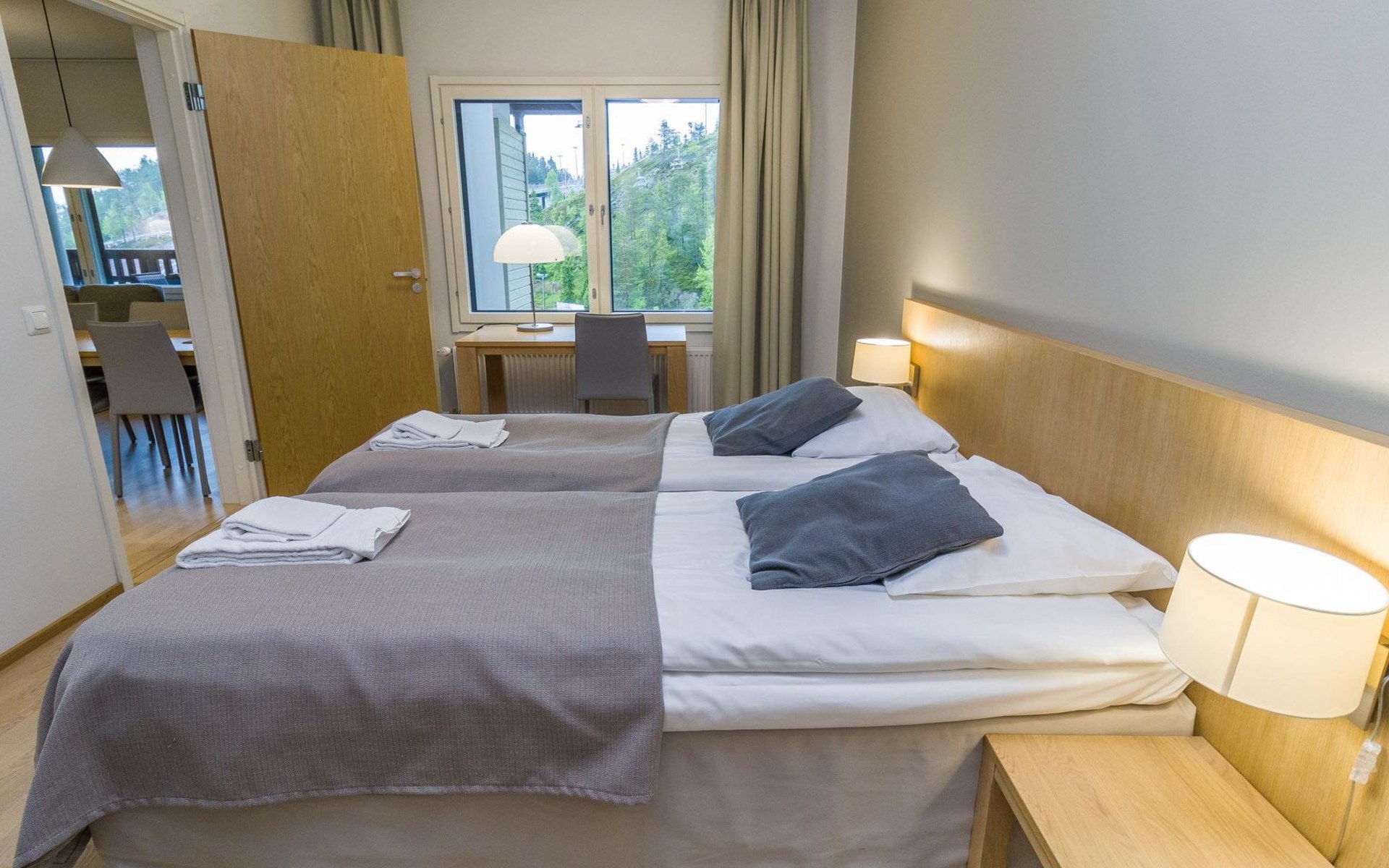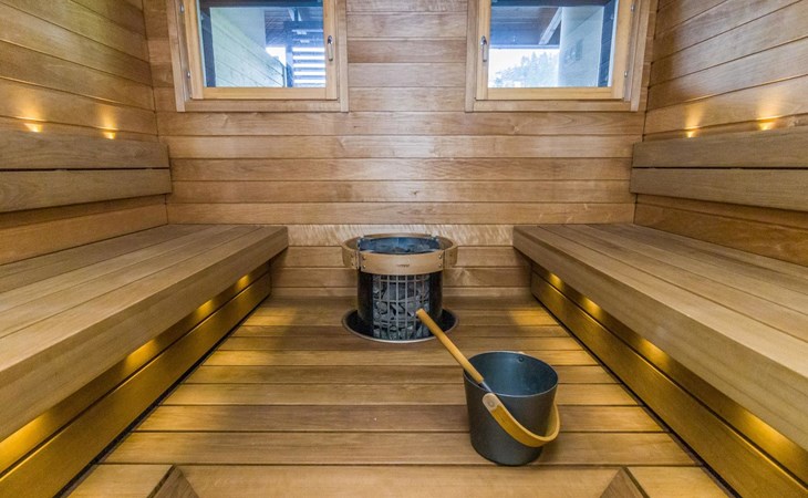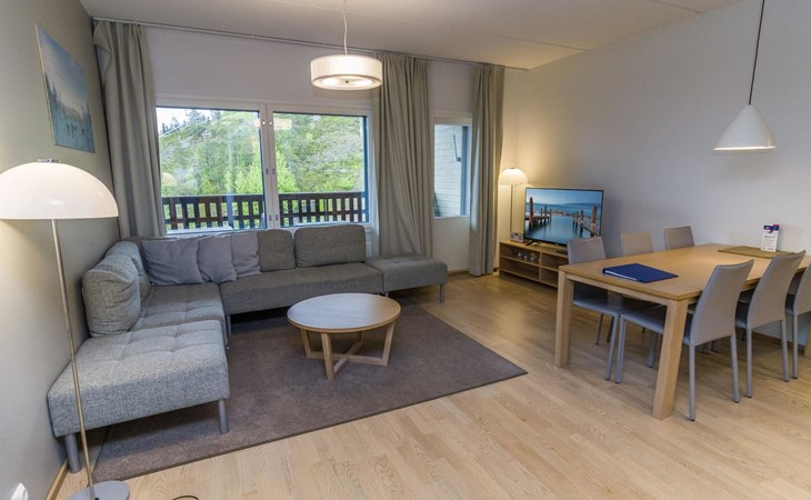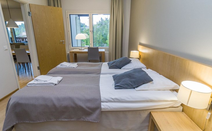 With three bedrooms, the apartment comfortably accommodates a family or group of friends: two bedrooms have two single beds each, and the third has a bunk bed with a 120 cm wide lower bed. The spacious open-plan kitchen and living area are perfect for spending time together, and after a day of adventures, you can unwind in the large electric sauna.