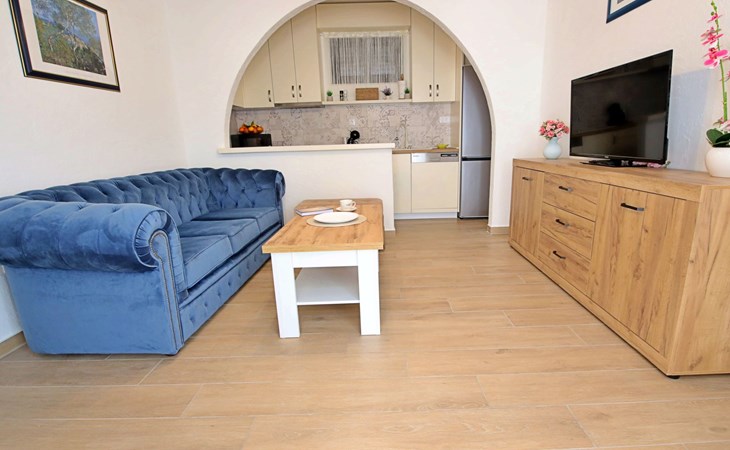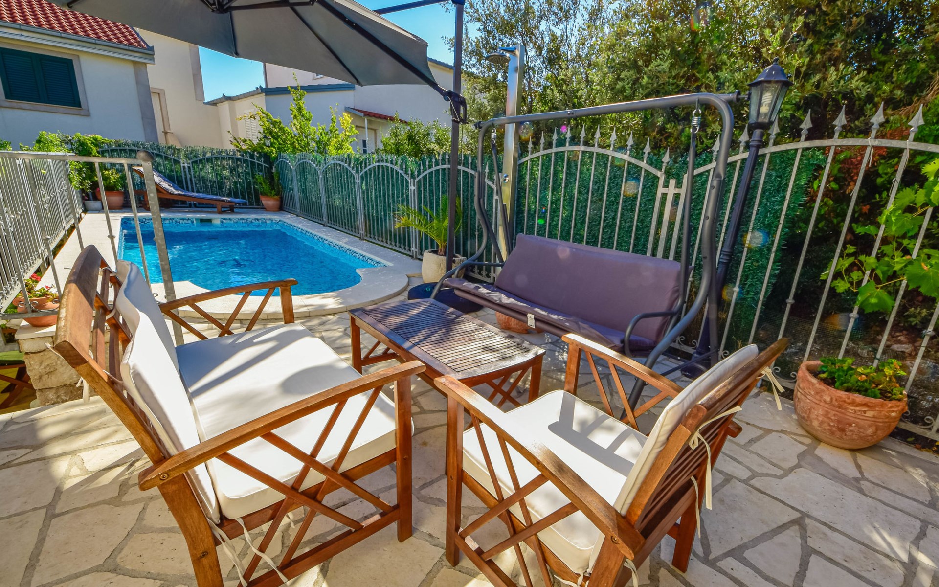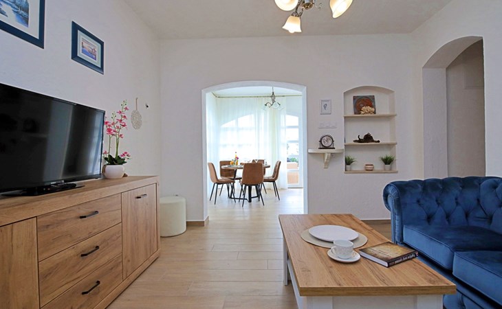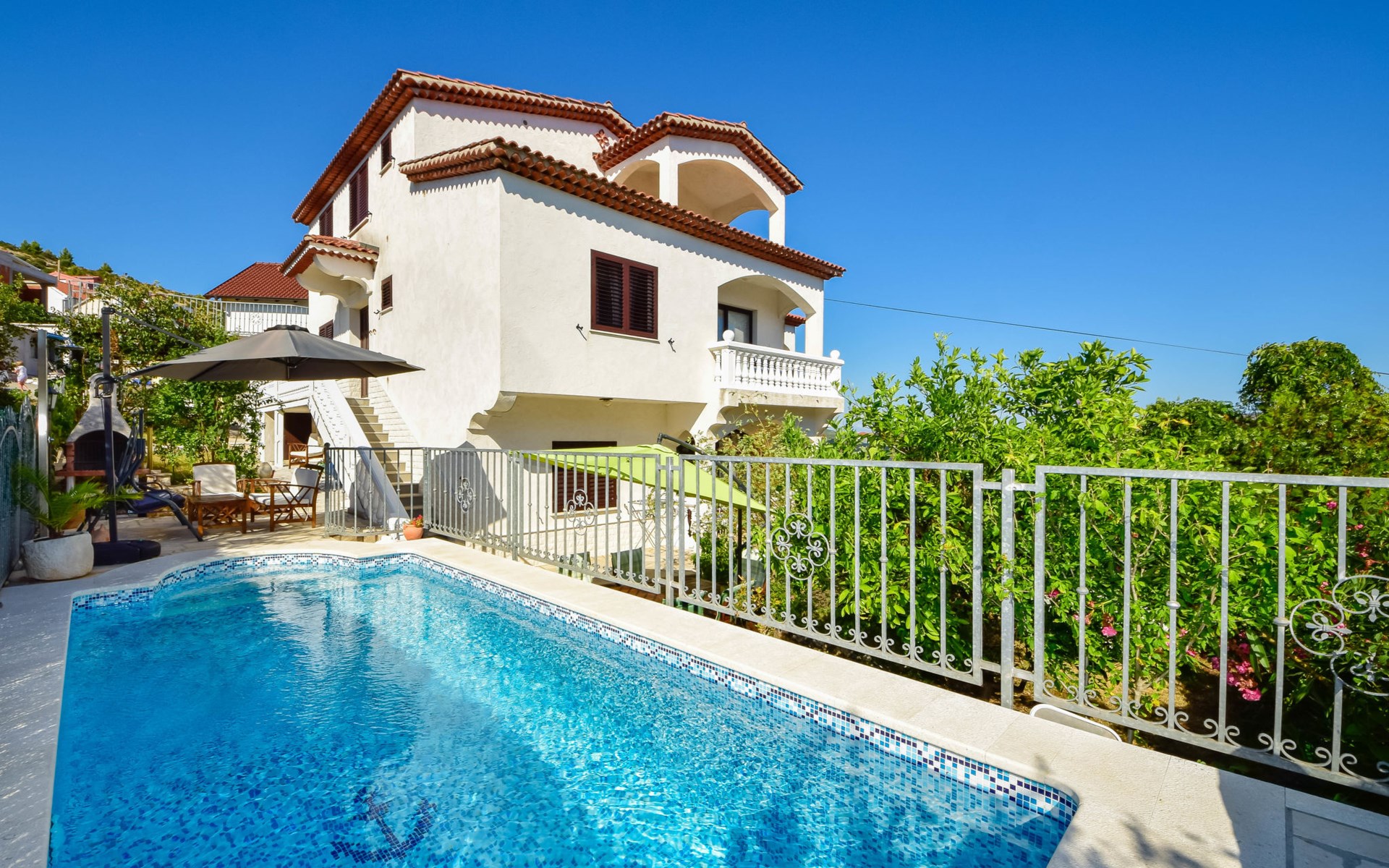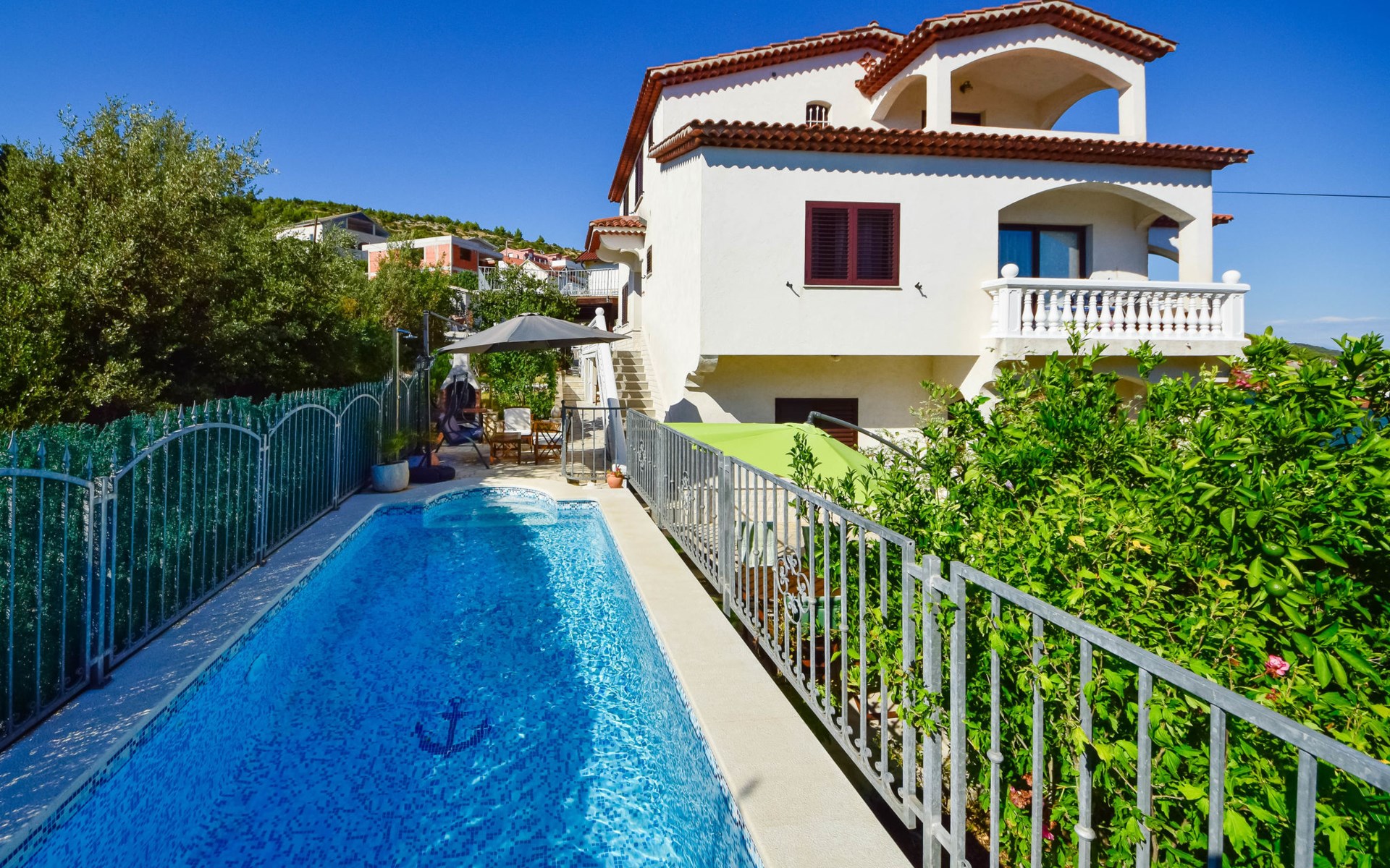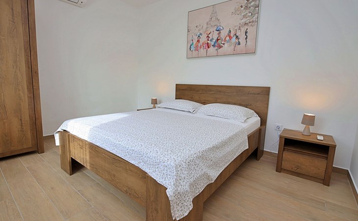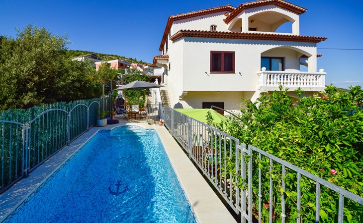 3-family house "Antoine". 700 m from the centre of Marina, in a quiet, sunny, elevated position, 360 m from the sea, 1.2 km from the beach. Private: property 500 m2 (fenced), swimming pool angular (6 x 3 m, depth 150 cm, seasonal availability: 01.Jun. - 01.Oct.) with internal staircase. Outdoor shower, garden furniture, barbecue. In the house: internet access. Parking at the house on the premises. Shop 280 m, restaurant 700 m, bus stop 800 m, pebble beach 1.2 km.