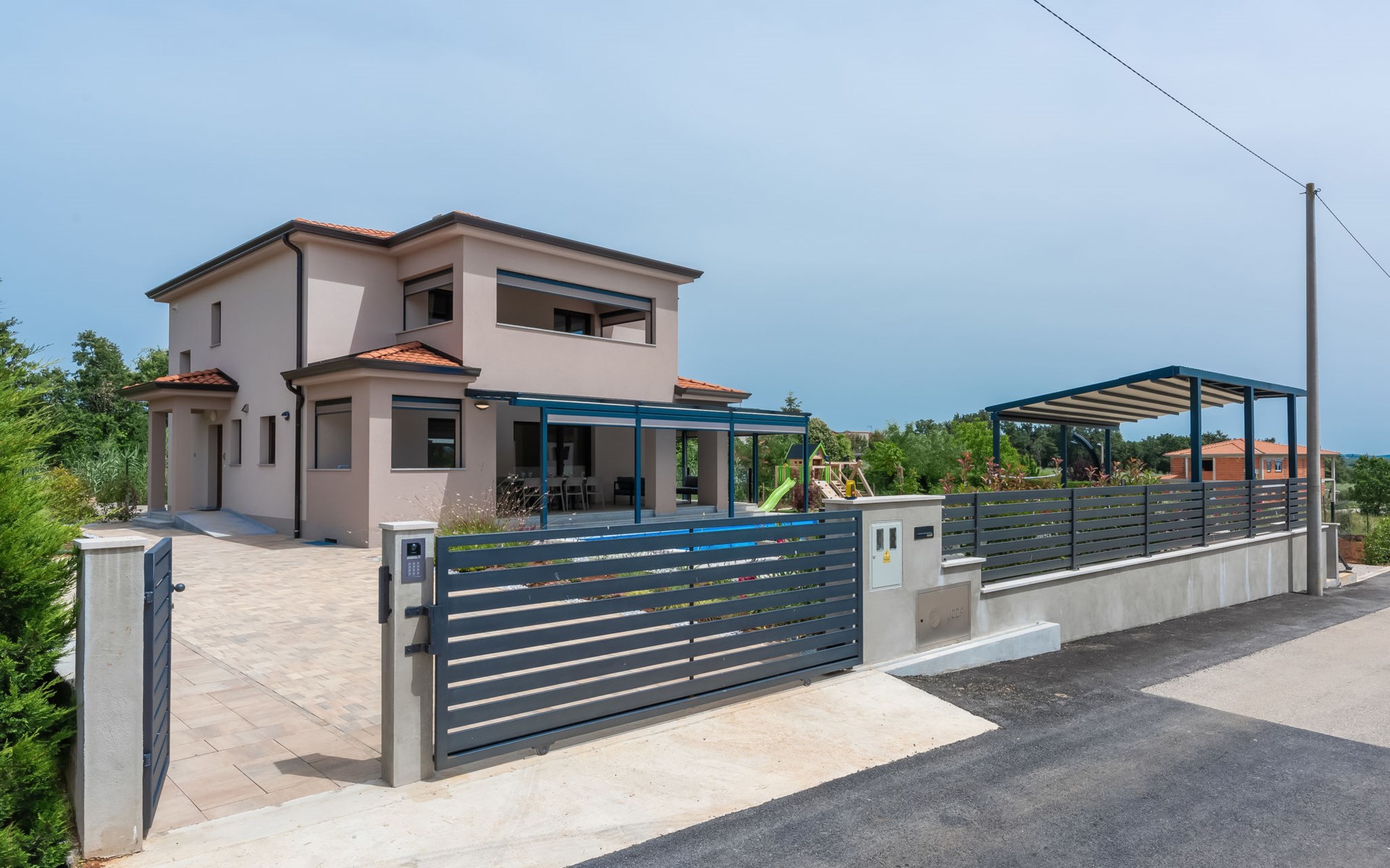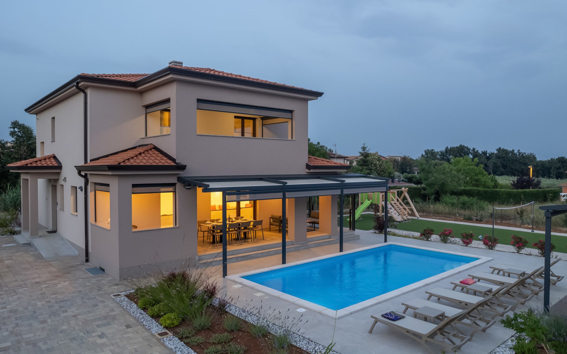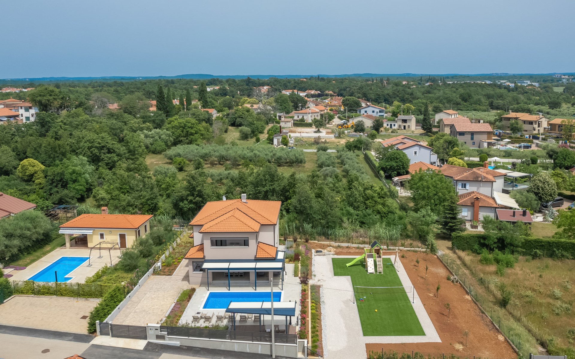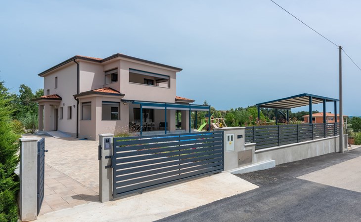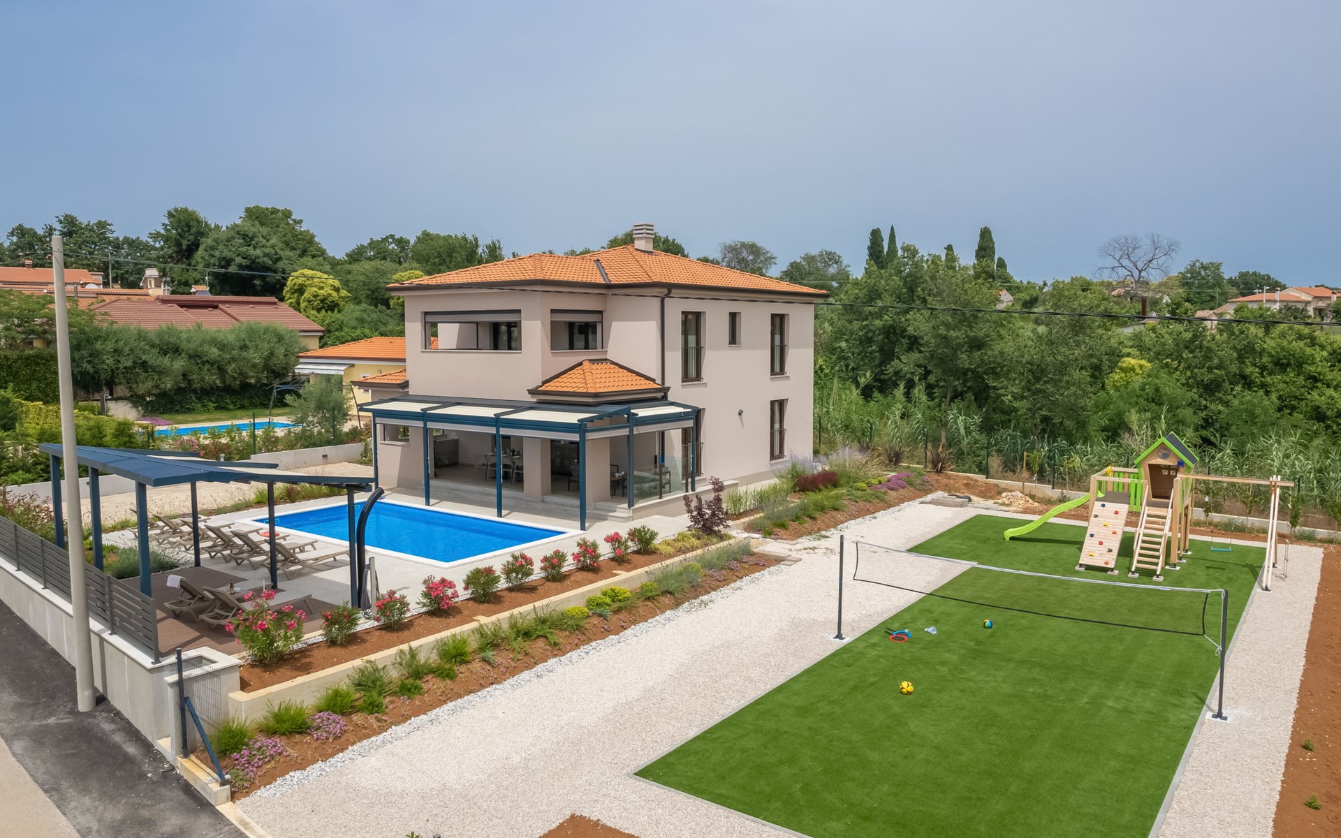 Very beautiful single-family house "Villa Karina", 2 storeys, built in 2022. In the hamlet Kadumi 5.5 km from the centre of Poreč, in a sunny position, 6 km from the sea. Private: property 1'100 m2 (fenced), swimming pool angular, heated (8 x 4 m, depth 150 cm, seasonal availability: 01.May. - 31.Oct.) with internal staircase. Outdoor shower, volleyball, badminton, barbecue, children's playground (slide, swing), pool maintenance by the owner/gardener. In the house: internet access, washing machine. Parking (for 4 cars) at the house on the premises. E-charging station. Shop 3 km, supermarket 3 km, restaurant 500 m, pebble beach 6 km, rocky beach 6 km. Walking paths from the house 100 m, cycle lane 150 m. Nearby attractions: Aquapark 5 km. Please note: suitable for families. The owner does not accept any youth groups. Swimming pool heated (extra). Outdoor kitchen (refrigerator).