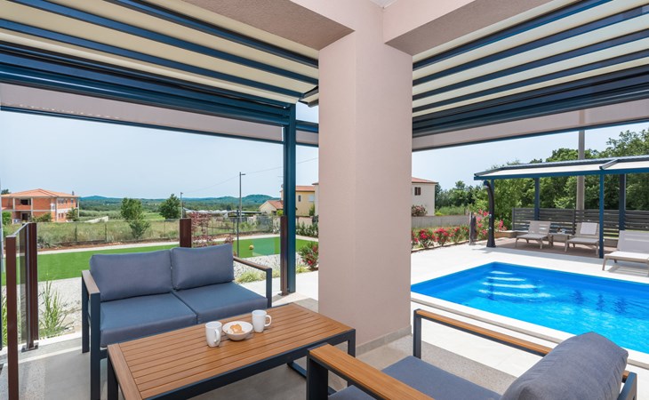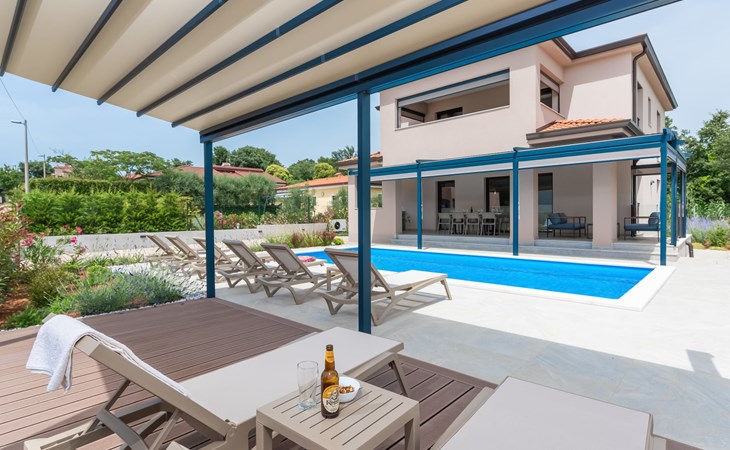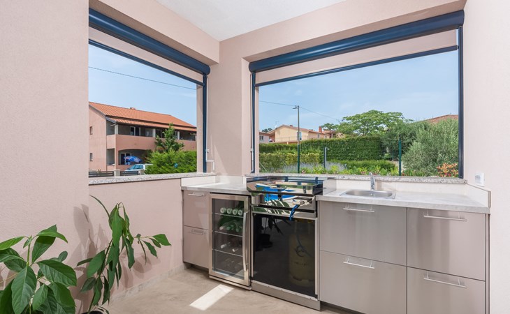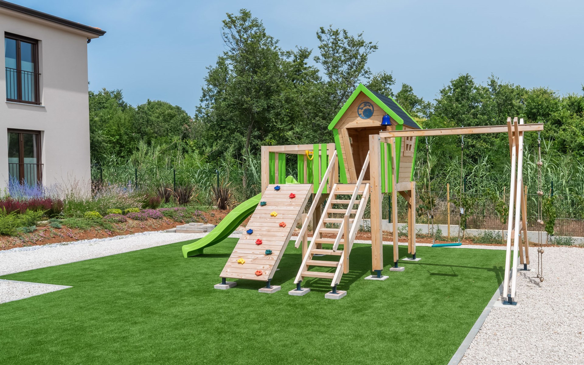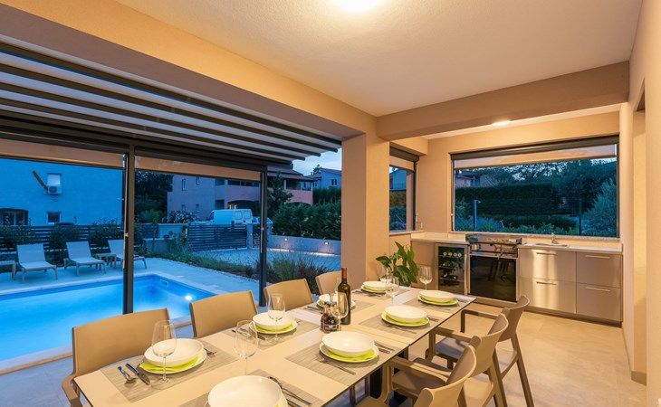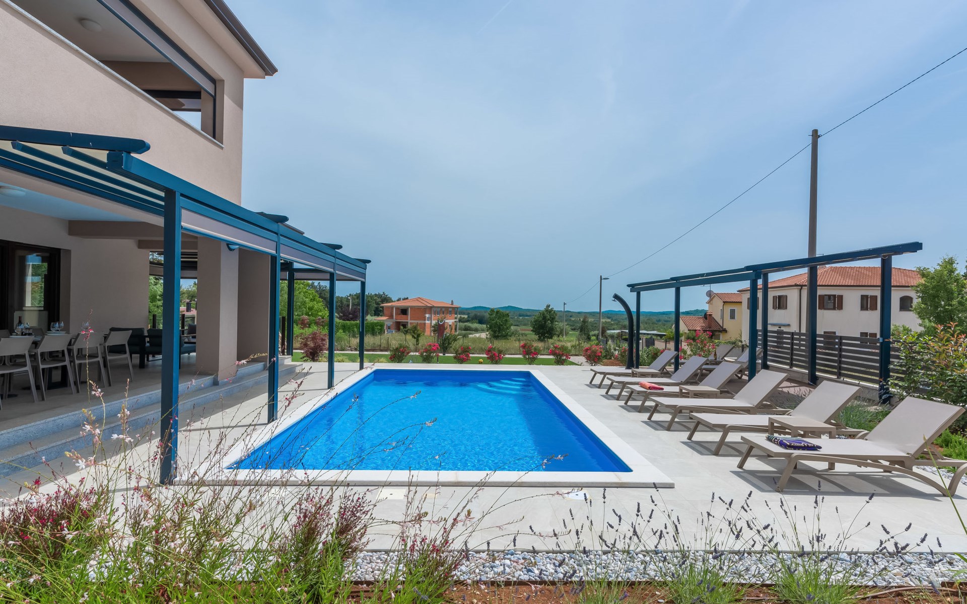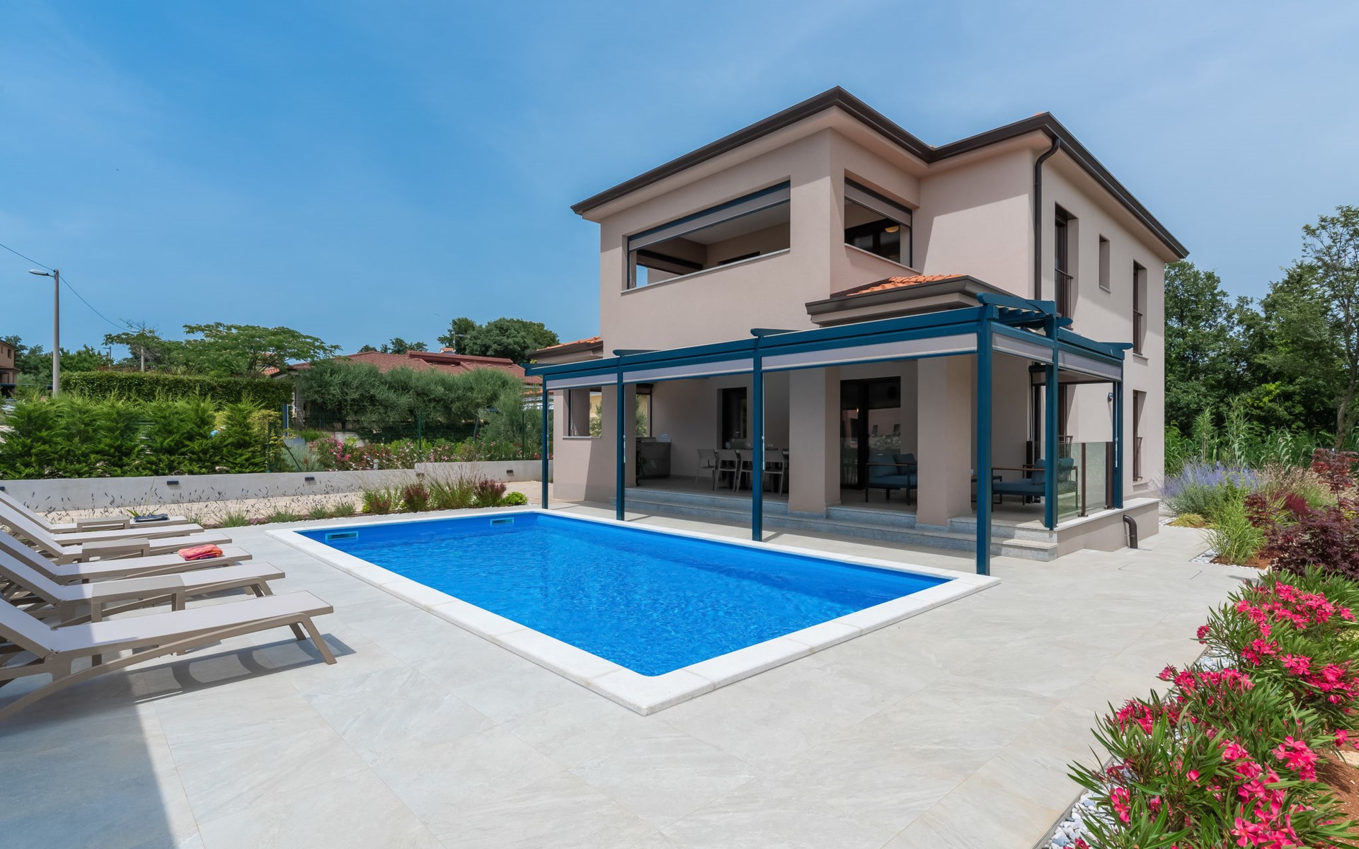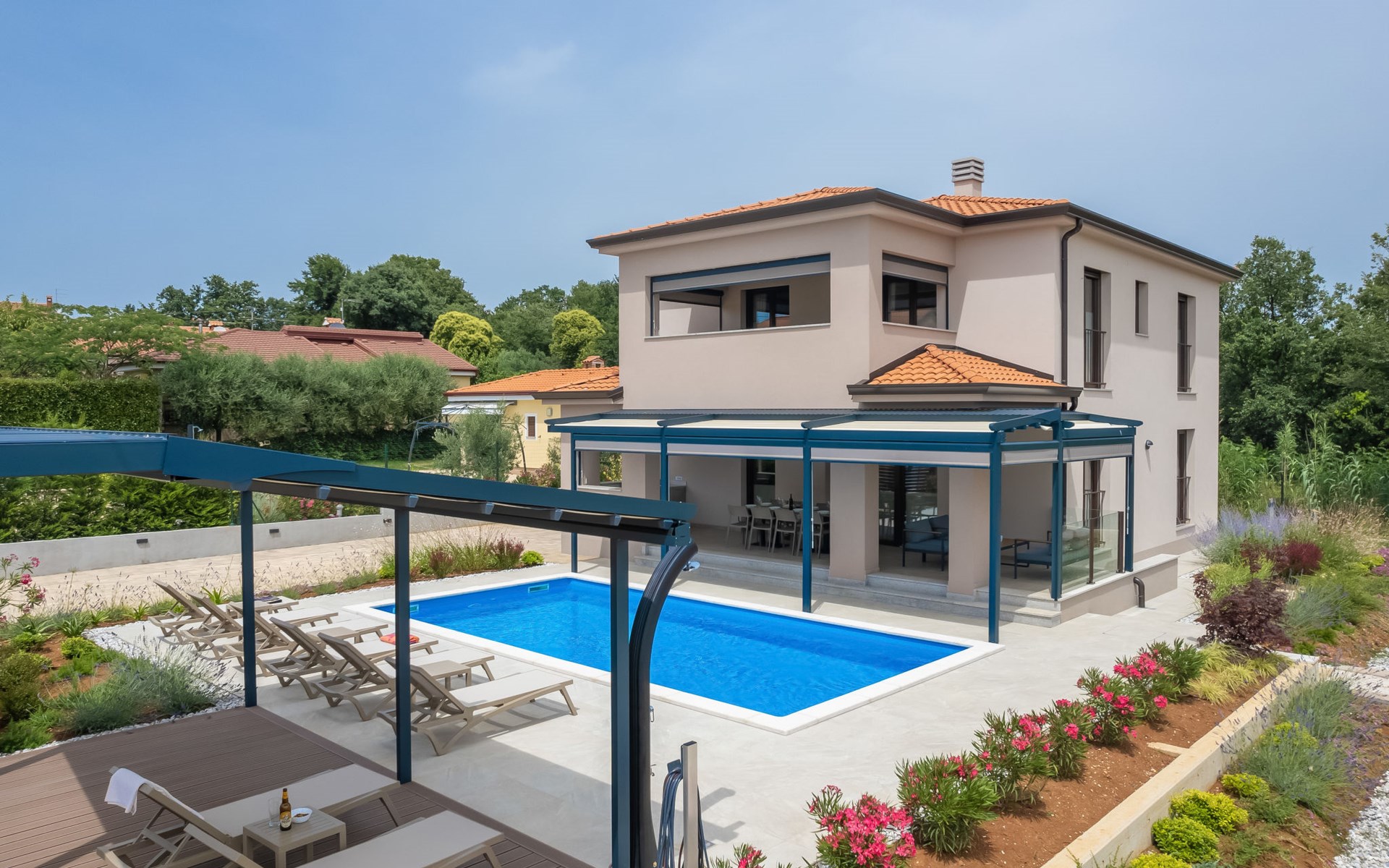 Very beautiful single-family house "Villa Karina", 2 storeys, built in 2022. In the hamlet Kadumi 5.5 km from the centre of Poreč, in a sunny position, 6 km from the sea. Private: property 1'100 m2 (fenced), swimming pool angular, heated (8 x 4 m, depth 150 cm, seasonal availability: 01.May. - 31.Oct.) with internal staircase. Outdoor shower, volleyball, badminton, barbecue, children's playground (slide, swing), pool maintenance by the owner/gardener. In the house: internet access, washing machine. Parking (for 4 cars) at the house on the premises. E-charging station. Shop 3 km, supermarket 3 km, restaurant 500 m, pebble beach 6 km, rocky beach 6 km. Walking paths from the house 100 m, cycle lane 150 m. Nearby attractions: Aquapark 5 km. Please note: suitable for families. The owner does not accept any youth groups. Swimming pool heated (extra). Outdoor kitchen (refrigerator).