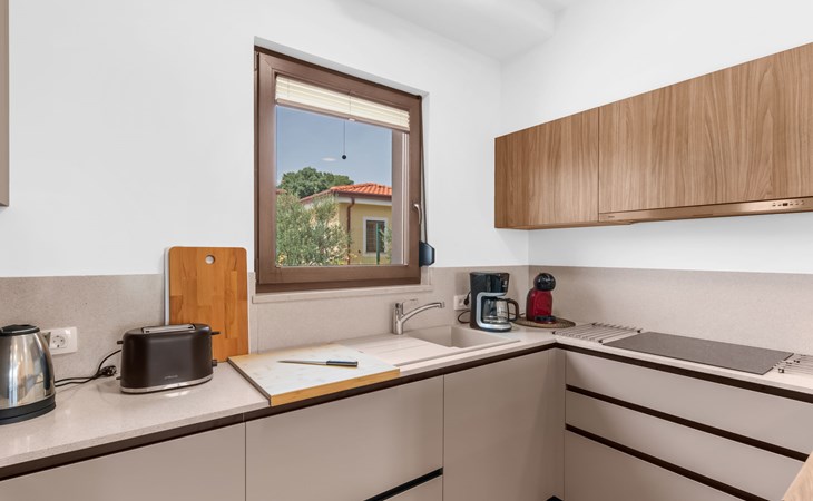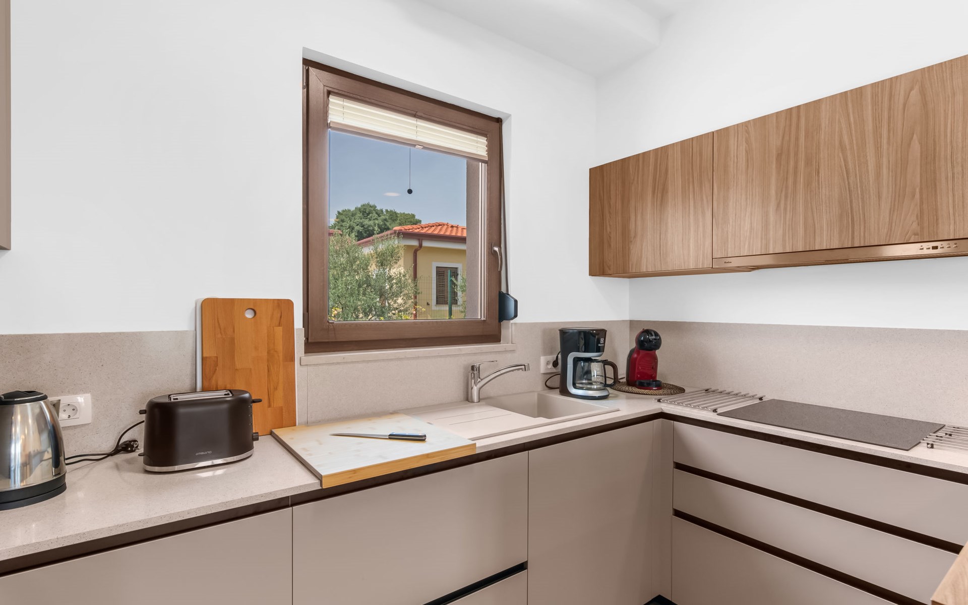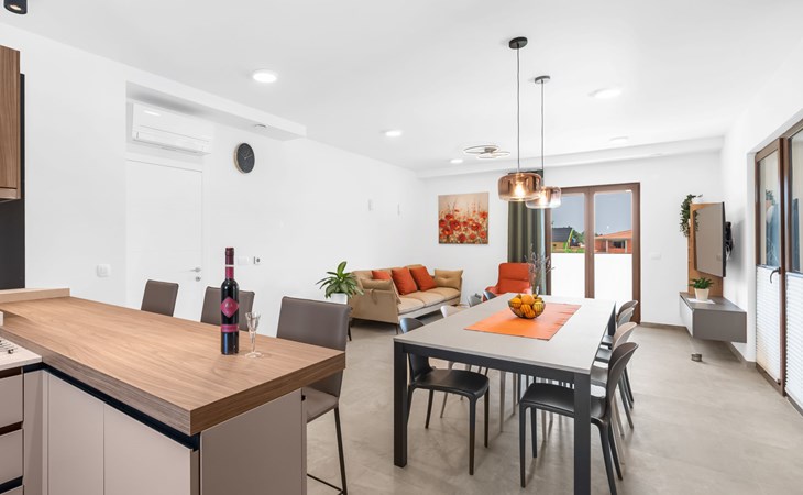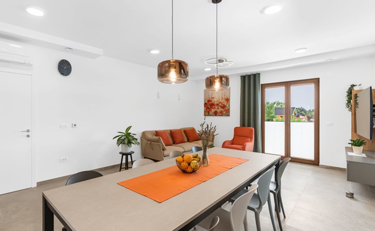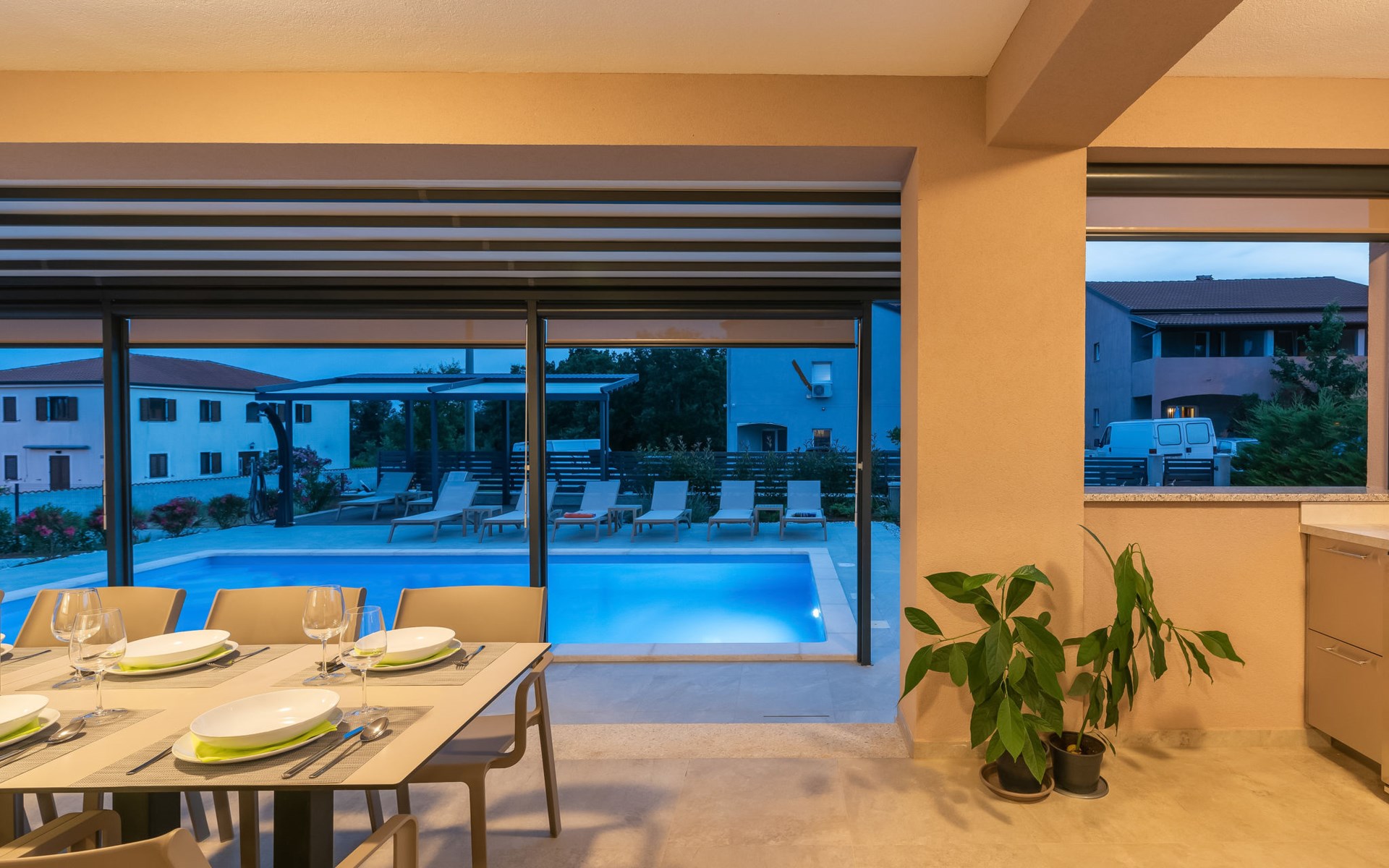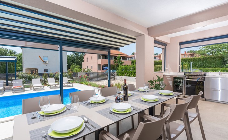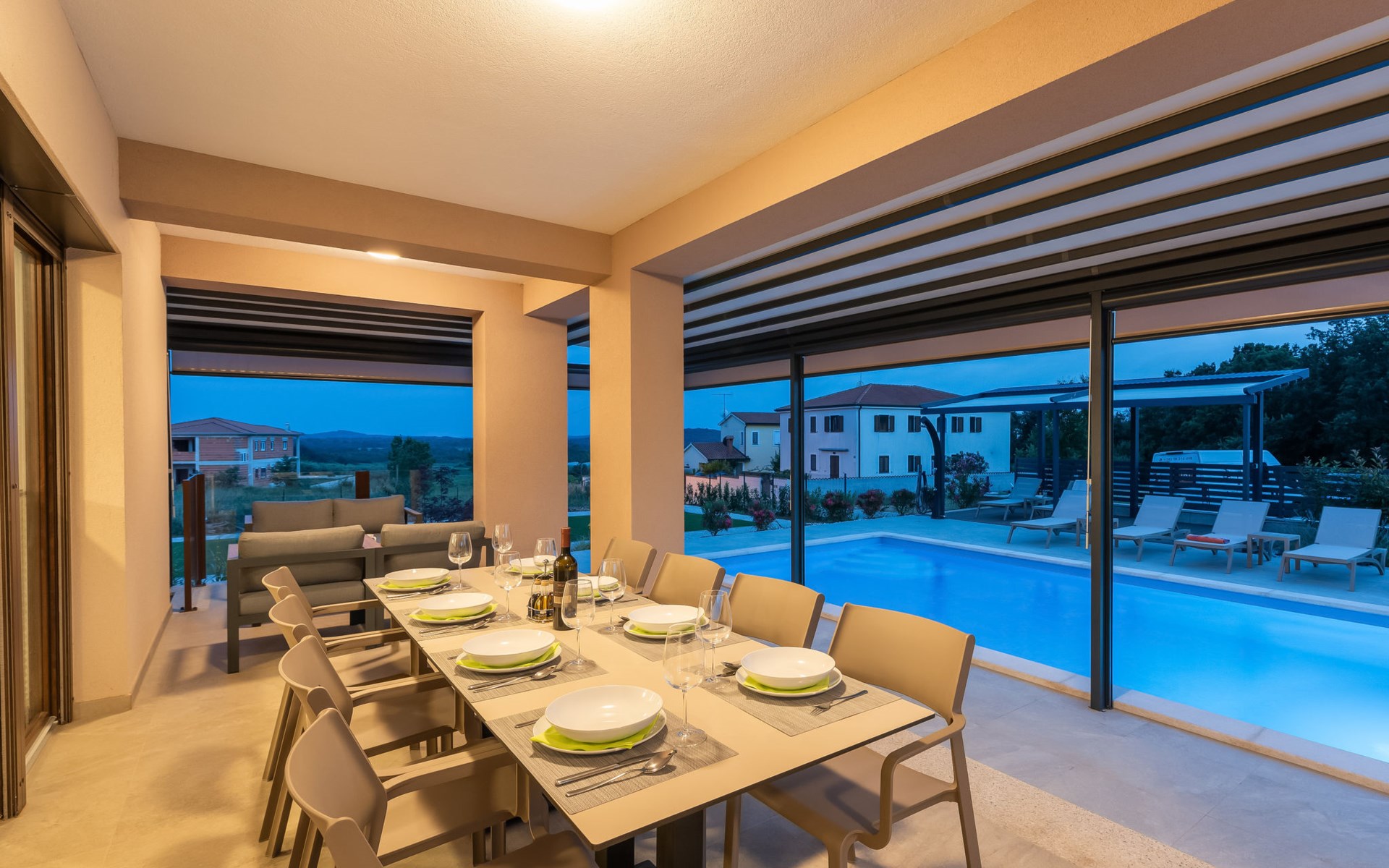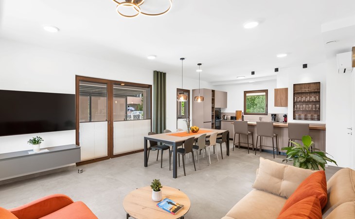 Very beautiful single-family house "Villa Karina", 2 storeys, built in 2022. In the hamlet Kadumi 5.5 km from the centre of Poreč, in a sunny position, 6 km from the sea. Private: property 1'100 m2 (fenced), swimming pool angular, heated (8 x 4 m, depth 150 cm, seasonal availability: 01.May. - 31.Oct.) with internal staircase. Outdoor shower, volleyball, badminton, barbecue, children's playground (slide, swing), pool maintenance by the owner/gardener. In the house: internet access, washing machine. Parking (for 4 cars) at the house on the premises. E-charging station. Shop 3 km, supermarket 3 km, restaurant 500 m, pebble beach 6 km, rocky beach 6 km. Walking paths from the house 100 m, cycle lane 150 m. Nearby attractions: Aquapark 5 km. Please note: suitable for families. The owner does not accept any youth groups. Swimming pool heated (extra). Outdoor kitchen (refrigerator).