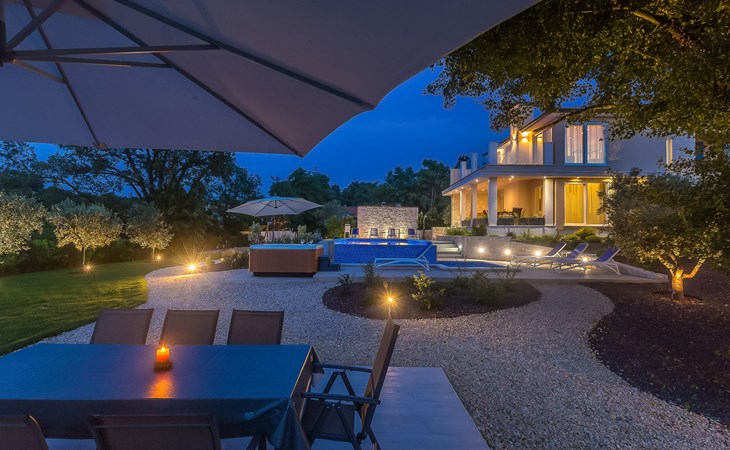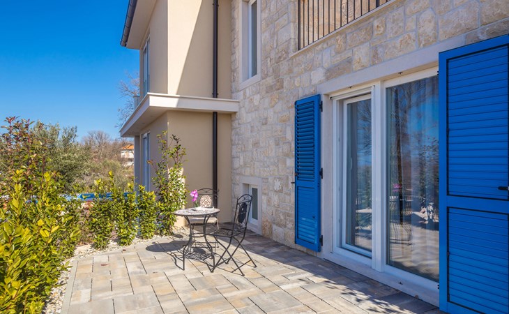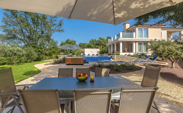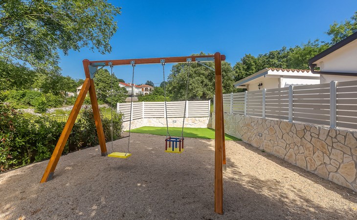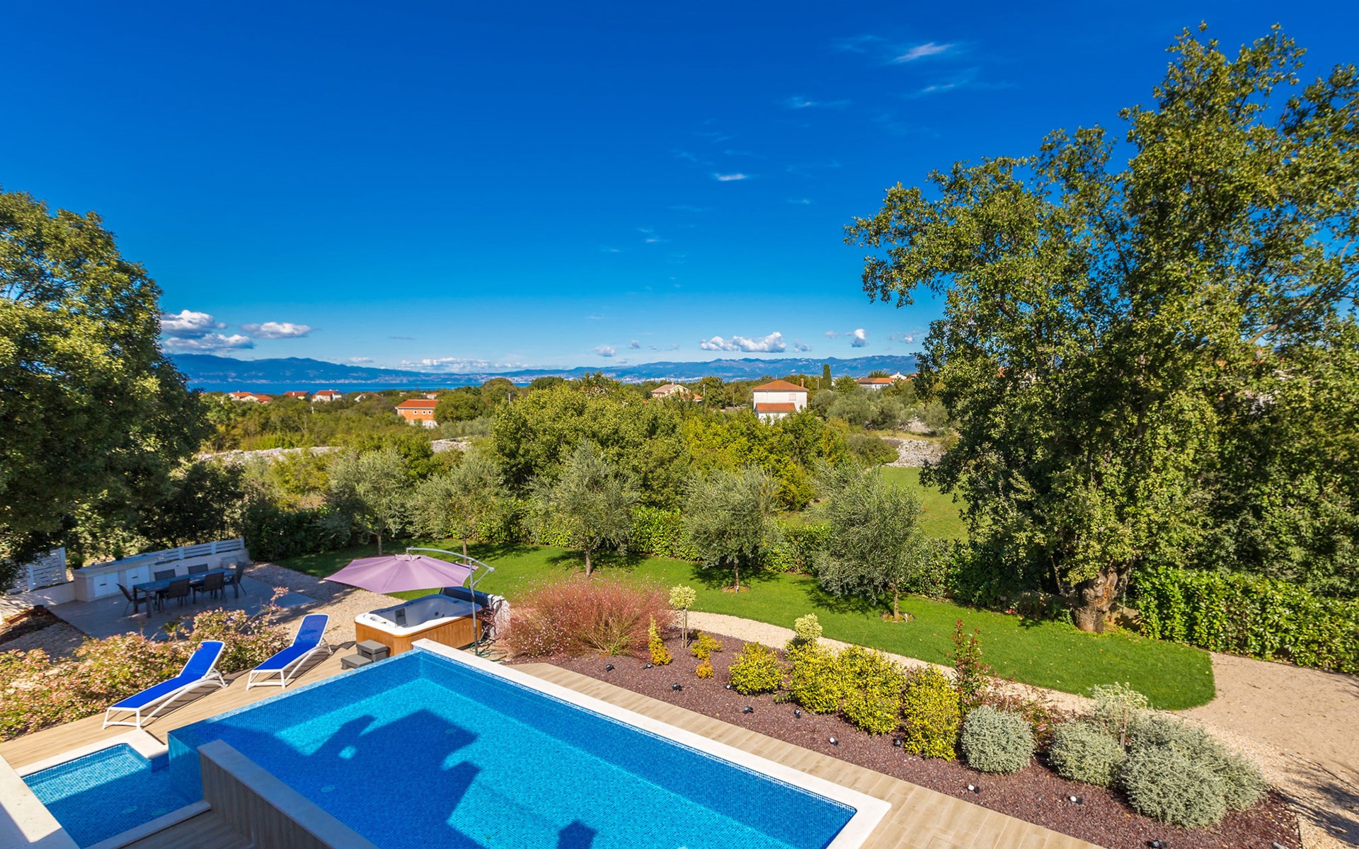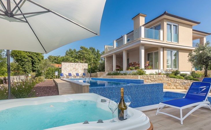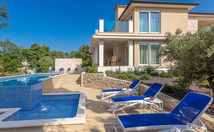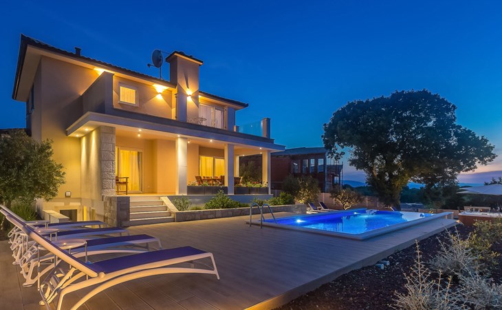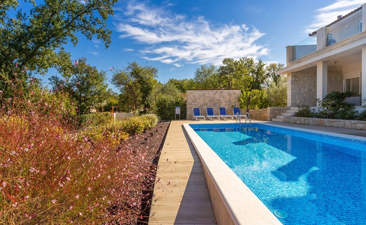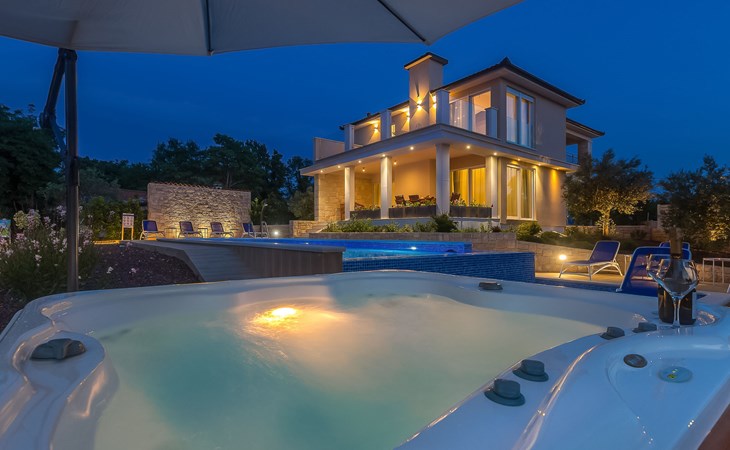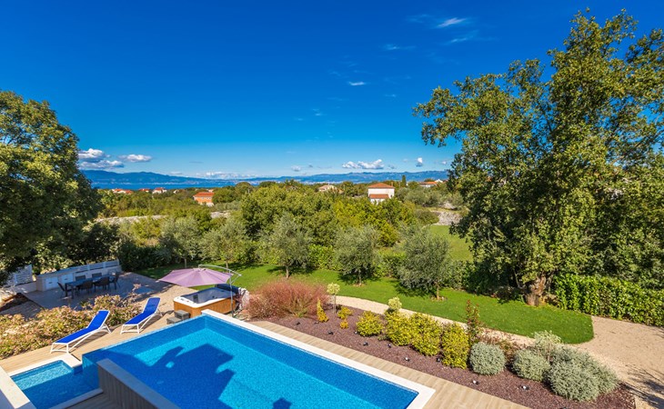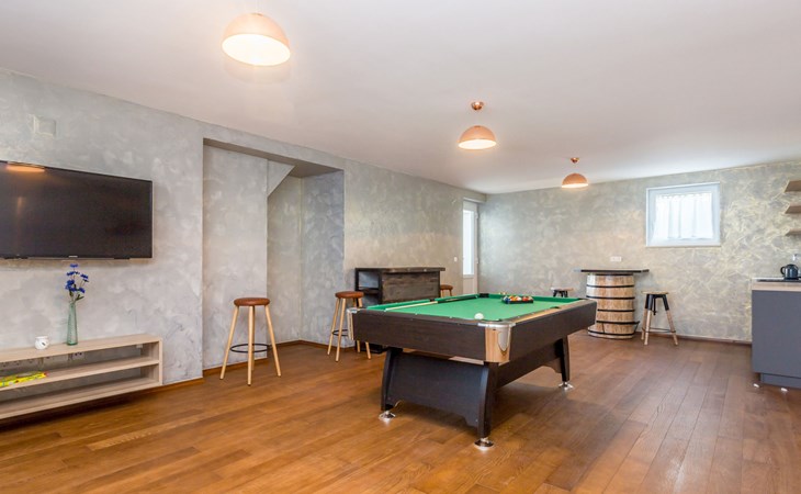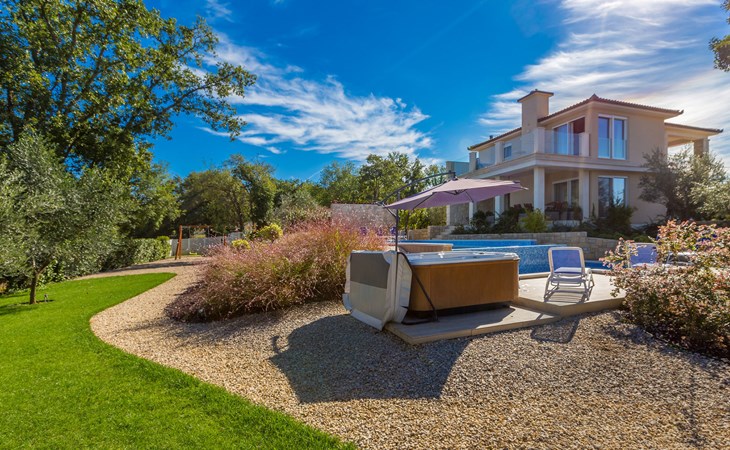 Beautiful villa "Roko", 3 storeys. In the hamlet Ljutići 2.5 km from the centre of Malinska, in a quiet, sunny position, 2.5 km from the sea, 2.5 km from the beach, in the countryside. Private: property 1'200 m2, swimming pool angular (10 x 3 m, depth 150 cm, seasonal availability: 01.May. - 31.Oct.). Paddling pool, outdoor shower, hot tub, terrace (100 m2). In the house: internet access, sauna, relaxation room, billiard table, washing machine, tumble dryer. Parking (for 4 cars) at the house on the premises. Shop 2 km, supermarket 4 km, restaurant 2 km, bus stop 1.3 km, pebble beach 2.5 km, public bathing area 2.5 km, concrete beach 2.5 km. Groups of teenagers on request only. By groups of young people double deposit is requested on arrival.