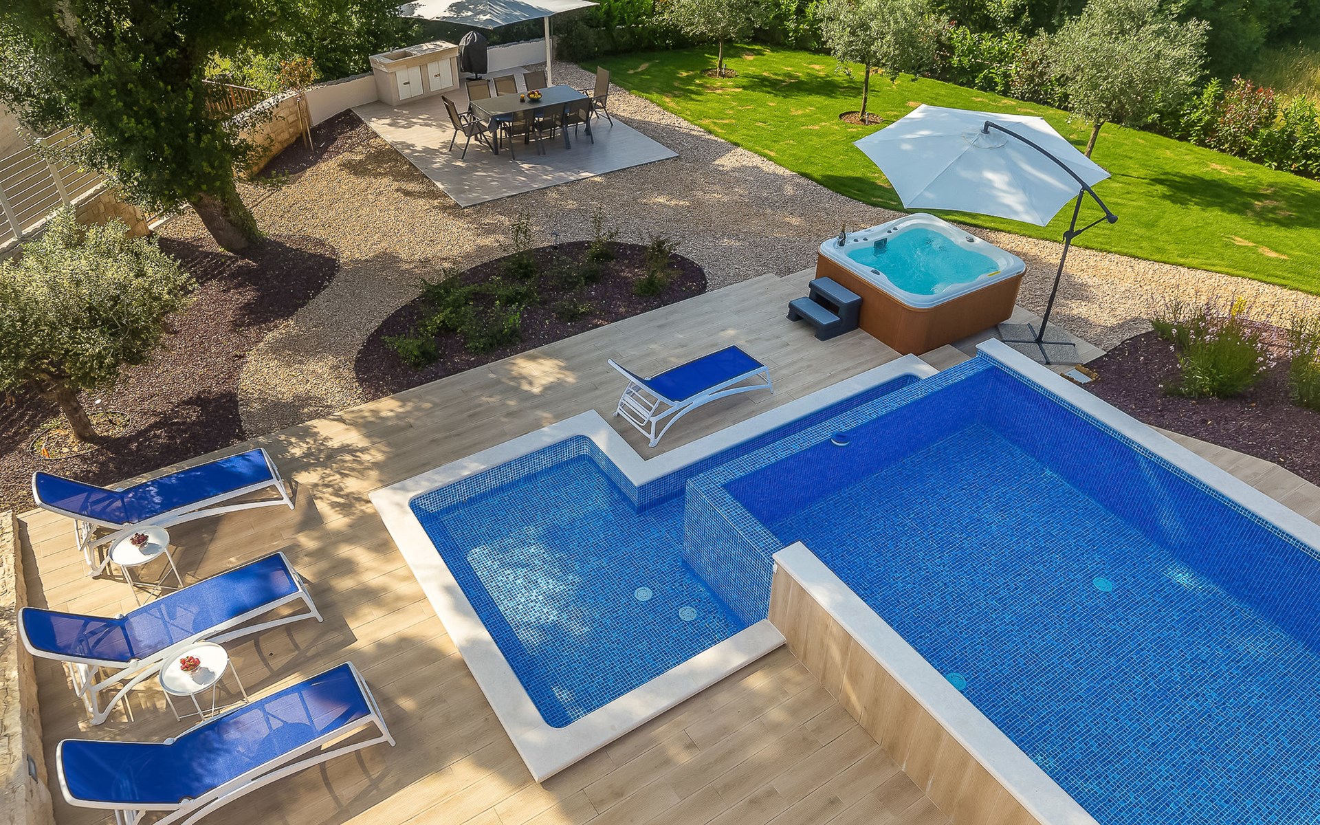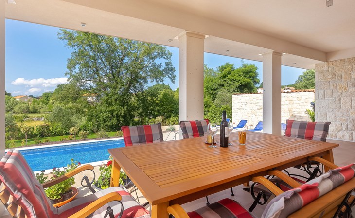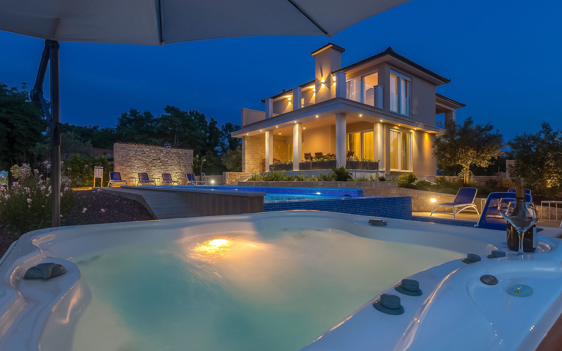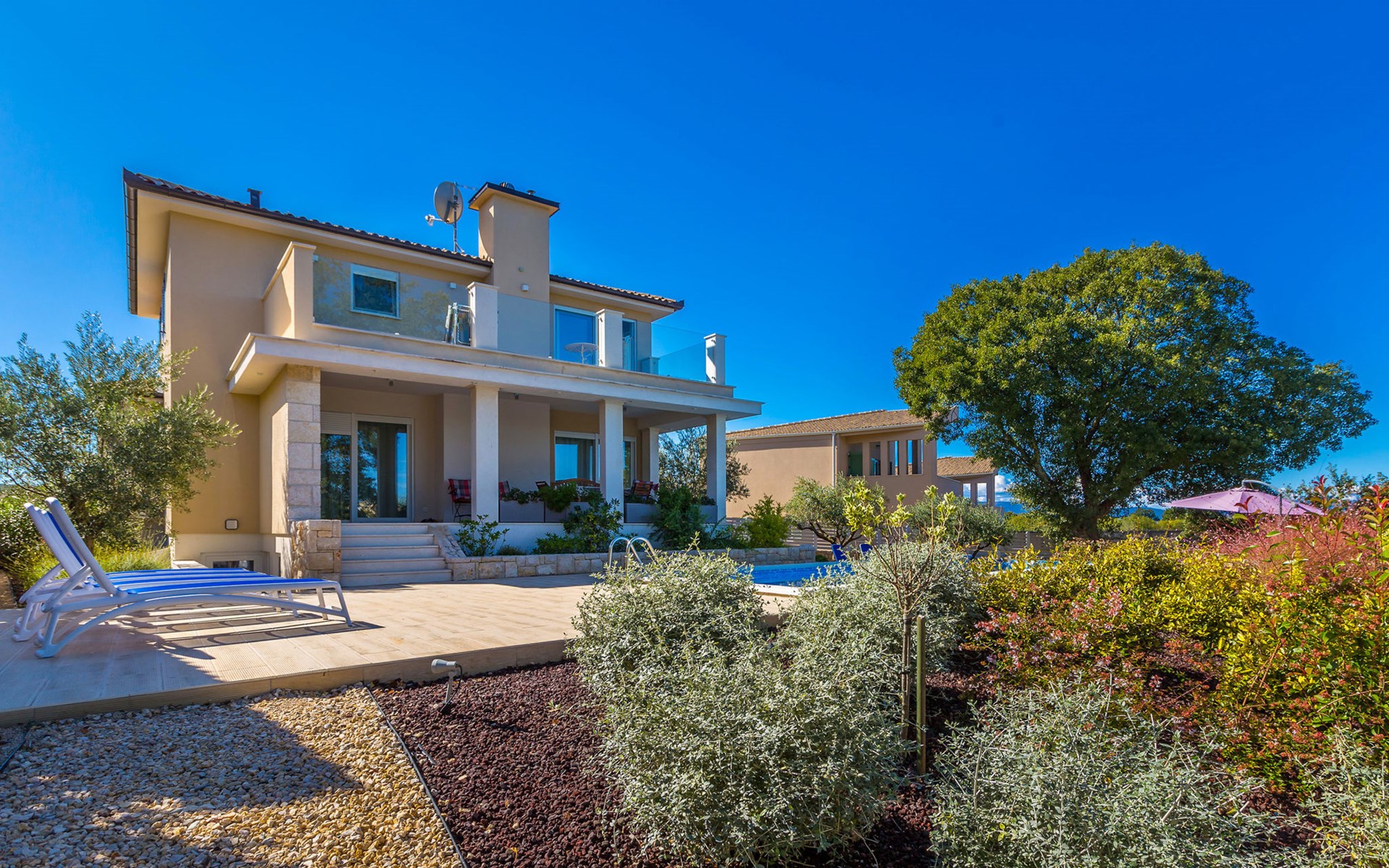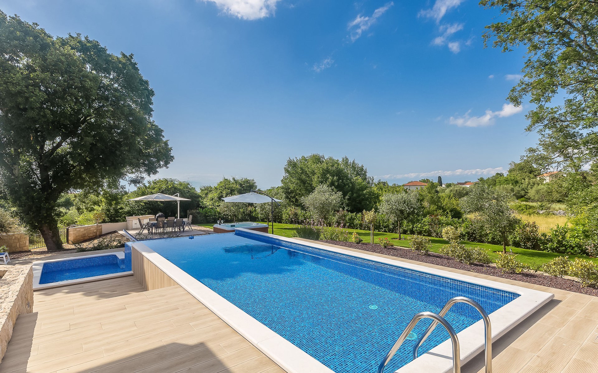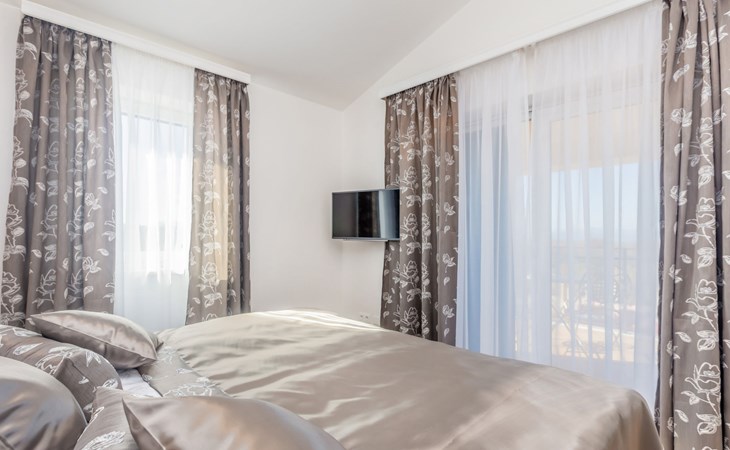 Beautiful villa "Roko", 3 storeys. In the hamlet Ljutići 2.5 km from the centre of Malinska, in a quiet, sunny position, 2.5 km from the sea, 2.5 km from the beach, in the countryside. Private: property 1'200 m2, swimming pool angular (10 x 3 m, depth 150 cm, seasonal availability: 01.May. - 31.Oct.). Paddling pool, outdoor shower, hot tub, terrace (100 m2). In the house: internet access, sauna, relaxation room, billiard table, washing machine, tumble dryer. Parking (for 4 cars) at the house on the premises. Shop 2 km, supermarket 4 km, restaurant 2 km, bus stop 1.3 km, pebble beach 2.5 km, public bathing area 2.5 km, concrete beach 2.5 km. Groups of teenagers on request only. By groups of young people double deposit is requested on arrival.