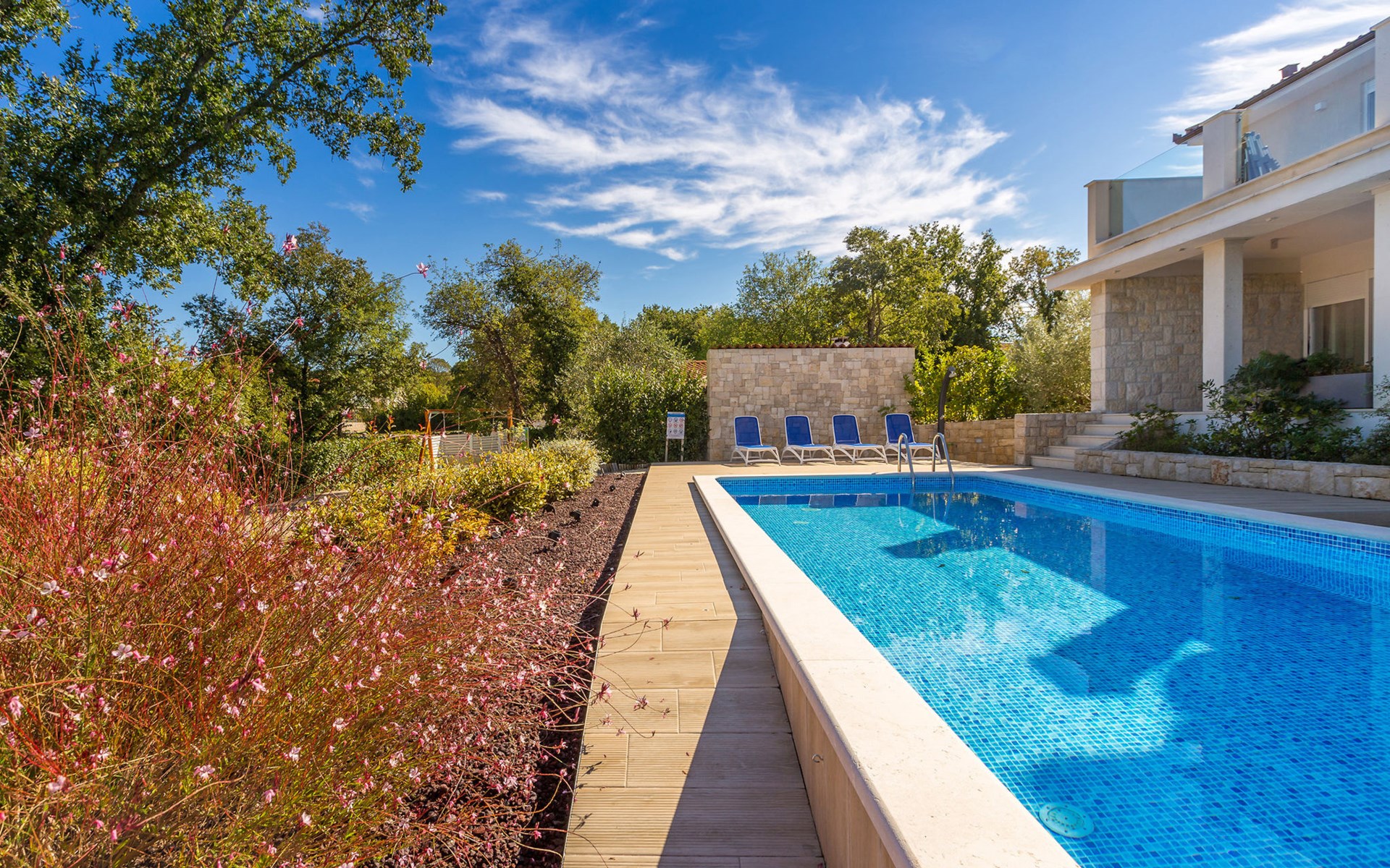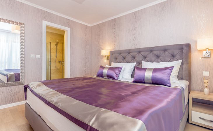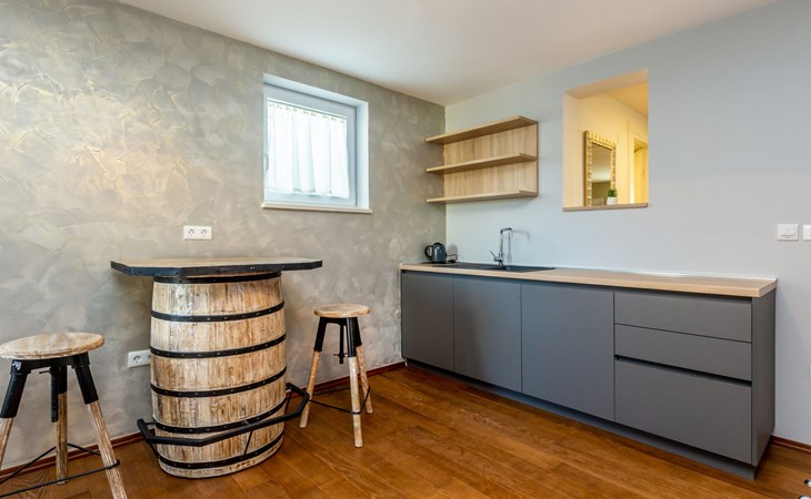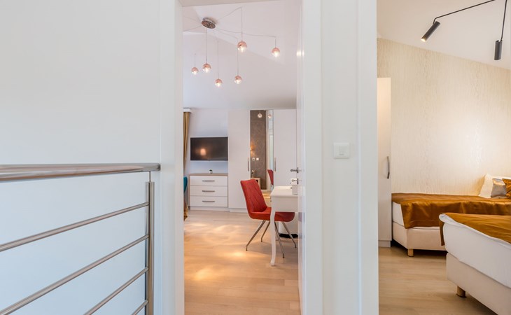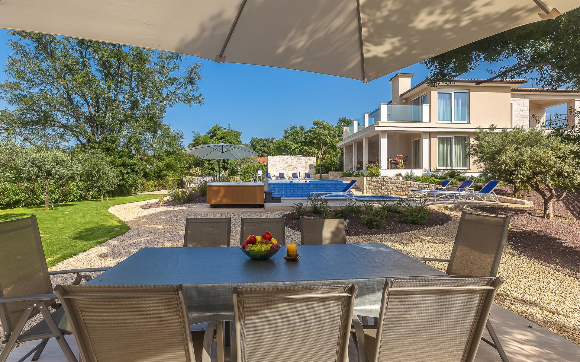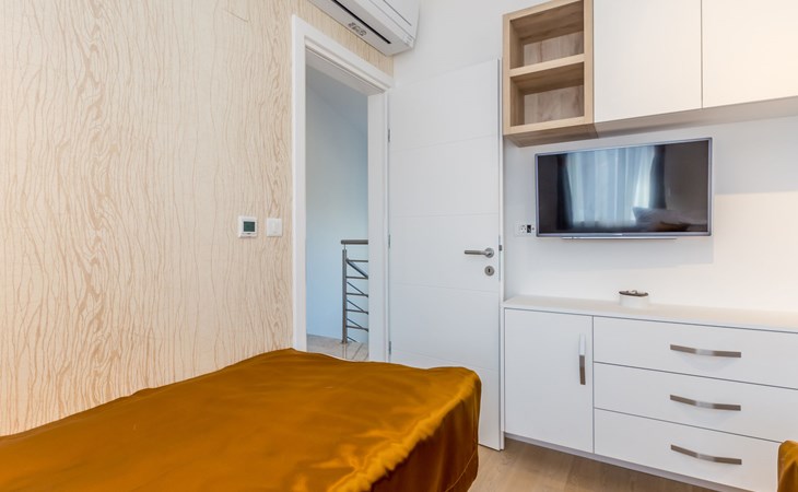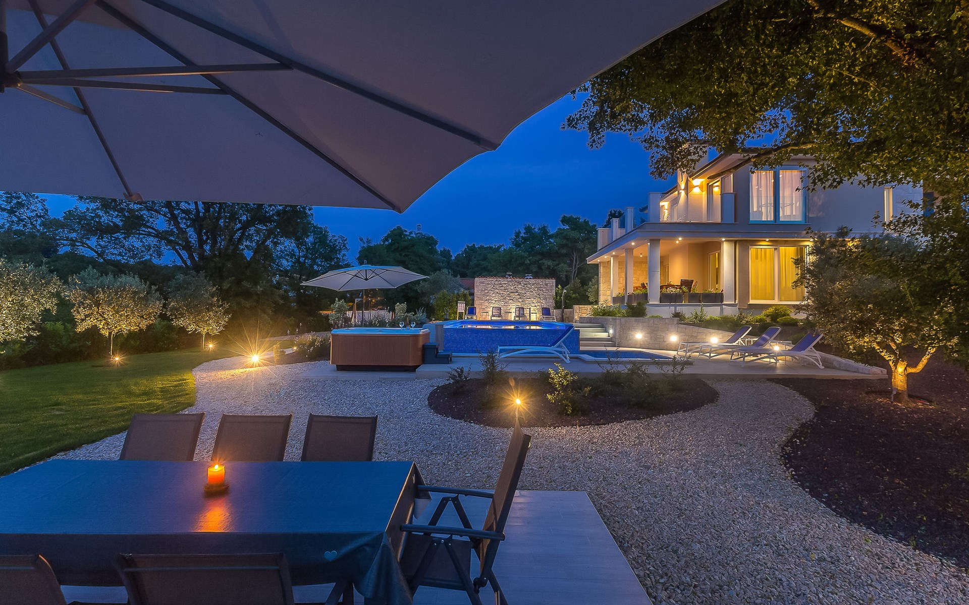 Beautiful villa "Roko", 3 storeys. In the hamlet Ljutići 2.5 km from the centre of Malinska, in a quiet, sunny position, 2.5 km from the sea, 2.5 km from the beach, in the countryside. Private: property 1'200 m2, swimming pool angular (10 x 3 m, depth 150 cm, seasonal availability: 01.May. - 31.Oct.). Paddling pool, outdoor shower, hot tub, terrace (100 m2). In the house: internet access, sauna, relaxation room, billiard table, washing machine, tumble dryer. Parking (for 4 cars) at the house on the premises. Shop 2 km, supermarket 4 km, restaurant 2 km, bus stop 1.3 km, pebble beach 2.5 km, public bathing area 2.5 km, concrete beach 2.5 km. Groups of teenagers on request only. By groups of young people double deposit is requested on arrival.