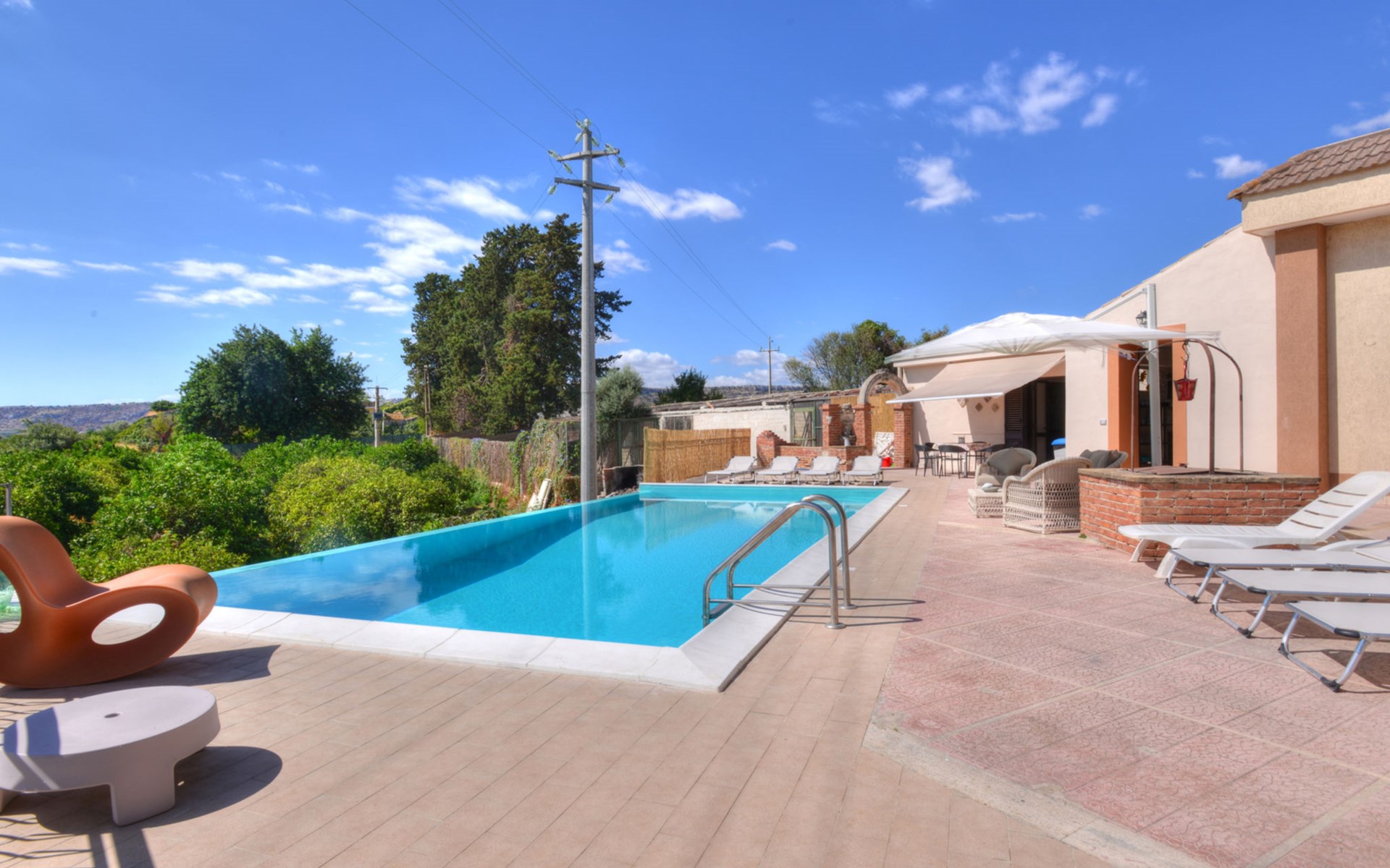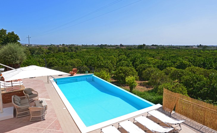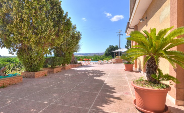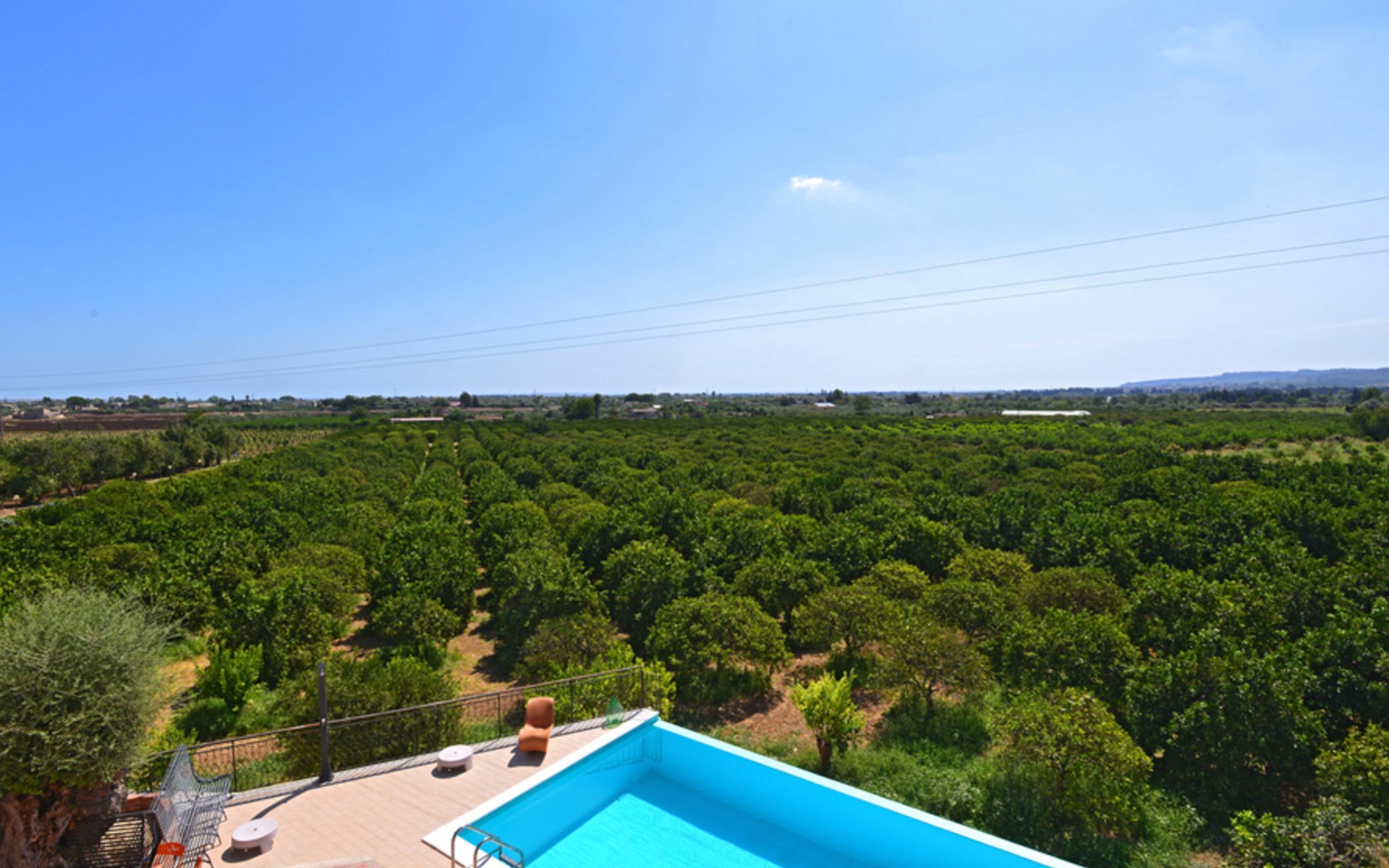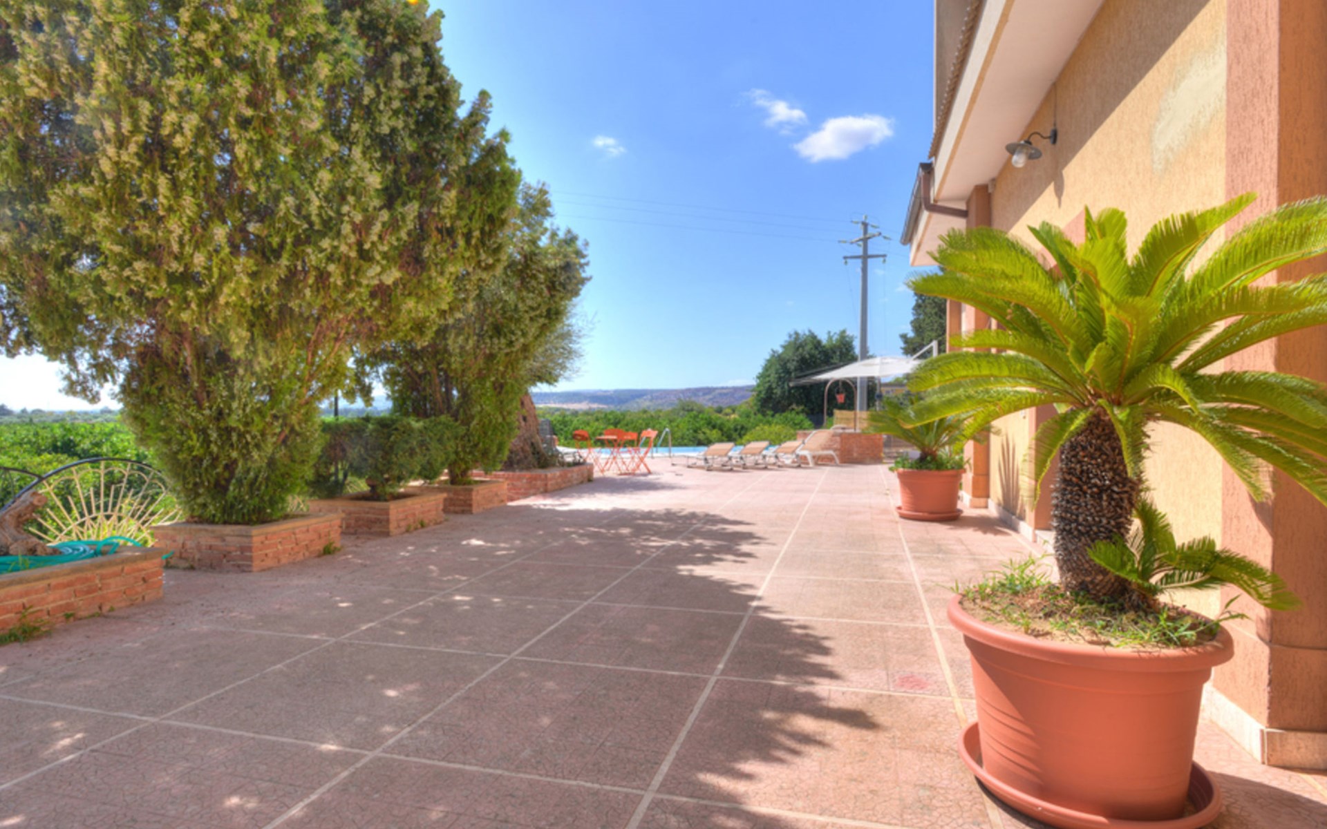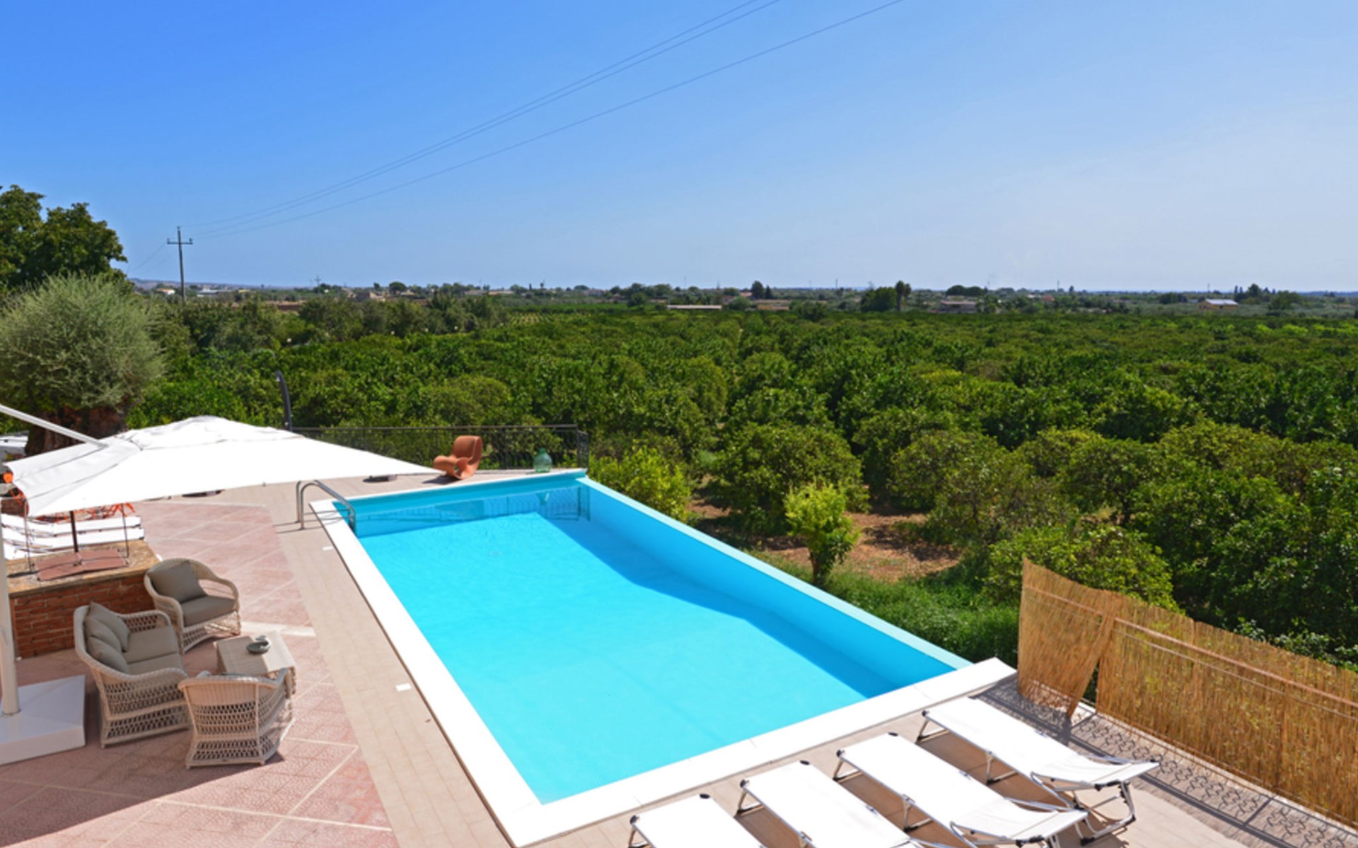 Villa "Smeraldo", surrounded by trees. 16 km from the centre of Siracusa, 4 km from the centre of Floridia, in a secluded, sunny position, 18 km from the sea. Private: property 500 m2, swimming pool (11 x 5 m, depth 140 - 200 cm, seasonal availability: 13.Jun. - 03.Oct.). Outdoor shower, pool maintenance by the owner/gardener. Stepped path to the house. Parking (for 3 cars) on the premises. Grocery 4 km, supermarket 5 km, restaurant 4 km, bar 4 km, bus stop "Floridia" 4 km, sandy beach "Fontane Bianche" 15 km. Nearby attractions: Necropoli di Pantalica 32 km, Noto 34 km, Riserva Naturale Faunistica Vendicari 40 km, Modica 68 km, Ragusa 70 km, Catania 70 km. Please note: car recommended. Animals in the neighbourhood. The property has a citrus grove, workers will occasionally be present for maintenance. The owner will be on the property daily to look after the animals in an enclosure.