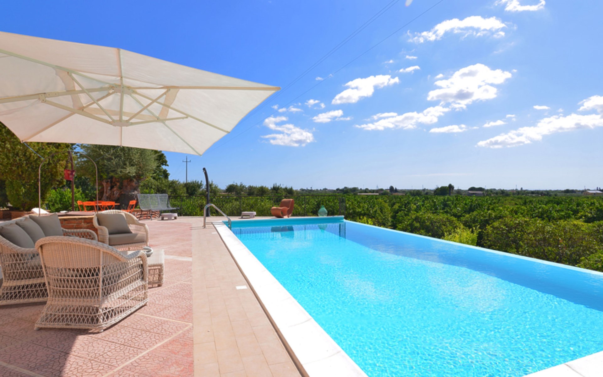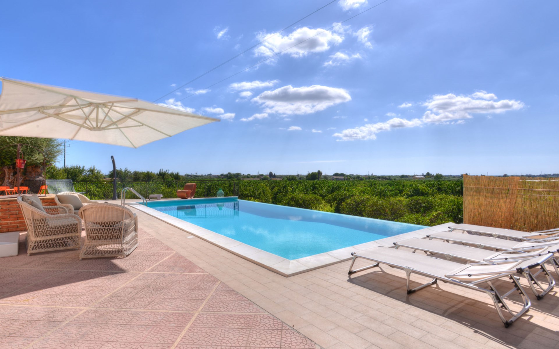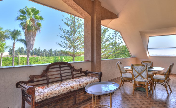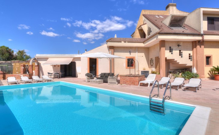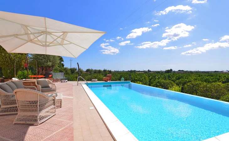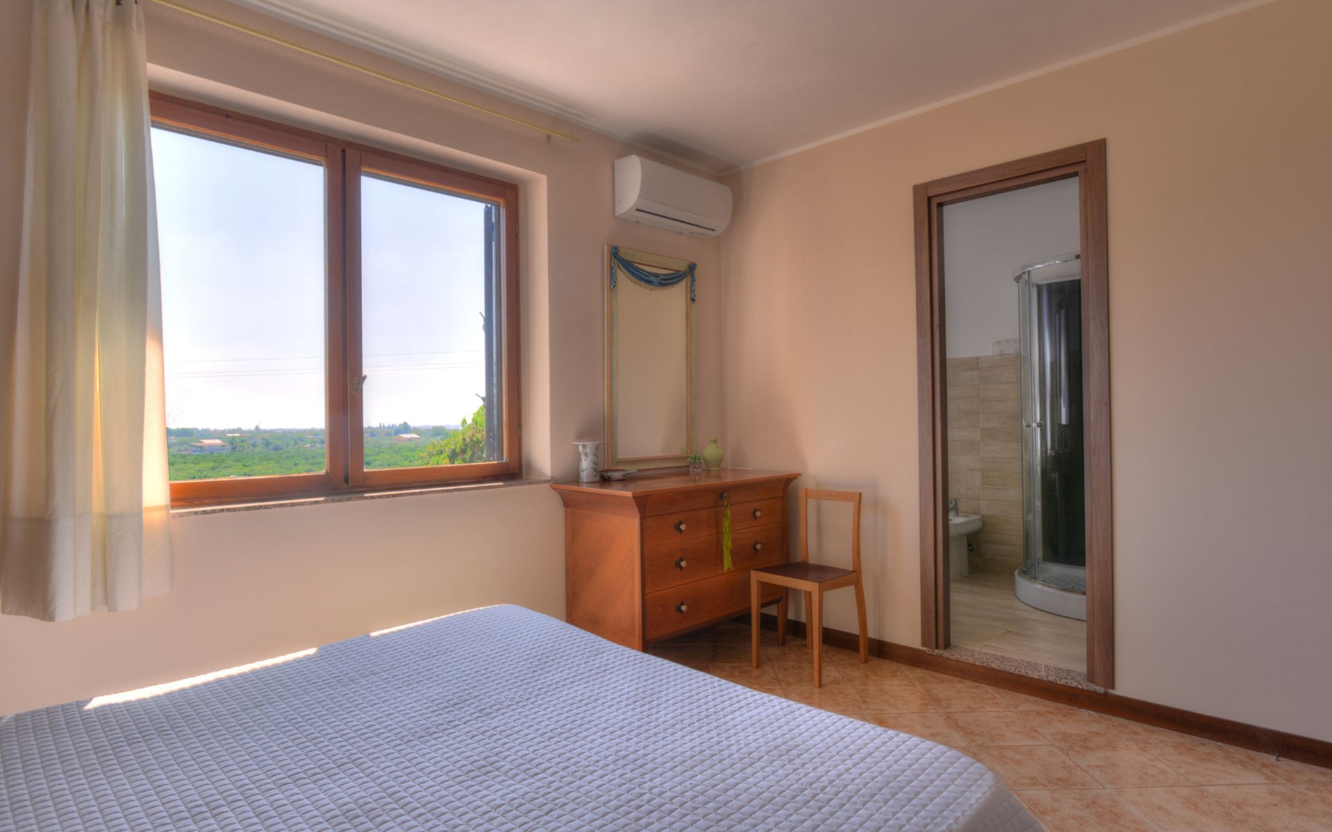 Villa "Smeraldo", surrounded by trees. 16 km from the centre of Siracusa, 4 km from the centre of Floridia, in a secluded, sunny position, 18 km from the sea. Private: property 500 m2, swimming pool (11 x 5 m, depth 140 - 200 cm, seasonal availability: 13.Jun. - 03.Oct.). Outdoor shower, pool maintenance by the owner/gardener. Stepped path to the house. Parking (for 3 cars) on the premises. Grocery 4 km, supermarket 5 km, restaurant 4 km, bar 4 km, bus stop "Floridia" 4 km, sandy beach "Fontane Bianche" 15 km. Nearby attractions: Necropoli di Pantalica 32 km, Noto 34 km, Riserva Naturale Faunistica Vendicari 40 km, Modica 68 km, Ragusa 70 km, Catania 70 km. Please note: car recommended. Animals in the neighbourhood. The property has a citrus grove, workers will occasionally be present for maintenance. The owner will be on the property daily to look after the animals in an enclosure.