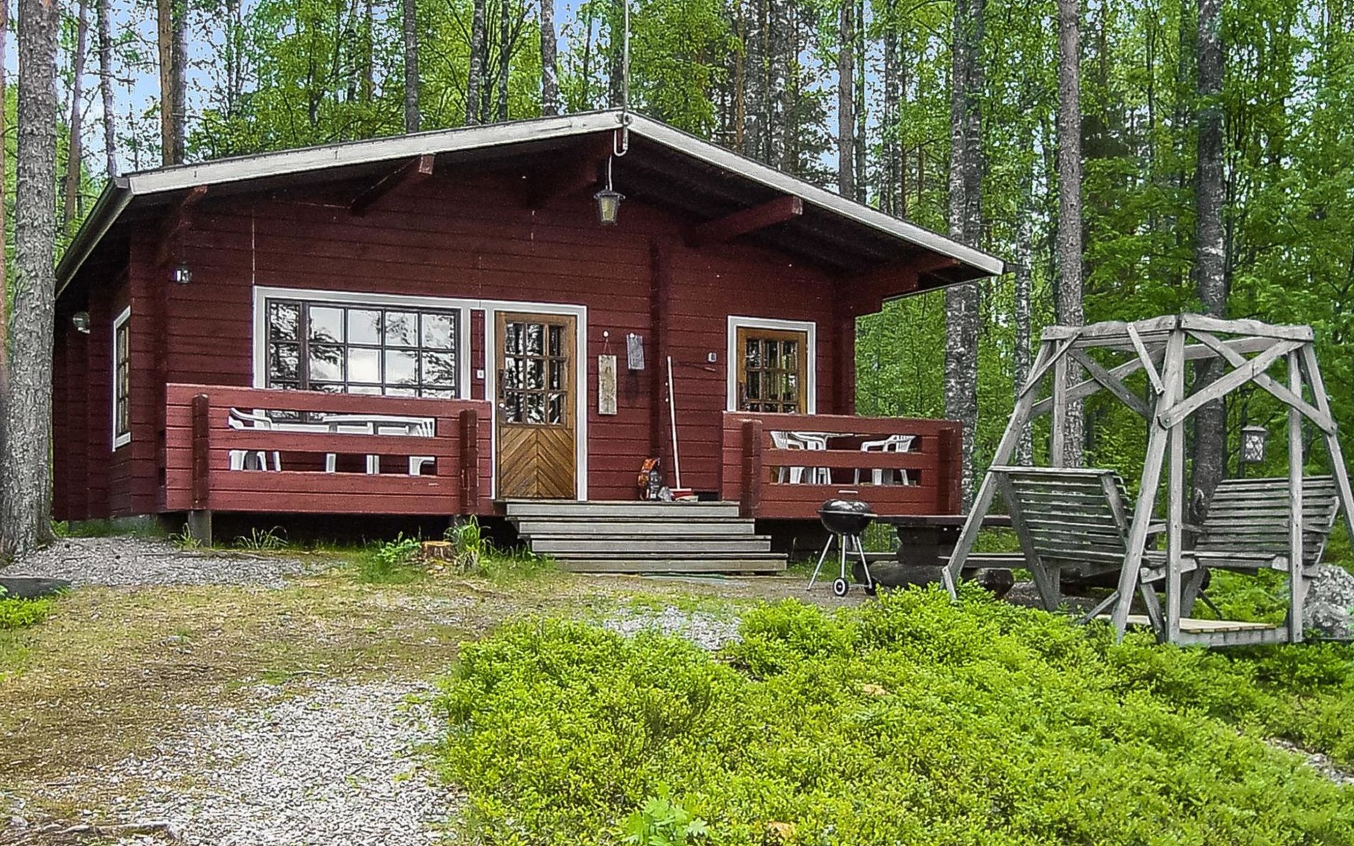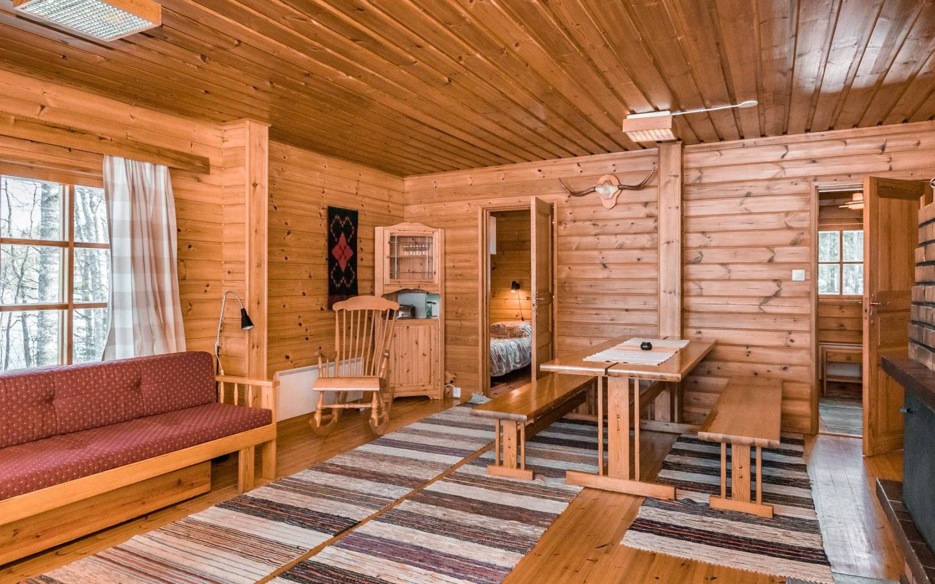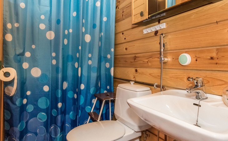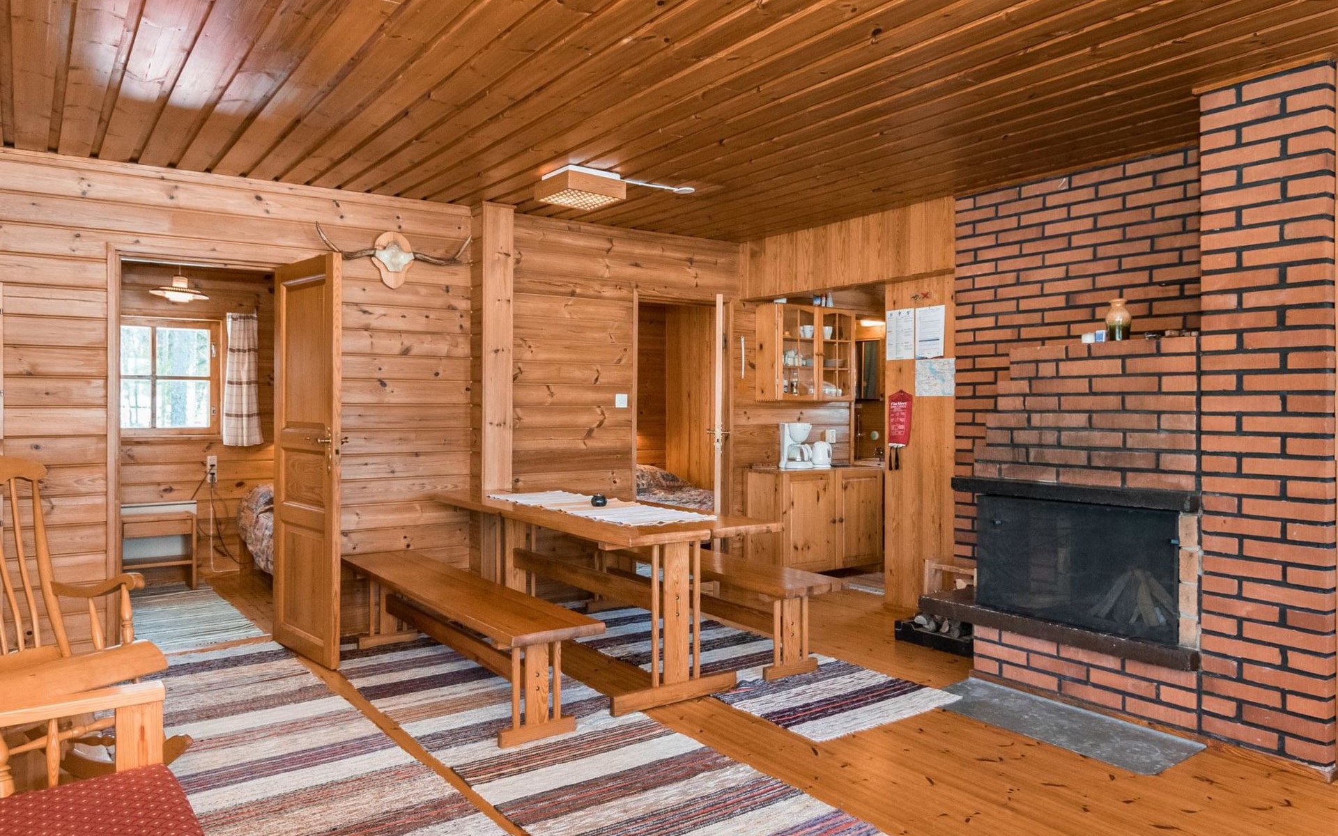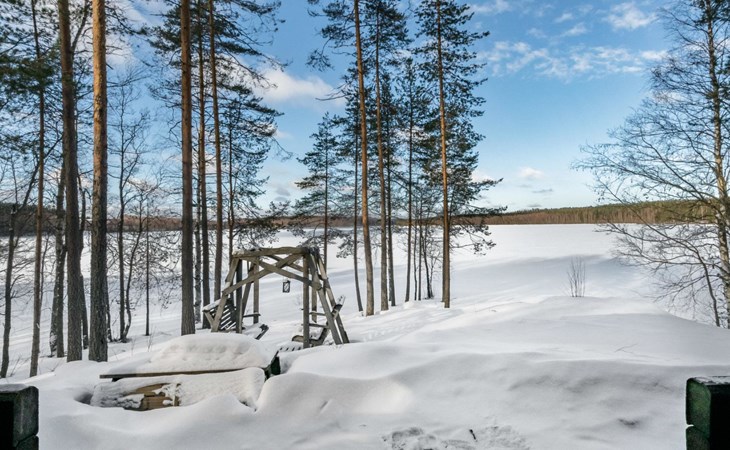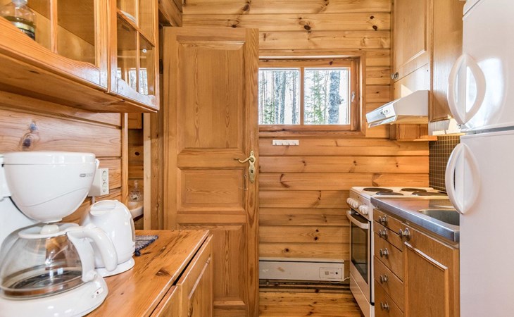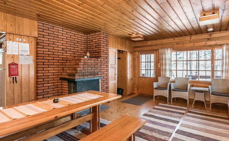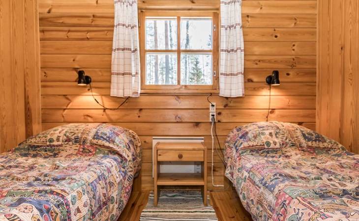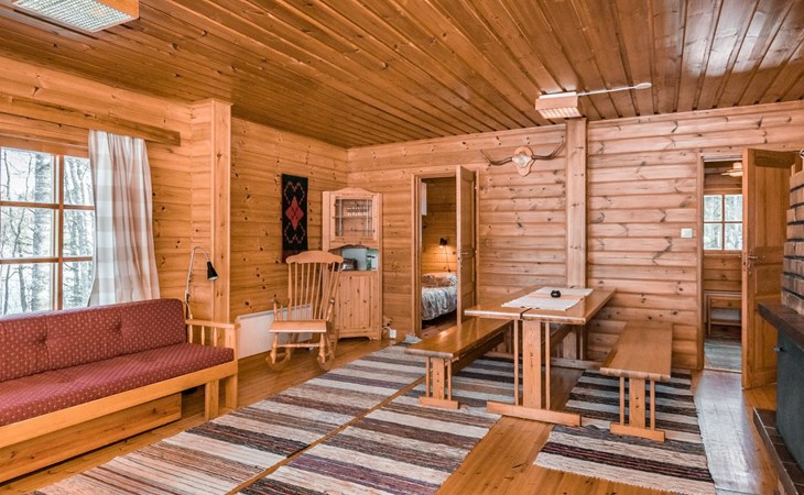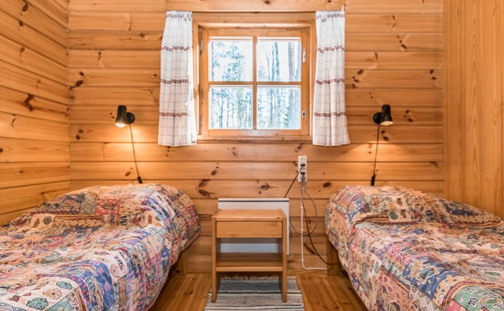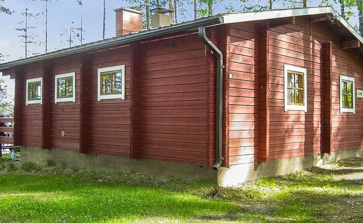 Log cabin, renovated 1992, kitchen, 2 bedrooms with 2 beds in each, living room with 2 extra beds (couch), sauna (electric sauna stove), dressing room, open veranda. Drinking water will be fetched from owner.