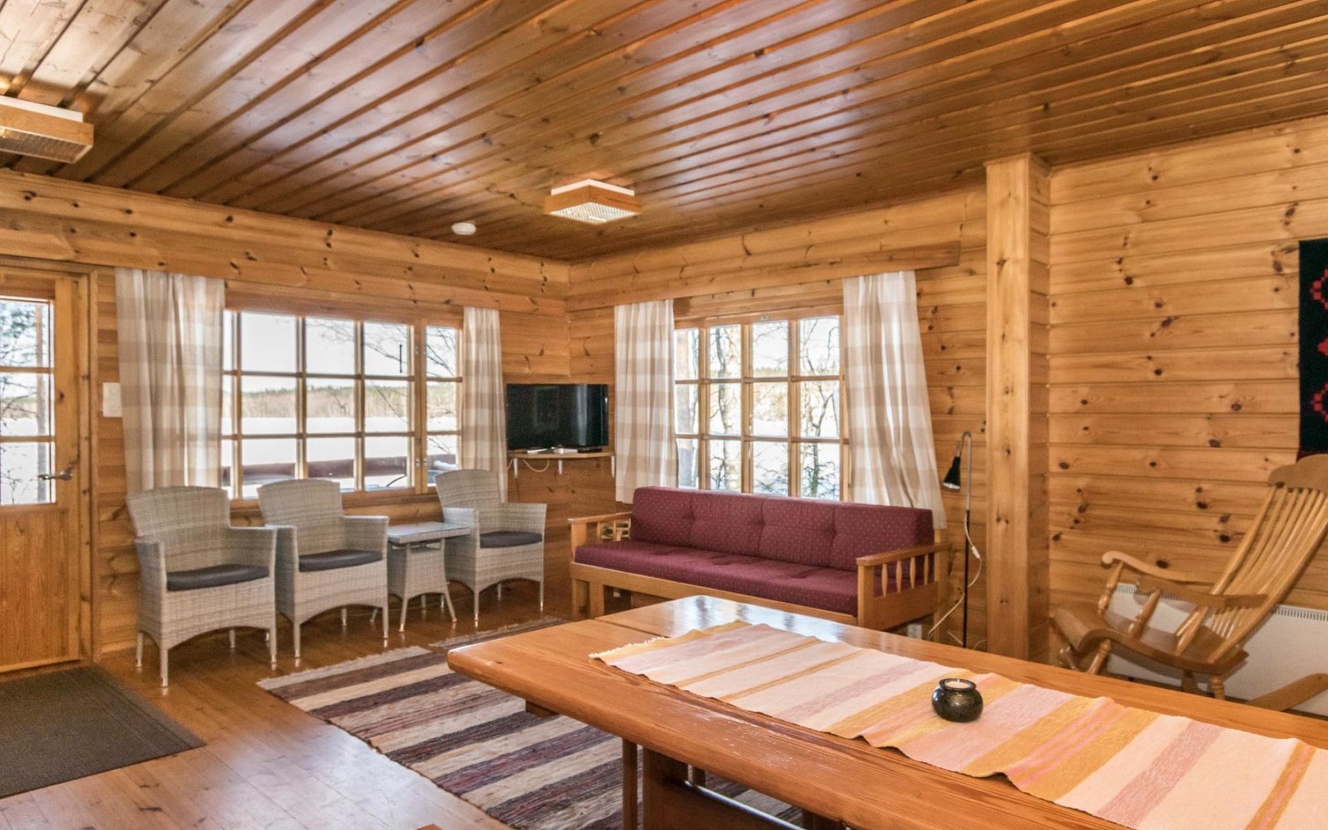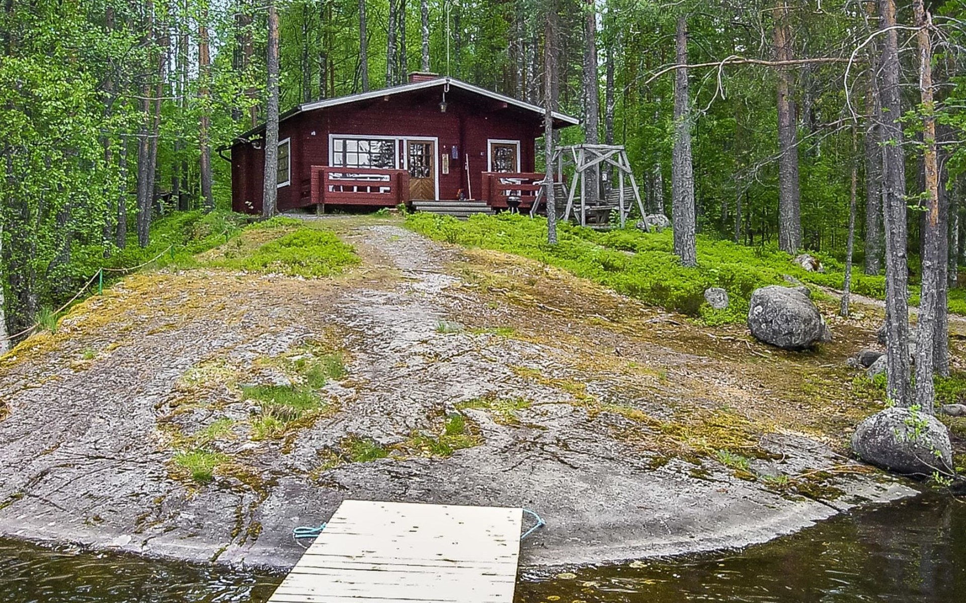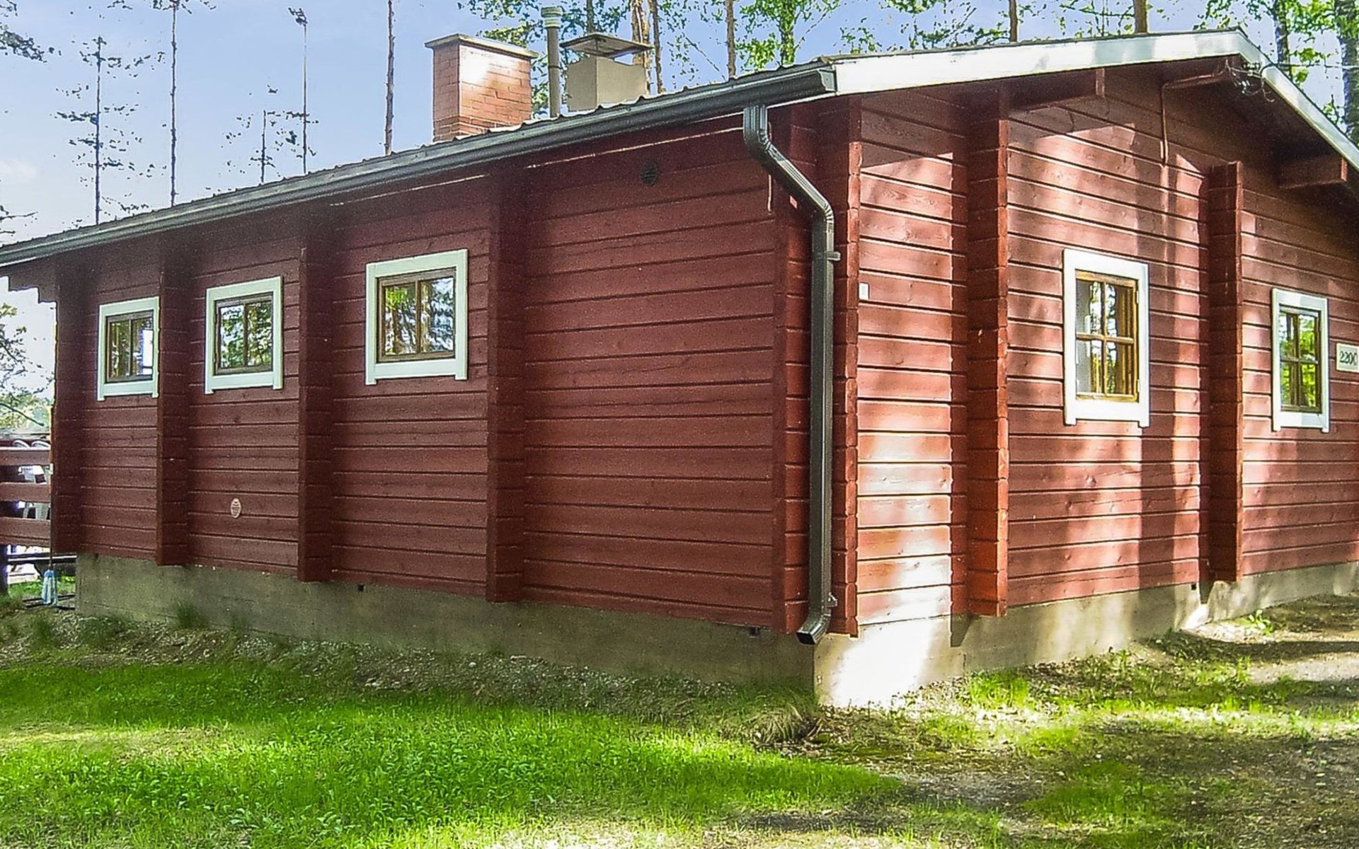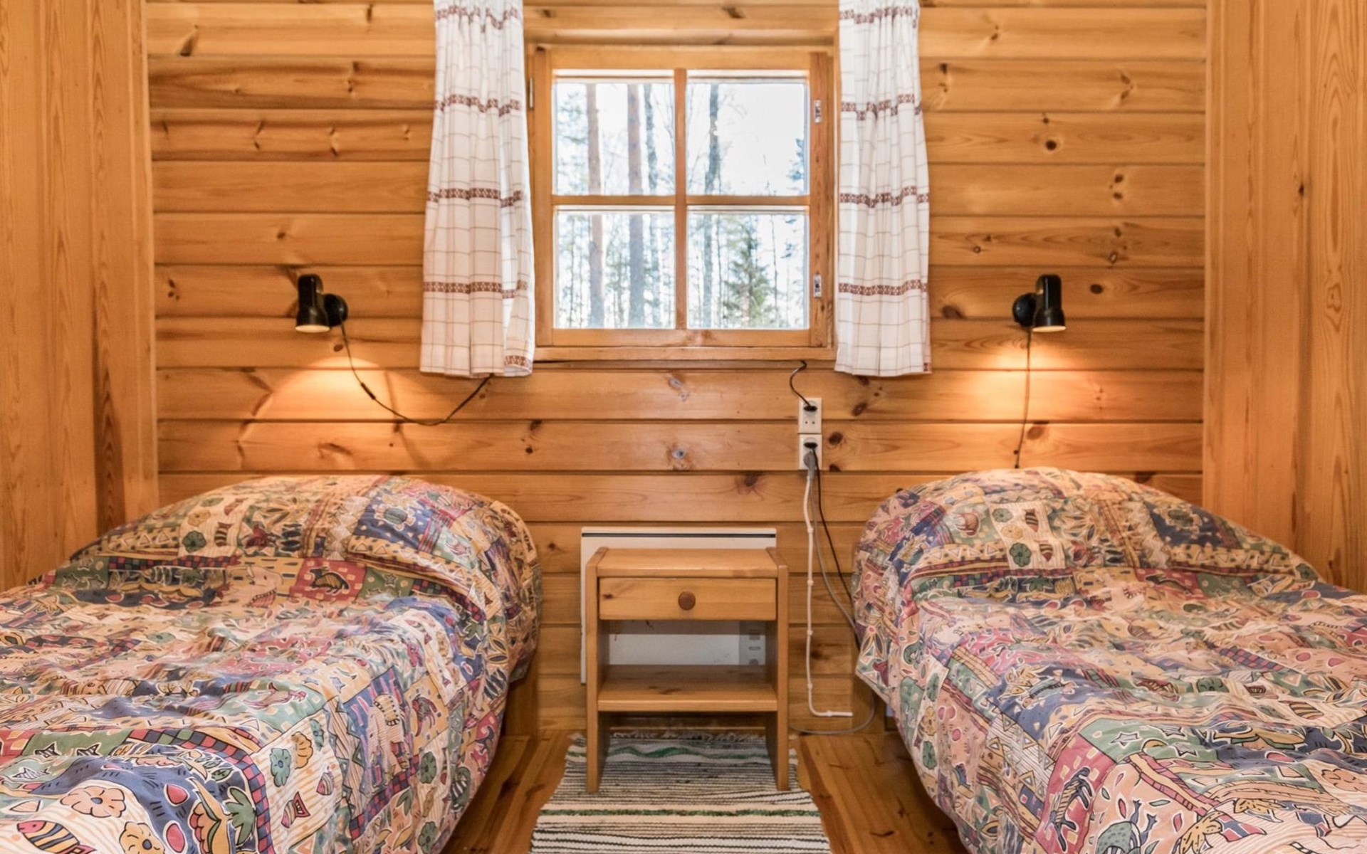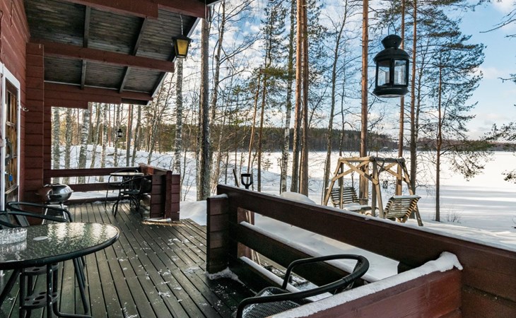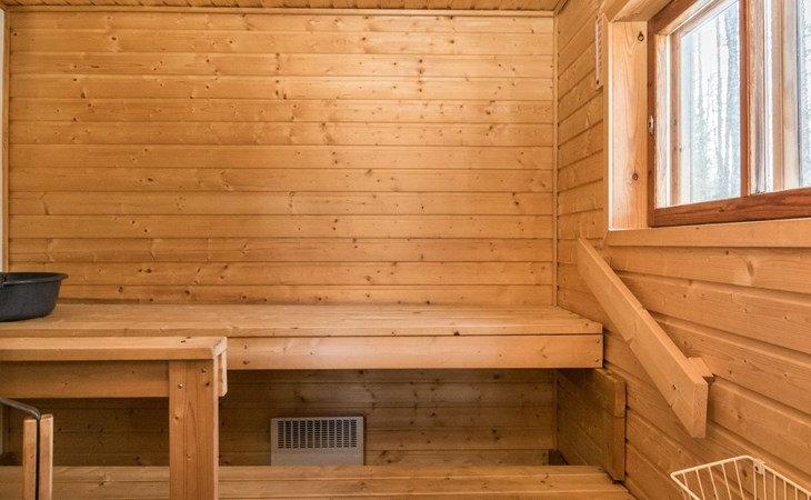 Log cabin, renovated 1992, kitchen, 2 bedrooms with 2 beds in each, living room with 2 extra beds (couch), sauna (electric sauna stove), dressing room, open veranda. Drinking water will be fetched from owner.