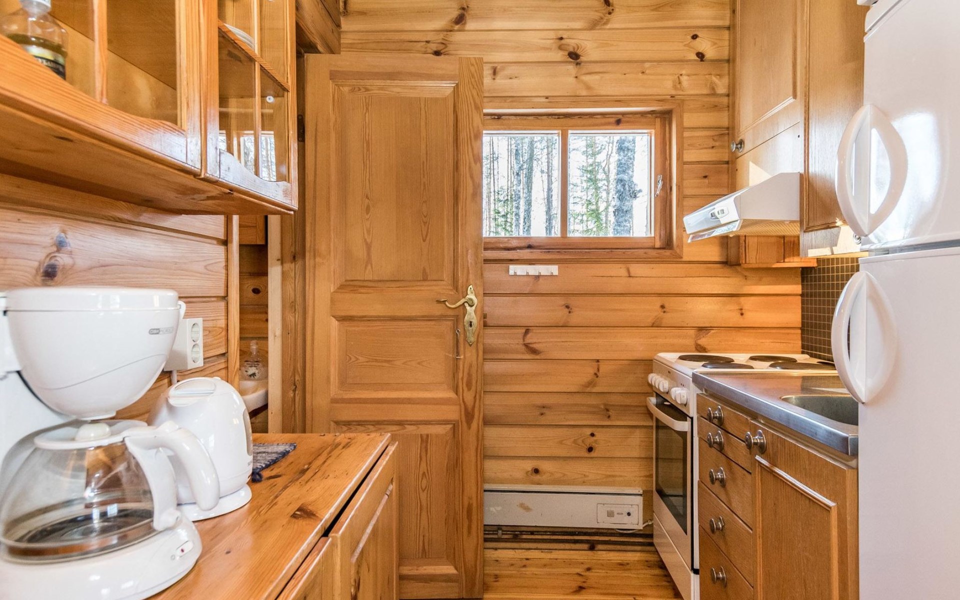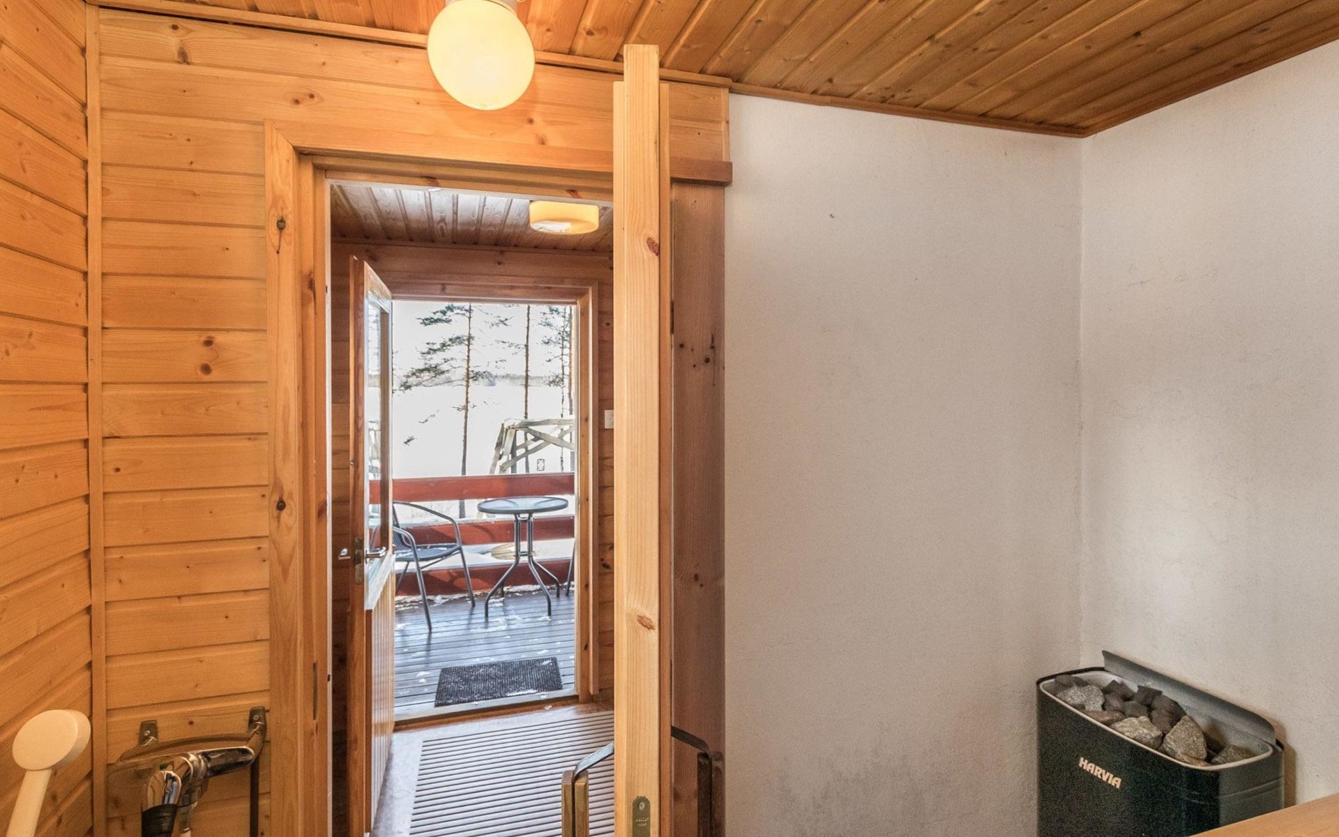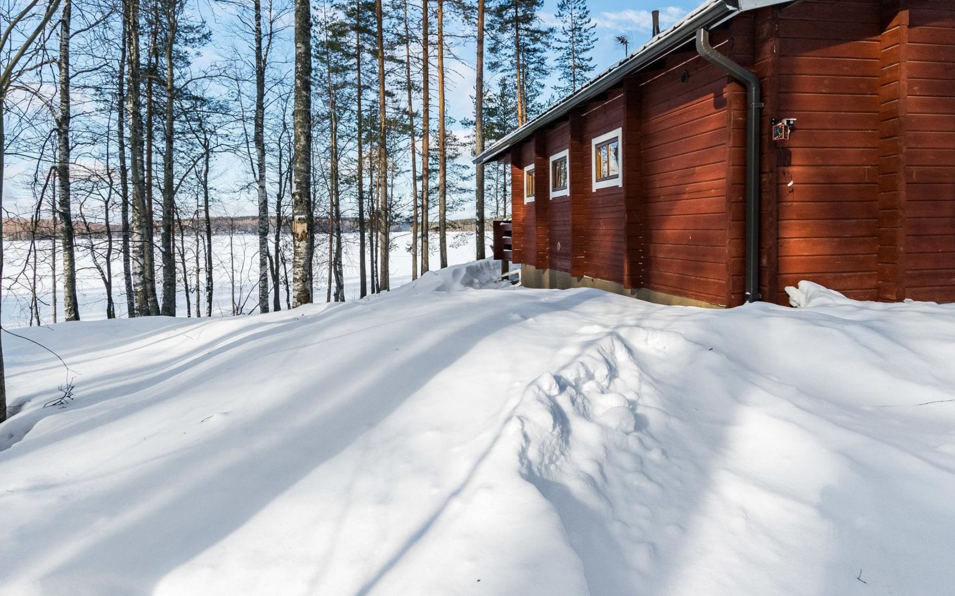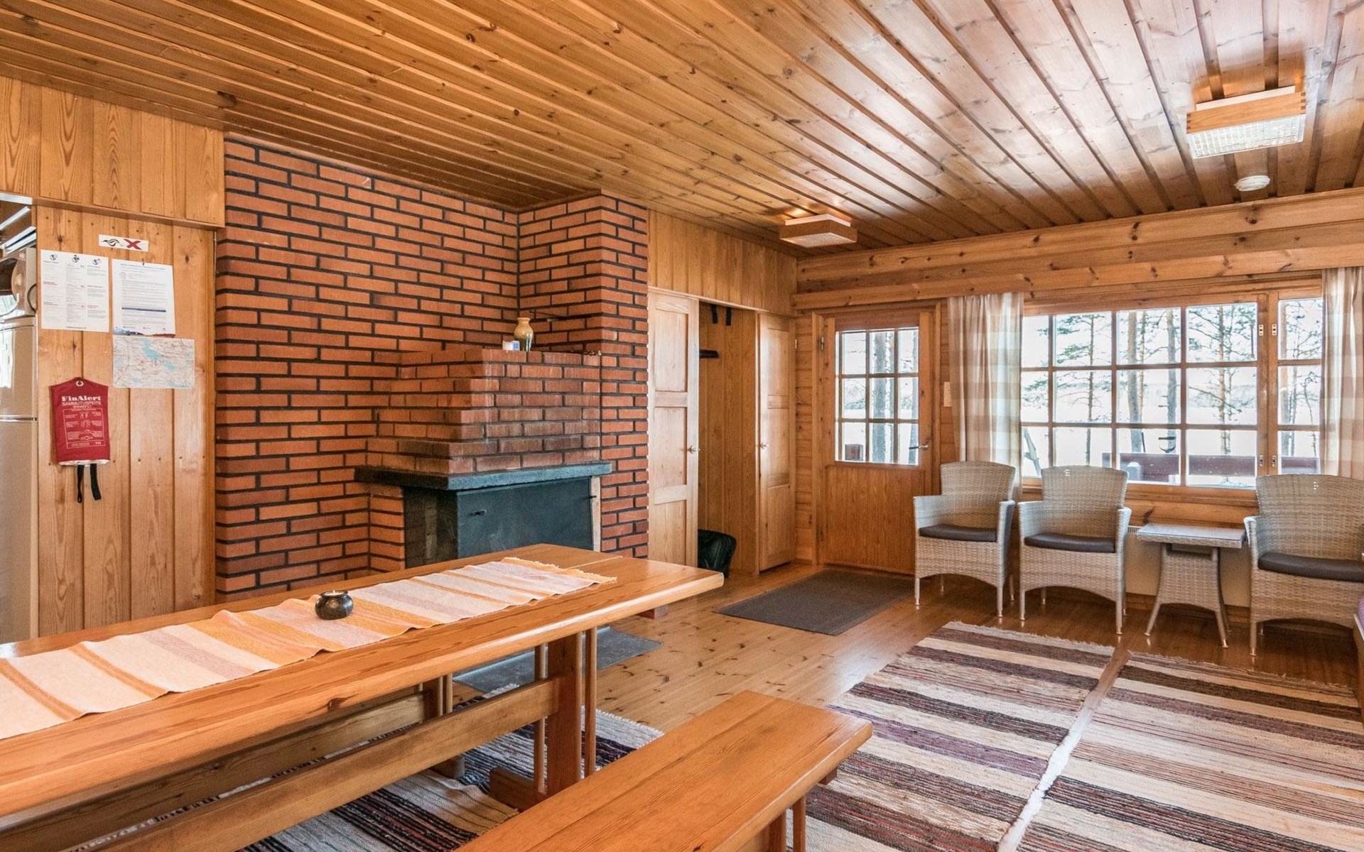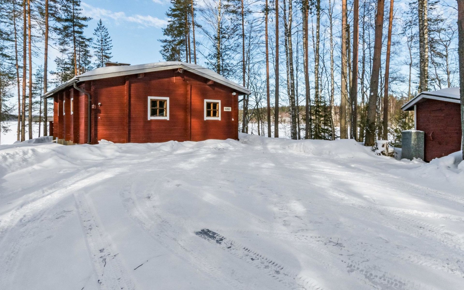 Log cabin, renovated 1992, kitchen, 2 bedrooms with 2 beds in each, living room with 2 extra beds (couch), sauna (electric sauna stove), dressing room, open veranda. Drinking water will be fetched from owner.